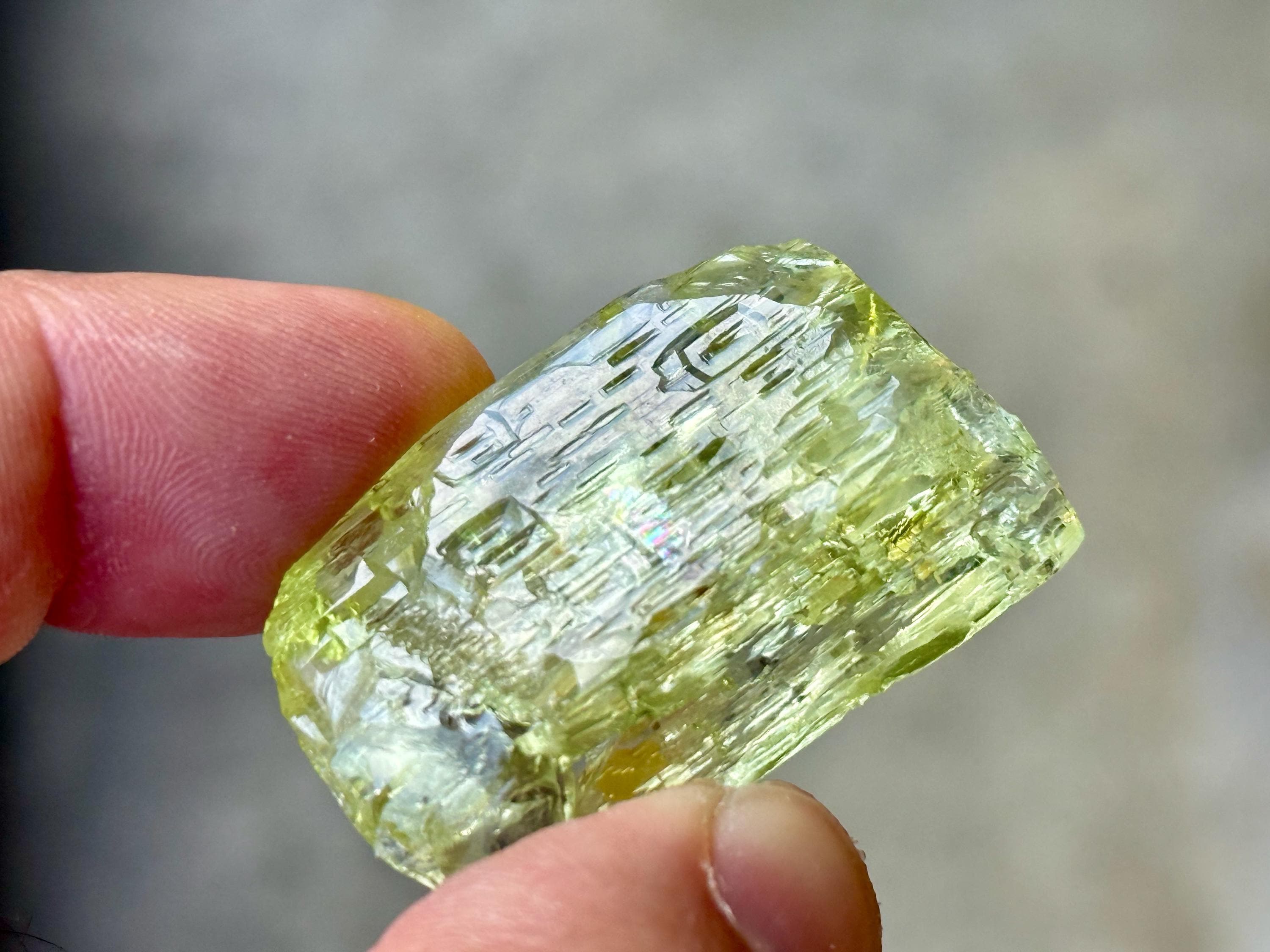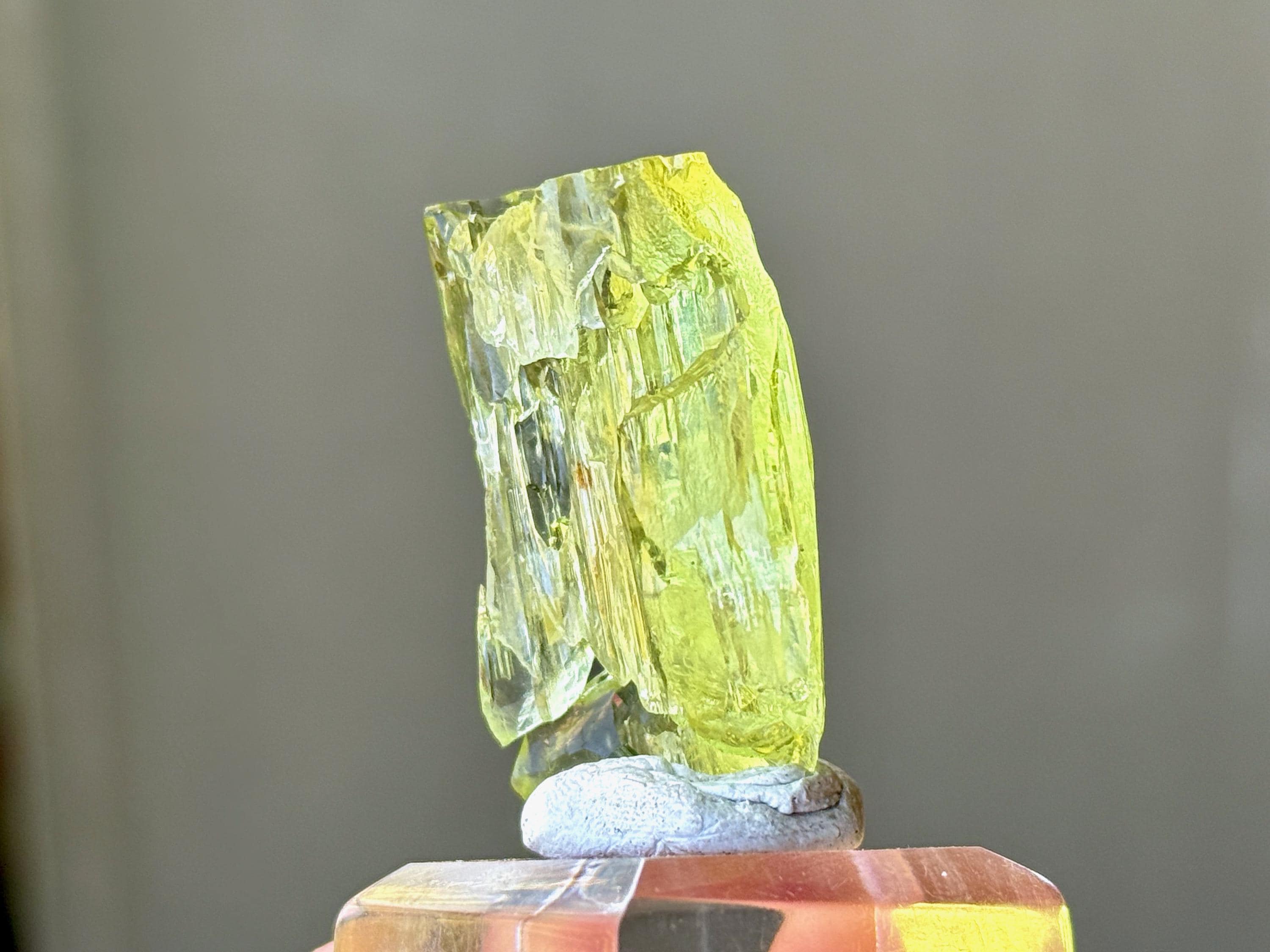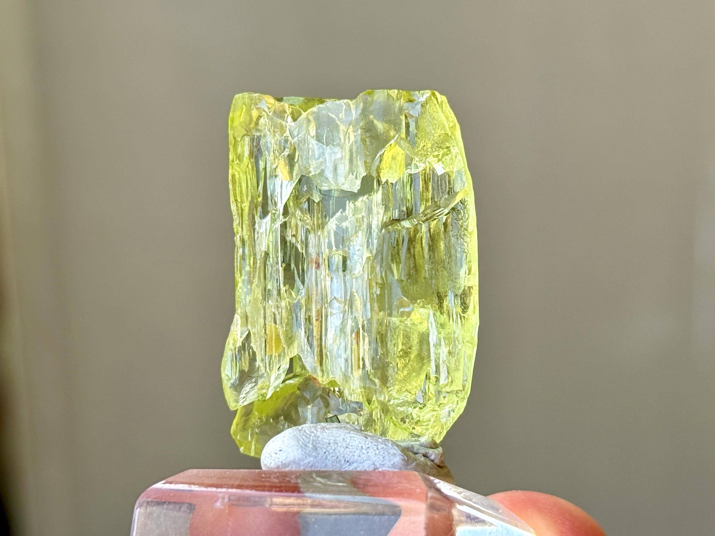 Superb quality to this stunning Heliodor crystal with a glassy complexion and vibrant Chartreuse yellow hue. It features a broad formation with beautiful vertical striations and mysterious etchings throughout.