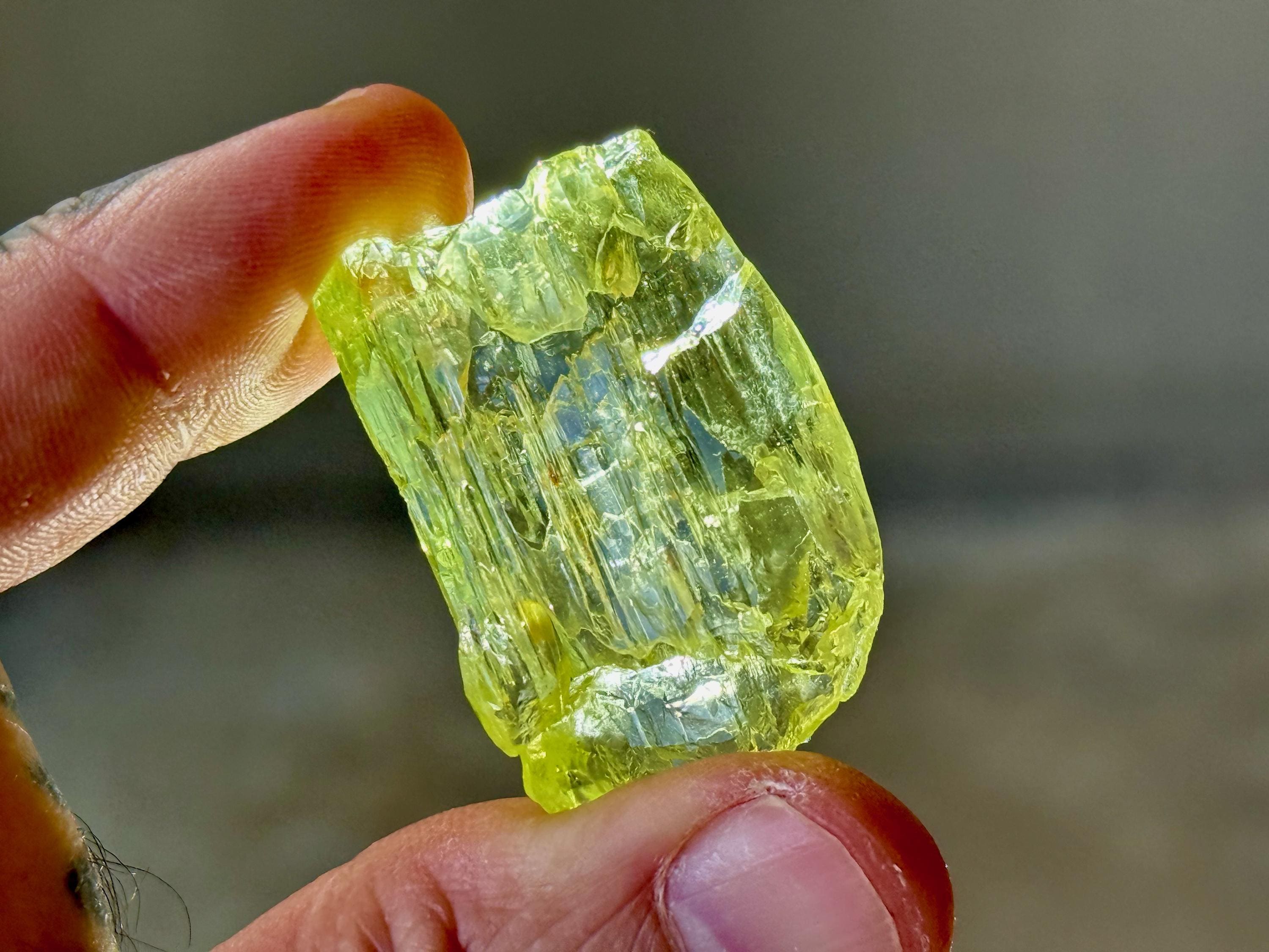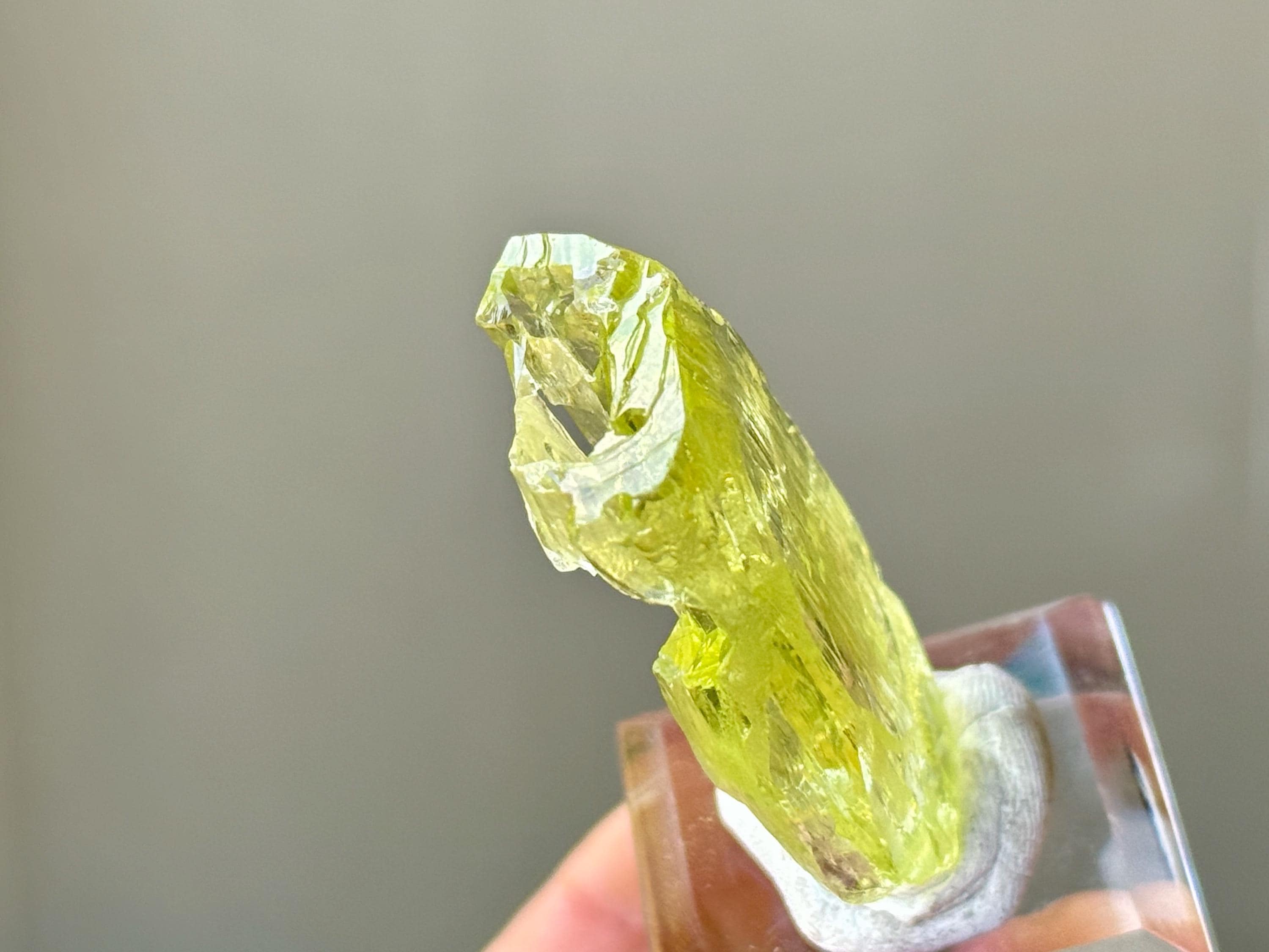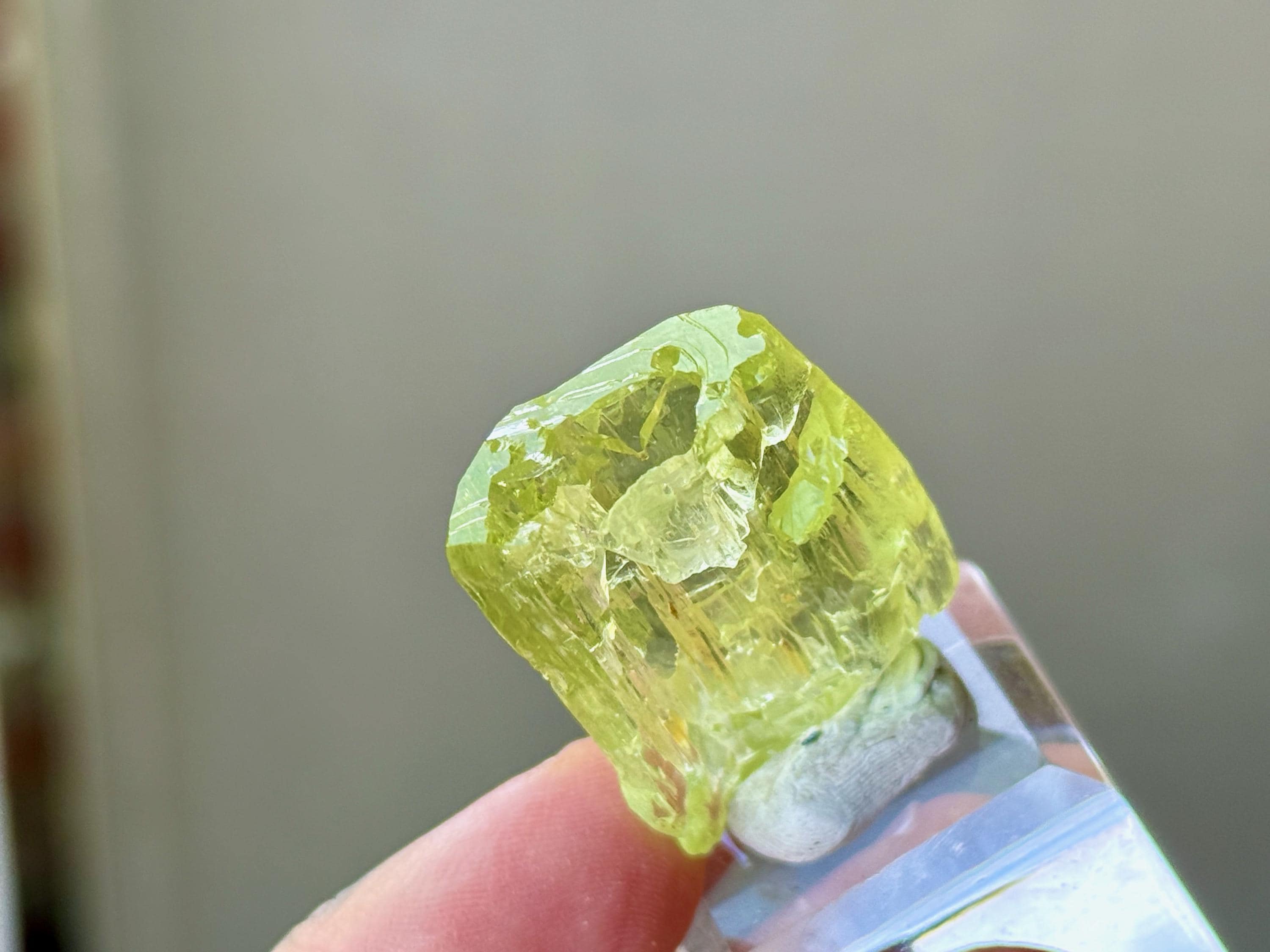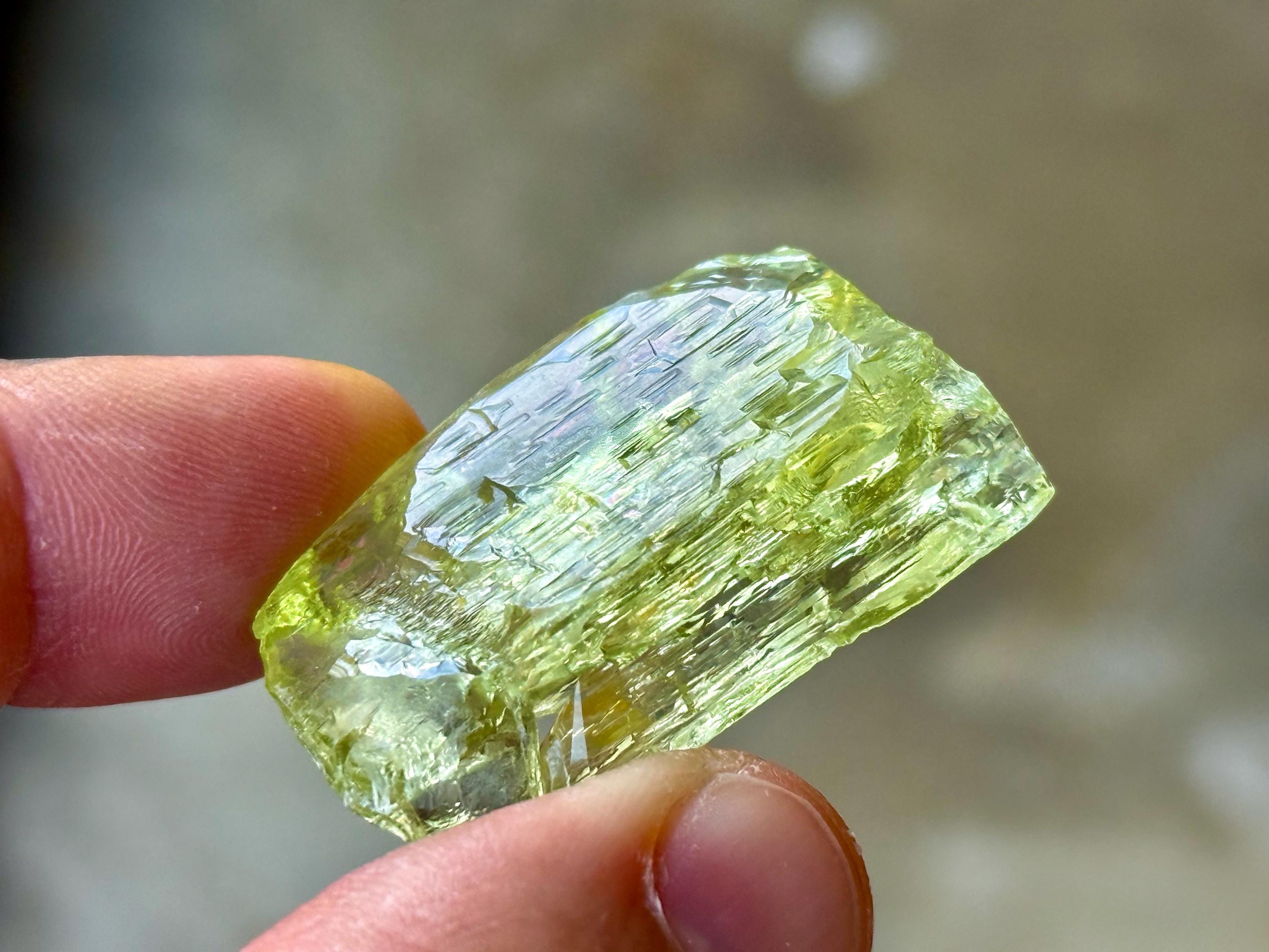 Superb quality to this stunning Heliodor crystal with a glassy complexion and vibrant Chartreuse yellow hue. It features a broad formation with beautiful vertical striations and mysterious etchings throughout.