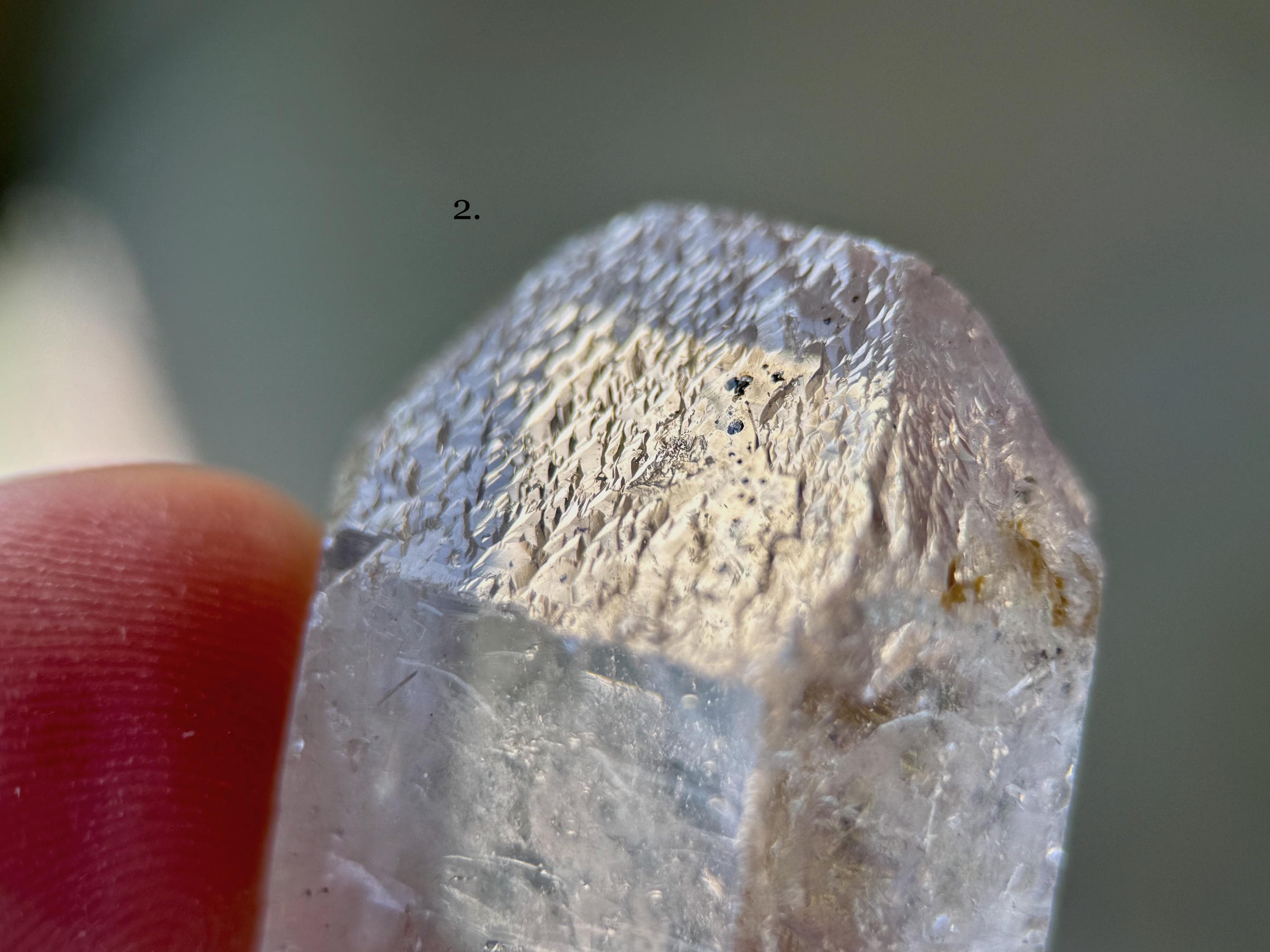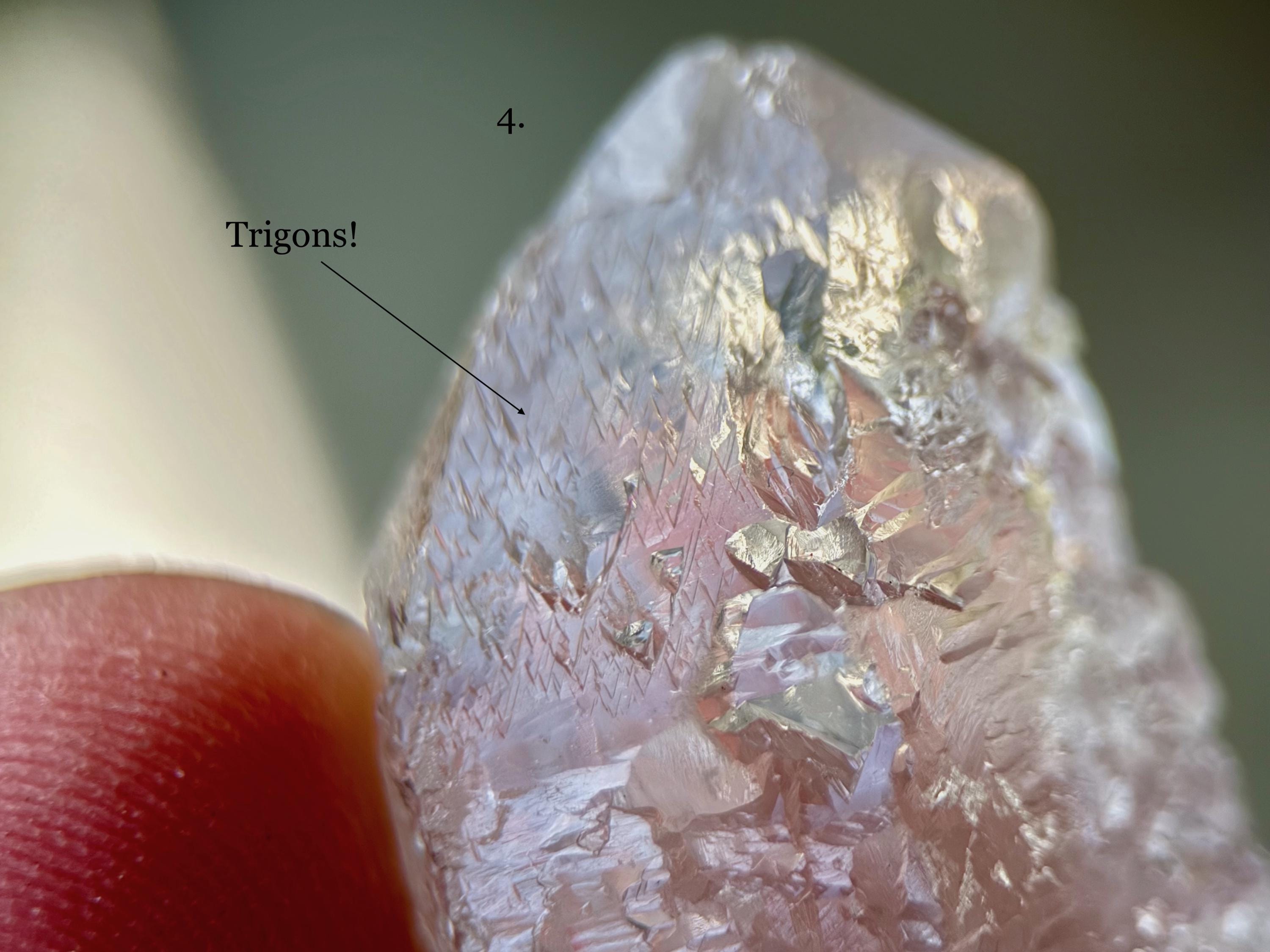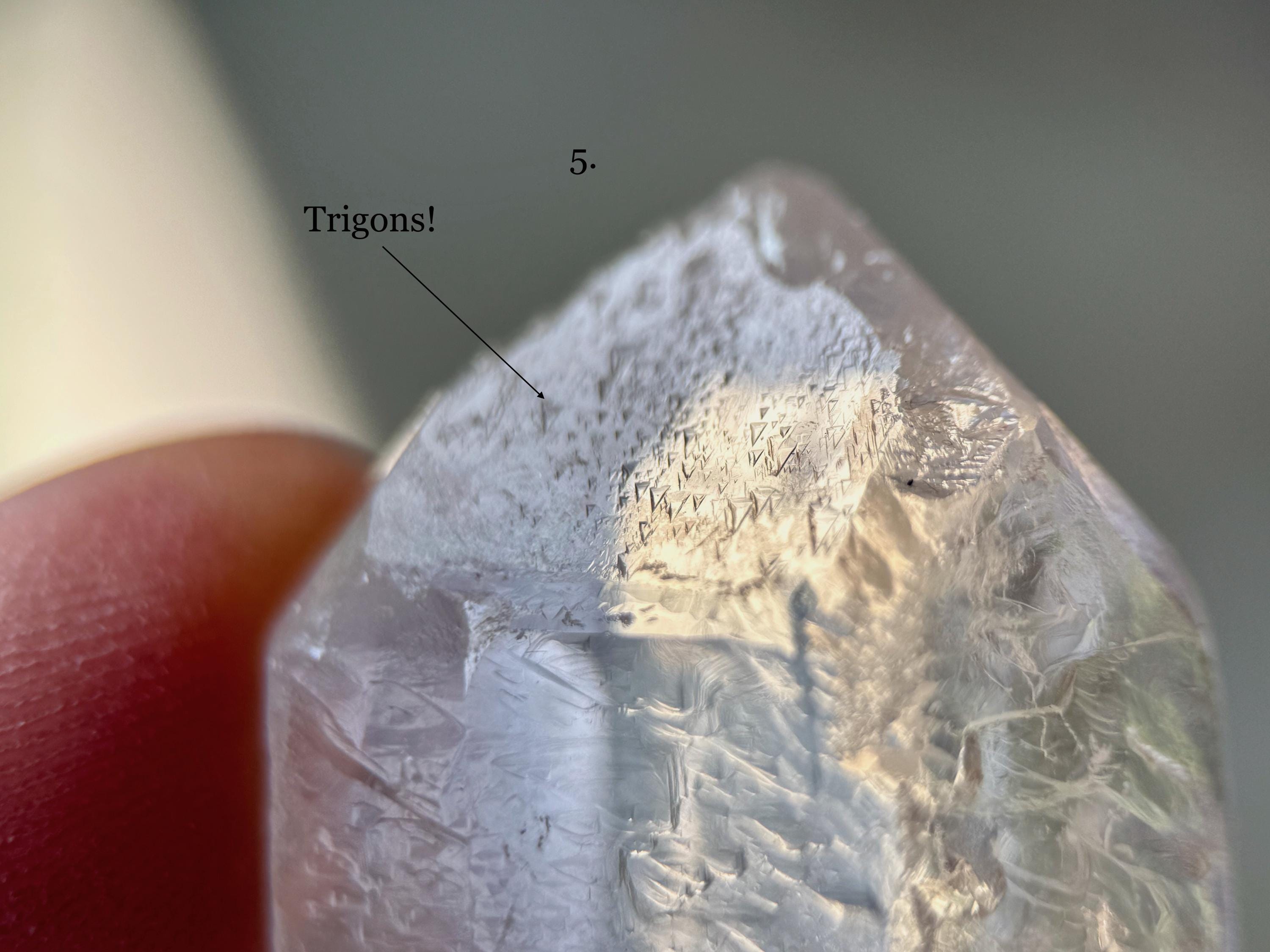Brilliant luster and gorgeous hydrothermally etched textures to this natural Dissolution Ice Quartz crystals. Some of these even have Trigonic imprints on the main facets (indicated in photos). Please note, any trigons are *very* small and best viewed with a jeweler's loupe or magnifying glass.