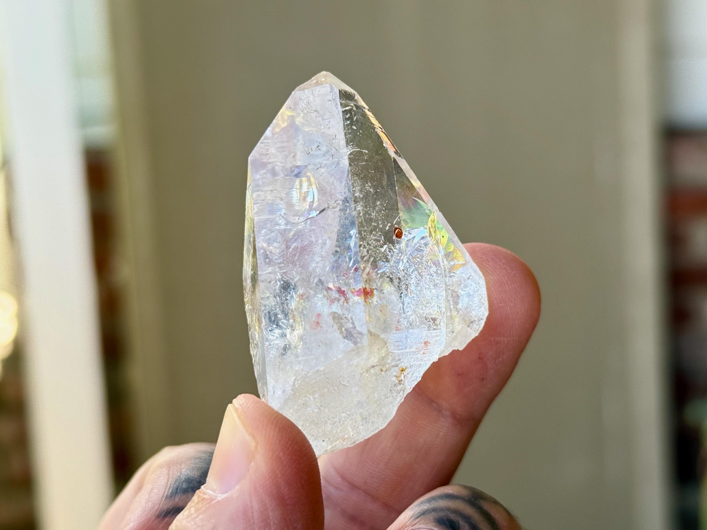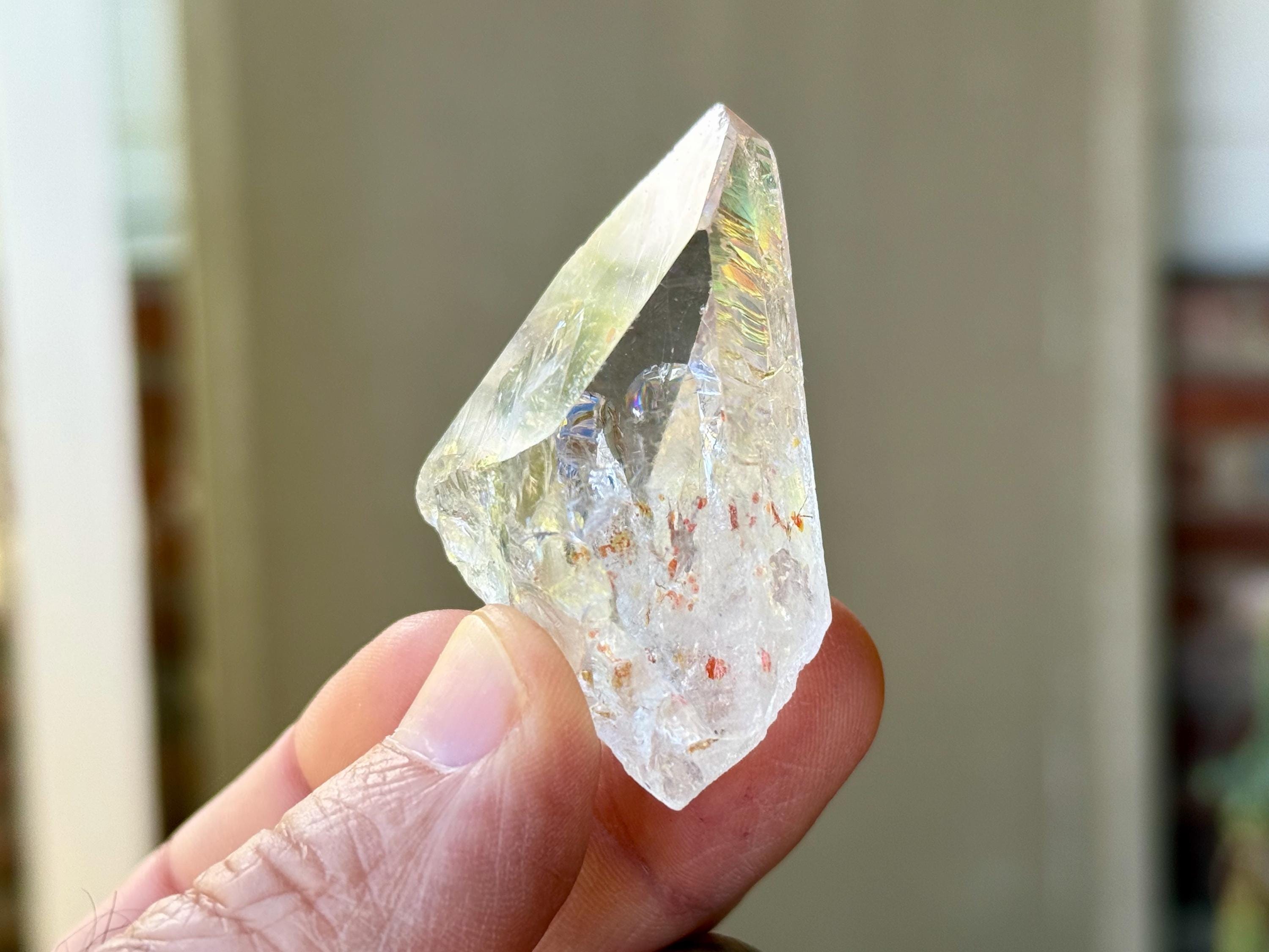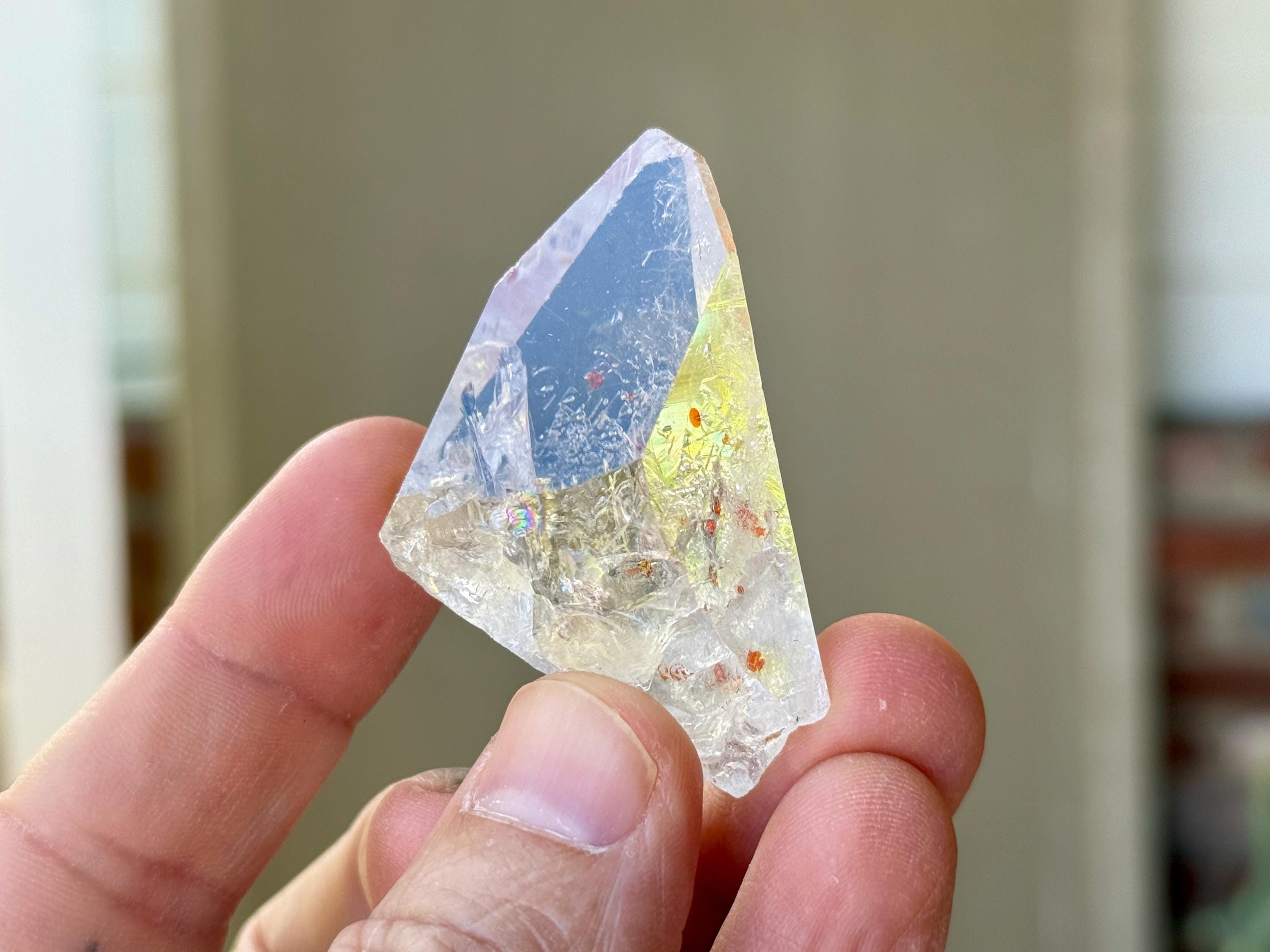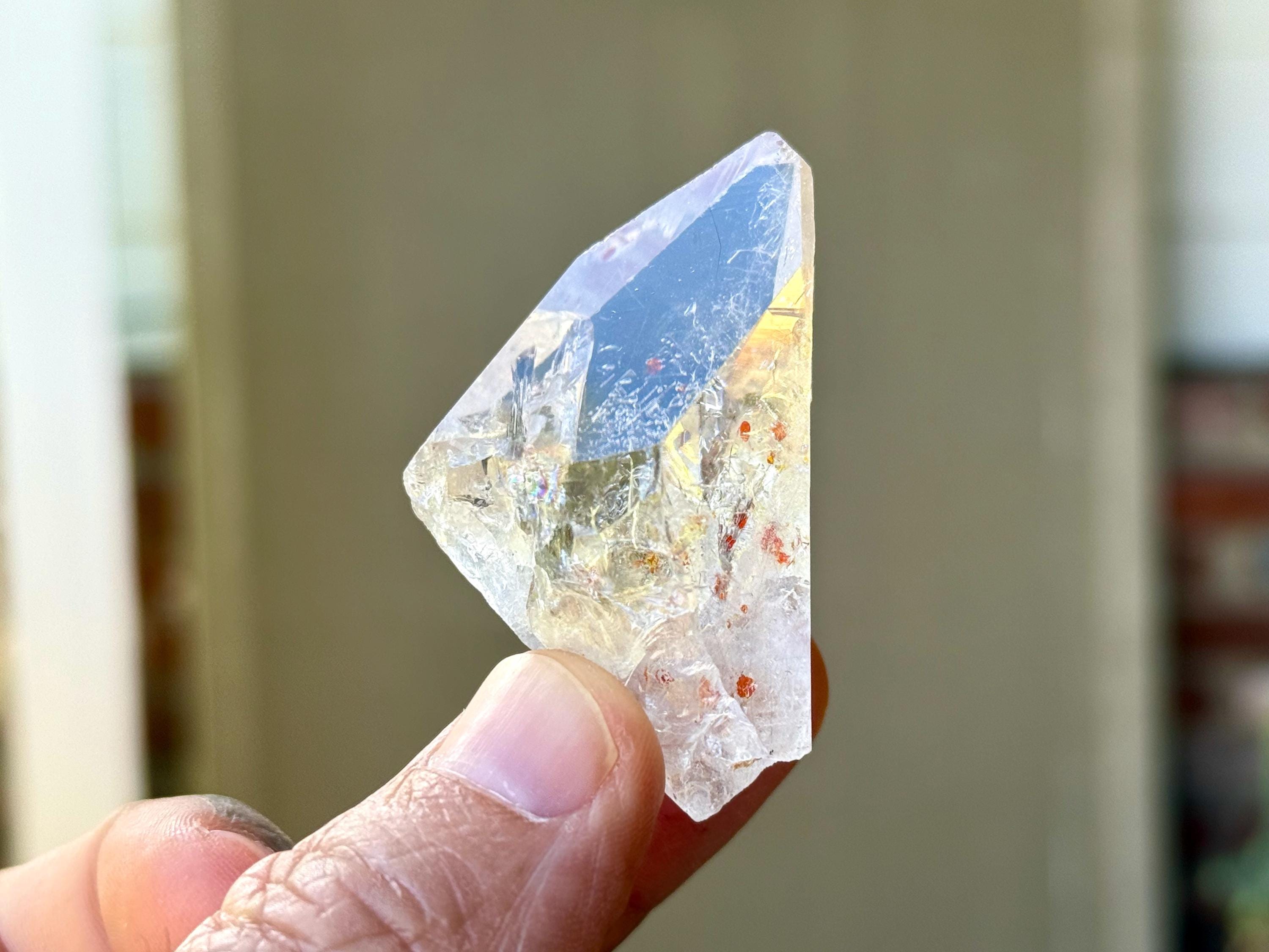 *Please note, this crystal is clear and colorless. Any yellow color in the photos is due to the natural sunlight reflecting off the crystal.