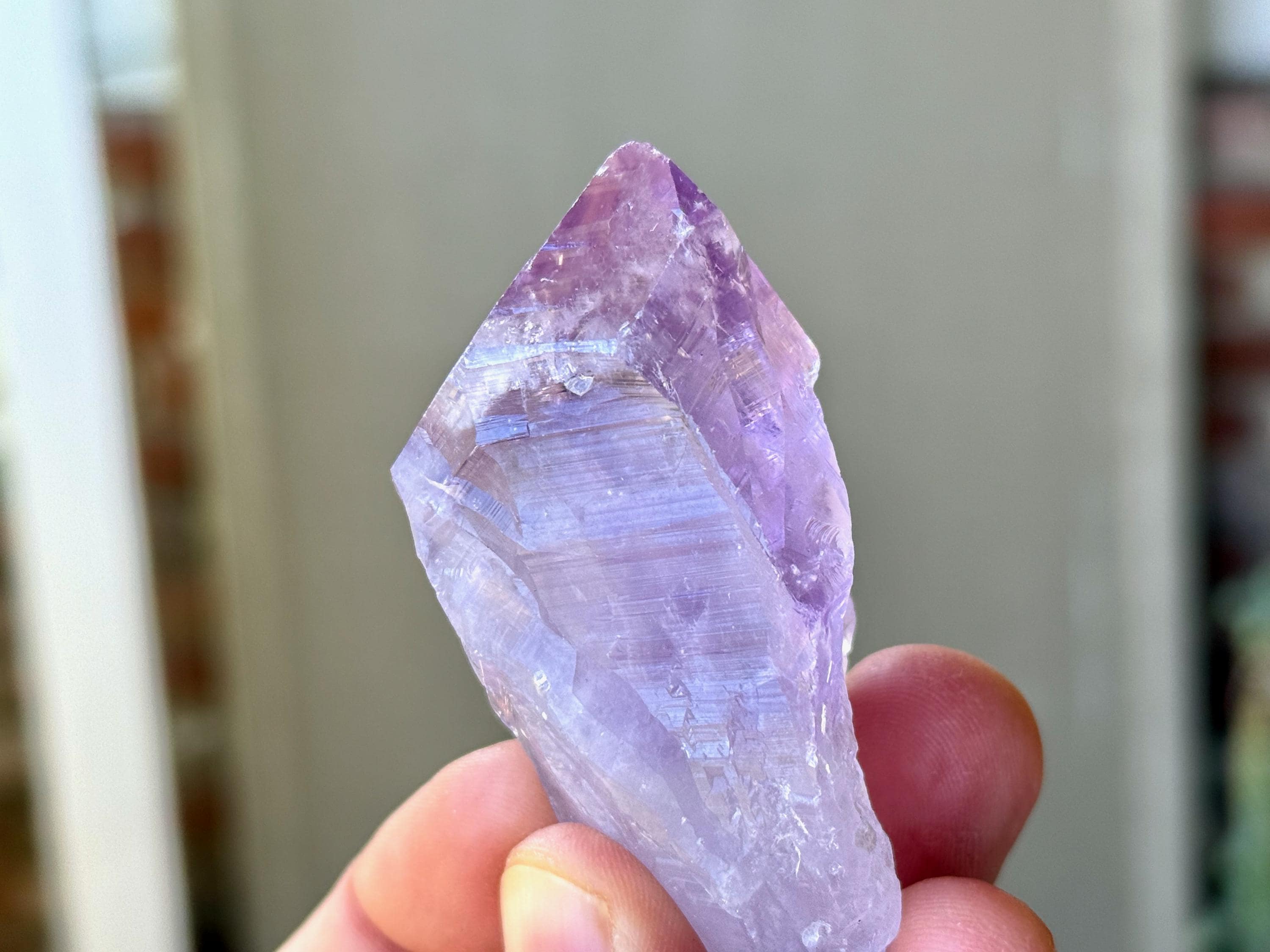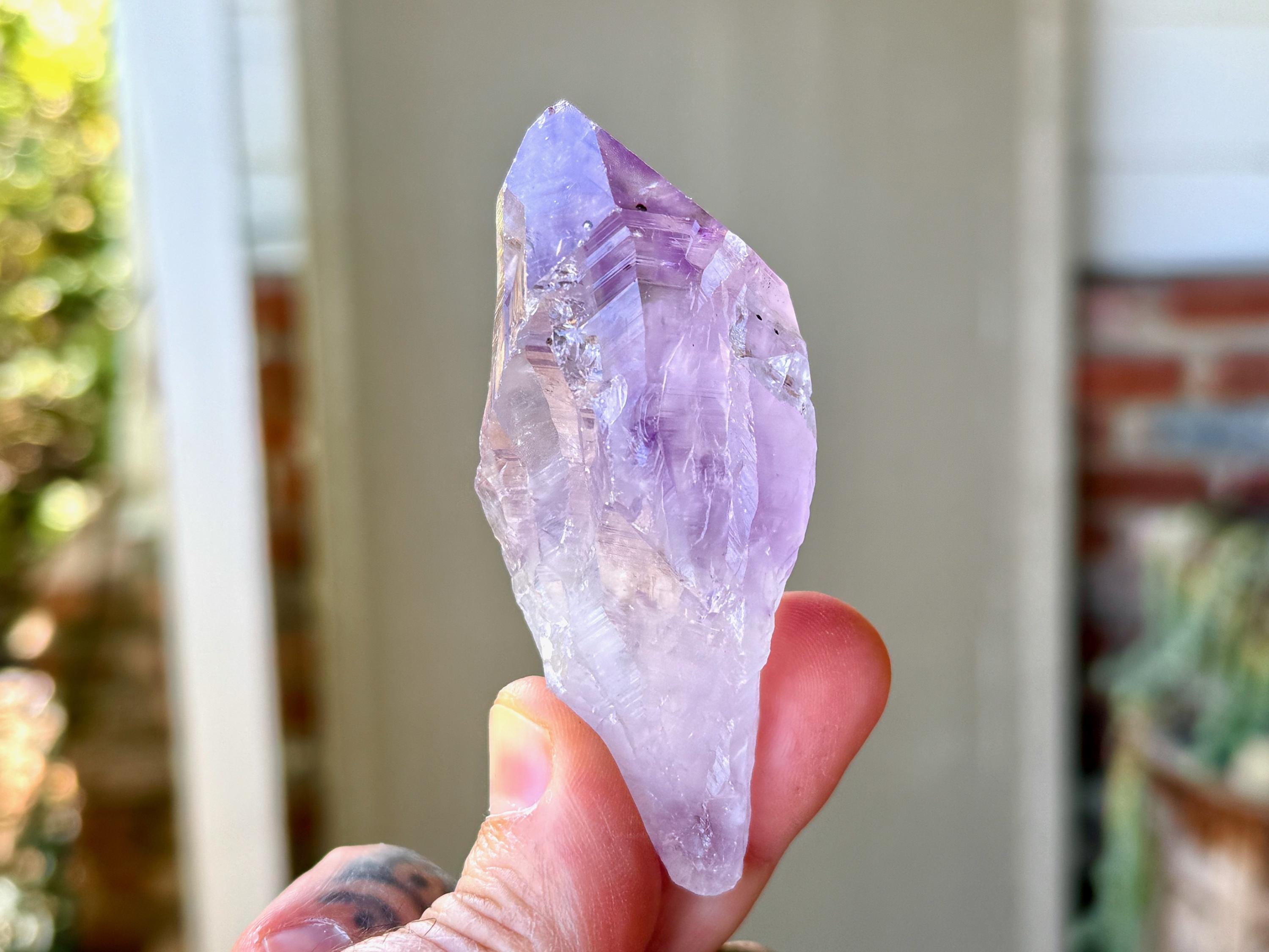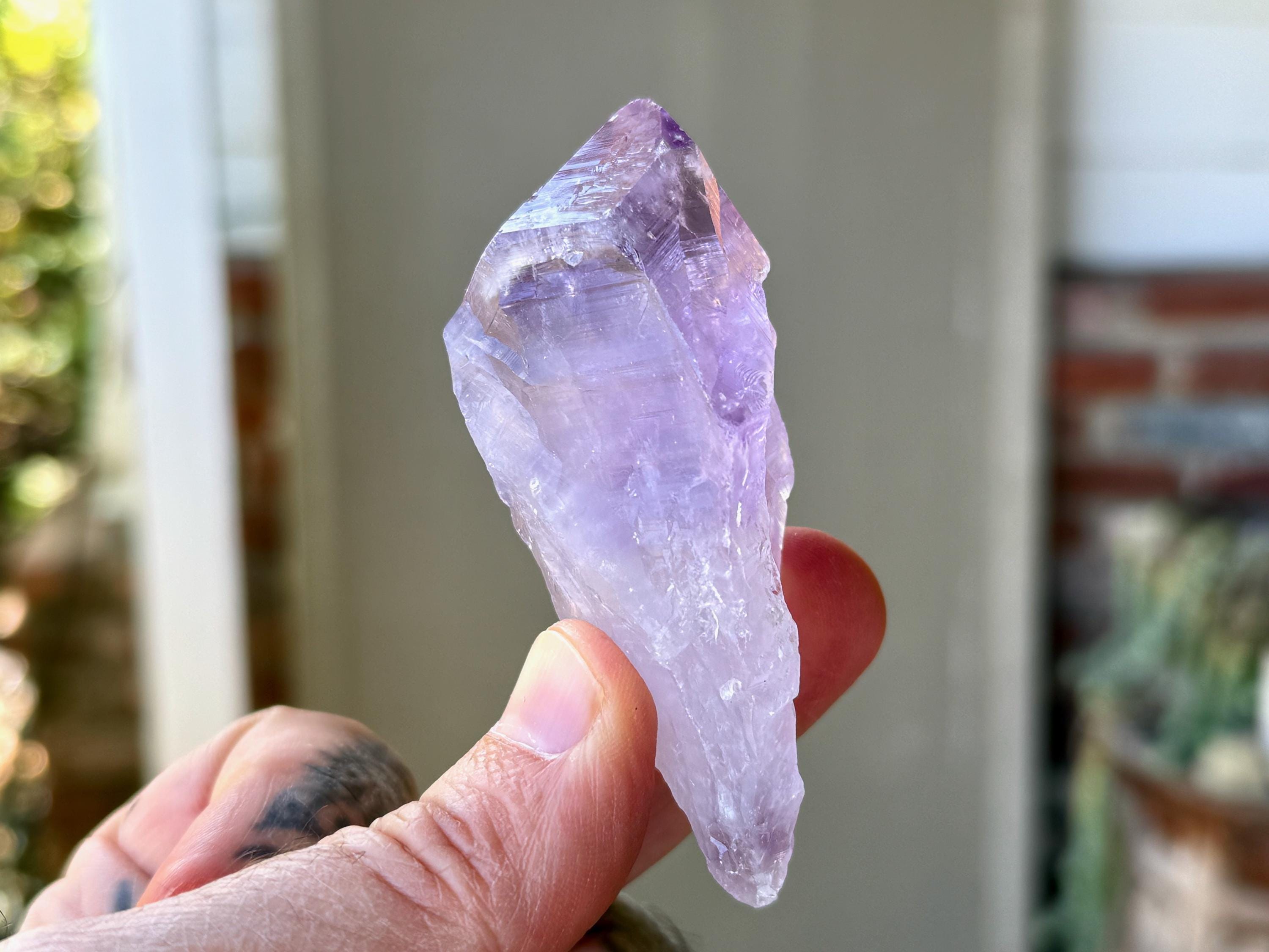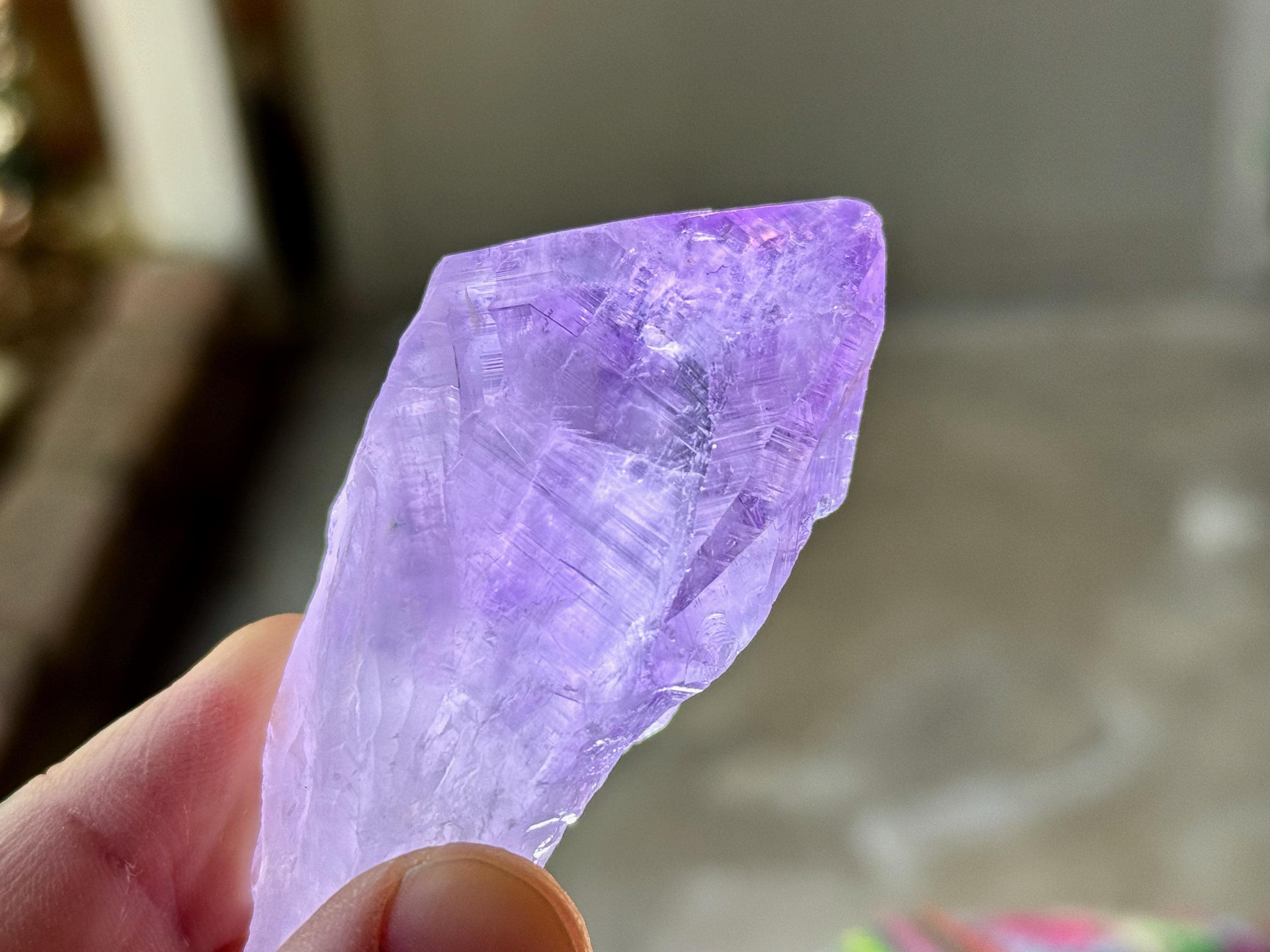 Tremendous luster and the sweetest lilac purple color to this exquisite Root Amethyst crystal. This crystal features an elongated "root" formation with natural contact imprints and textures covering the entire lower portion.