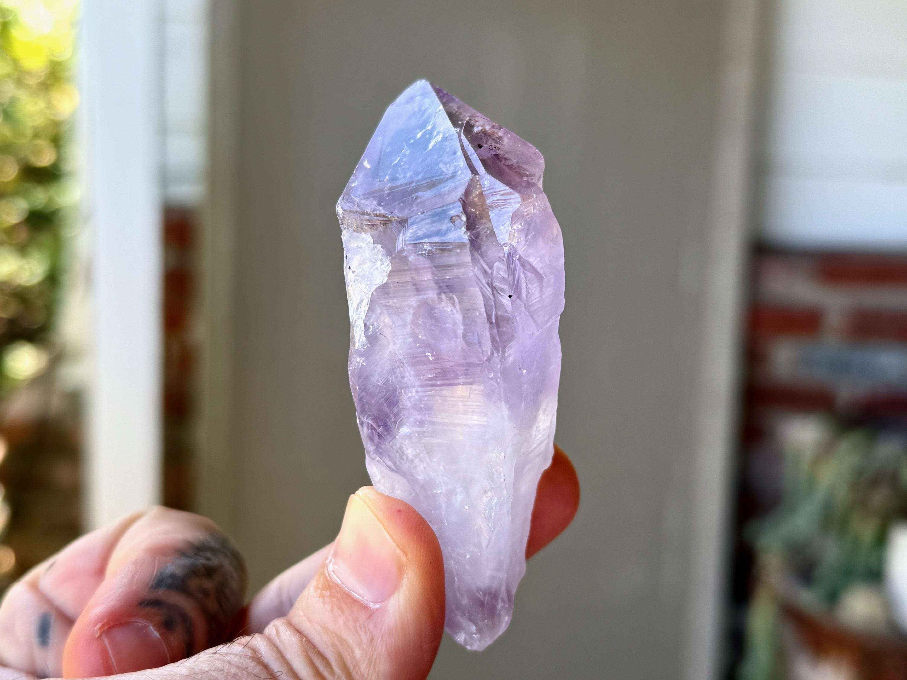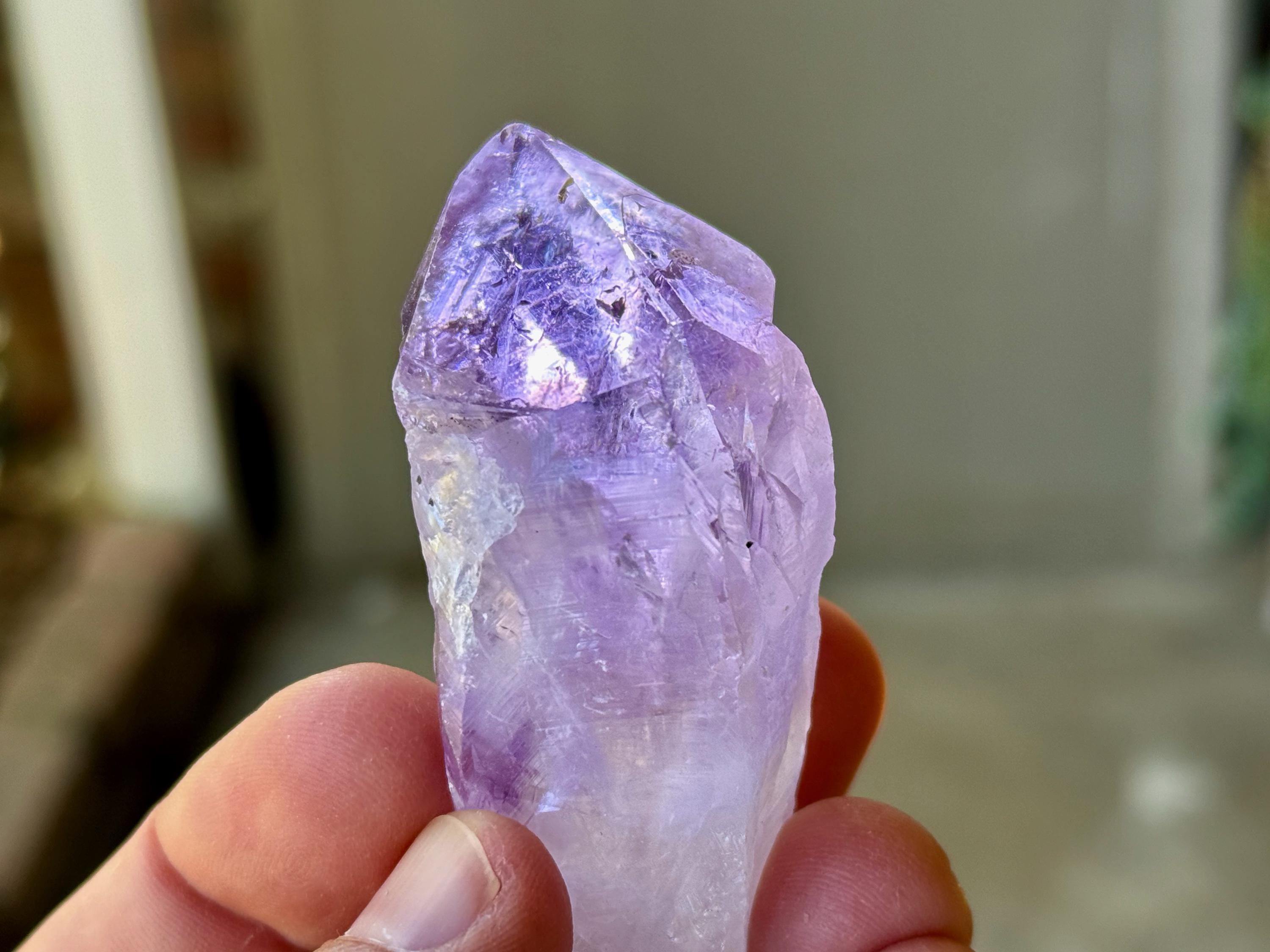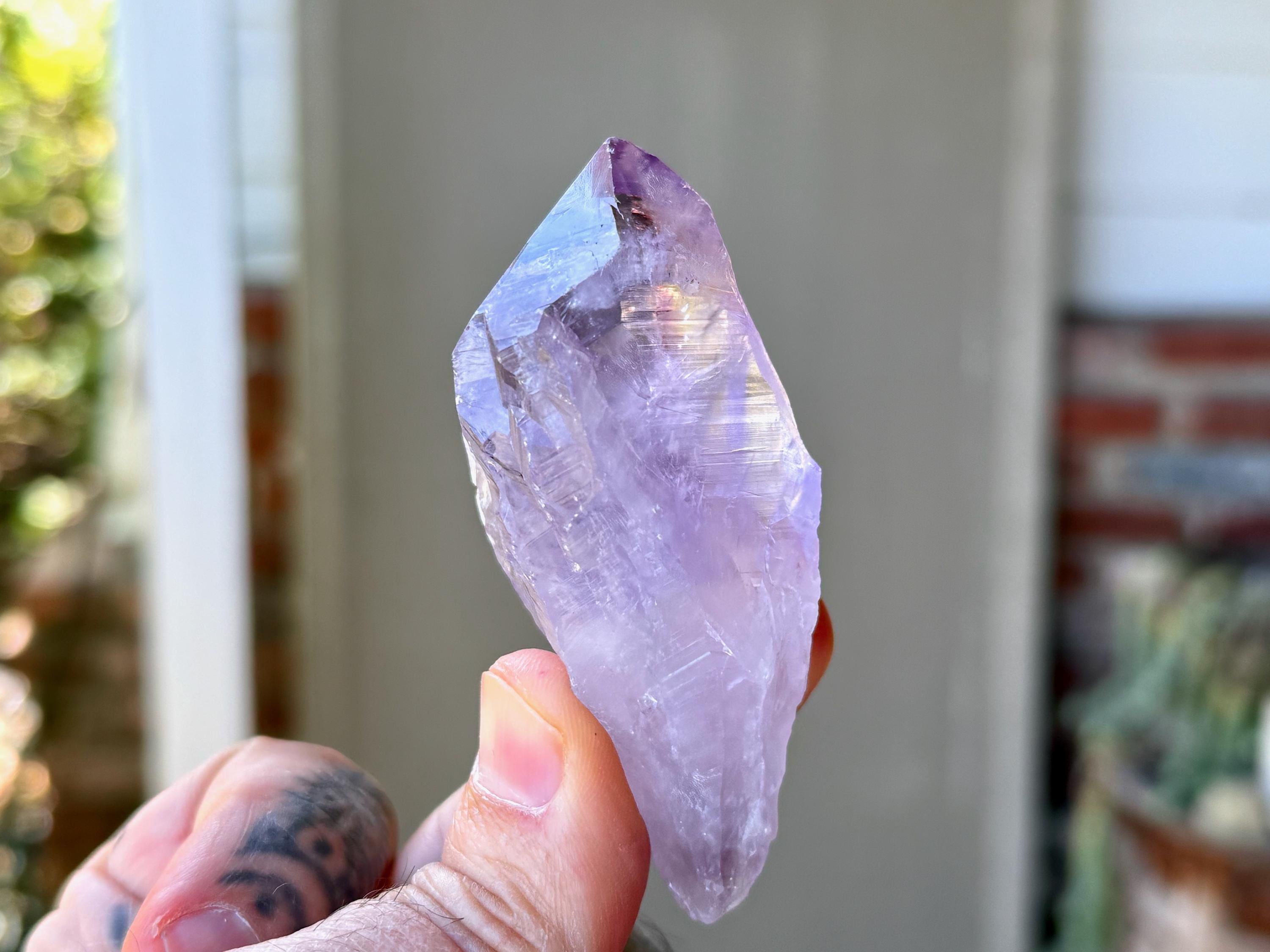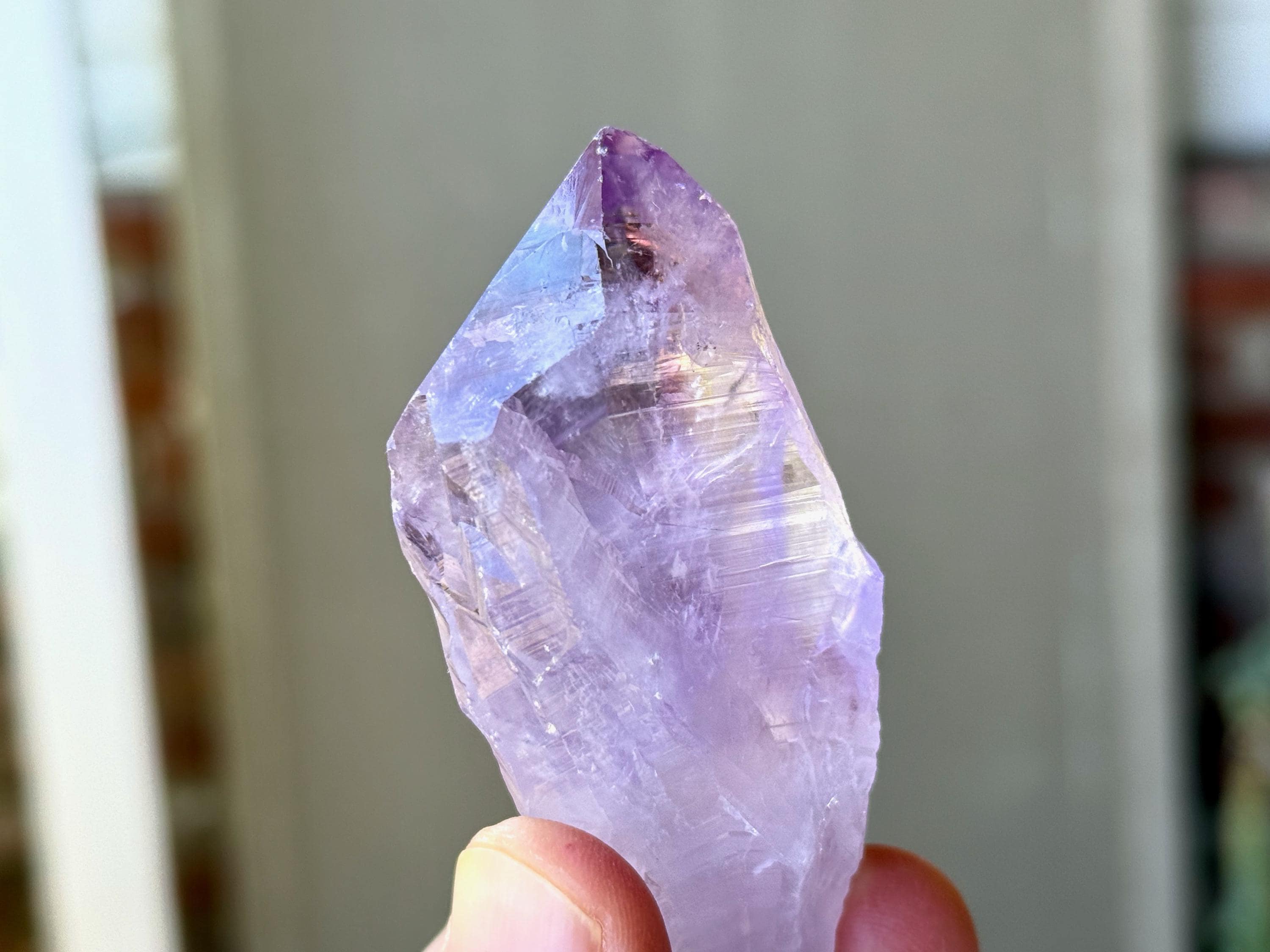 Tremendous luster and the sweetest lilac purple color to this exquisite Root Amethyst crystal. This crystal features an elongated "root" formation with natural contact imprints and textures covering the entire lower portion.