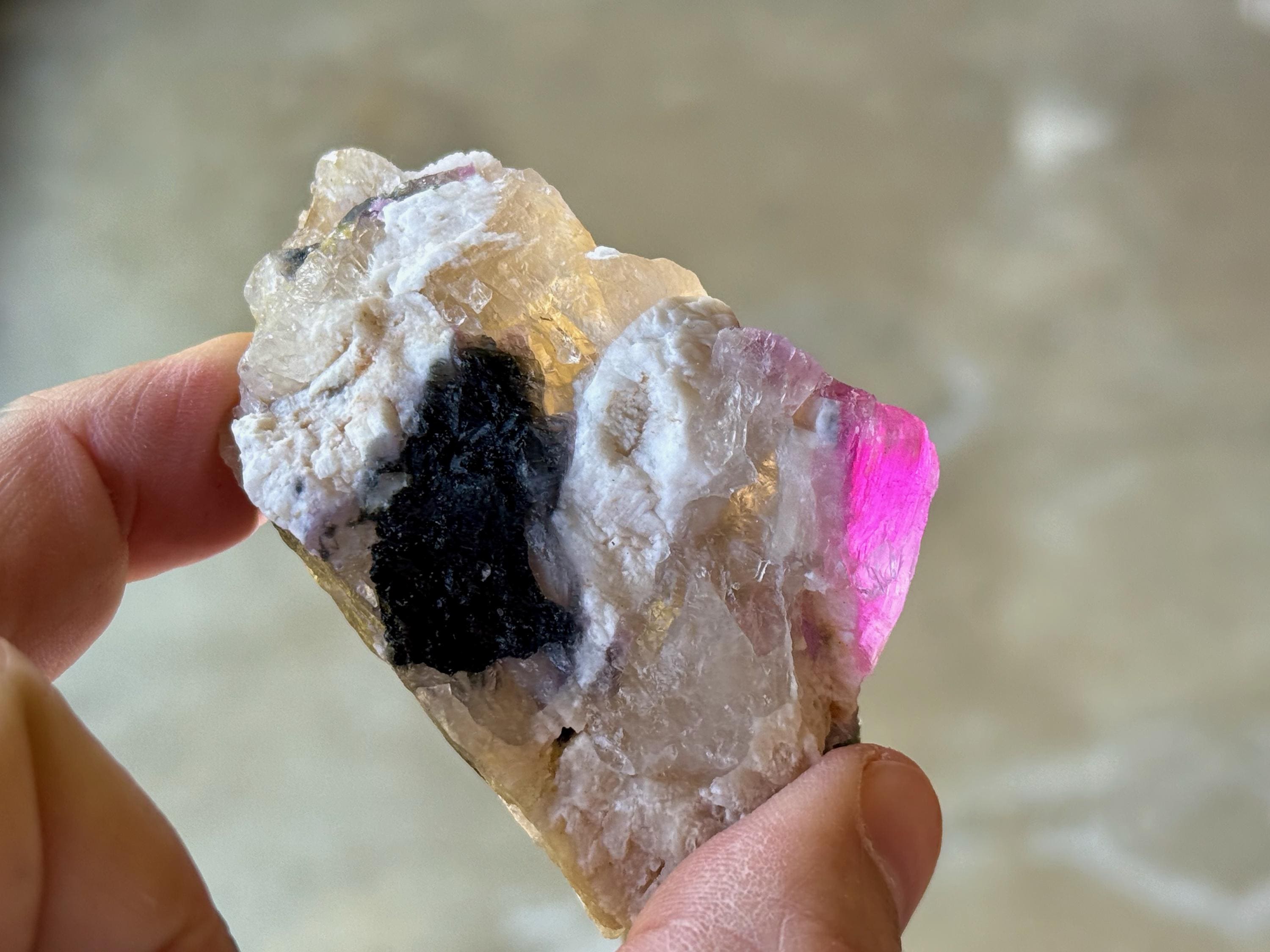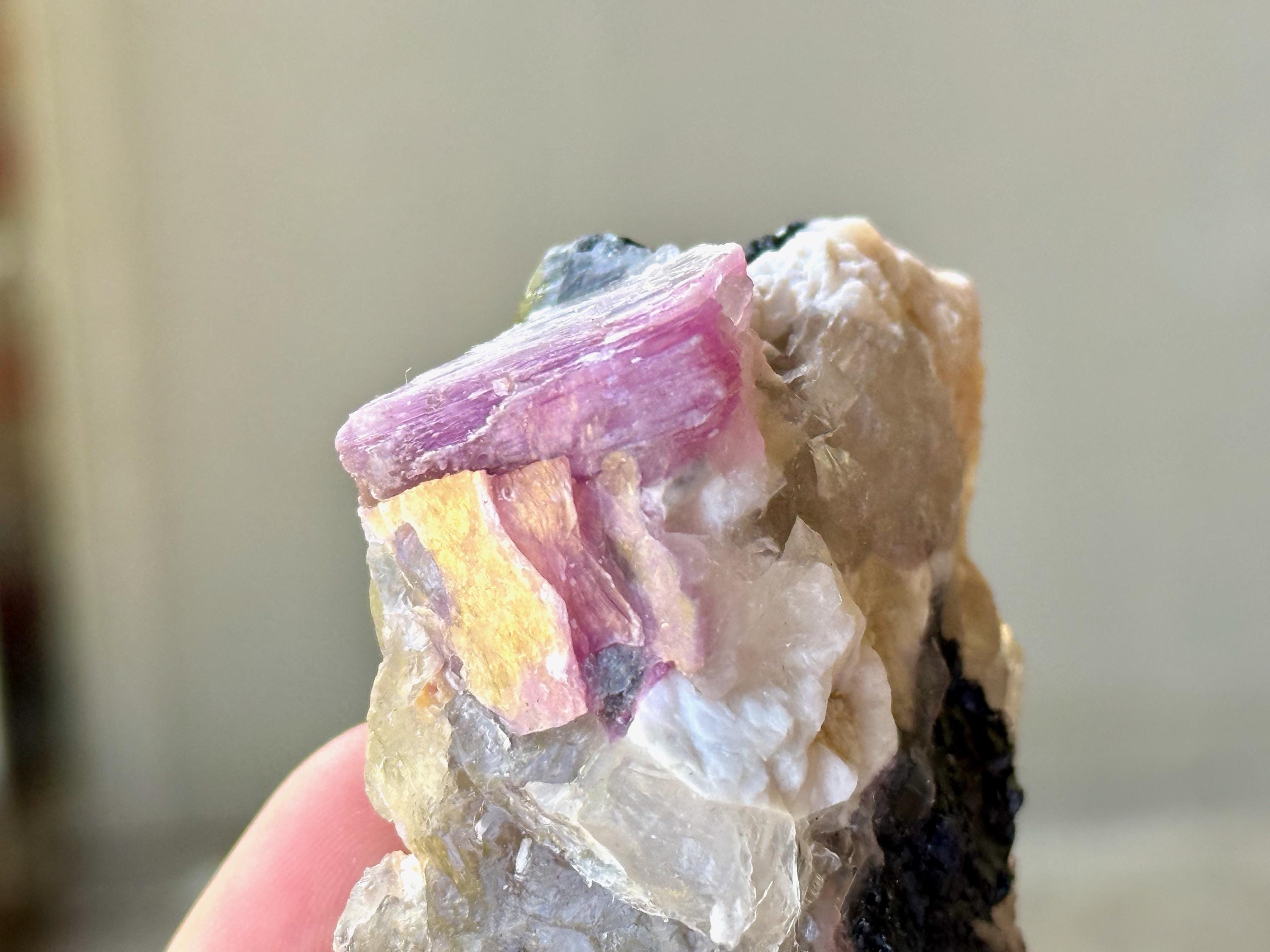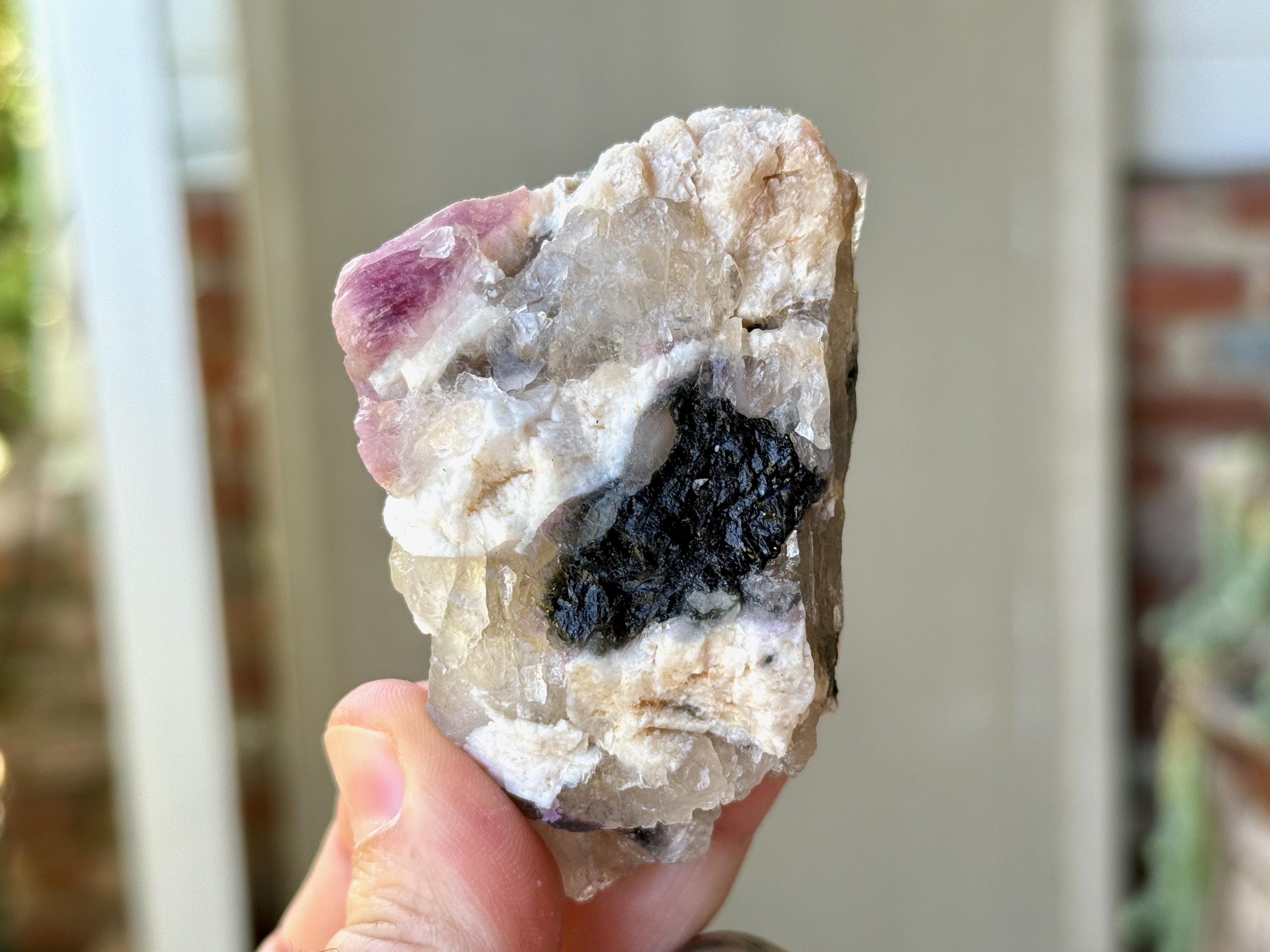 A colorful Unicorn Stone with a little bit of everything! This chunky crystal possesses a matrix of both Quartz and white Feldspar, which are marbled together beautifully. Embedded within are large inclusions of very dark Blue Tourmaline and gemmy Purple Lepidolite.