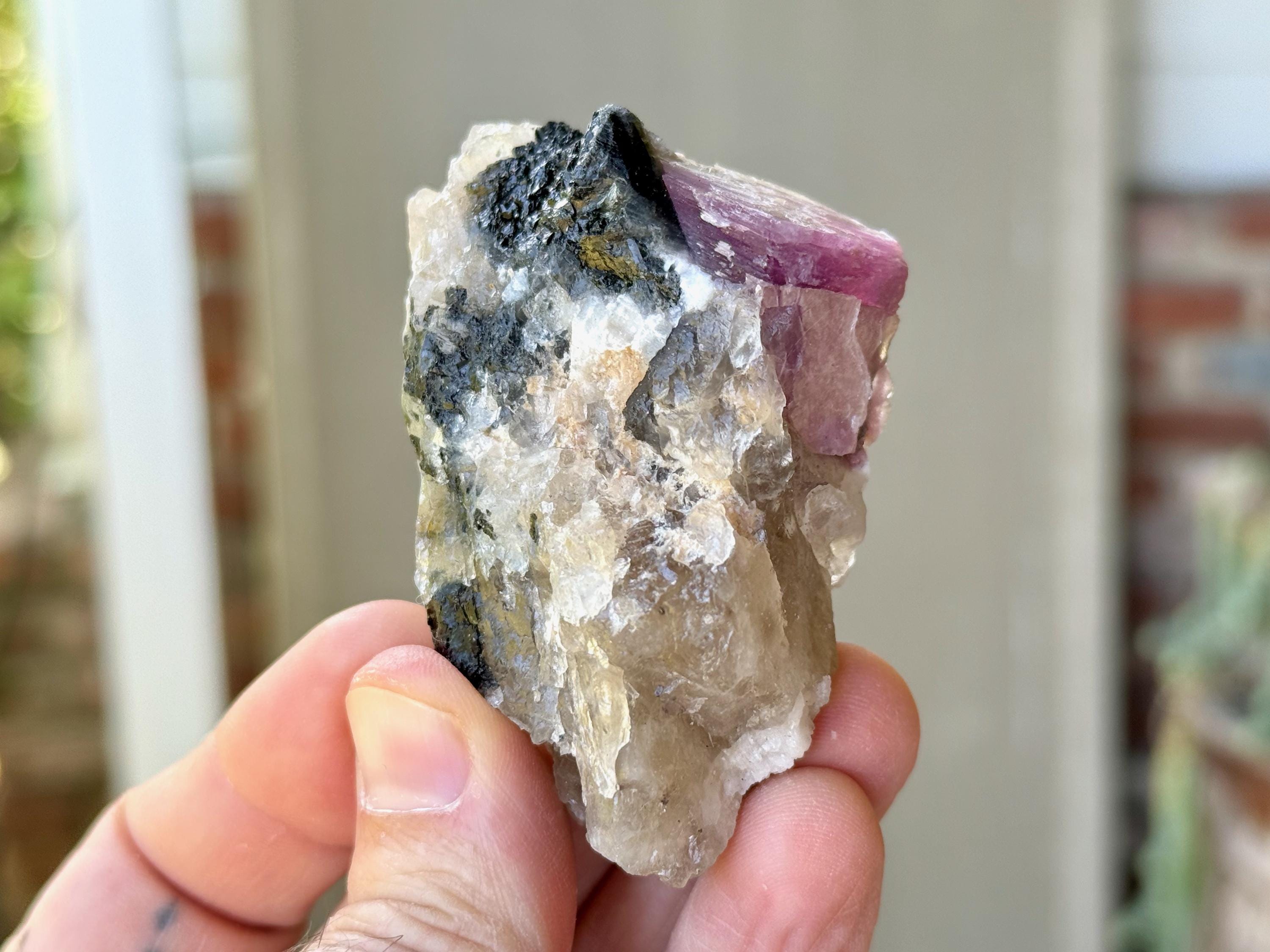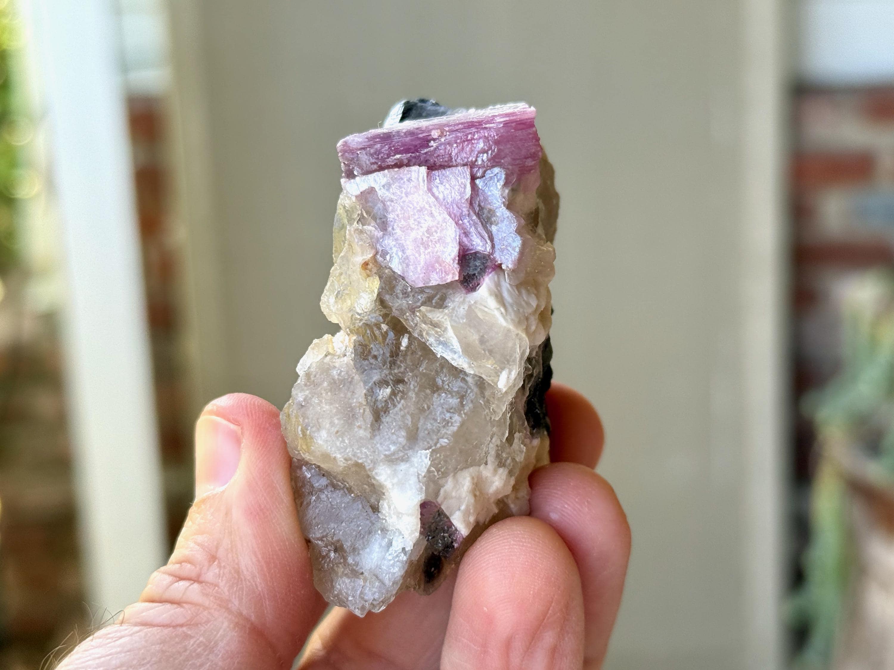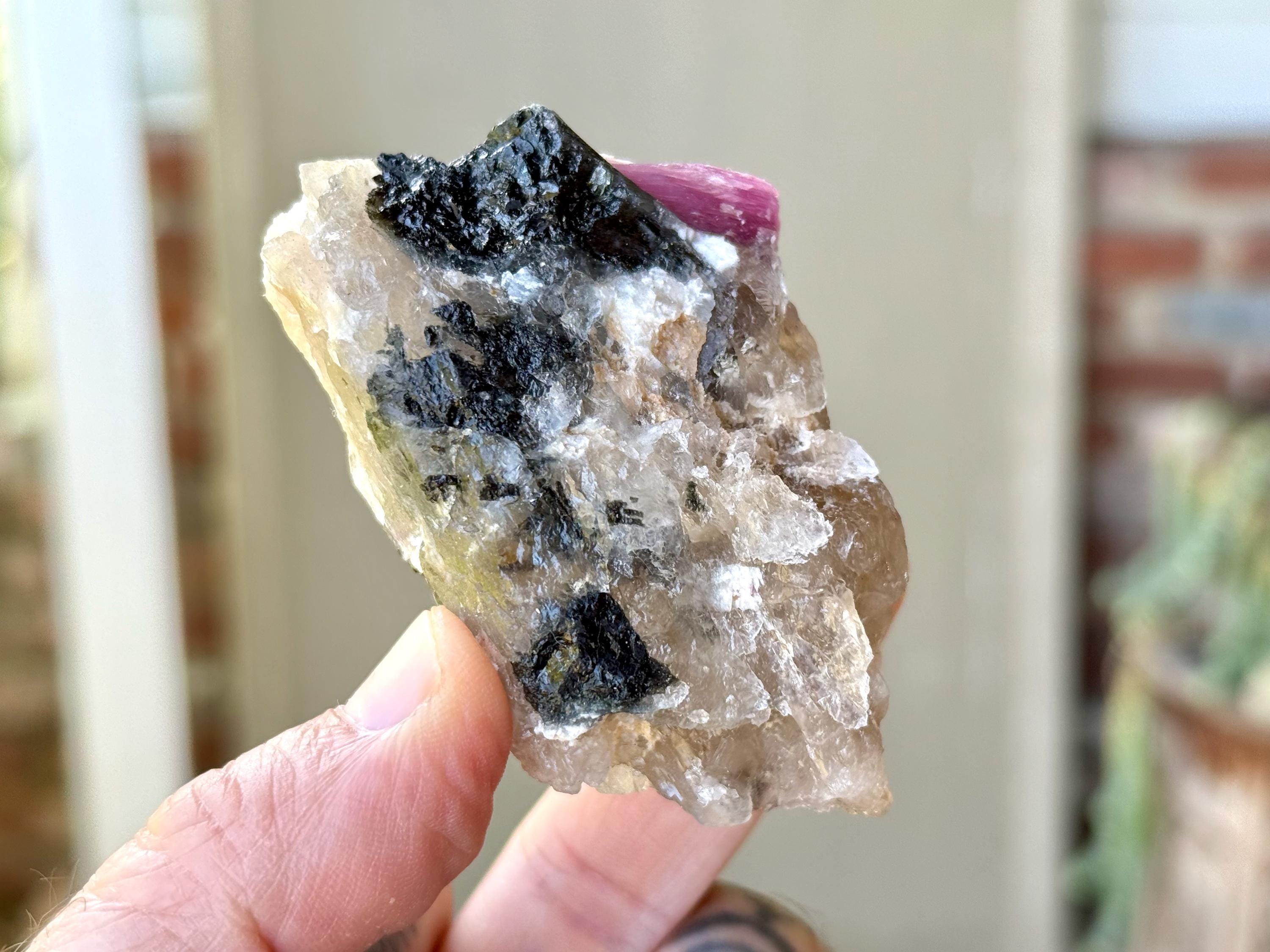 A colorful Unicorn Stone with a little bit of everything! This chunky crystal possesses a matrix of both Quartz and white Feldspar, which are marbled together beautifully. Embedded within are large inclusions of very dark Blue Tourmaline and gemmy Purple Lepidolite.
