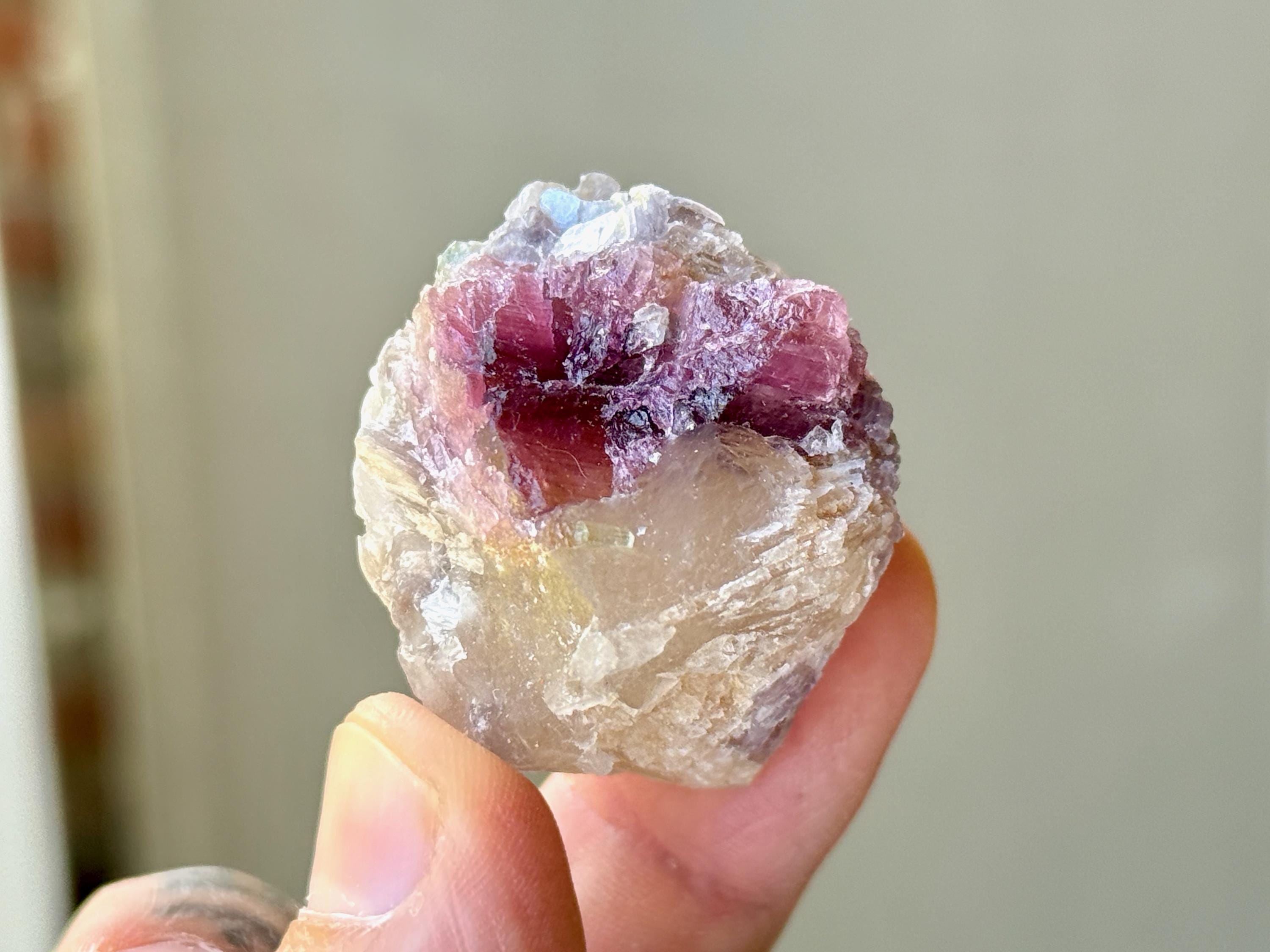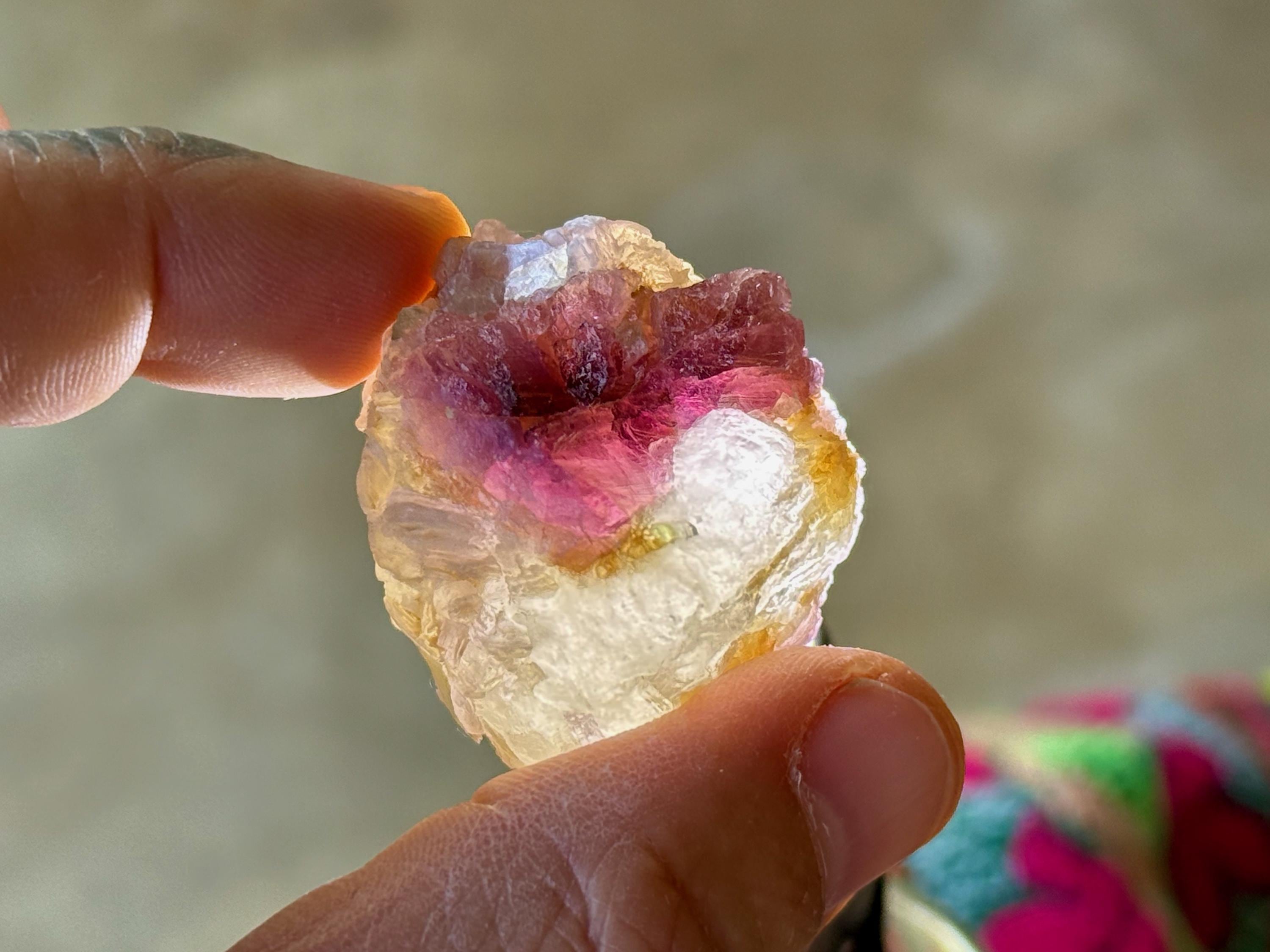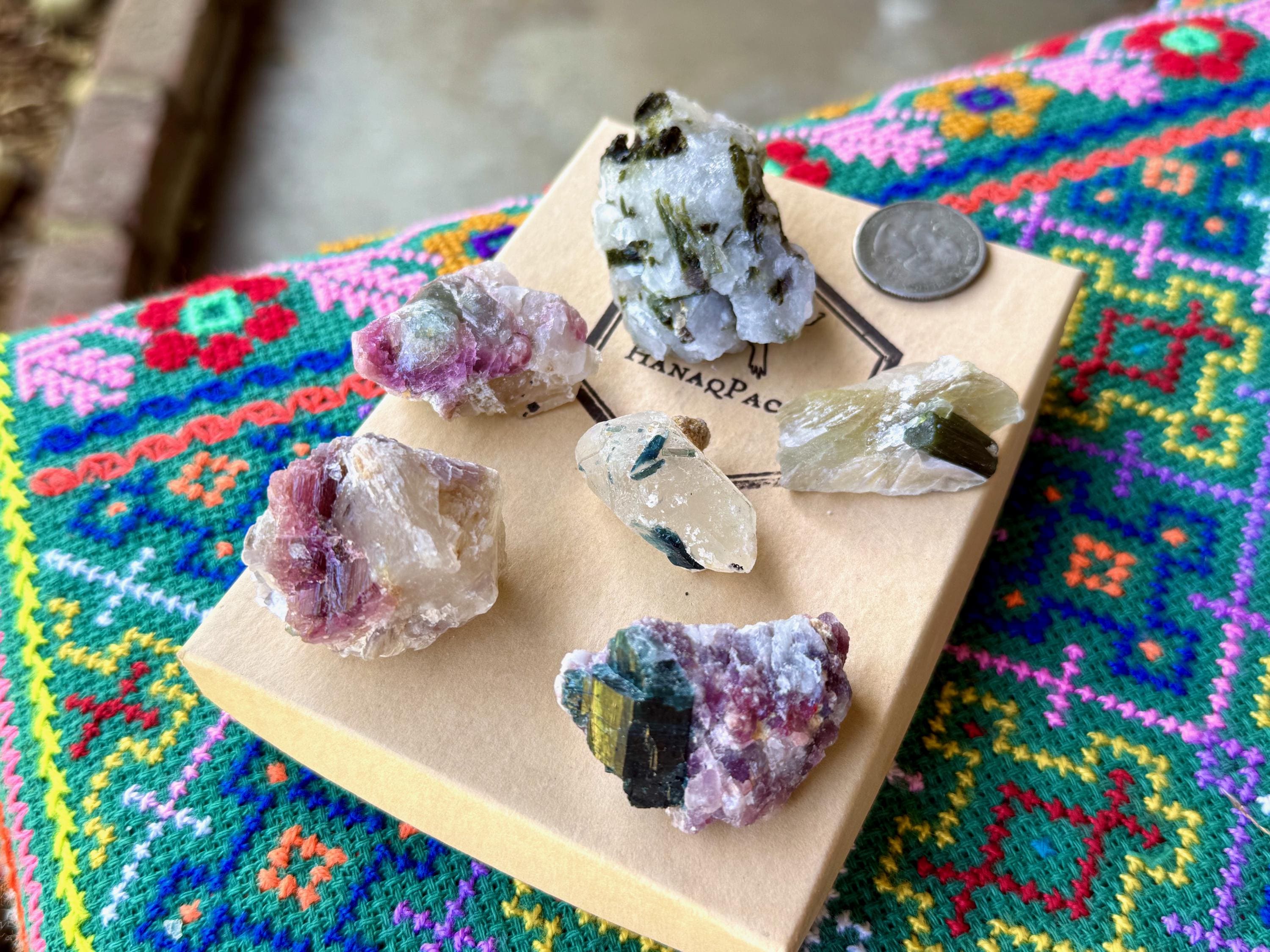 The crystals from this find include unique combinations of Quartz, Lepidolite, Citrine, Cleavelandite, Albite and Feldspar, with vividly colored Tourmalines in lovely hues of green, pink, purple and blue. Crystals with combinations of these minerals are sometimes referred to as "Unicorn Stones."