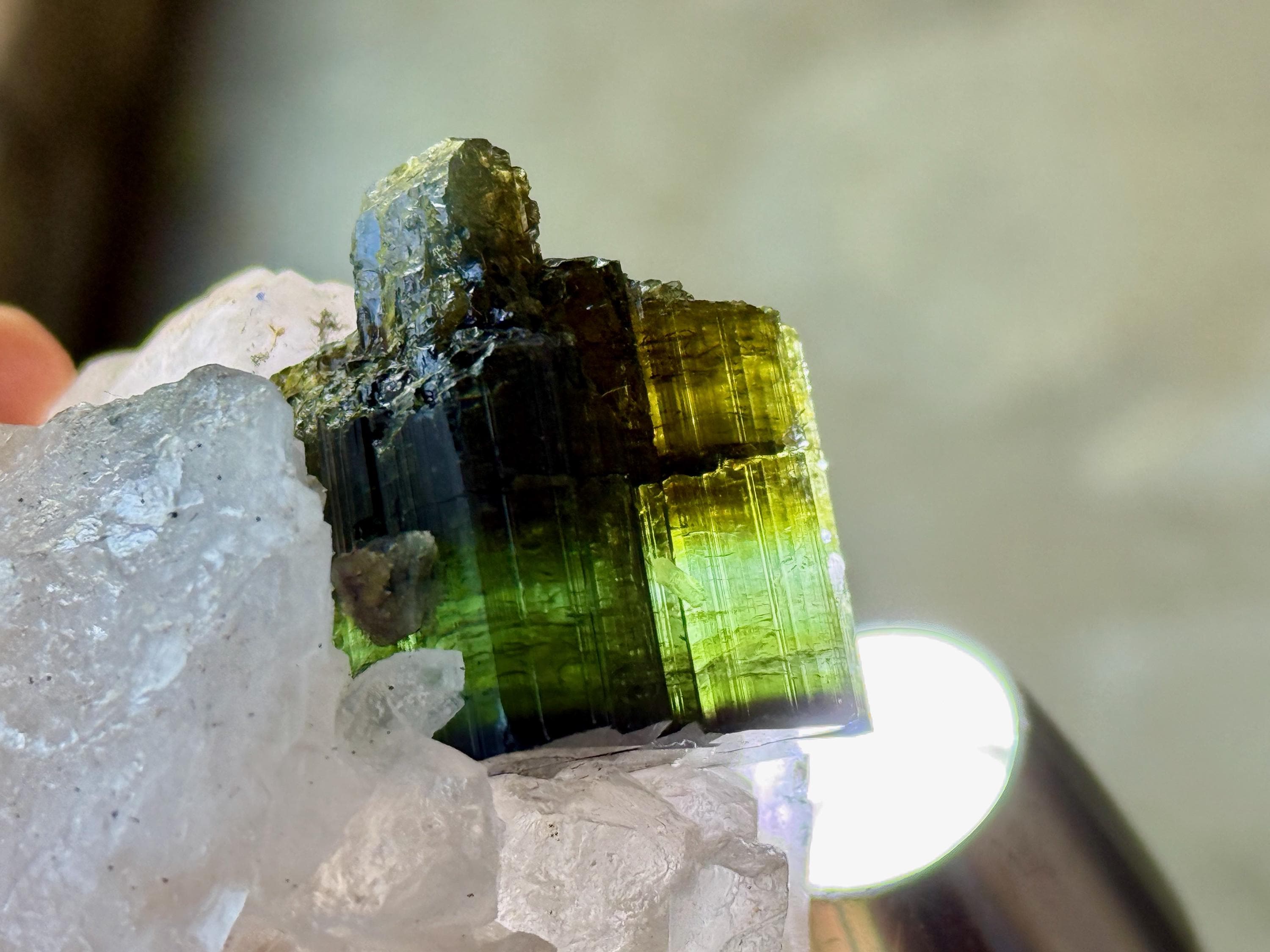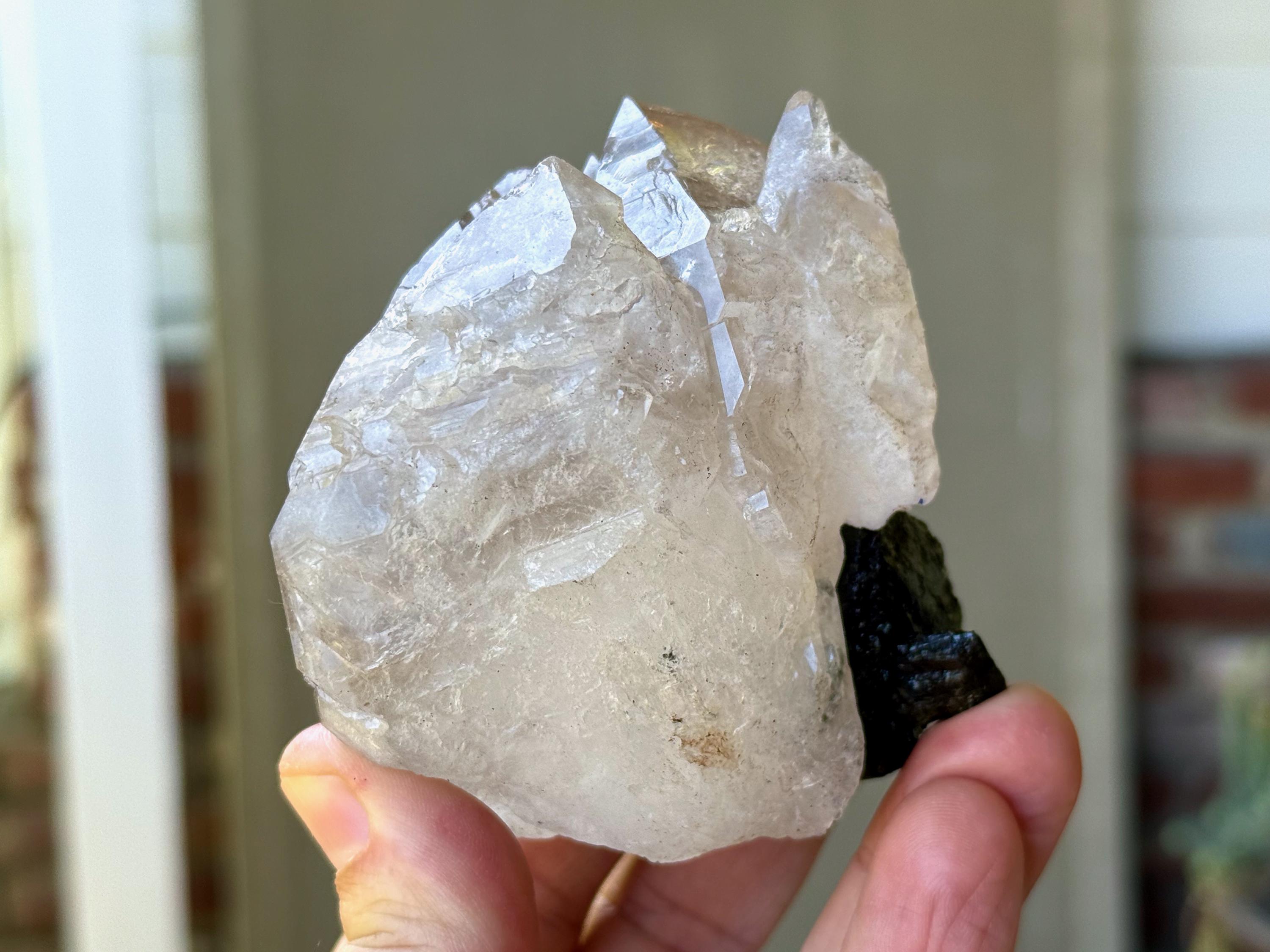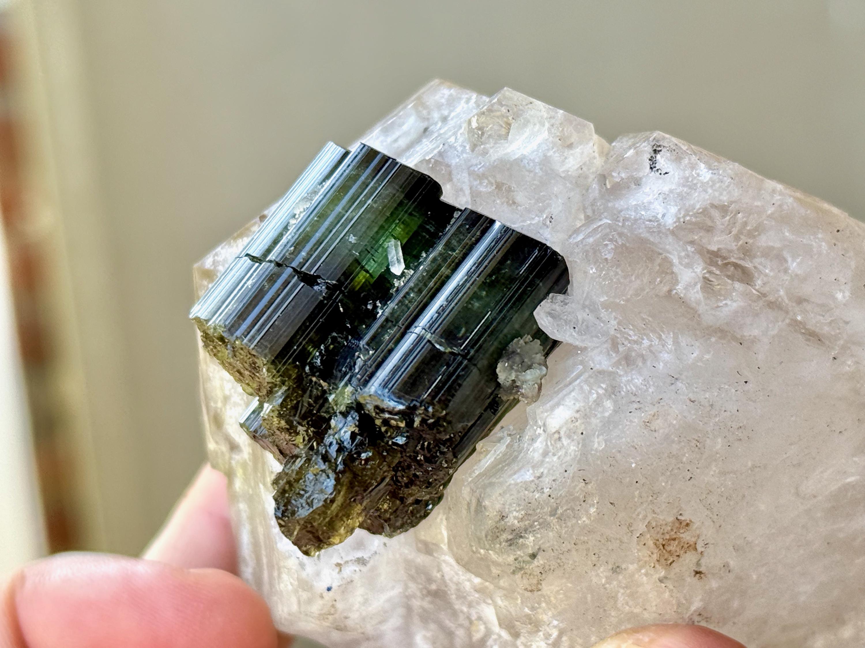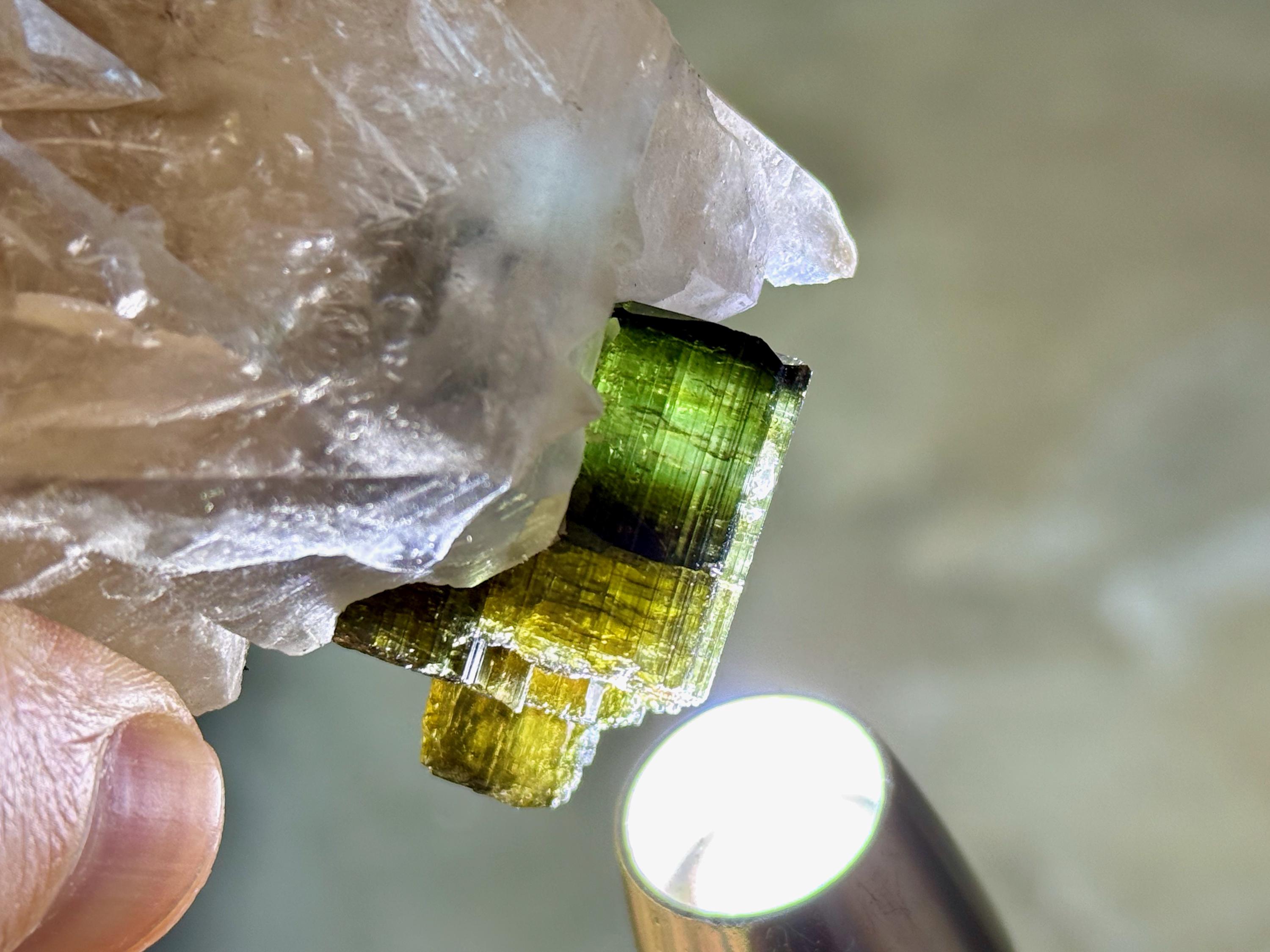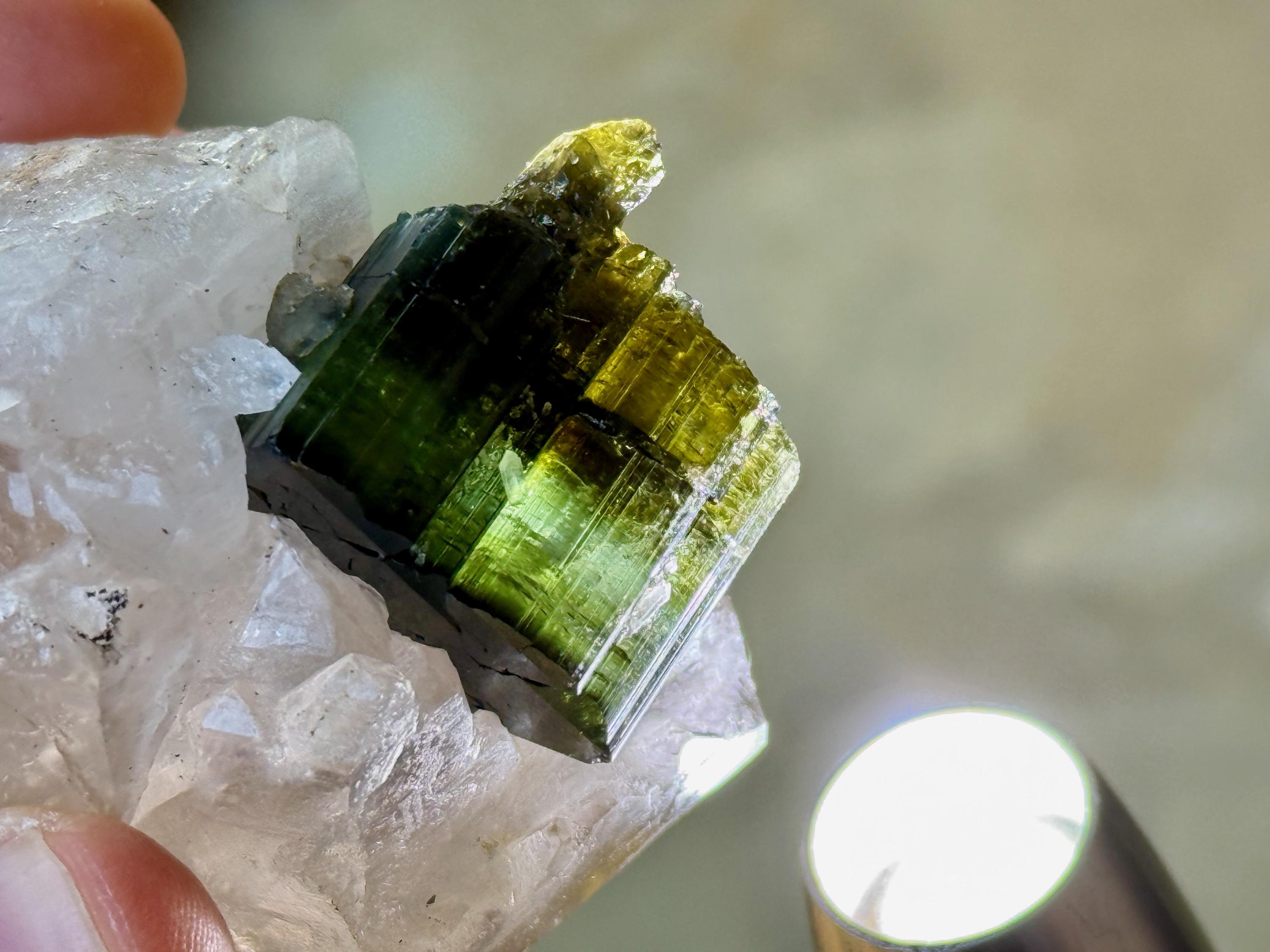 In natural light, this Tourmaline inclusion displays a dark and lustrous complexion that appears almost black, with hints of green. When backlit, however, this crystal comes to life in a spectacular way, displaying banded colors of yellow, light blue and green (from bottom to top). It looks like a sunset on the horizon!