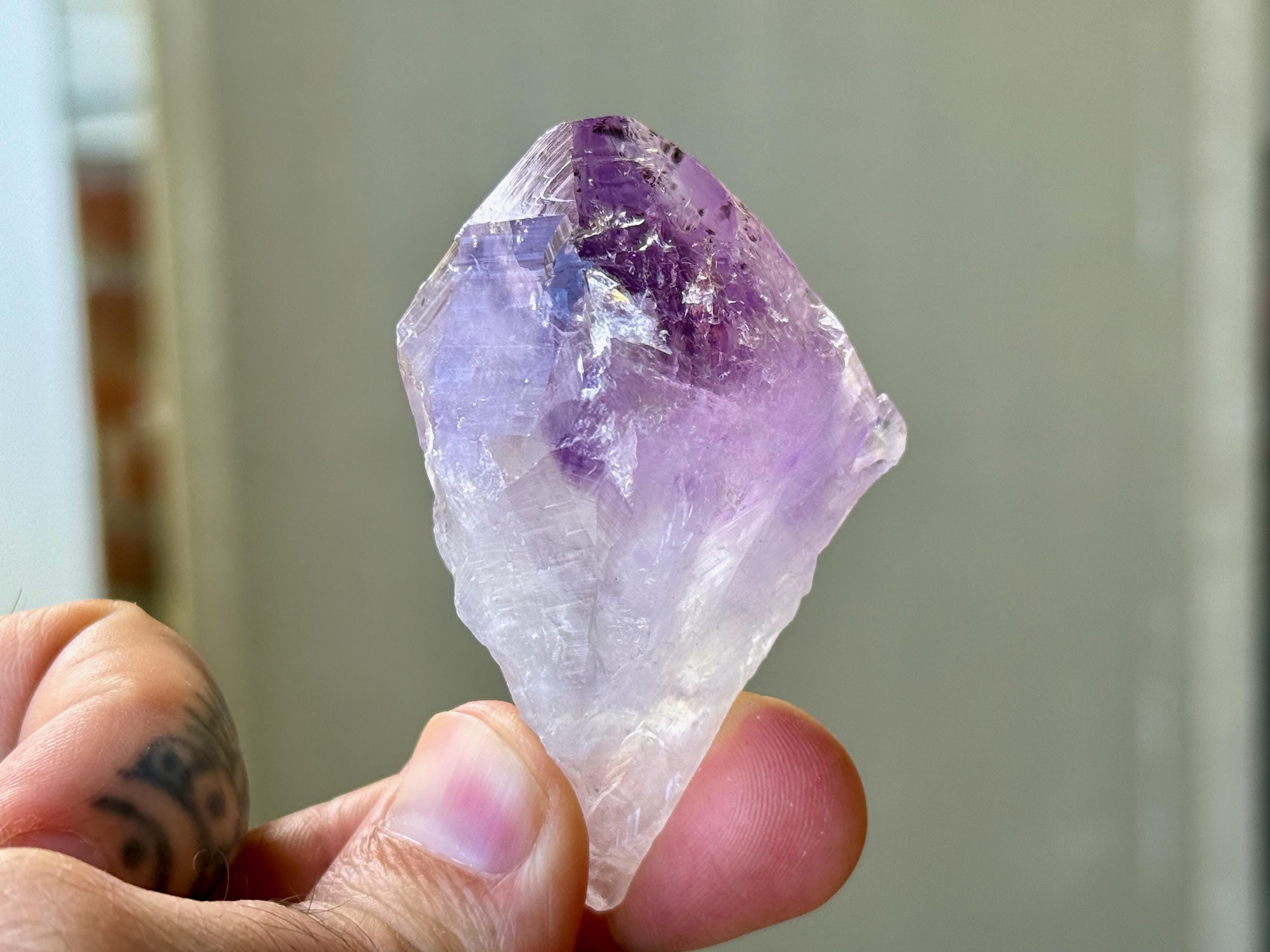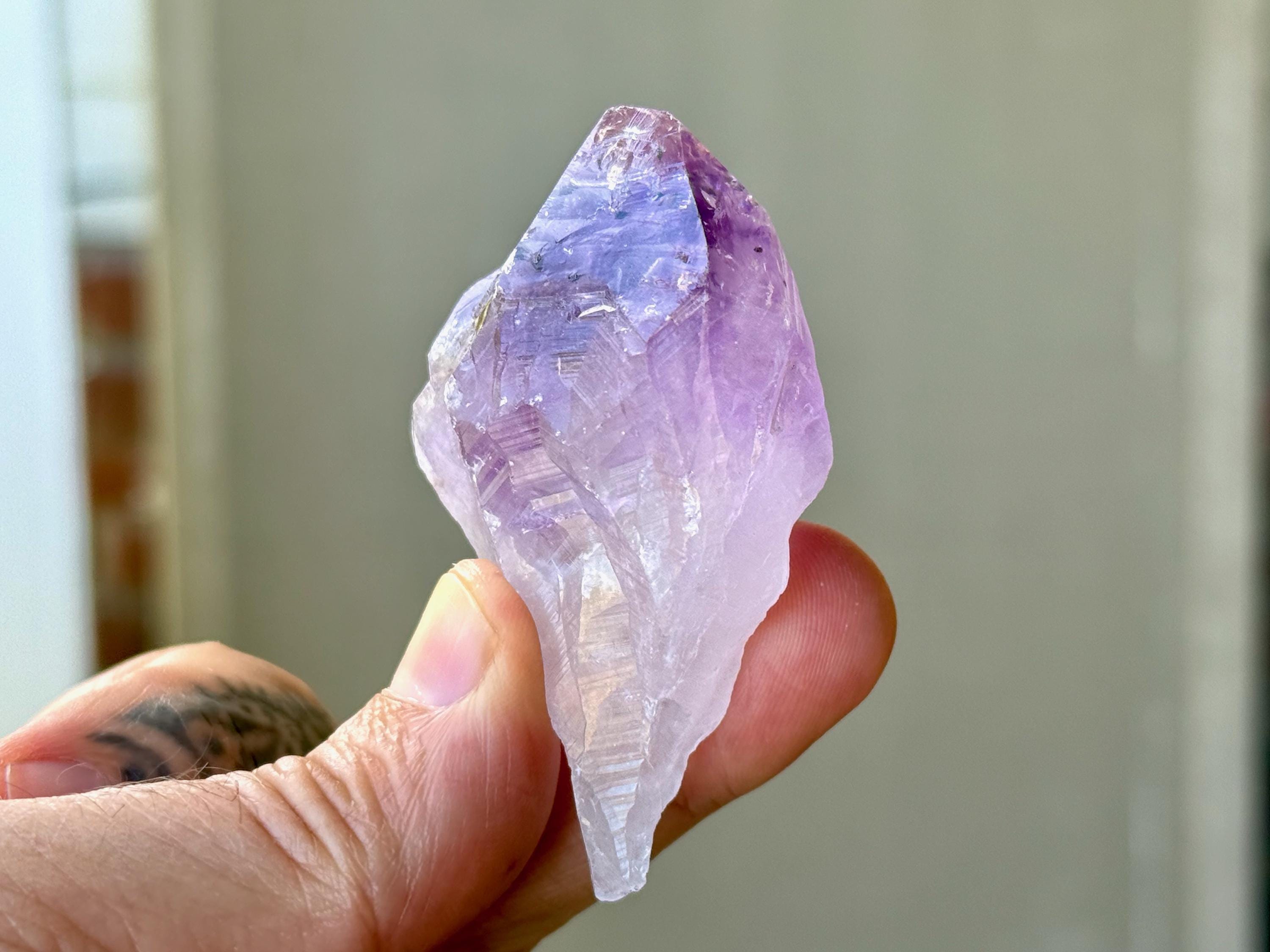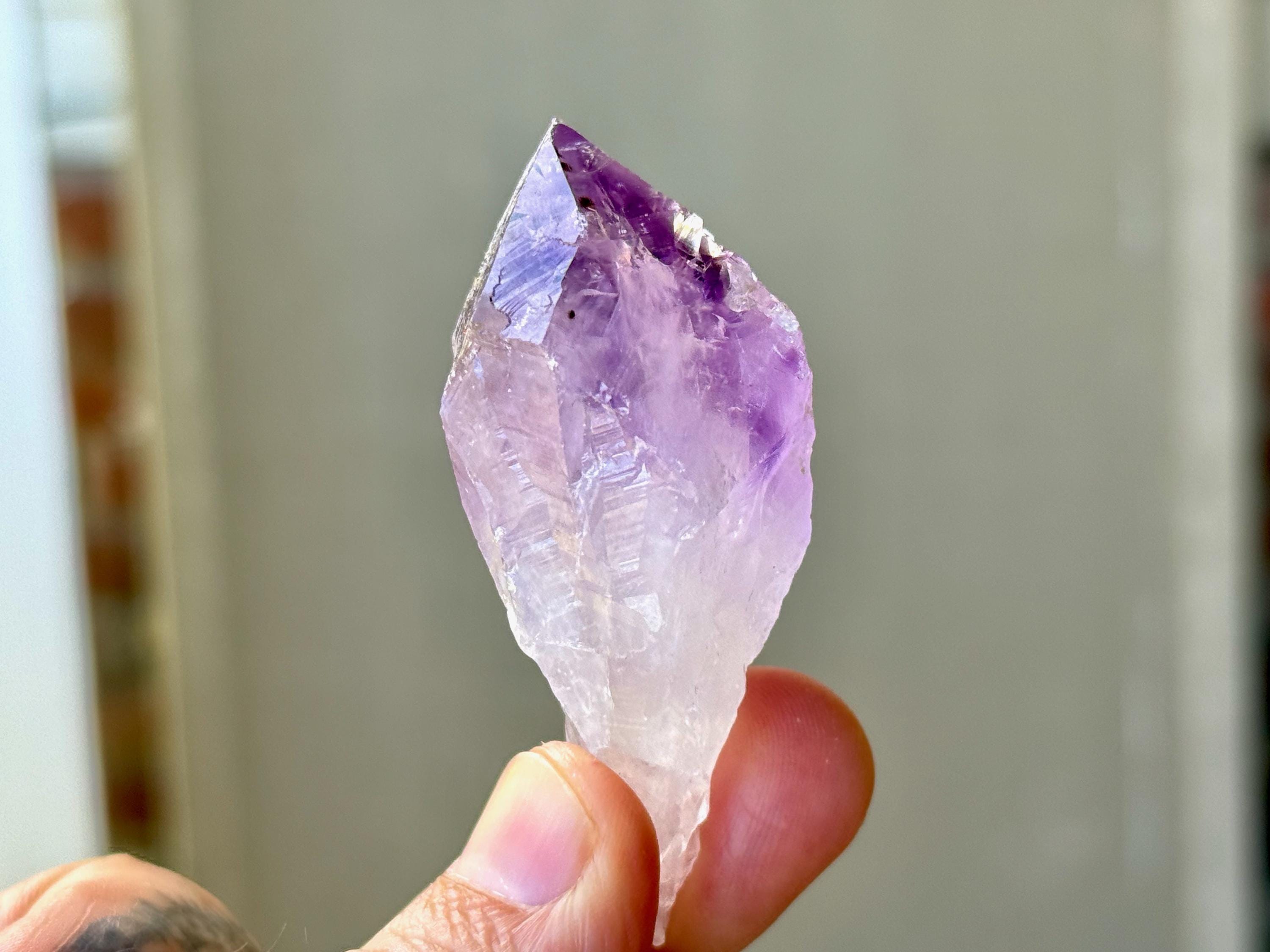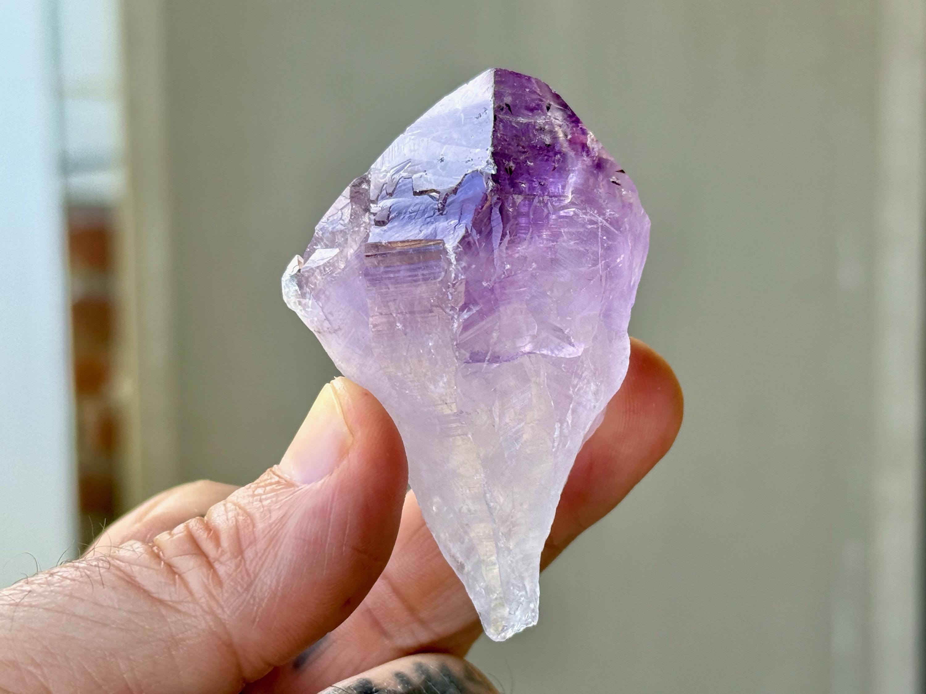 Exquisite luster and a vibrant purple color to this elegant Root Amethyst crystal. This crystal features a broad "root" formation with natural contact imprints and textures on the lower portion.