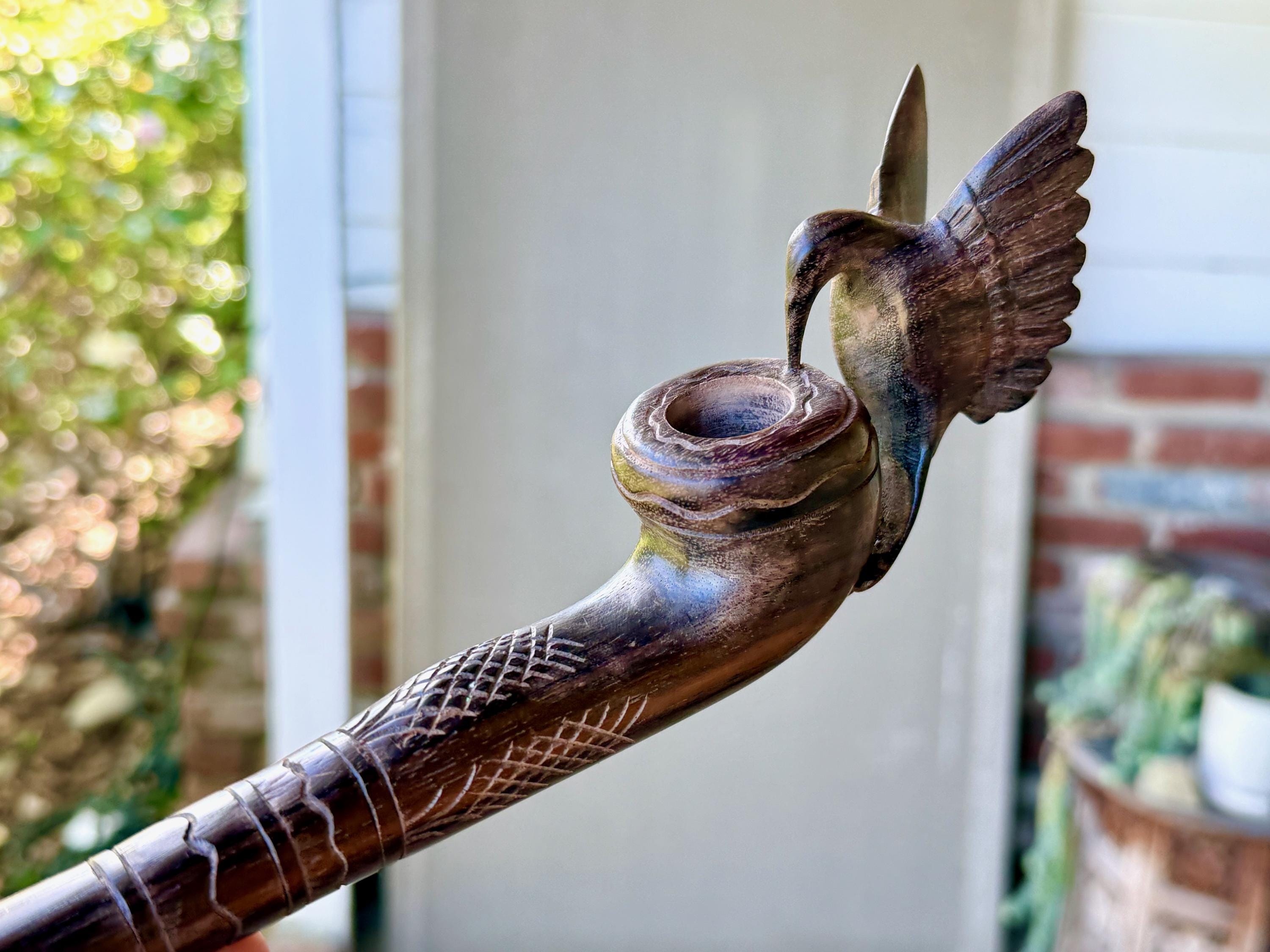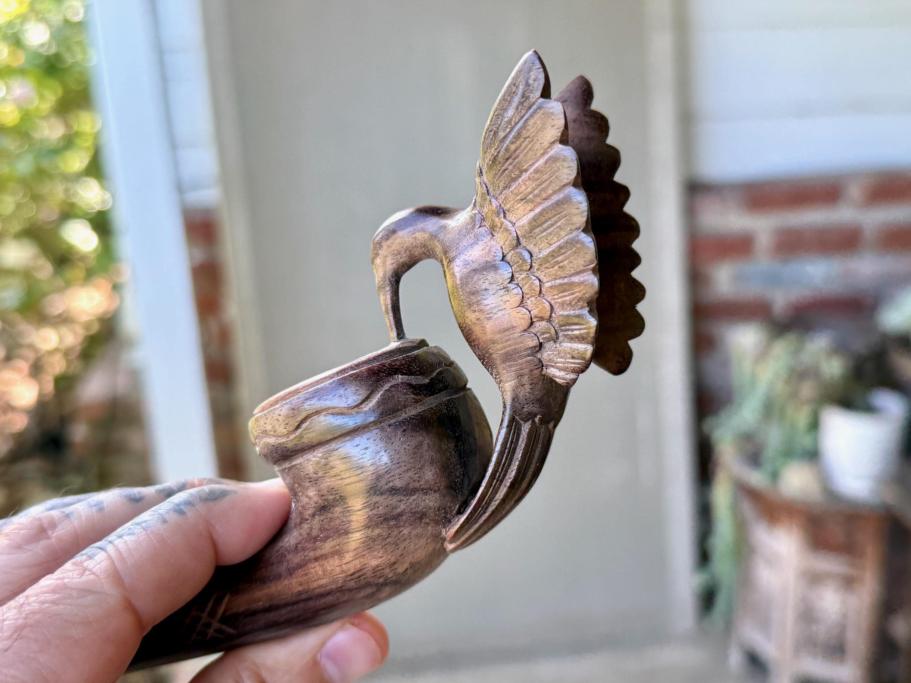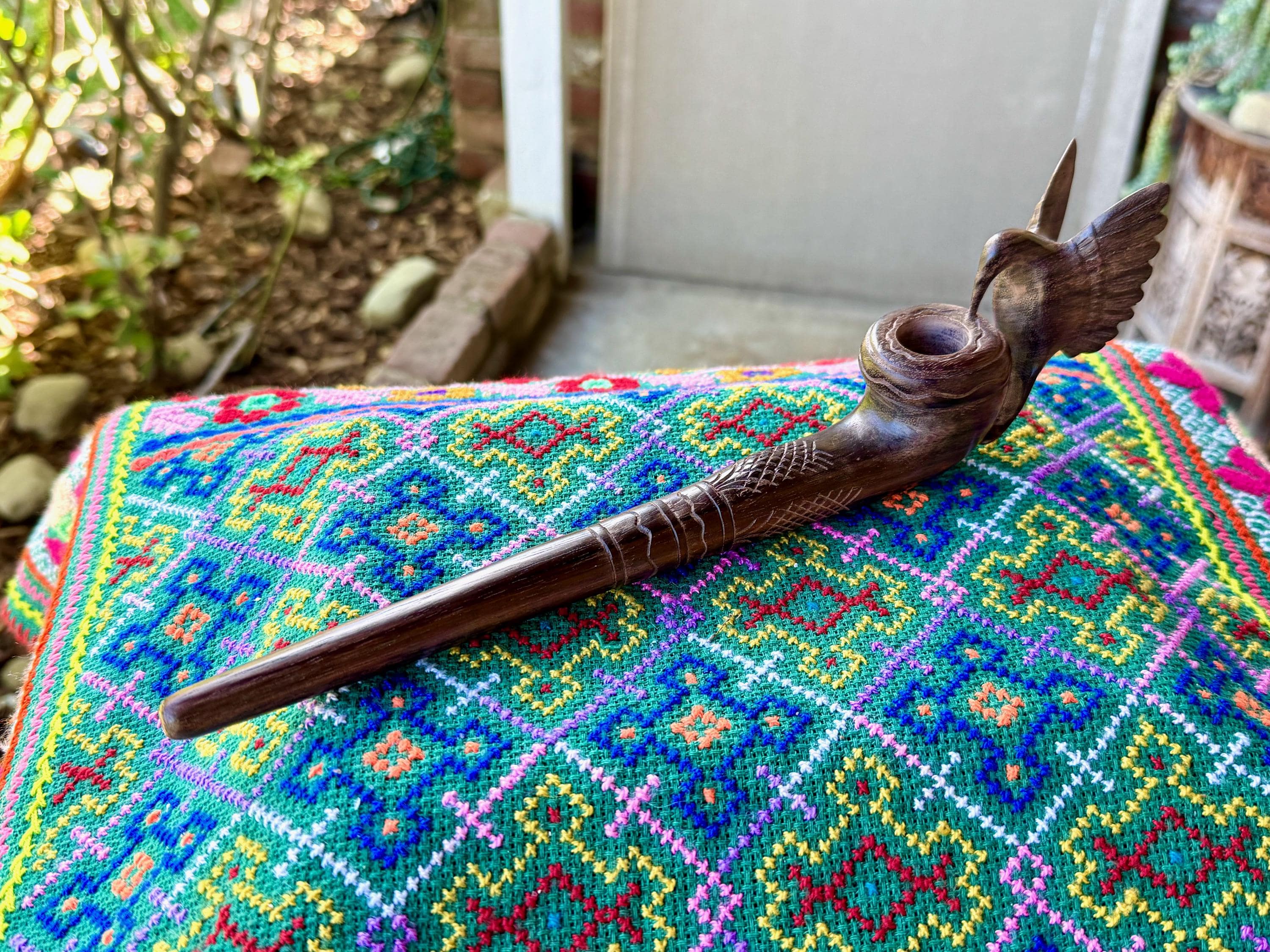 Our most beloved animal ally, the Hummingbird is depicted here with wings outstretched, perched atop this handsome tobacco pipe. We love the design and the beautiful, all natural two-tone hue of the wood. The level of craftsmanship is impressive, with such attention to detail (each feather is hand carved!). A beautiful and powerful tool for shamanic ceremony.