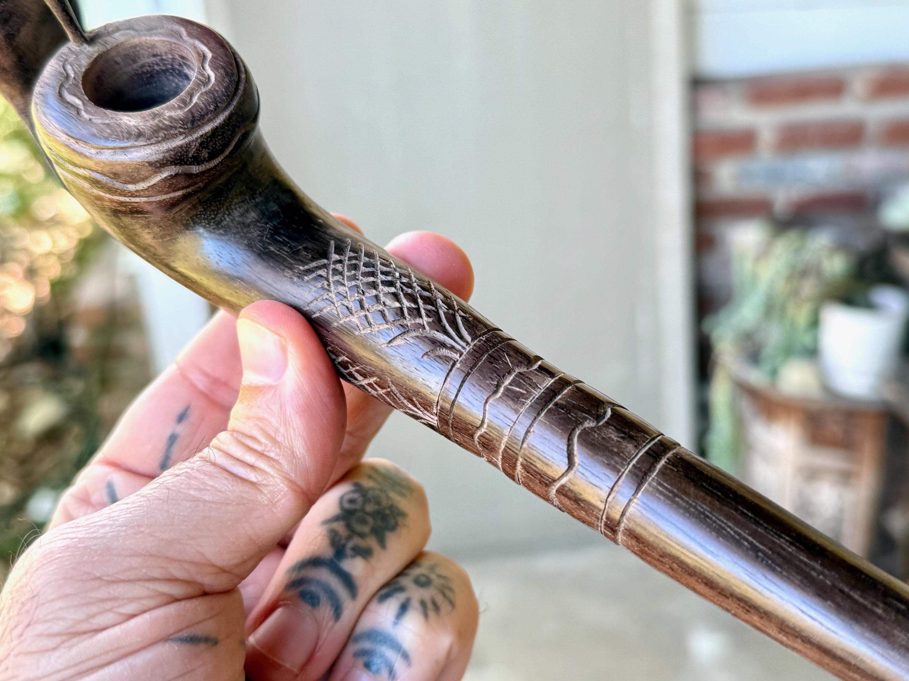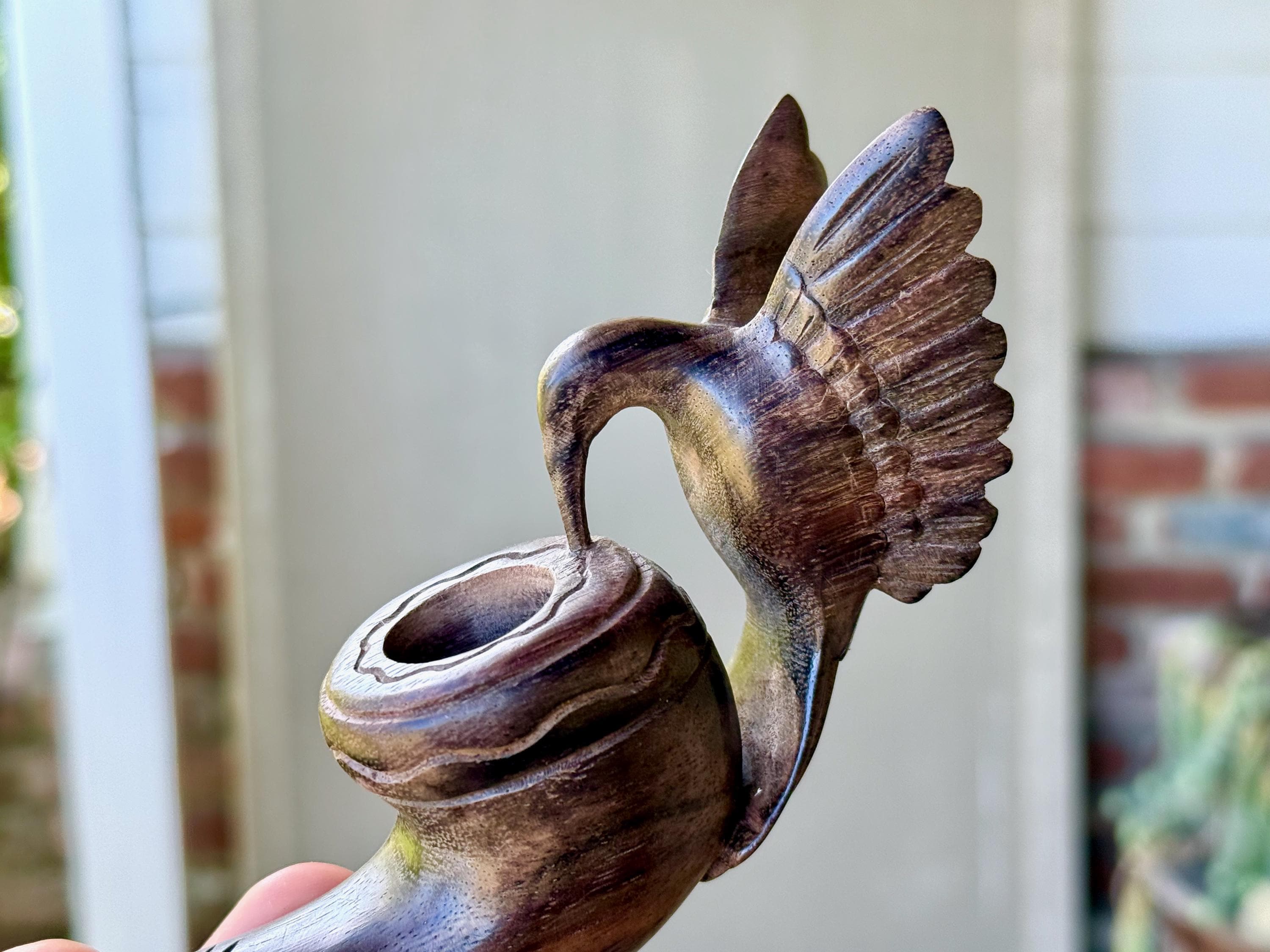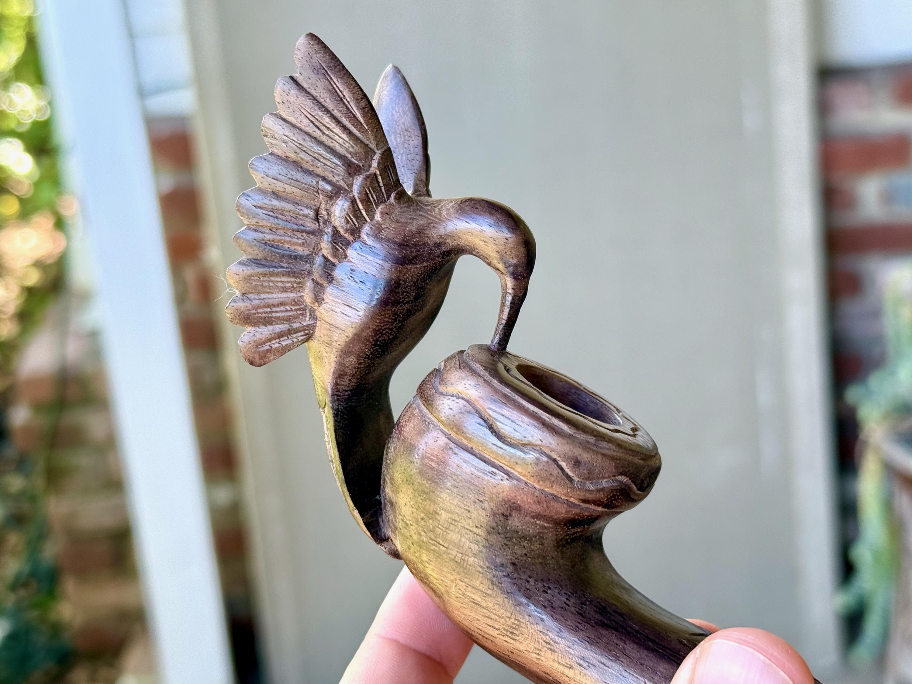 Our most beloved animal ally, the Hummingbird is depicted here with wings outstretched, perched atop this handsome tobacco pipe. We love the design and the beautiful, all natural two-tone hue of the wood. The level of craftsmanship is impressive, with such attention to detail (each feather is hand carved!). A beautiful and powerful tool for shamanic ceremony.