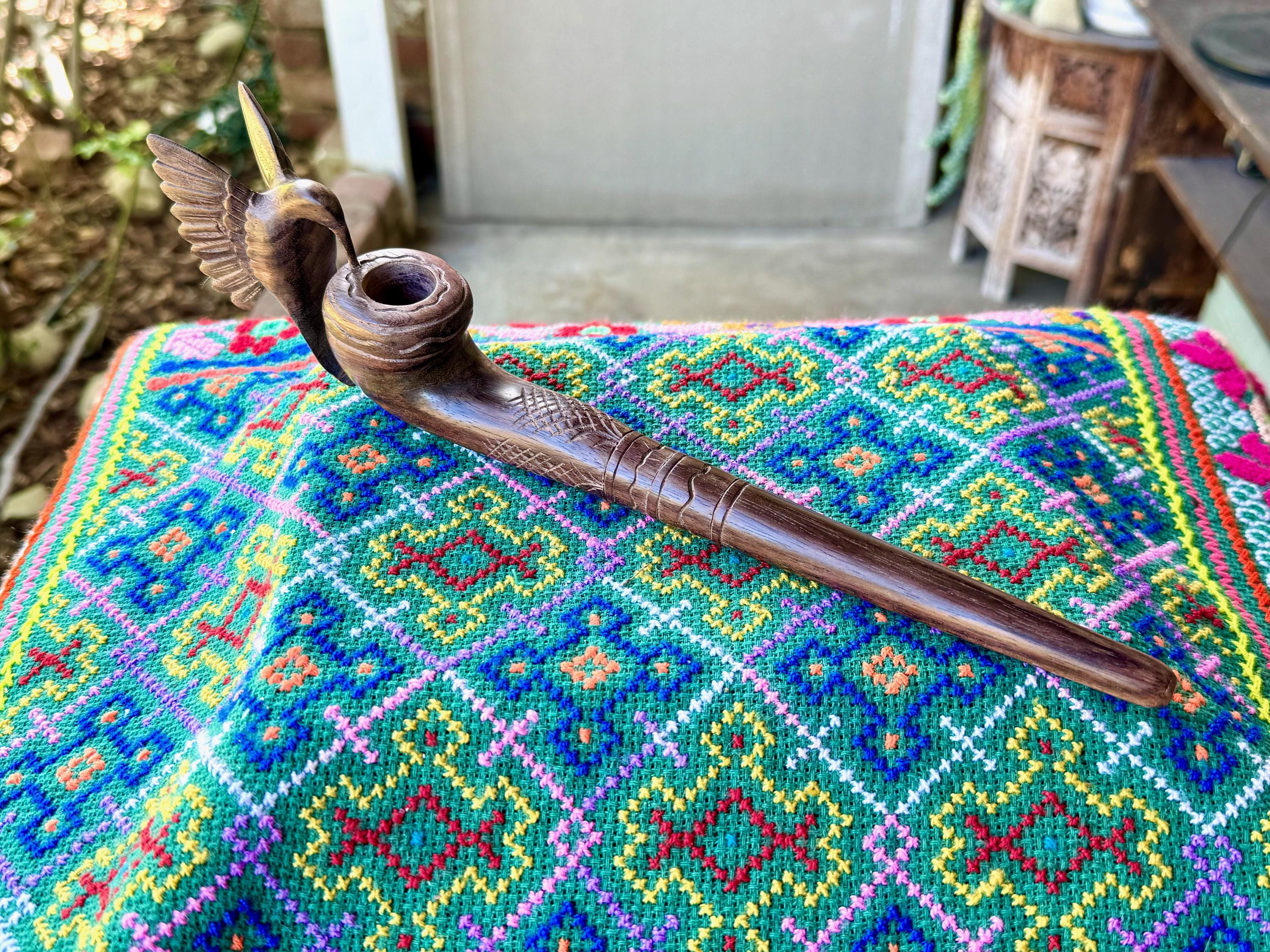 This exquisite Hummingbird Pipe for tobacco and mapacho was hand carved from natural, tropical hardwood. This pipe is intended for use in shamanic healing ceremonies or for other energy healing applications.