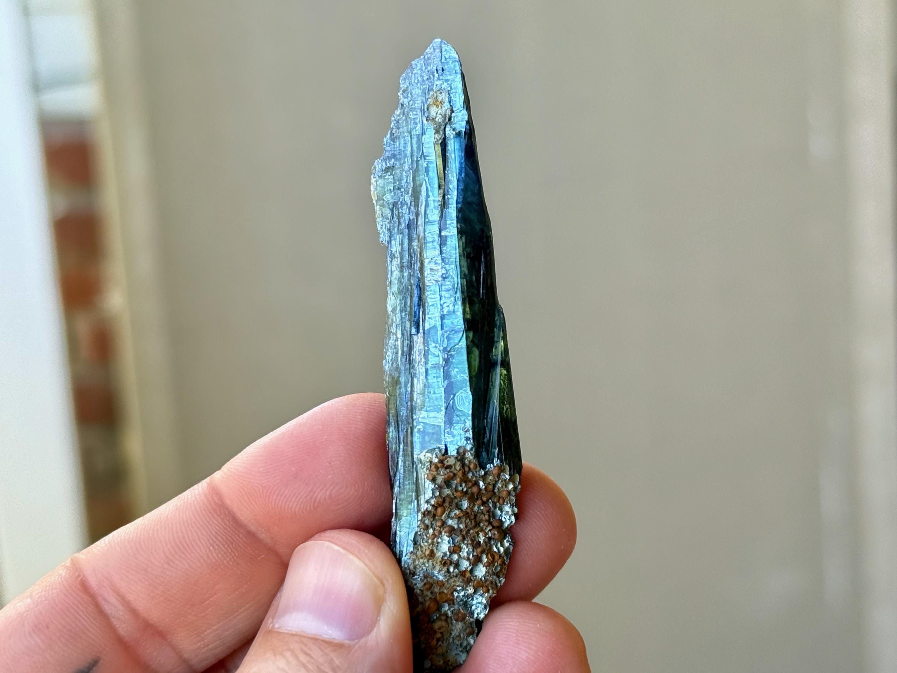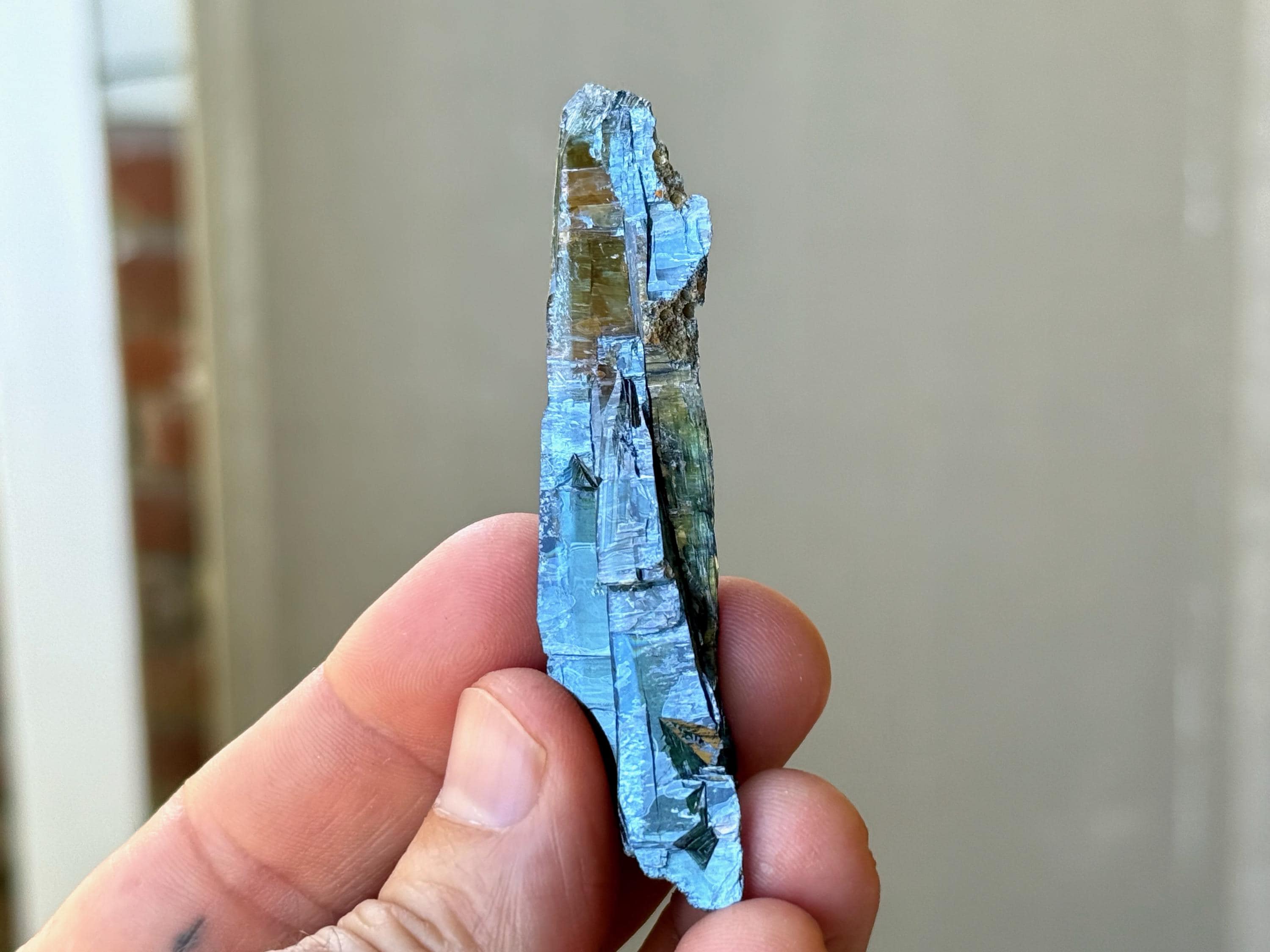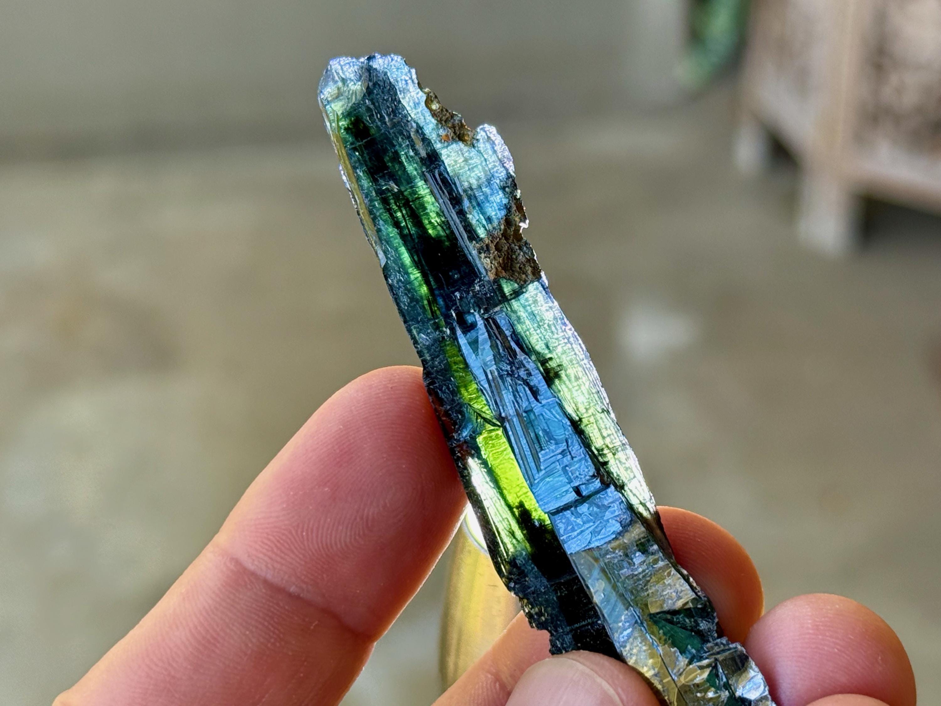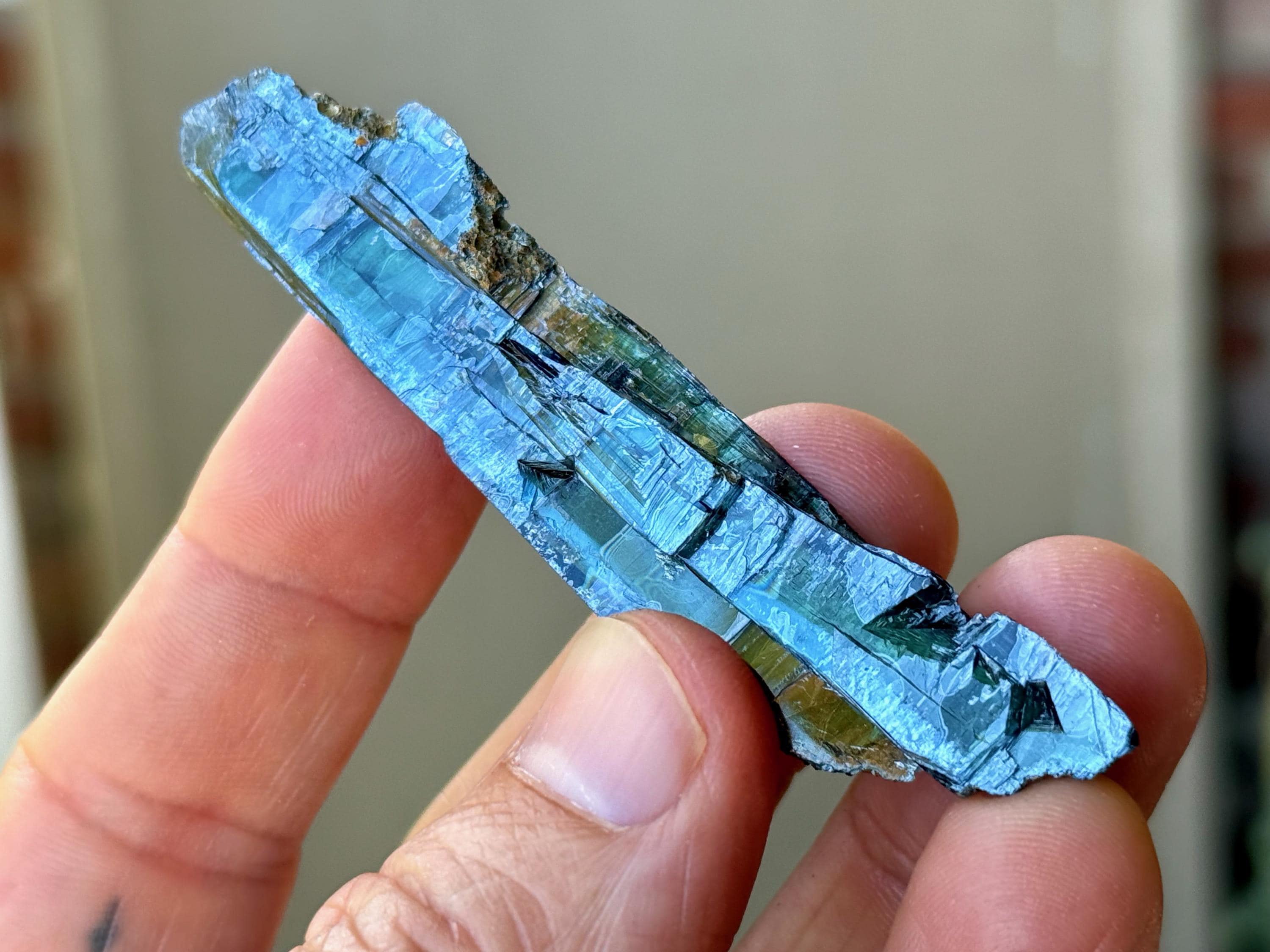 PLEASE NOTE: Vivianite should not be kept on permanent display or in direct sunlight for extended periods of time, as it will darken in color to almost black. This is due to the oxidation of the iron content in the crystal.