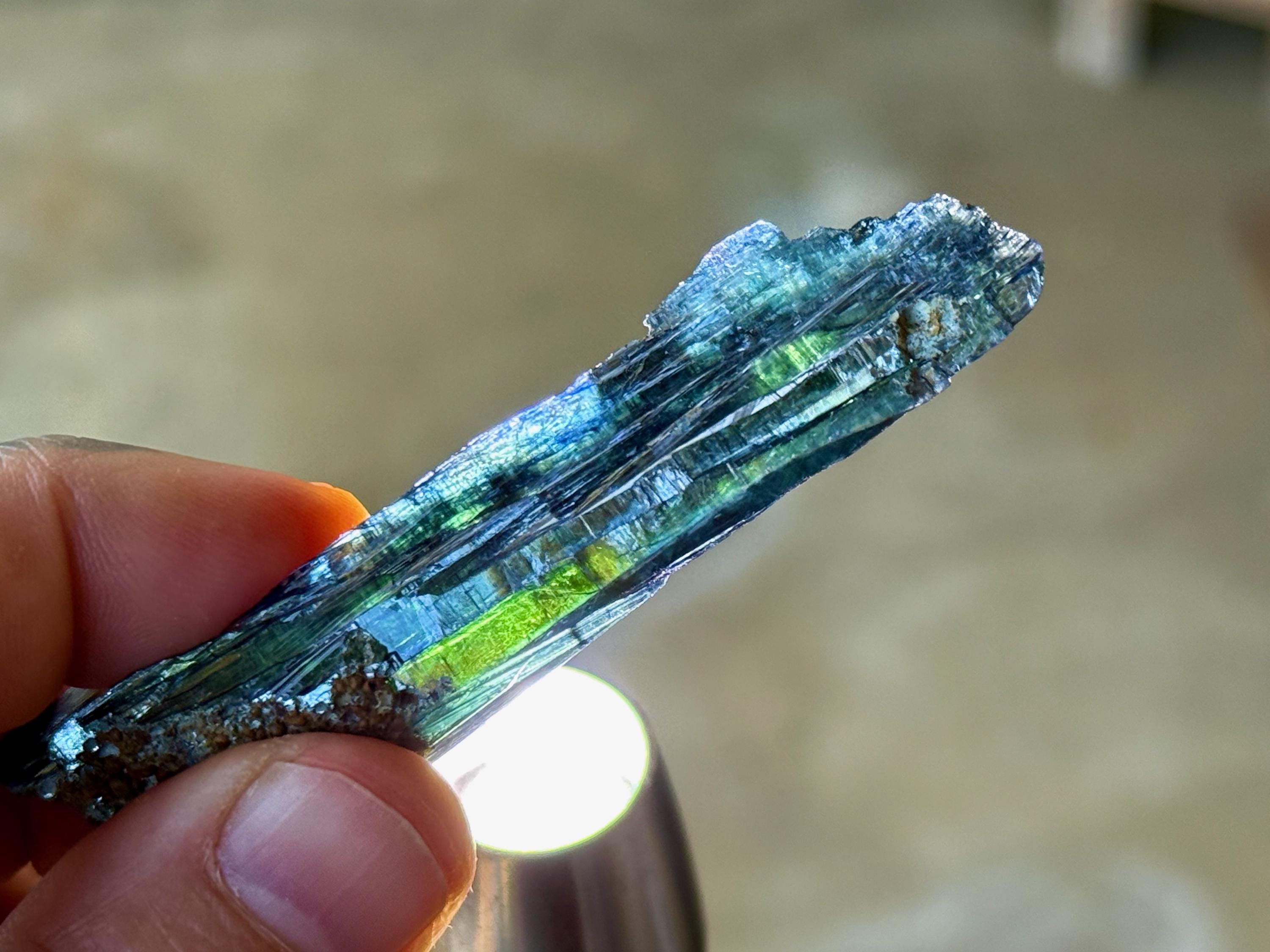 This crystal has outstanding translucency, and when backlit, we can see it light up with brilliant colors of blue and green (Photos 1, 3-5).