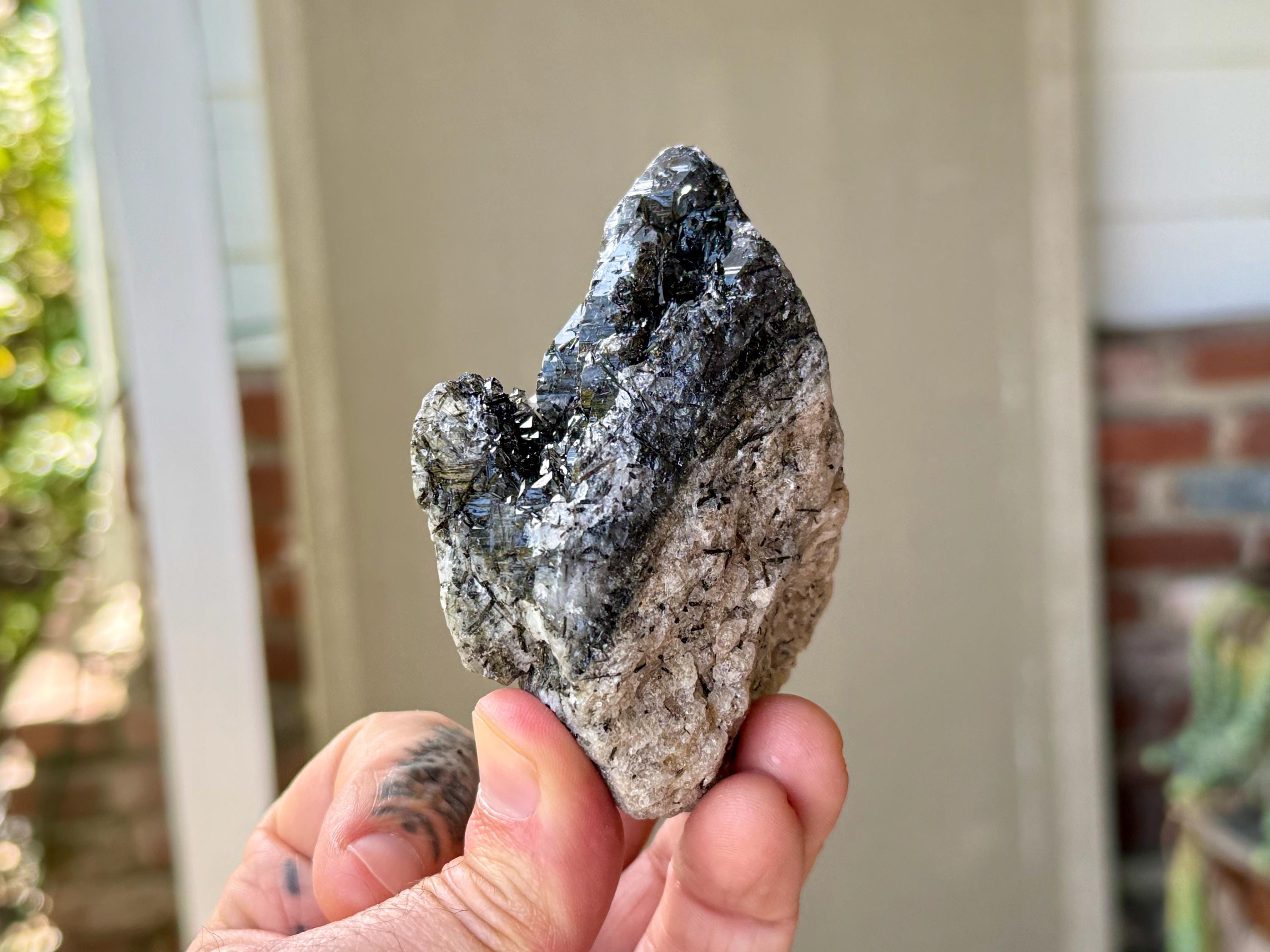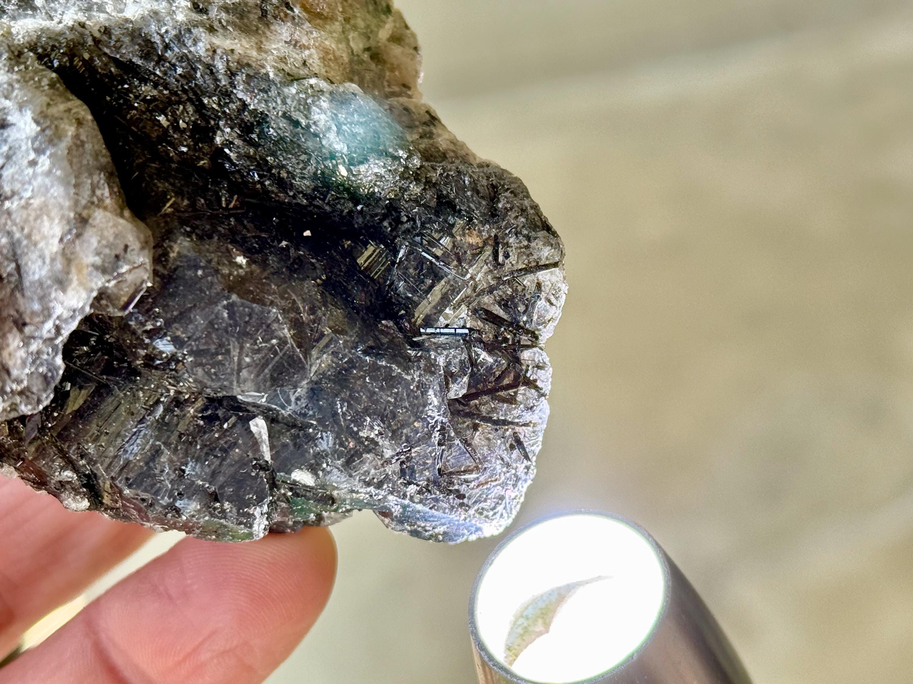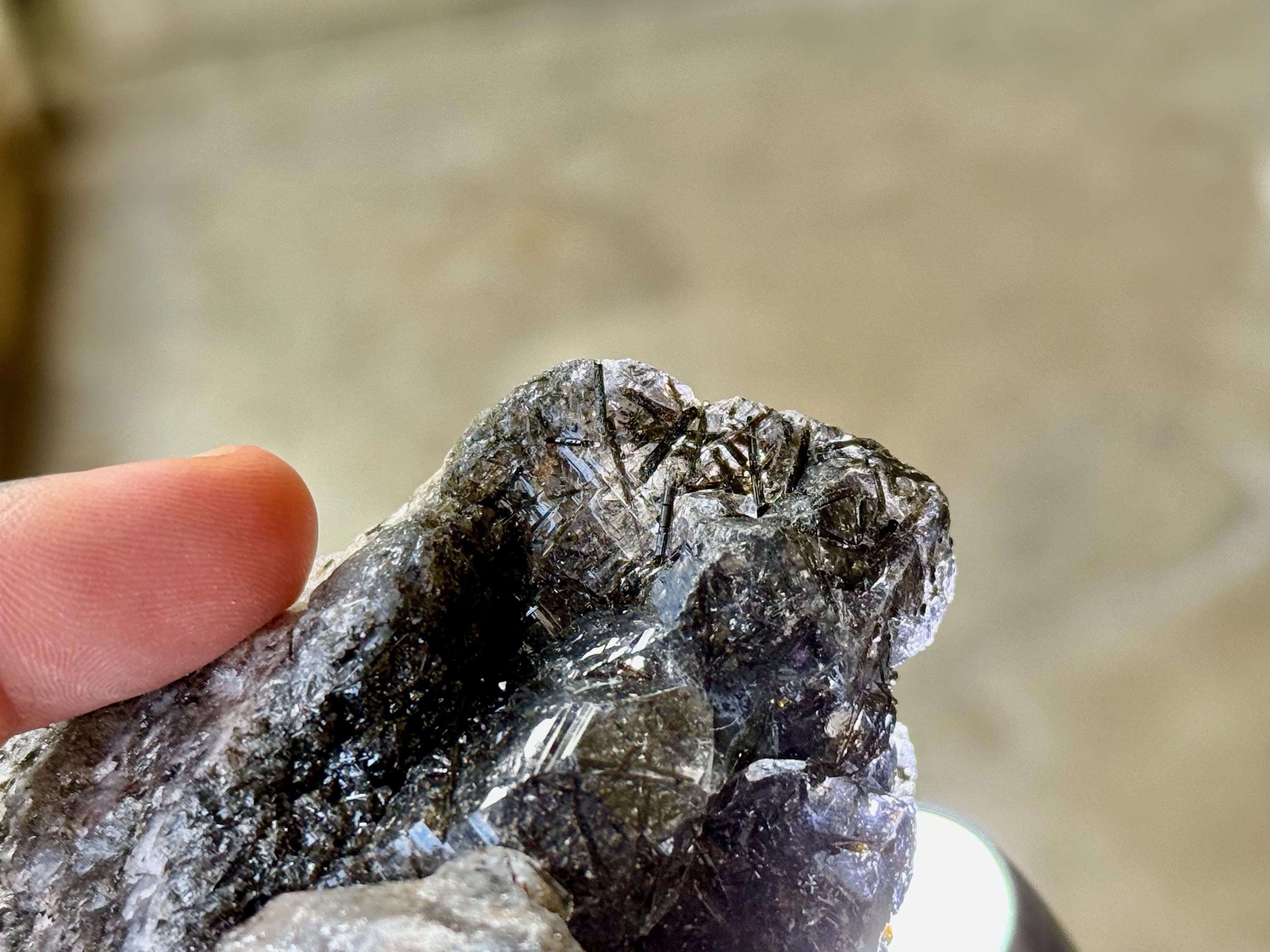 At first glance, this crystal appears to be somewhat of a Morion in nature, due its highly lustrous, black complexion. However, when backlit (as in Photos 3-6), we can start to see that the dark hues are coming from hundreds of tiny Tourmaline crystals. At first, these tourmalines look black. But if you really look closely, you will see that many of these have a brownish hue, making them Dravite Tourmalines.