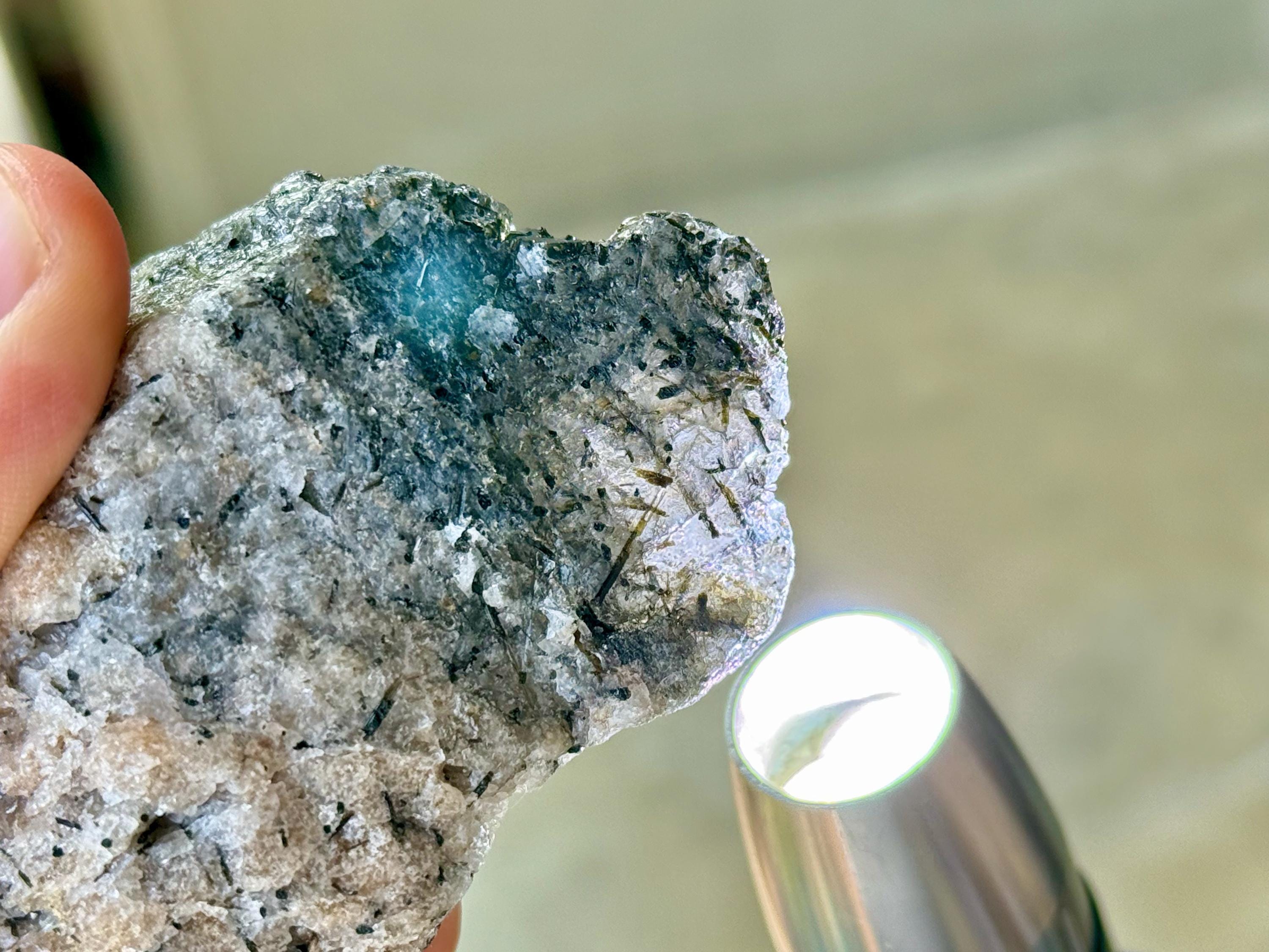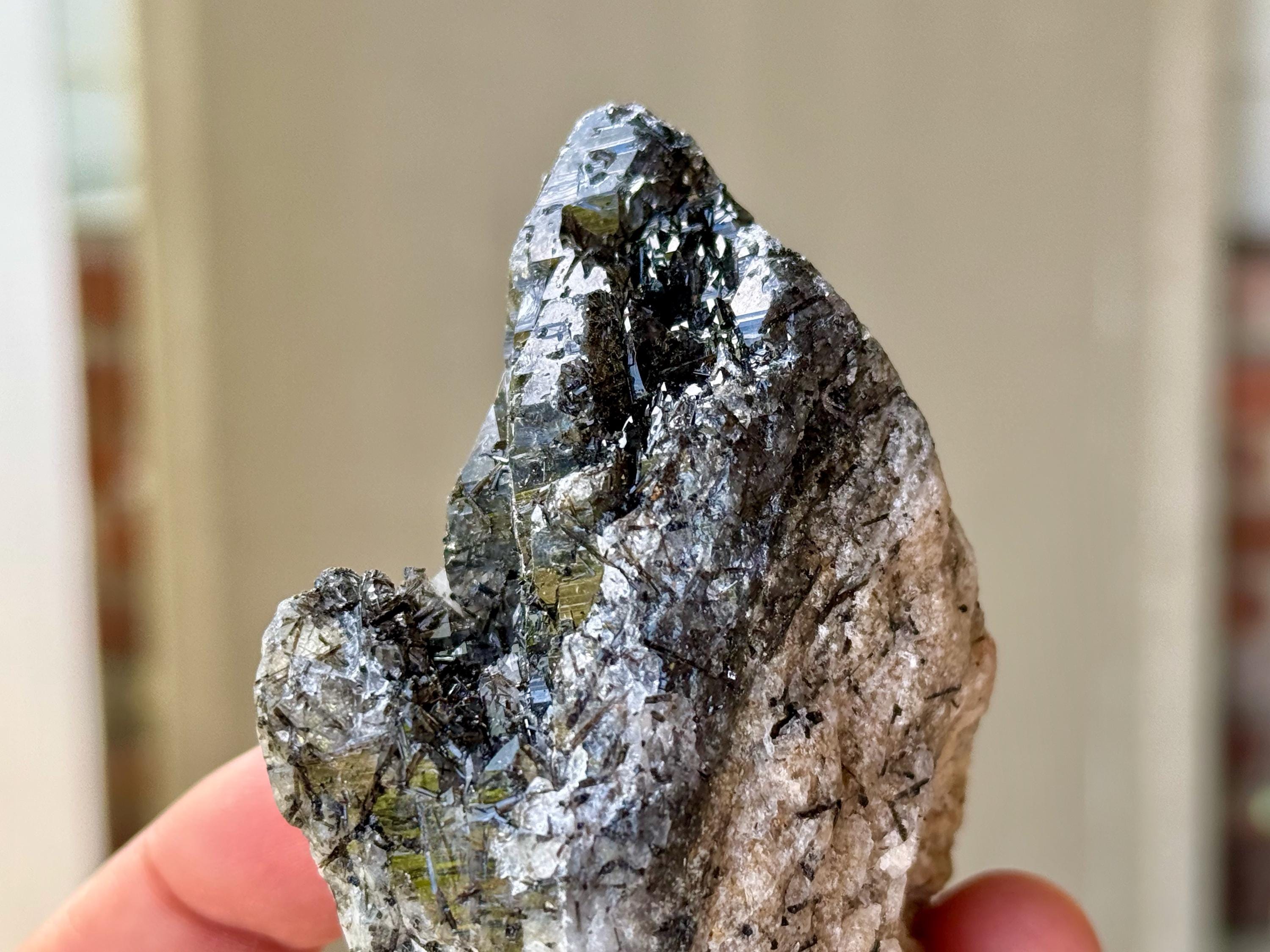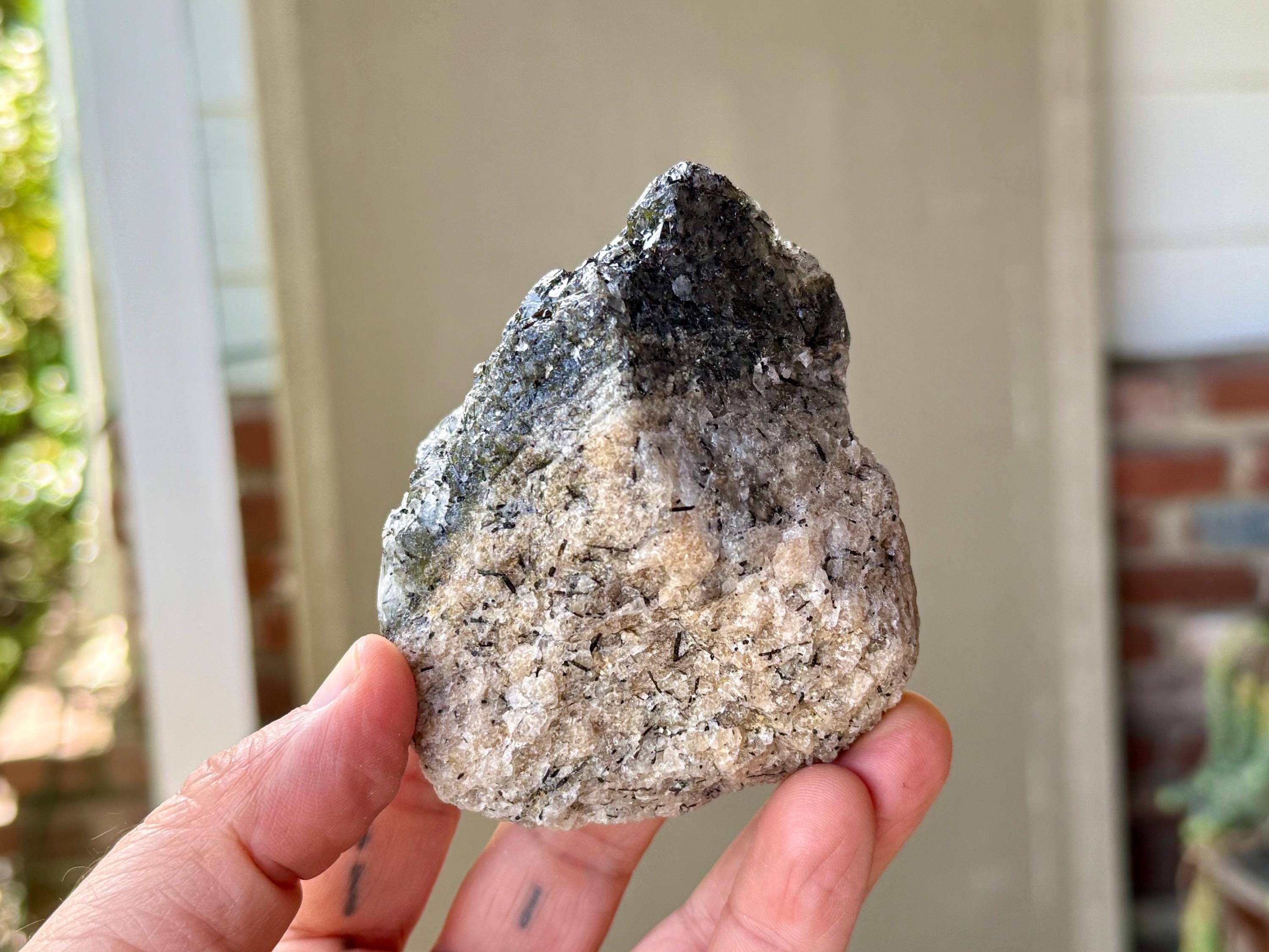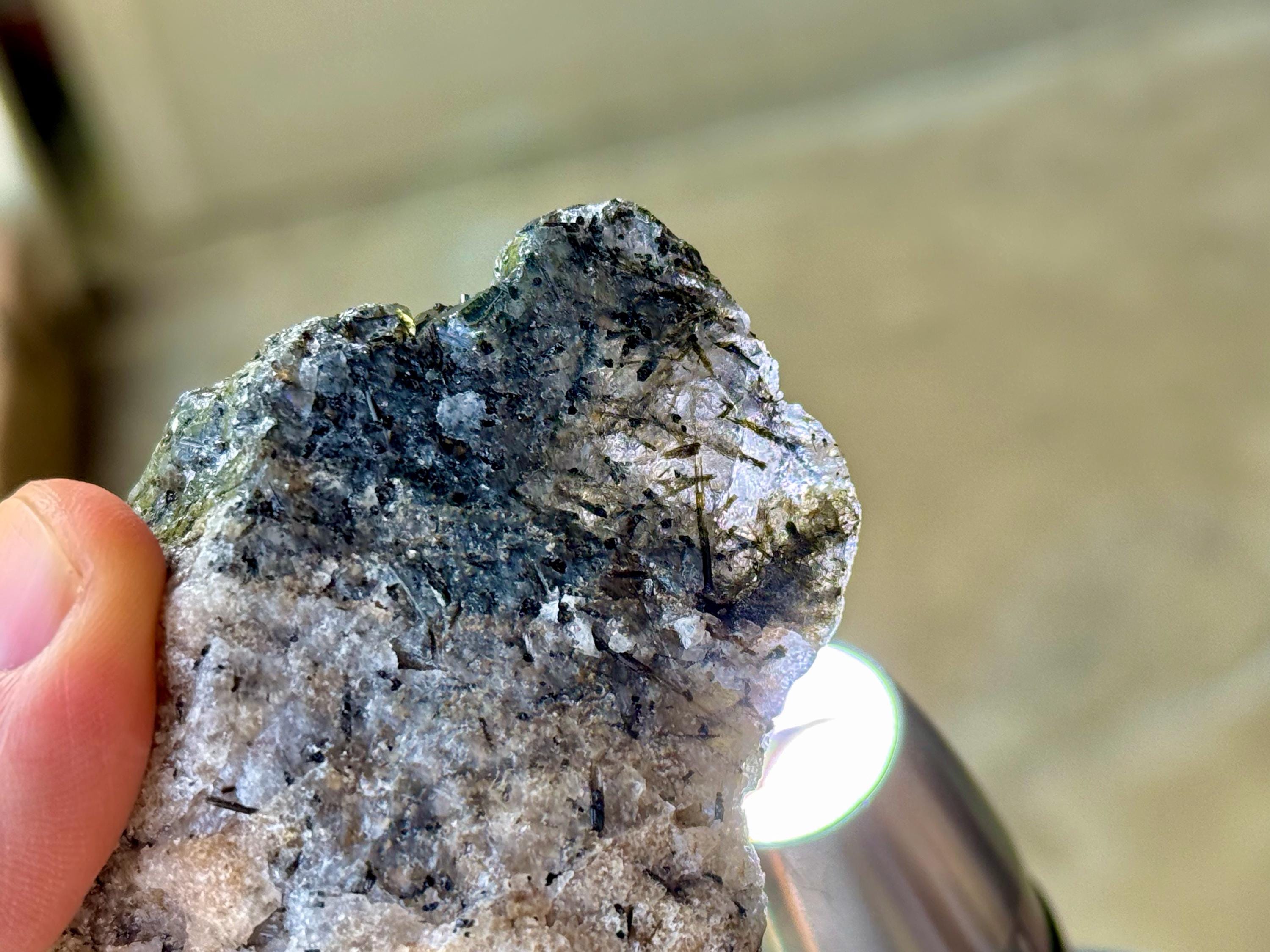 At first glance, this crystal appears to be somewhat of a Morion in nature, due its highly lustrous, black complexion. However, when backlit (as in Photos 3-6), we can start to see that the dark hues are coming from hundreds of tiny Tourmaline crystals. At first, these tourmalines look black. But if you really look closely, you will see that many of these have a brownish hue, making them Dravite Tourmalines.