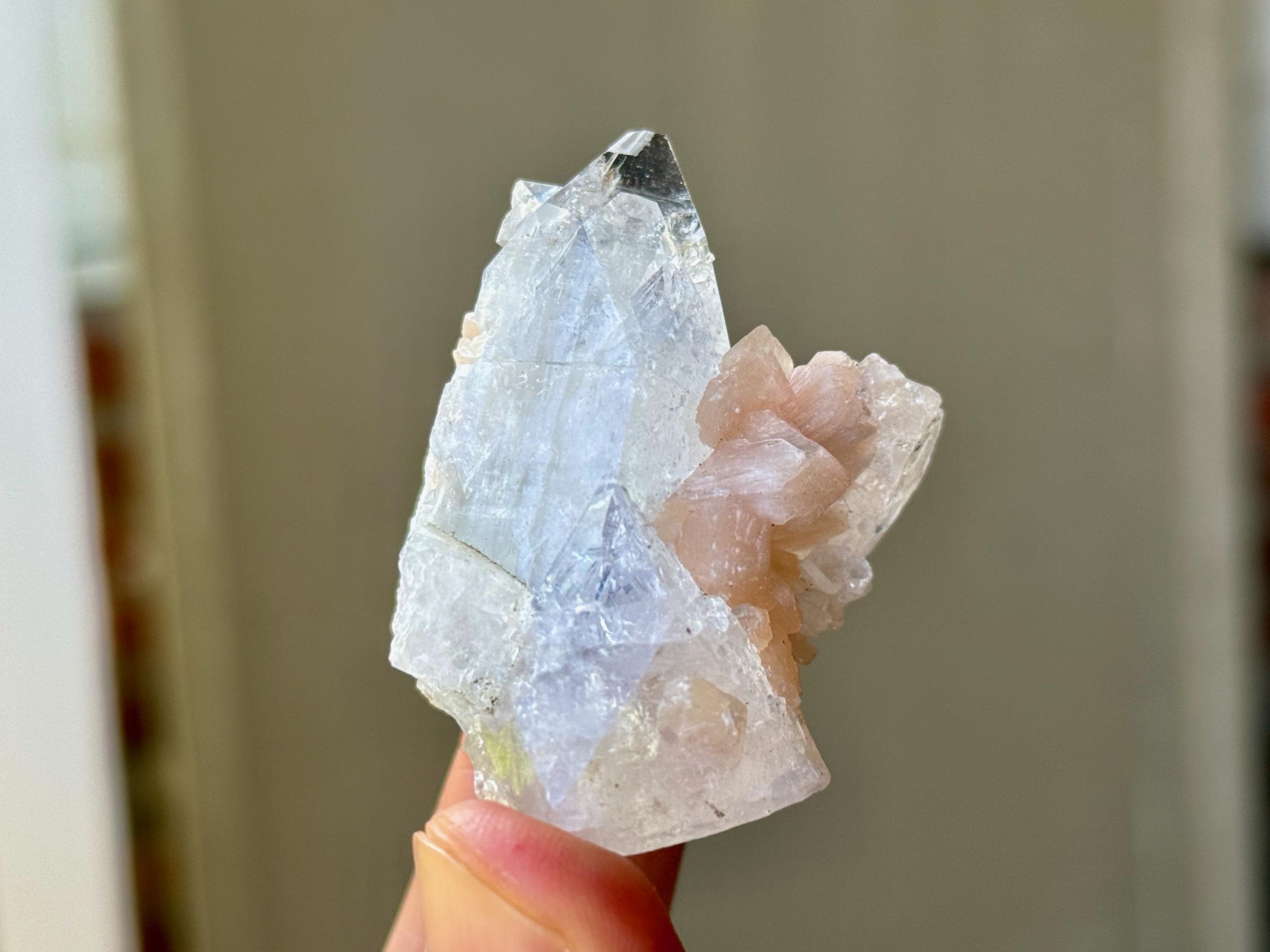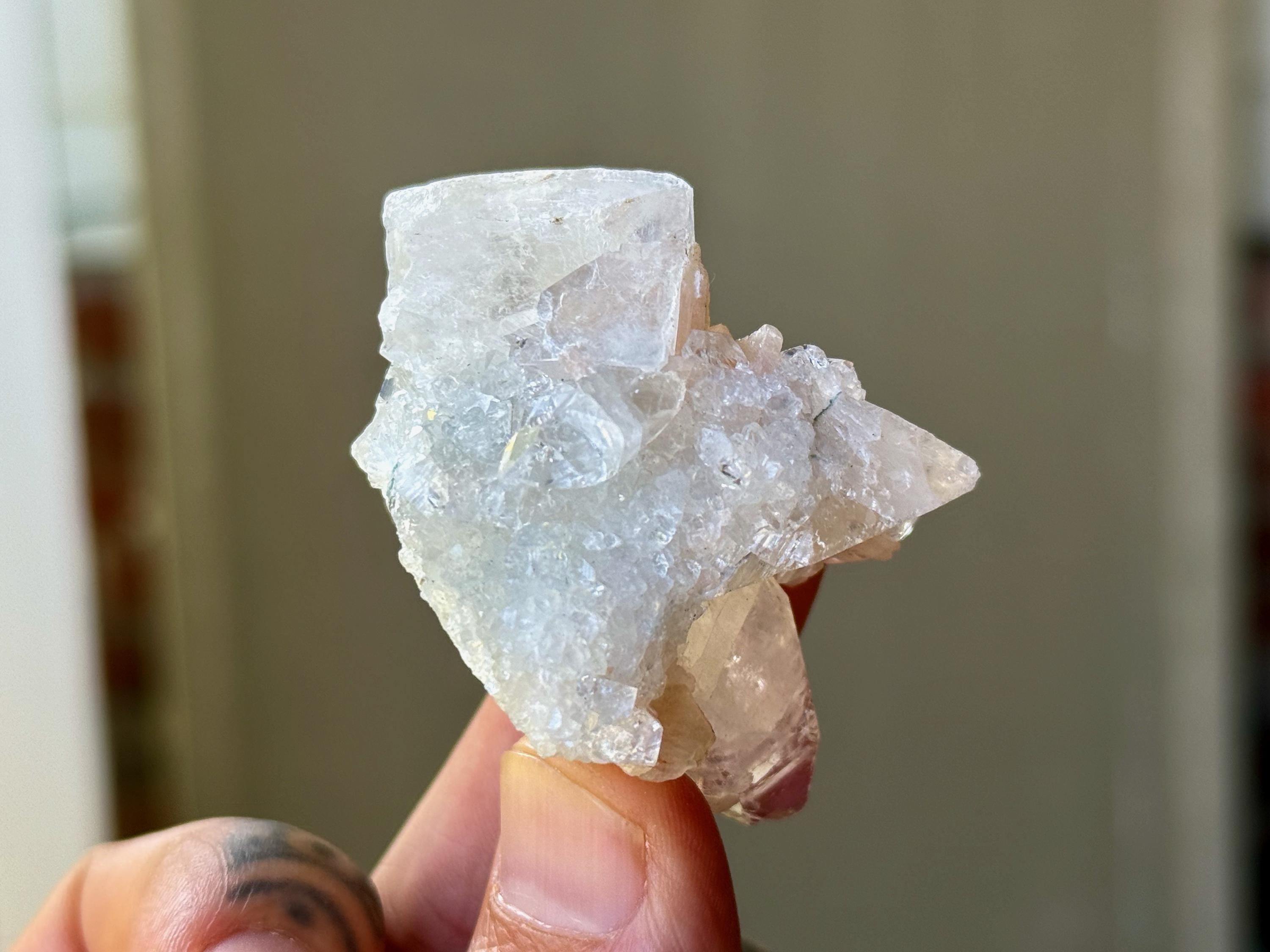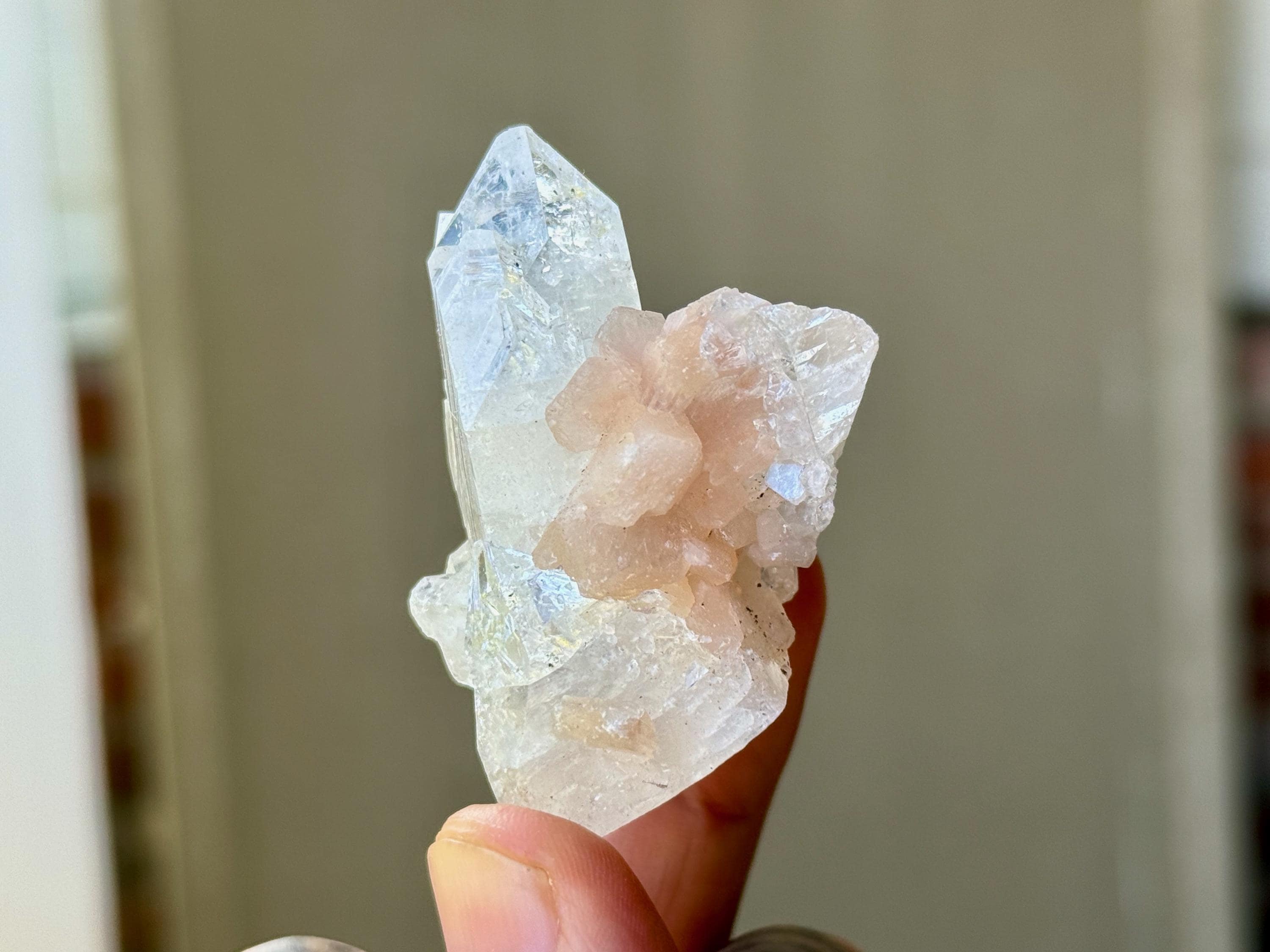 A supremely ethereal quality to this stunning Apophyllite Quartz crystal, with some mild inclusions of pinkish peach Stillbite surrounding the primary crystal.