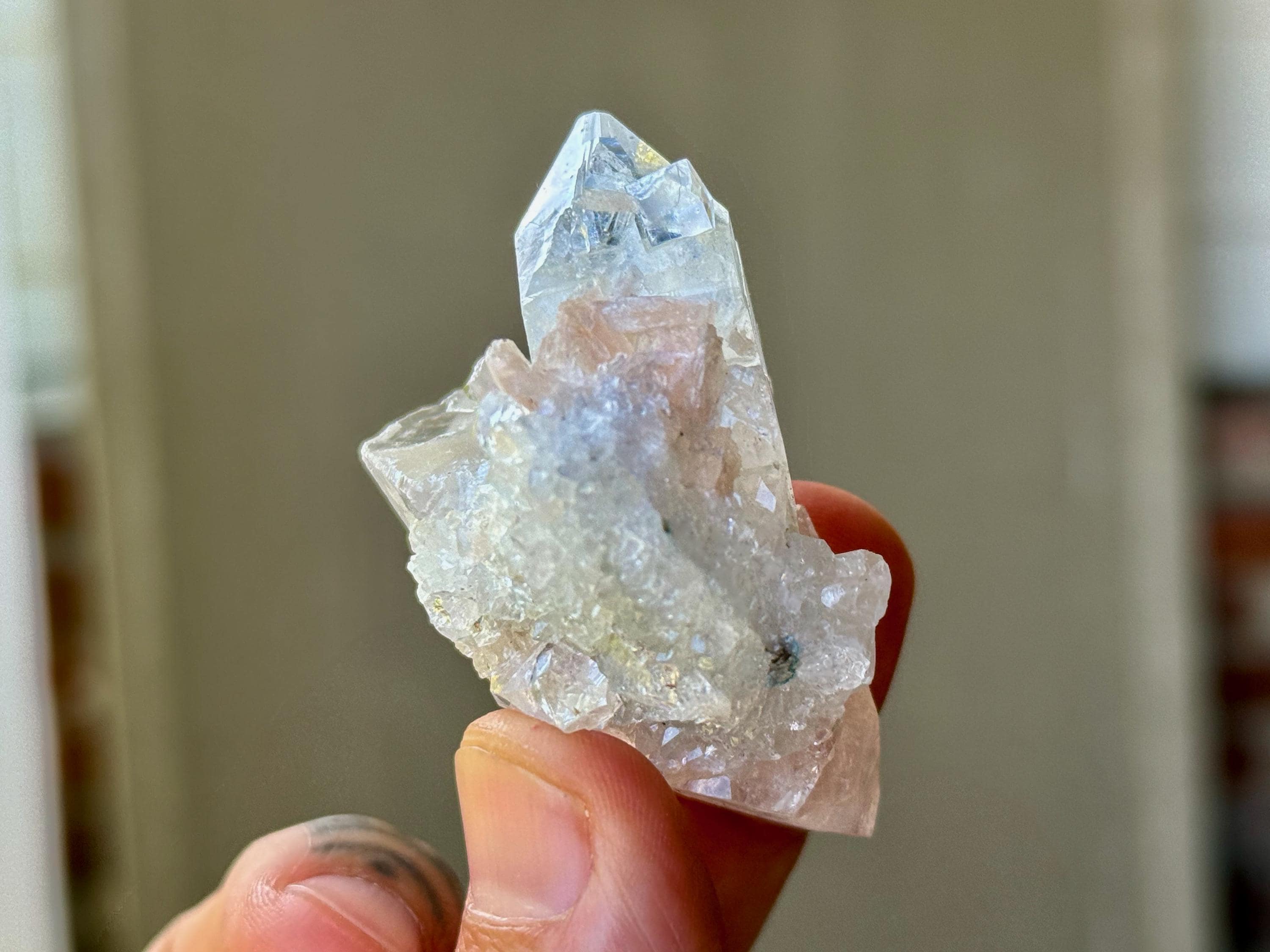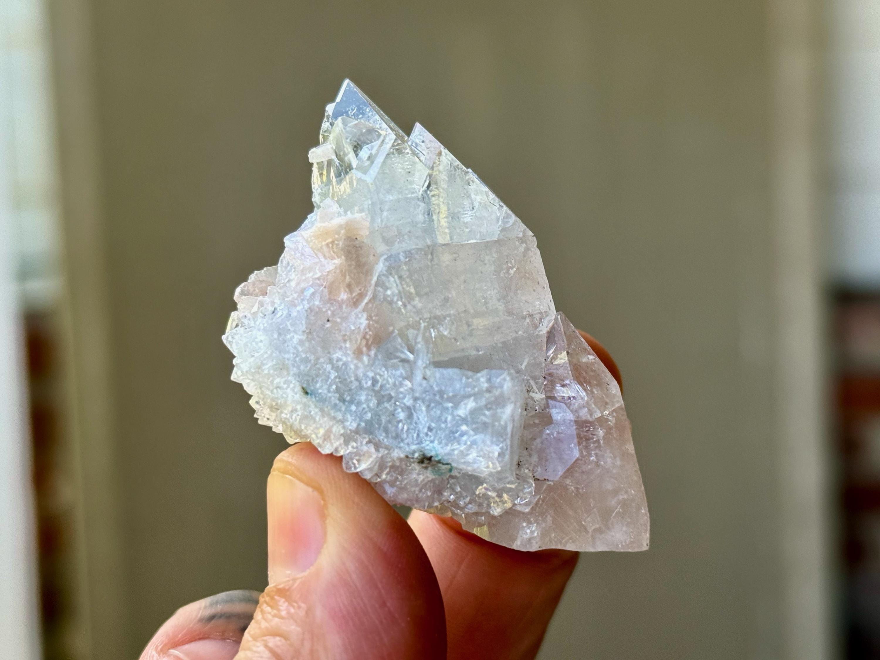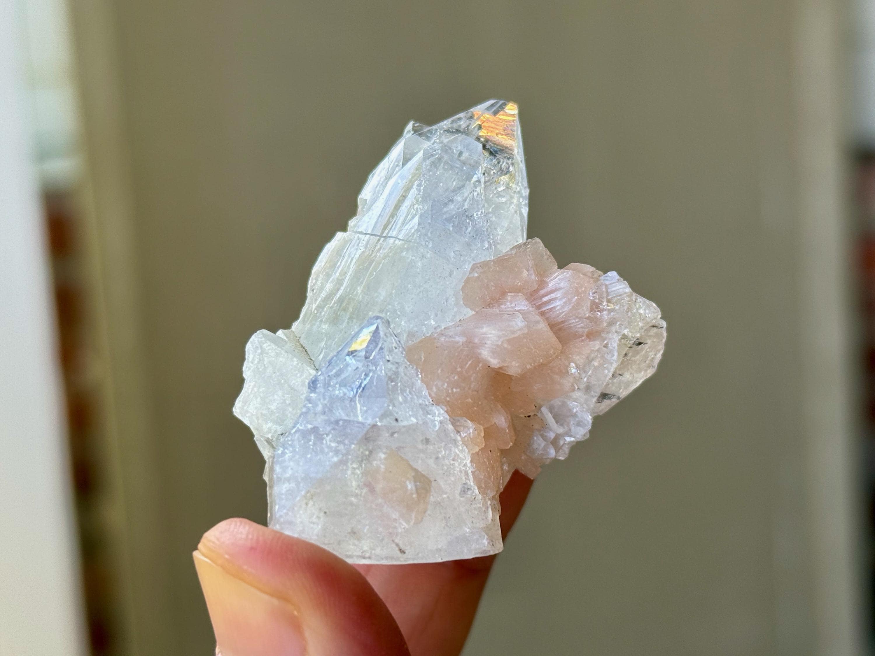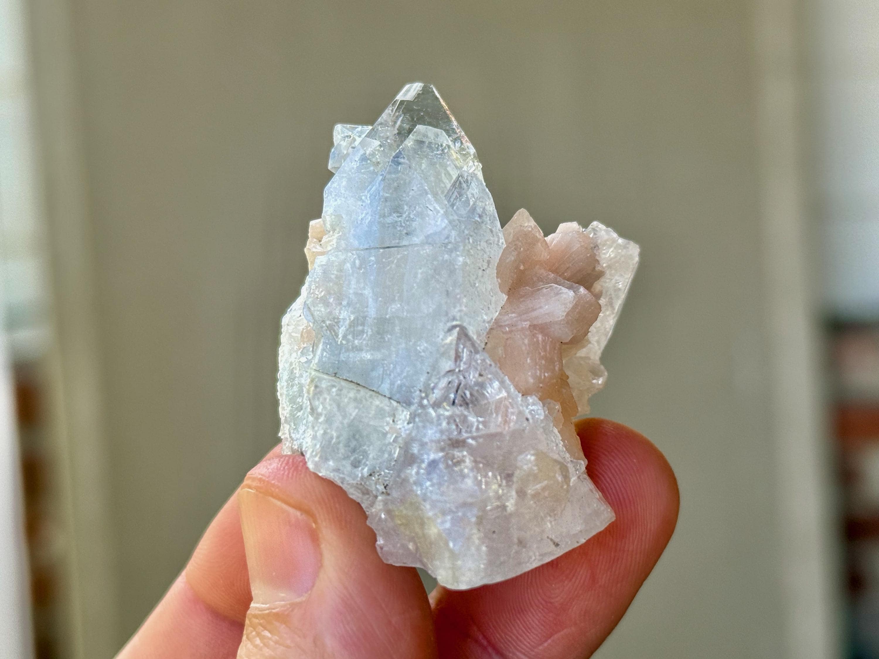 A supremely ethereal quality to this stunning Apophyllite Quartz crystal, with some mild inclusions of pinkish peach Stillbite surrounding the primary crystal.