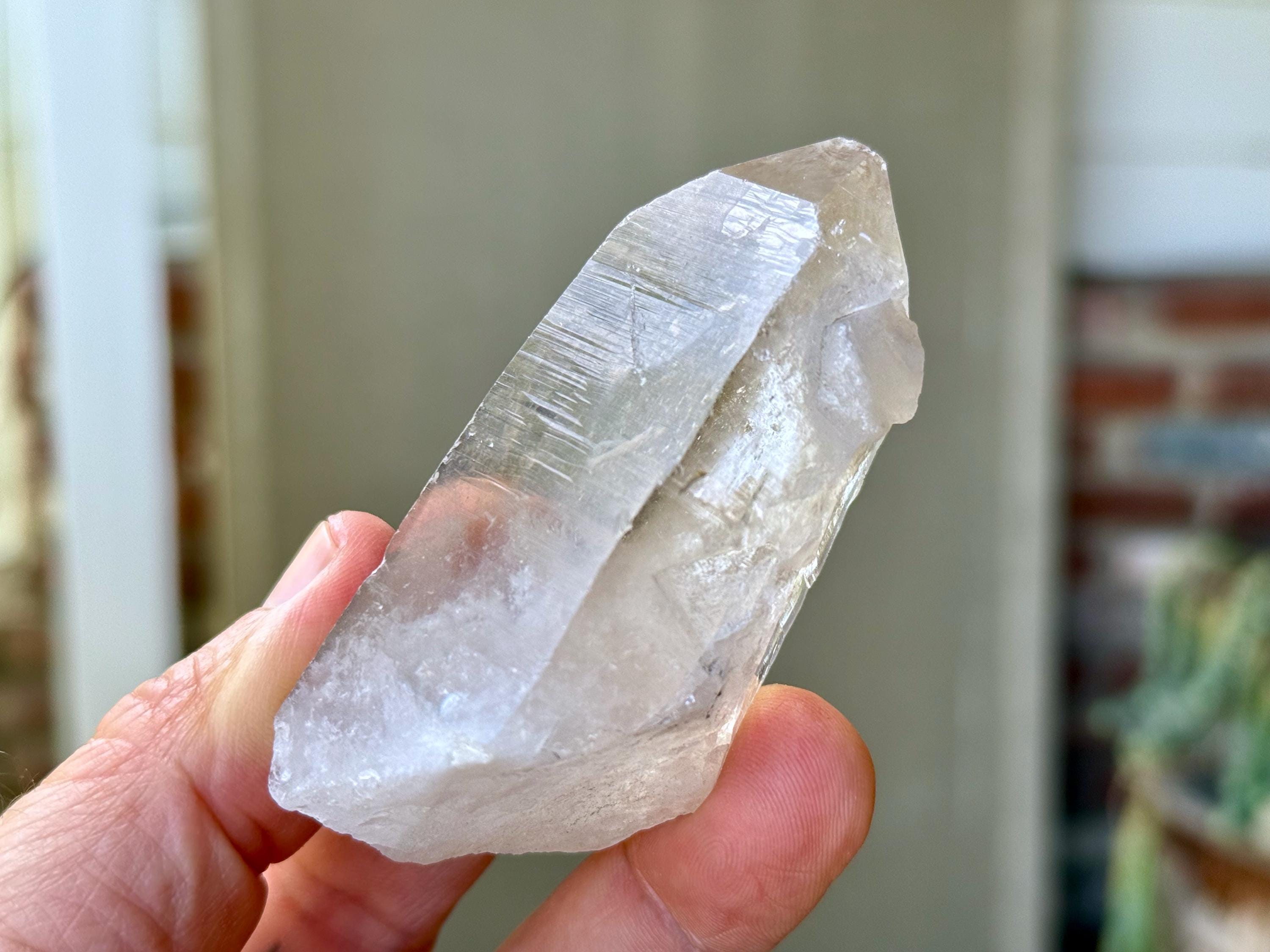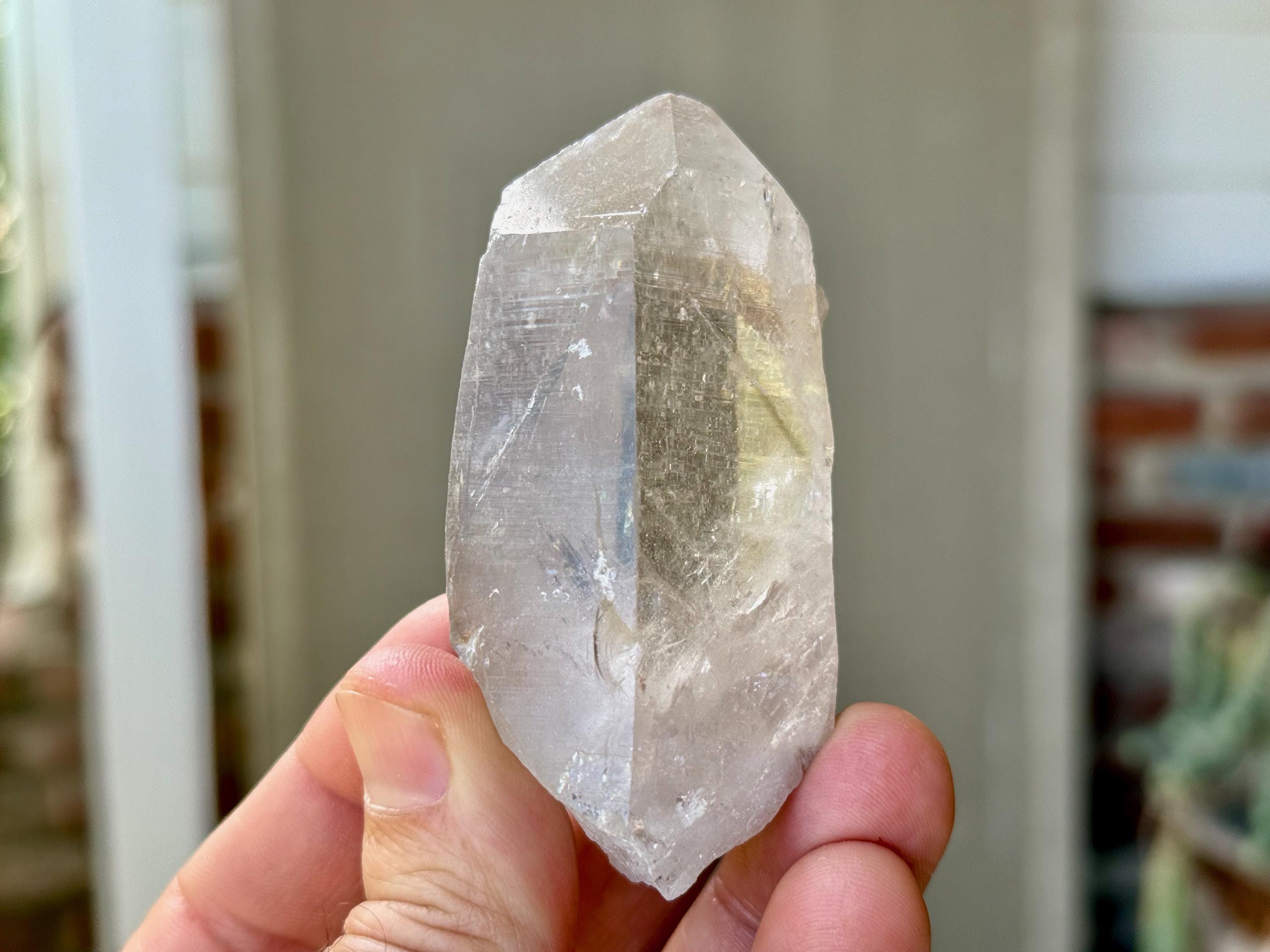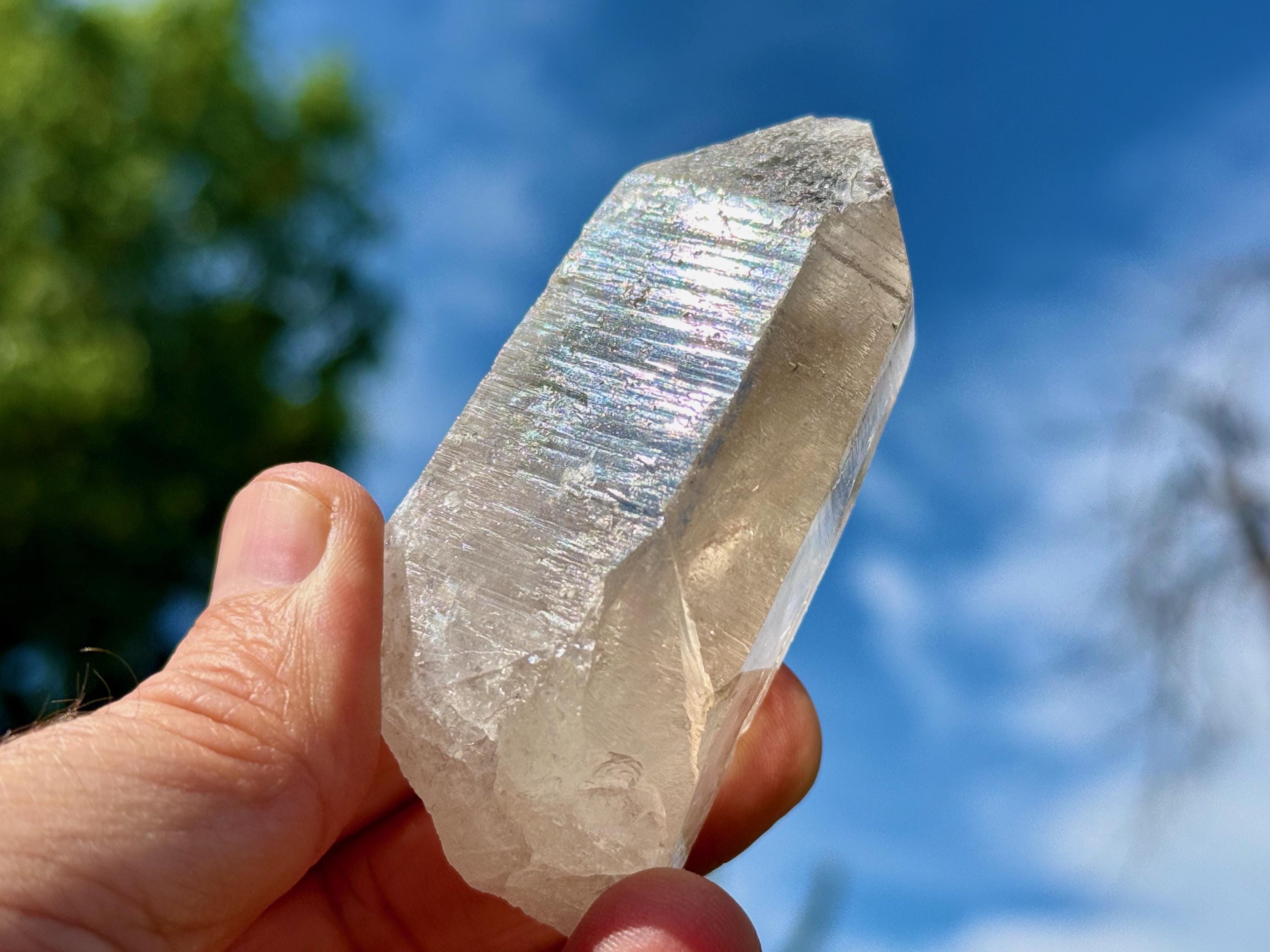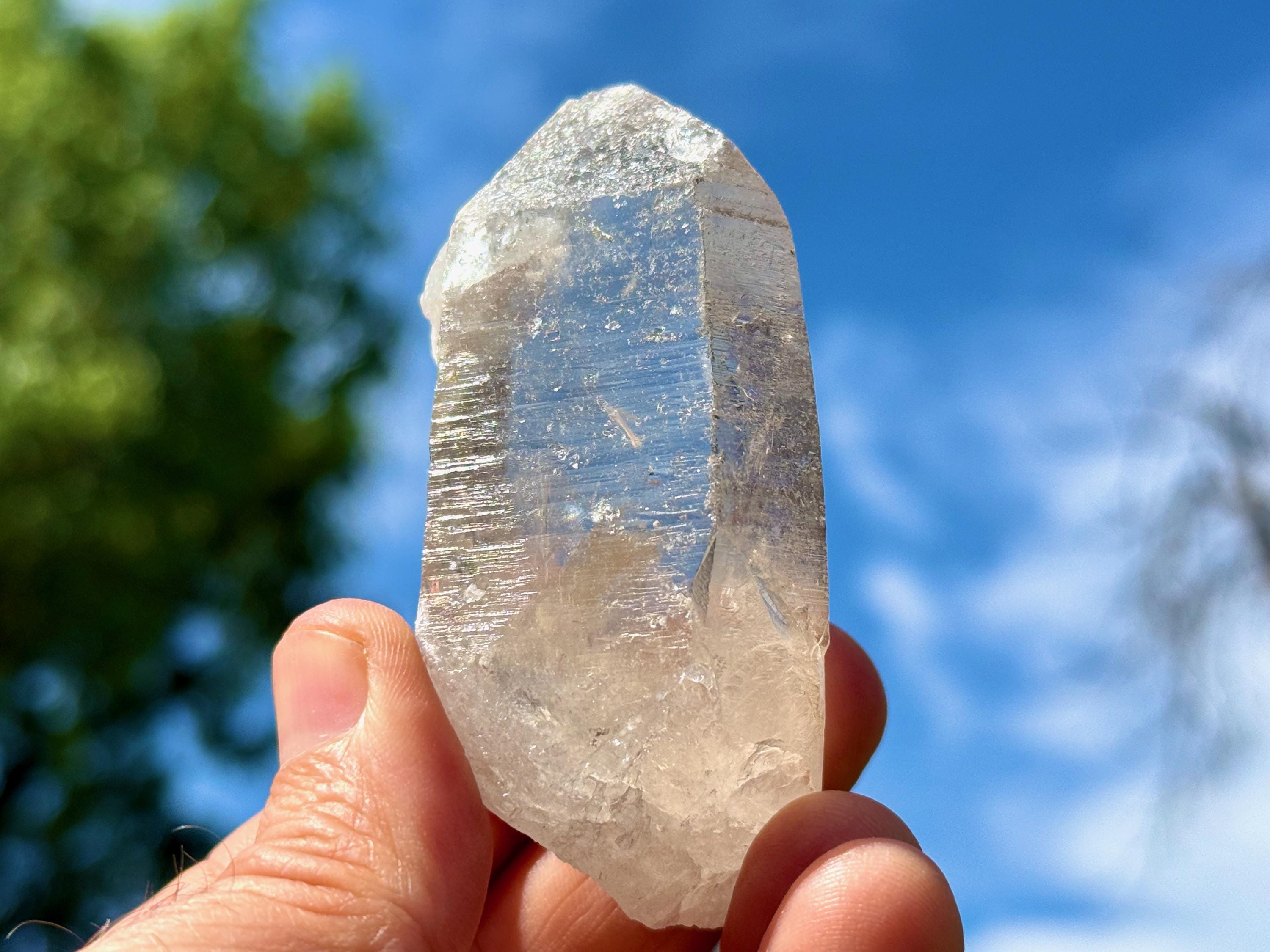 Water-clear clarity and brilliant luster to this elegant Sacred Scribe Lemurian Quartz. This crystal possesses a broad formation, with finely etched, horizontal striations on each of its sides. It is mostly clear and colorless, though it does display a *very* mild tinge of smoky golden hue.