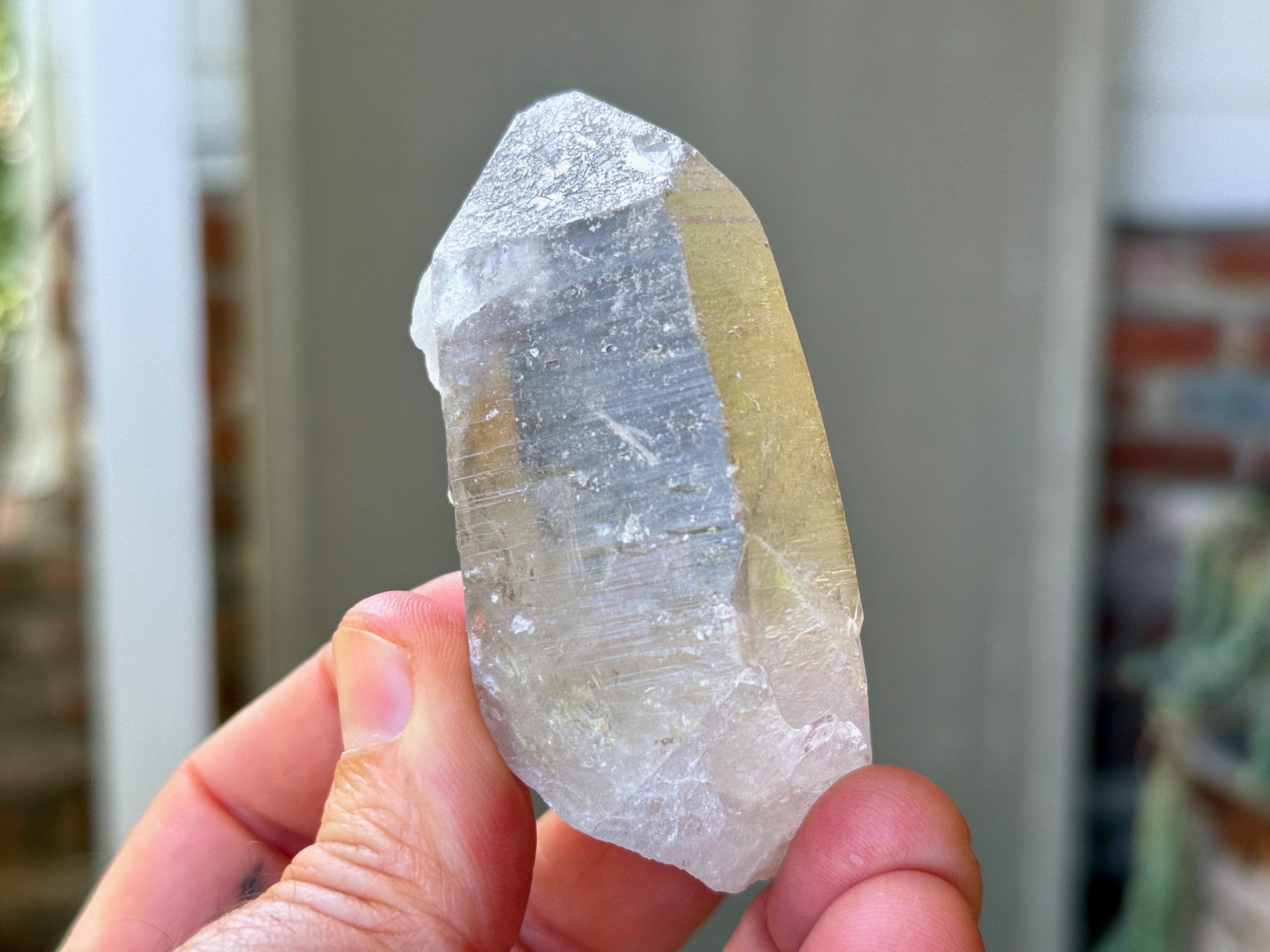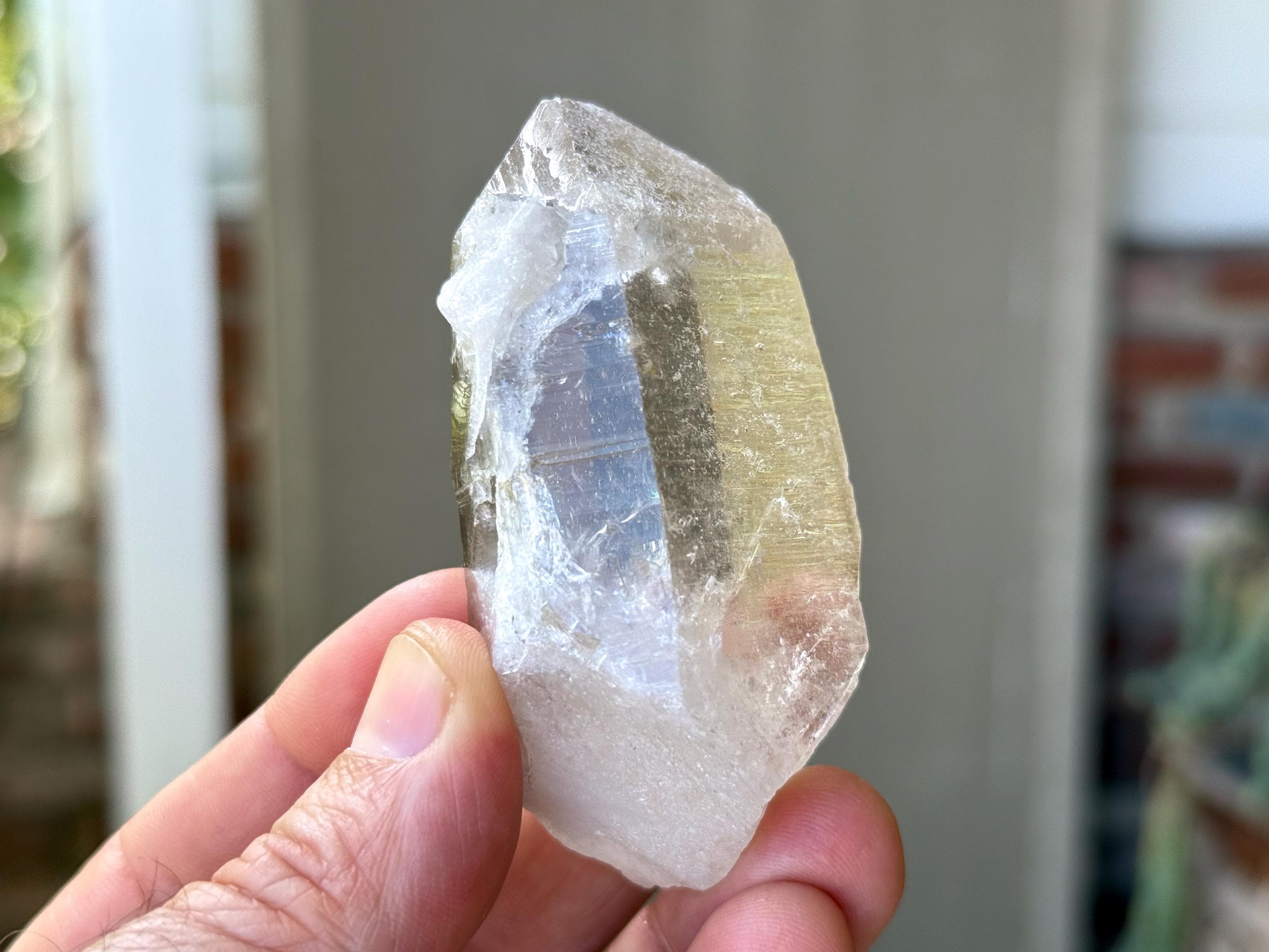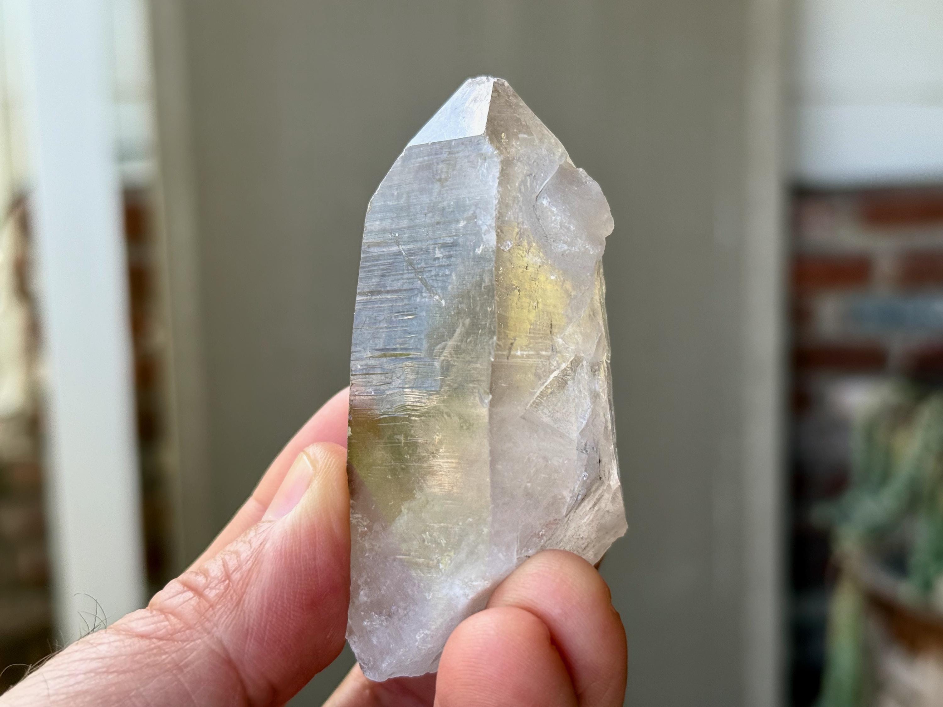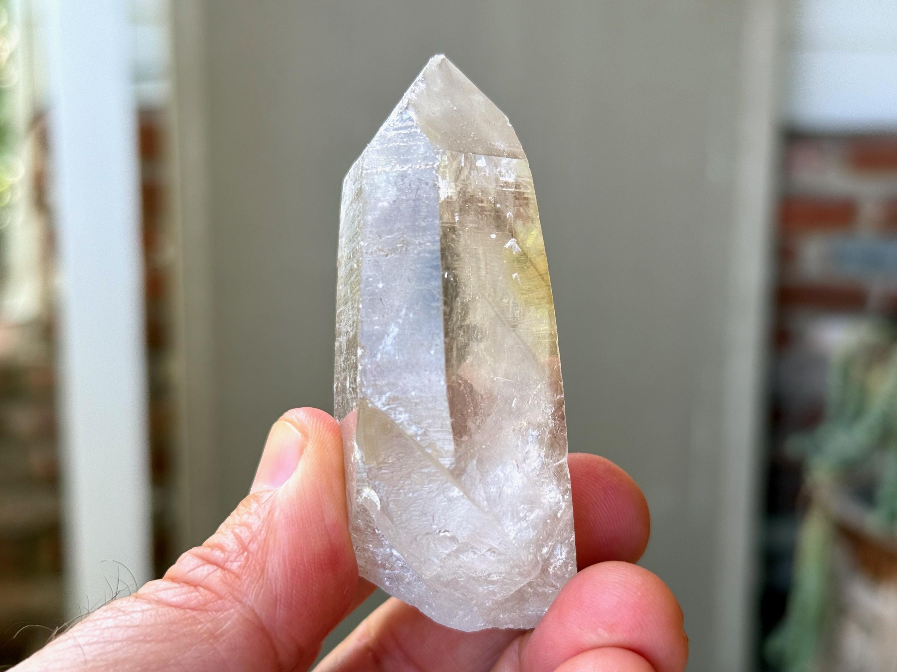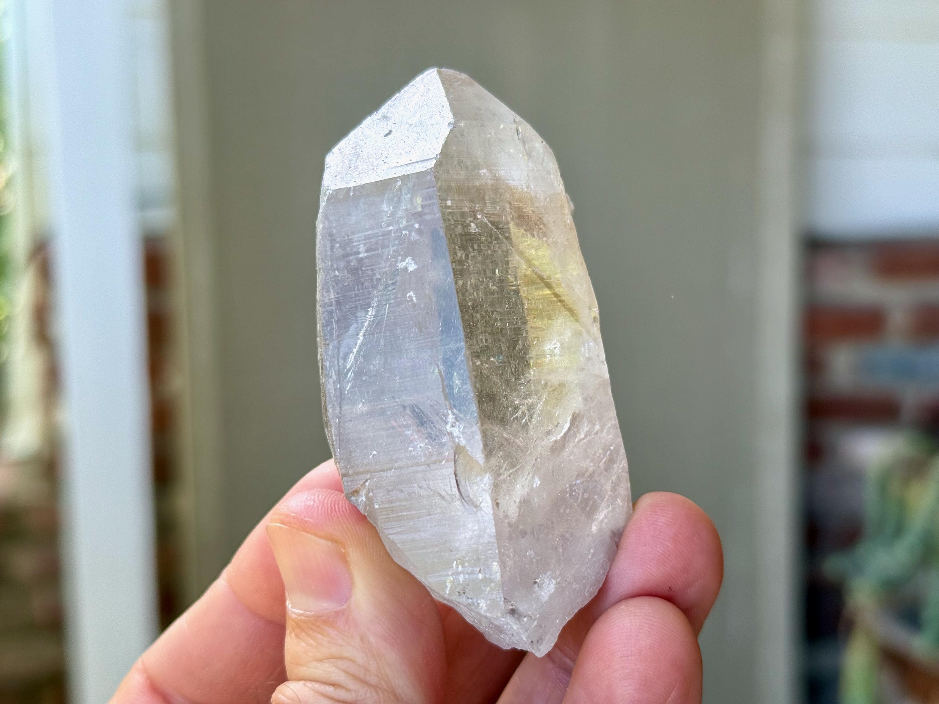Water-clear clarity and brilliant luster to this elegant Sacred Scribe Lemurian Quartz. This crystal possesses a broad formation, with finely etched, horizontal striations on each of its sides. It is mostly clear and colorless, though it does display a *very* mild tinge of smoky golden hue.