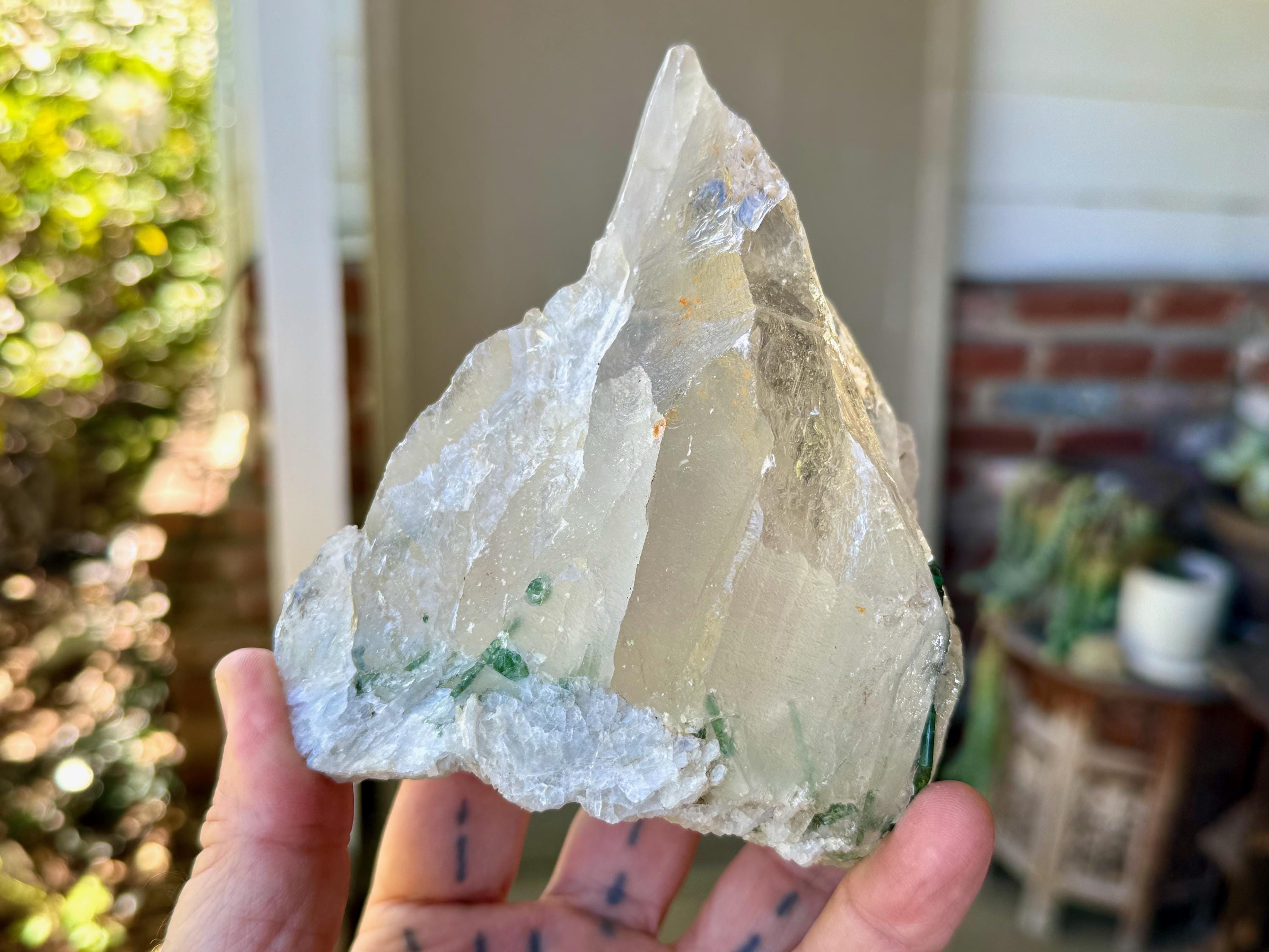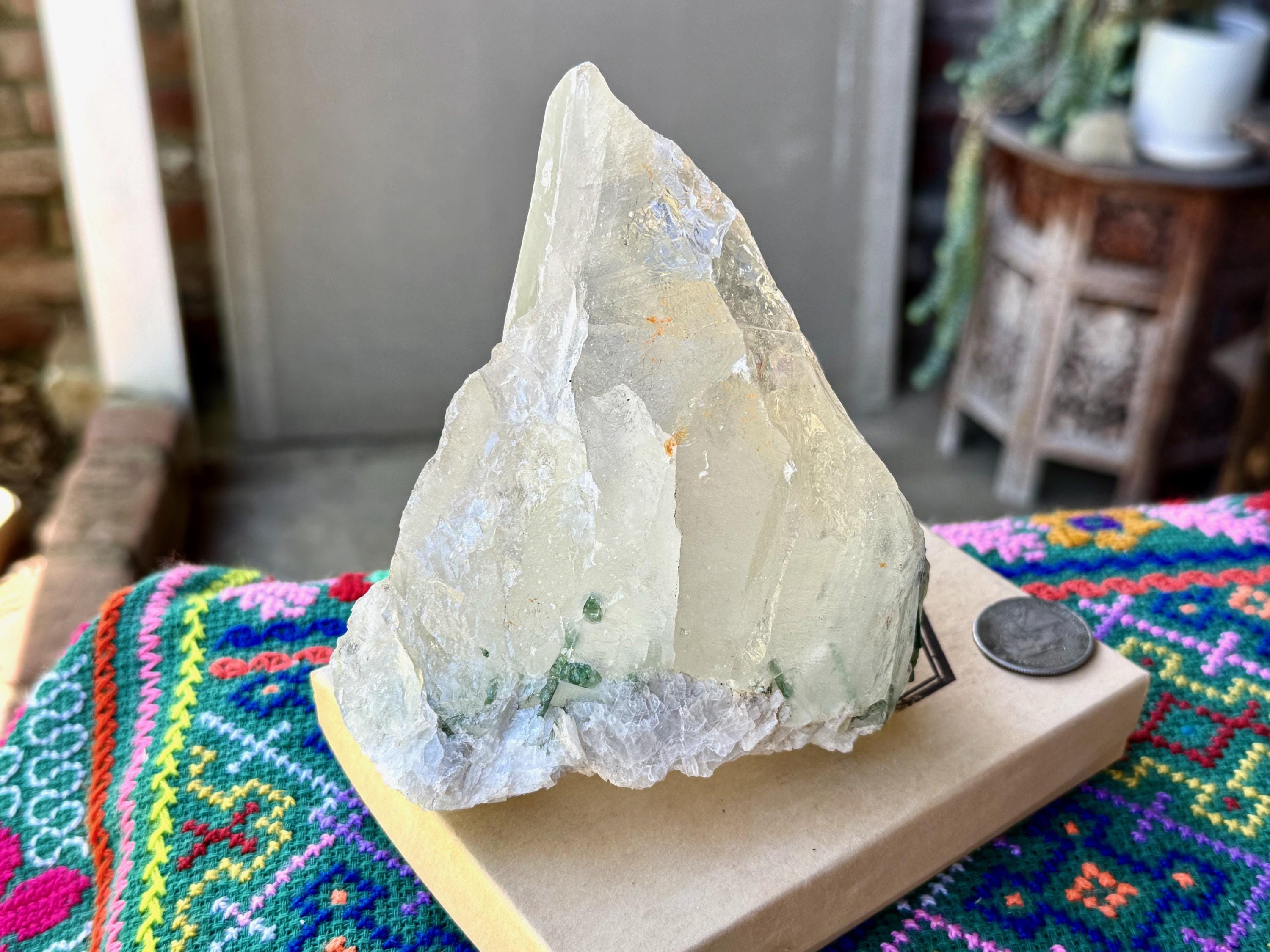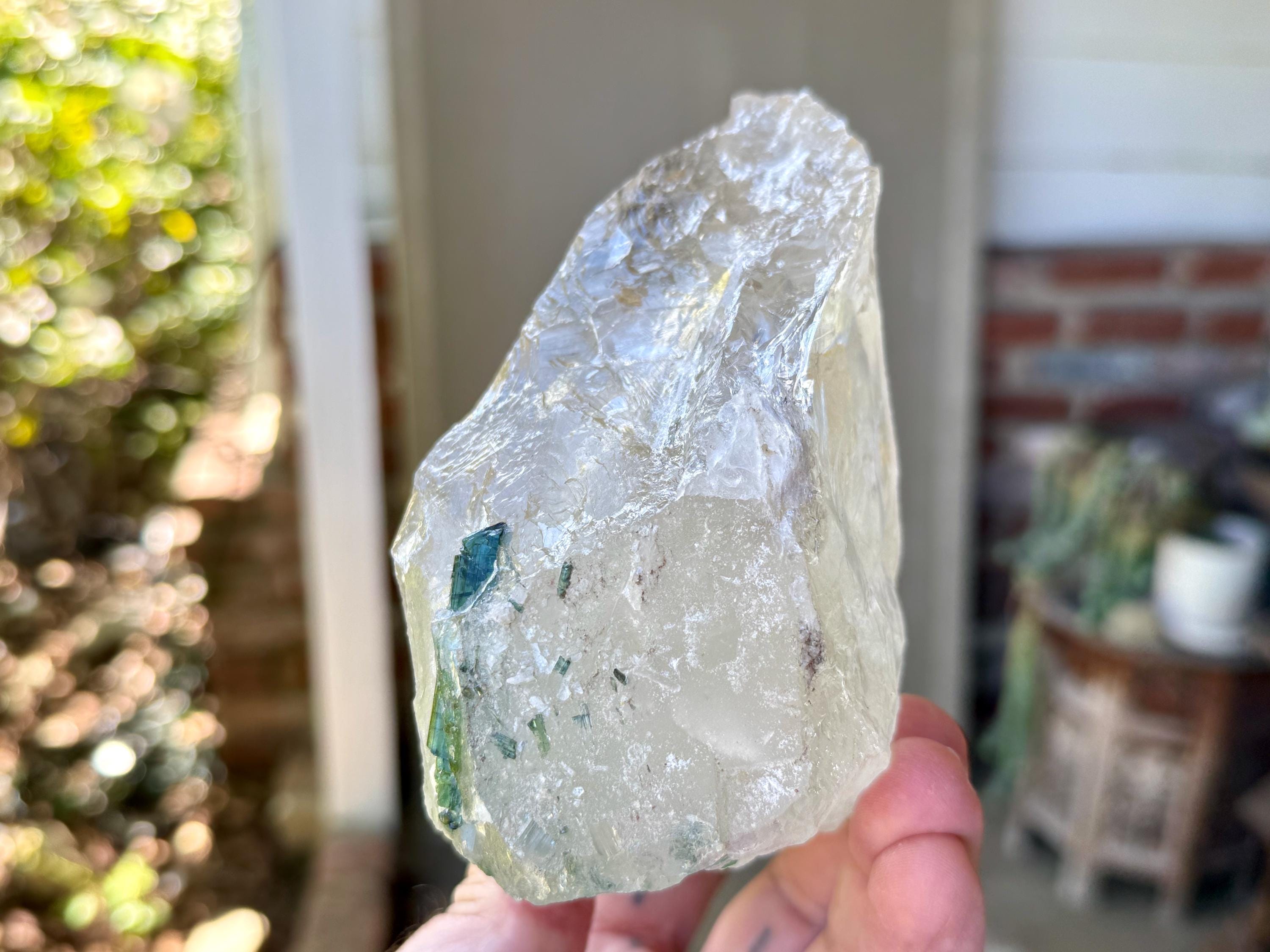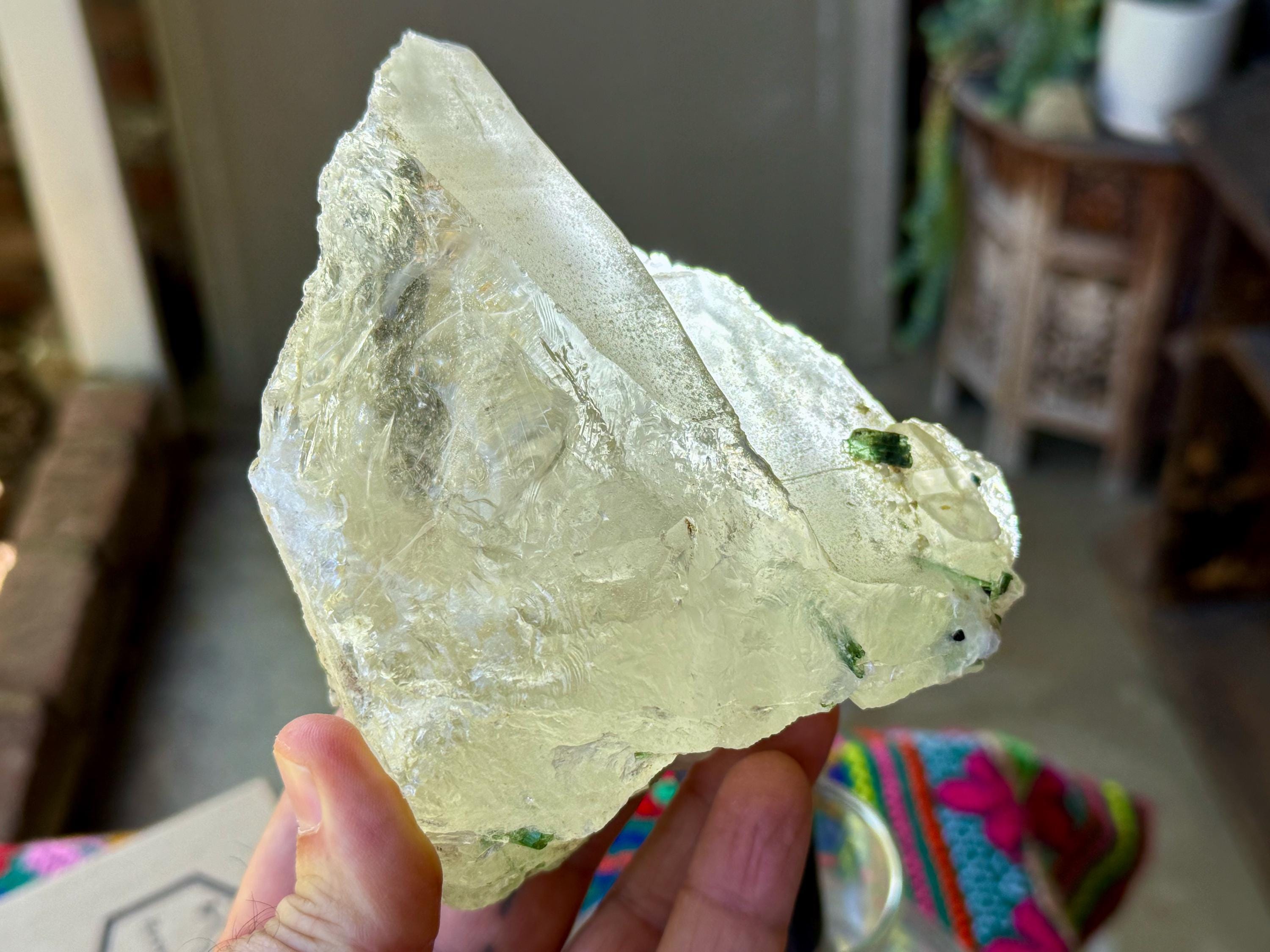 A gorgeous GLACIER of a crystal -- at nearly 2 pounds -- this Quartz crystal exhibits superb luster and wonderful clarity with beautiful inclusions of gem Green Tourmaline near its base on its front side (and some smaller inclusions of Green Tourmaline surrounding the base on the back and sides). When we backlight the Tourmaline (Photos 2-5) we can see how beautiful the color and translucency is.