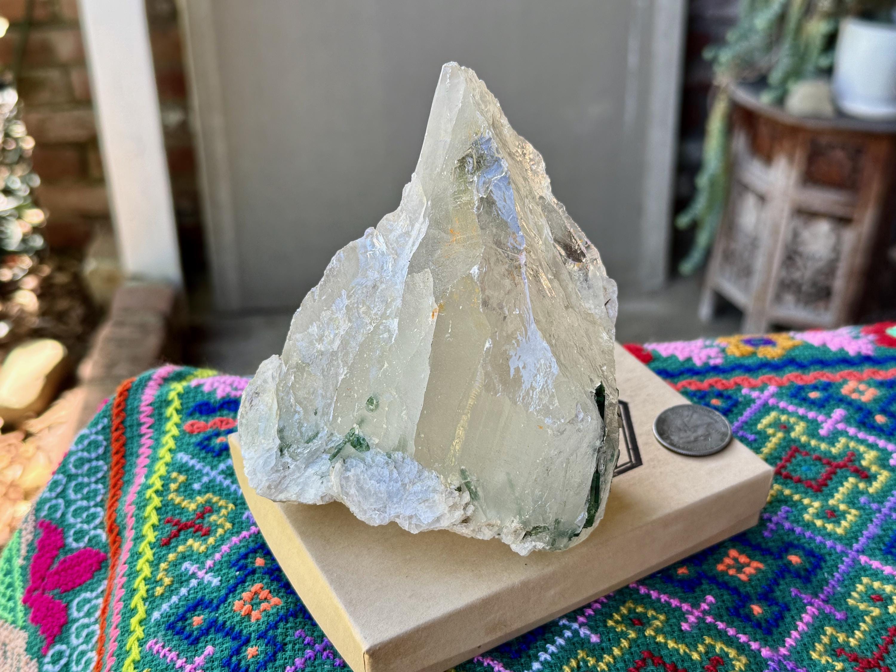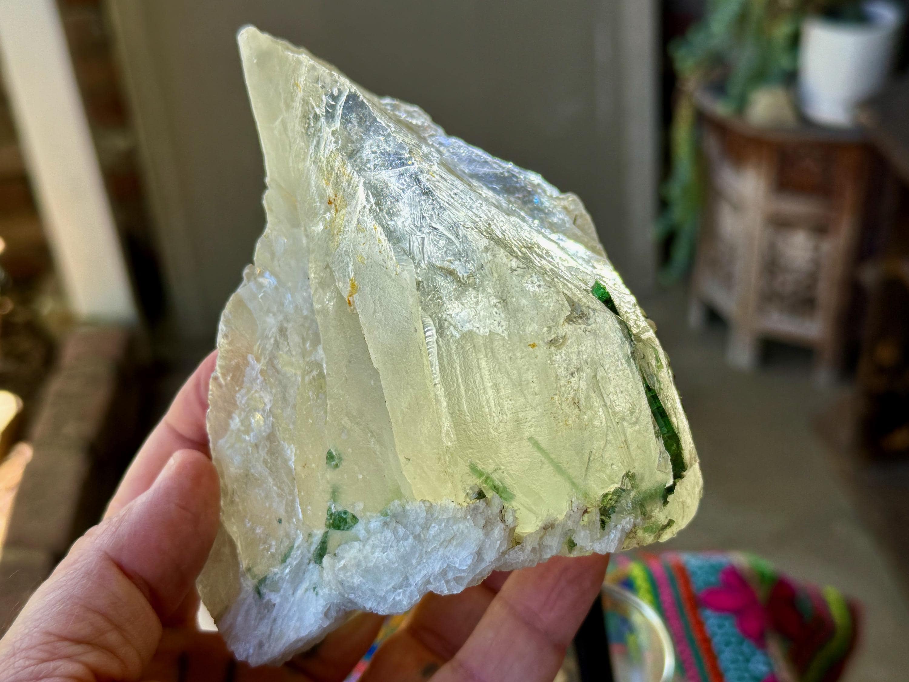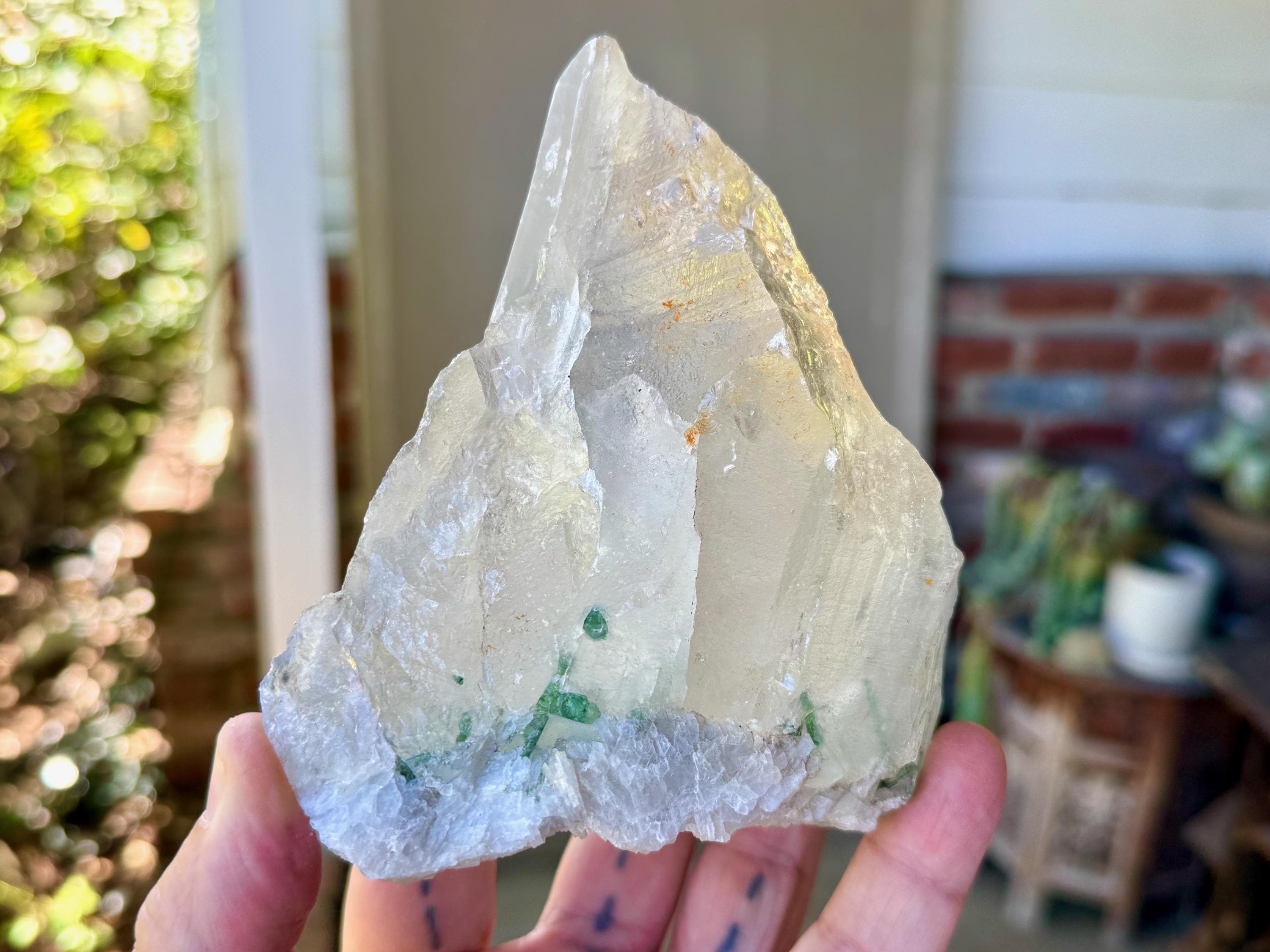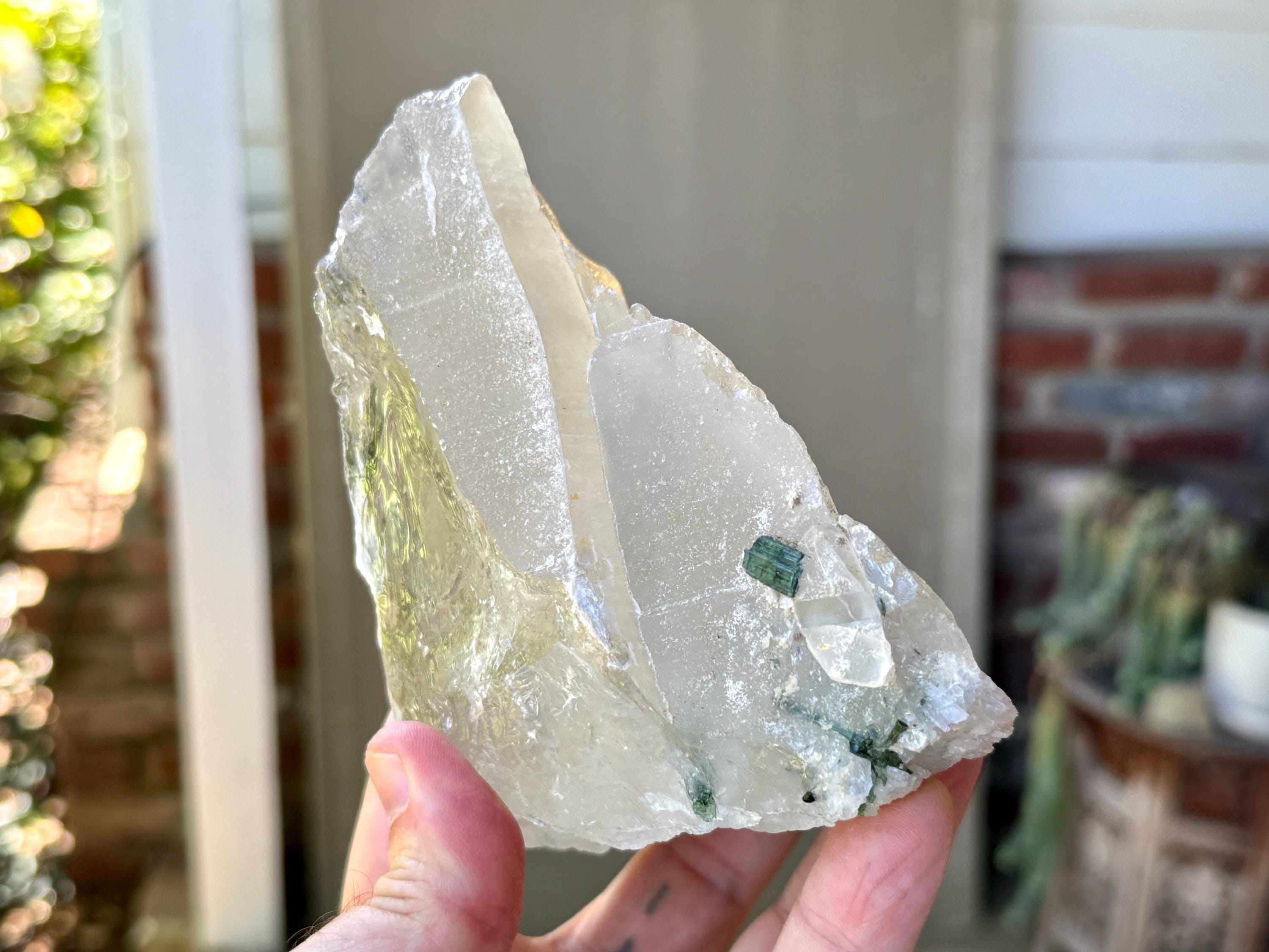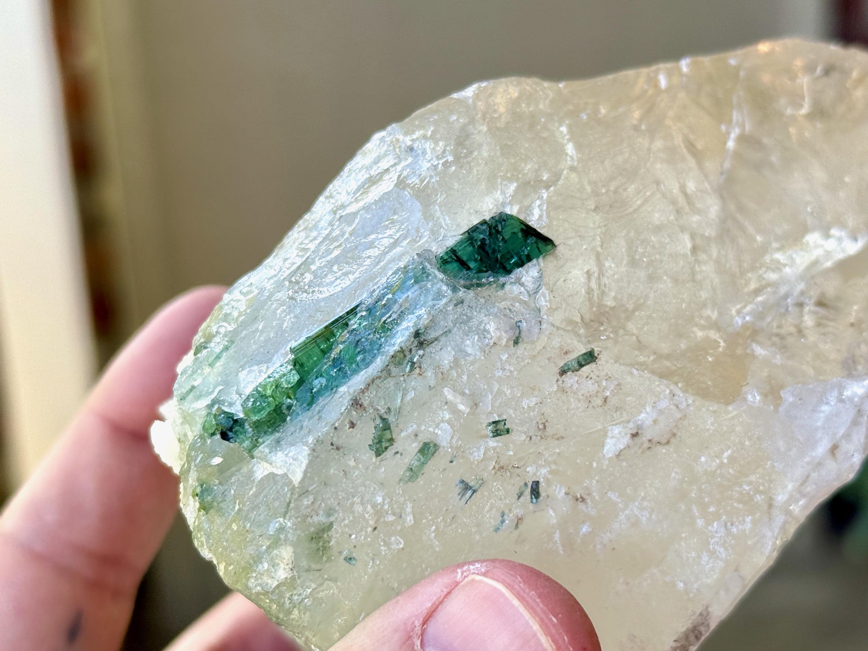 A gorgeous GLACIER of a crystal -- at nearly 2 pounds -- this Quartz crystal exhibits superb luster and wonderful clarity with beautiful inclusions of gem Green Tourmaline near its base on its front side (and some smaller inclusions of Green Tourmaline surrounding the base on the back and sides). When we backlight the Tourmaline (Photos 2-5) we can see how beautiful the color and translucency is.