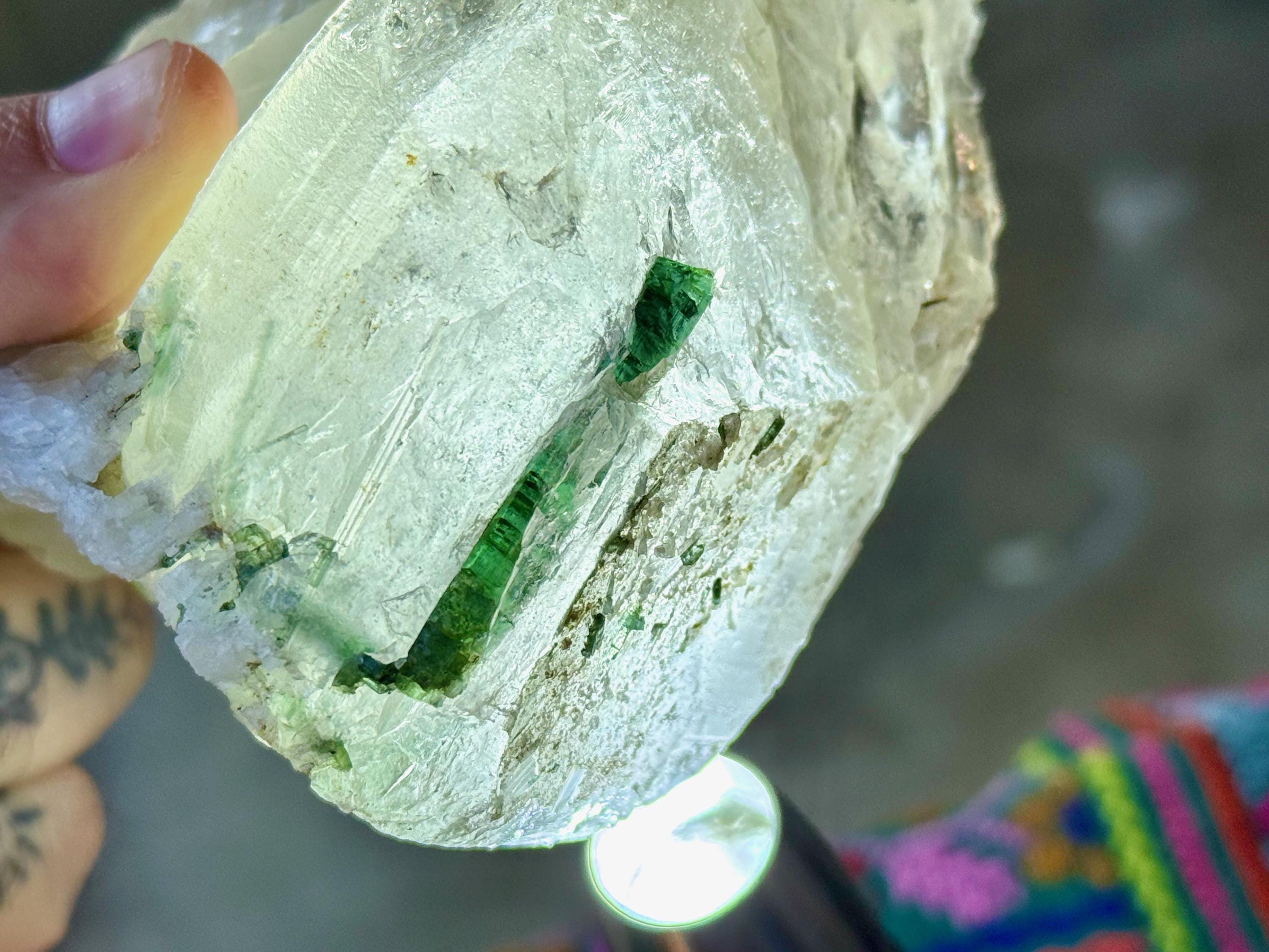 Green Tourmaline purifies and strengthens, allowing one to energetically carry greater amounts of Life Force (Prana Energy). As more energy is carried within the physical body, higher degrees of consciousness can be maintained. It is a wonderful protection stone, deal for sealing holes in the aura that leave one vulnerable to negativity.