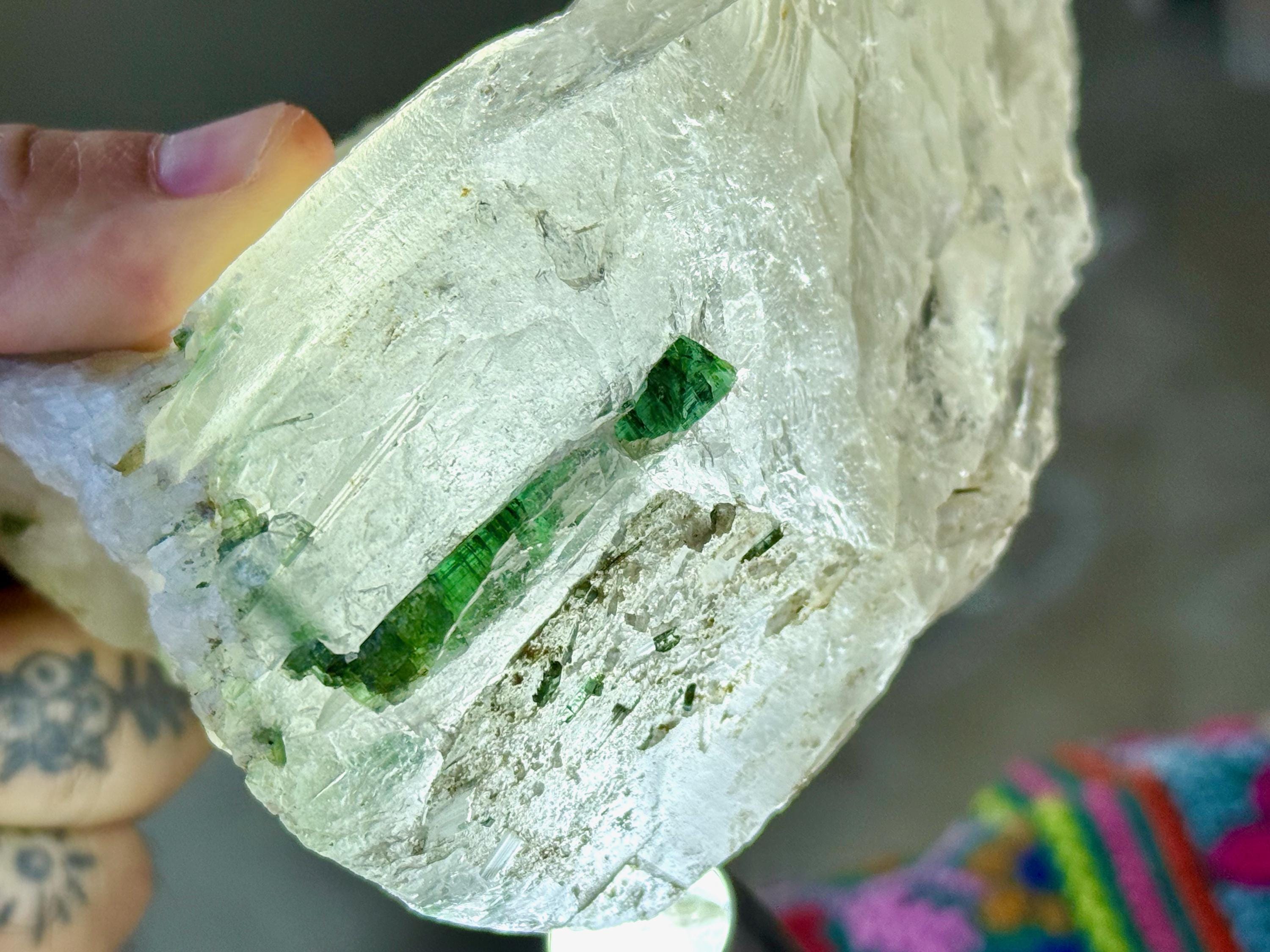 Regardless of these issues, it is still a spectacular aesthetic piece. It has a naturally flat base which allows it to sit perfectly upright for display (see Photo 6). And the real star is the Green Tourmaline in front which is impeccable.