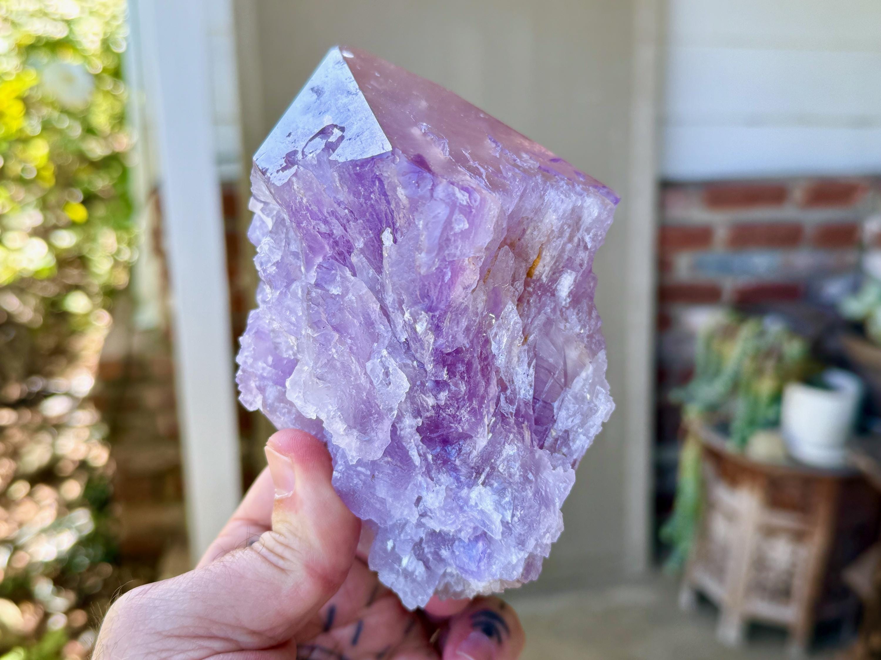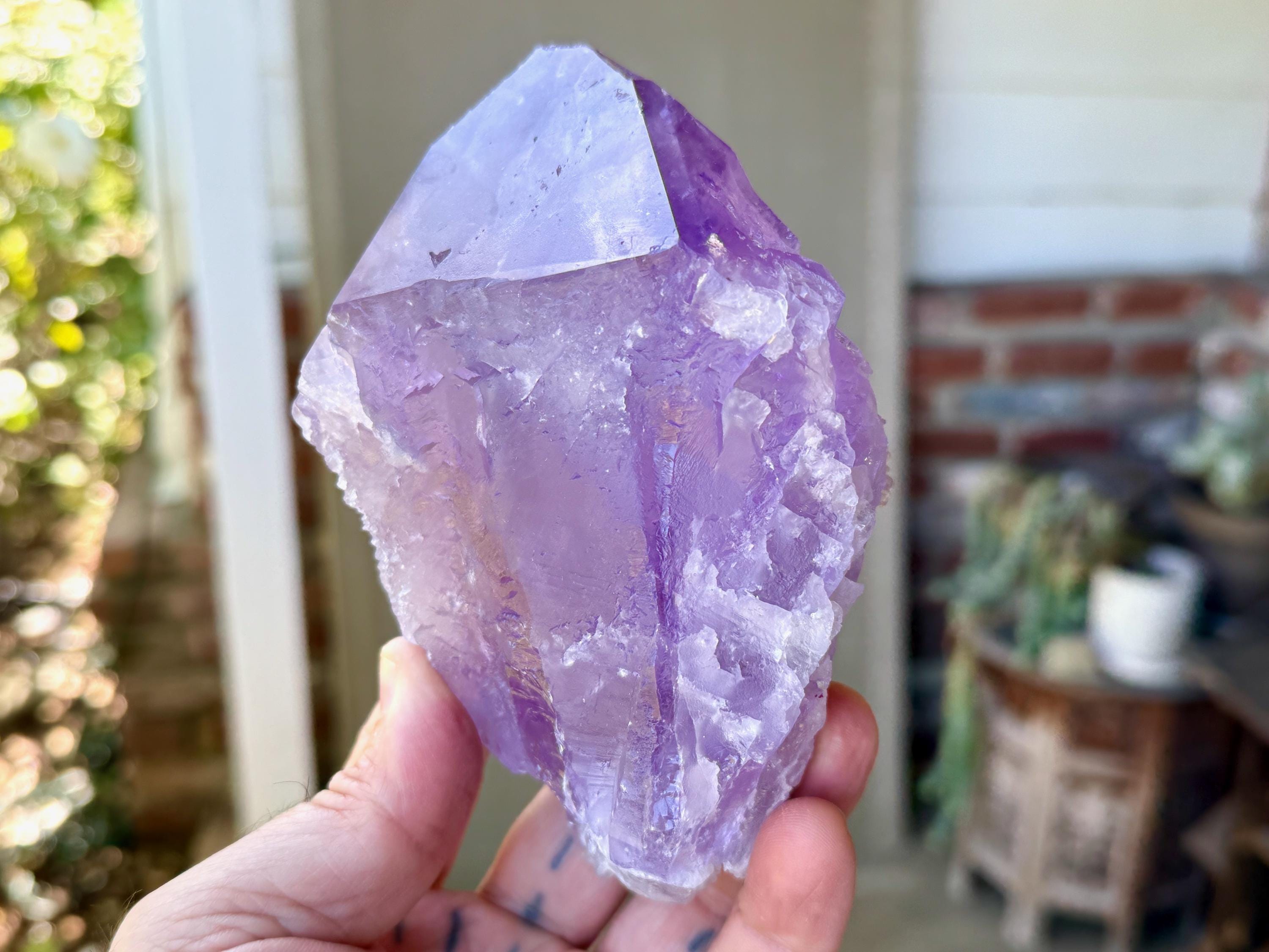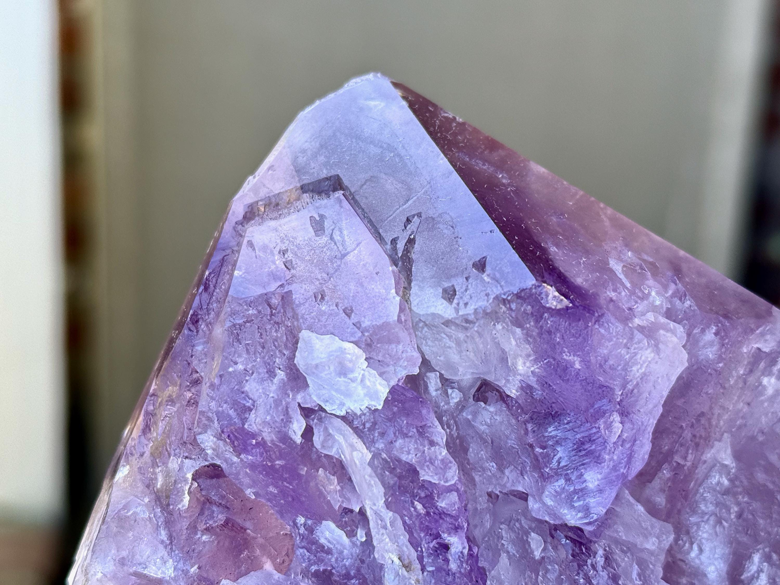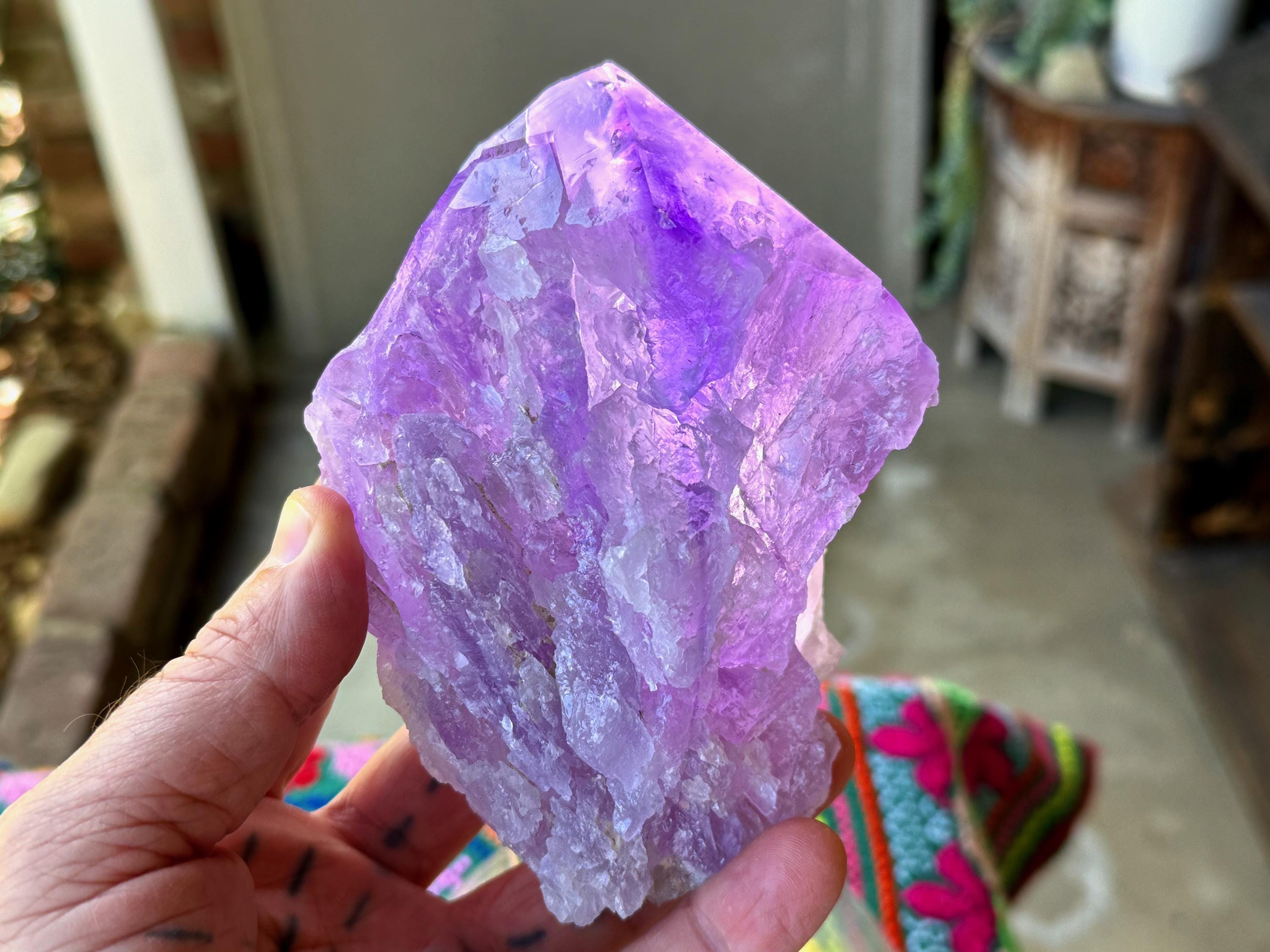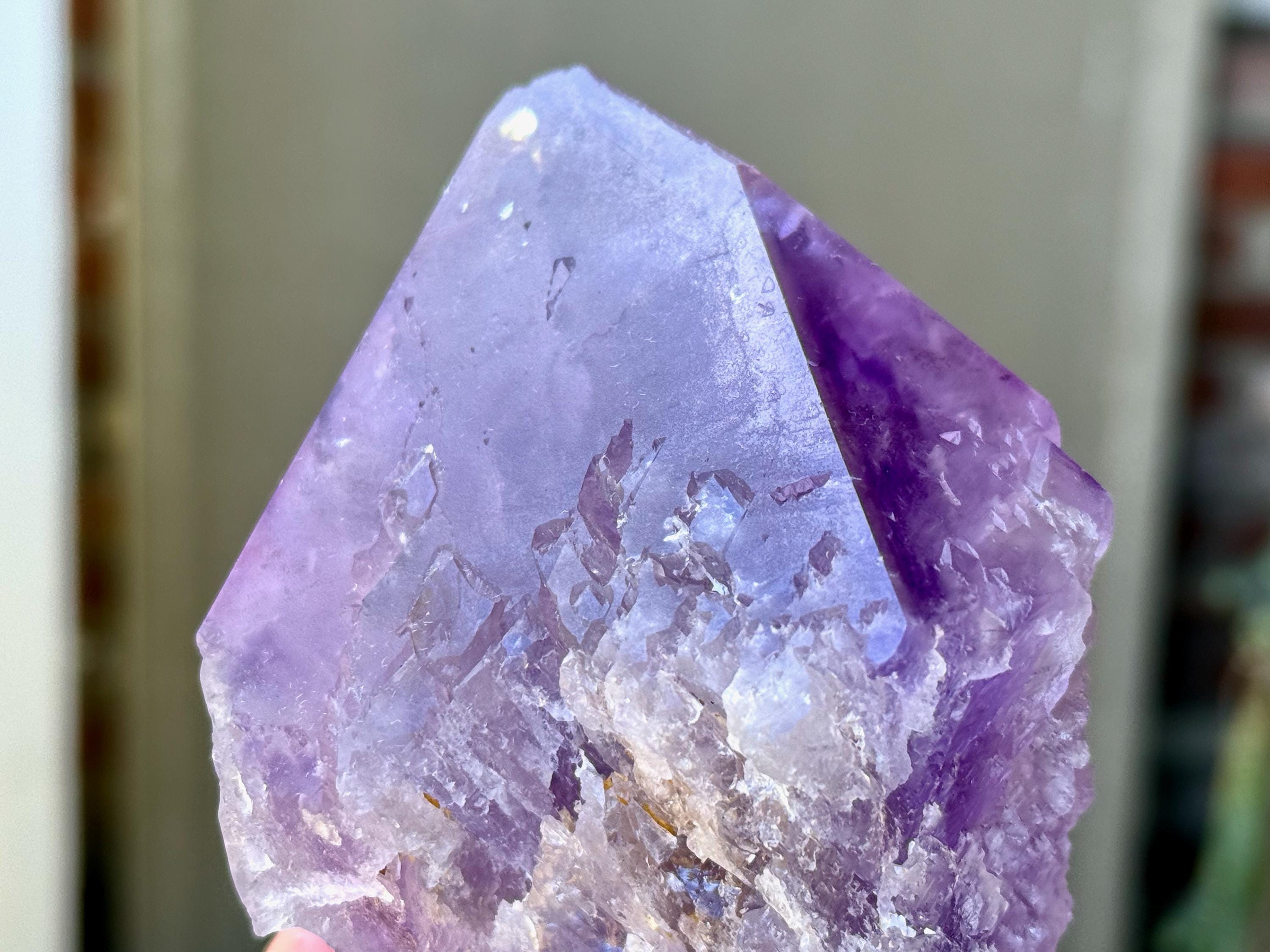 One of the largest pieces from this collection, this Amethyst Dissolution Quartz crystal weighs close to 2 pounds (876g), with a "torch"-like formation that features a broad main facet area on top and a tapered "root" at the base. This root portion shows off a multitude of natural crevices, grooves and textures all from its hydrothermal "birthing" process, it's really stunning!