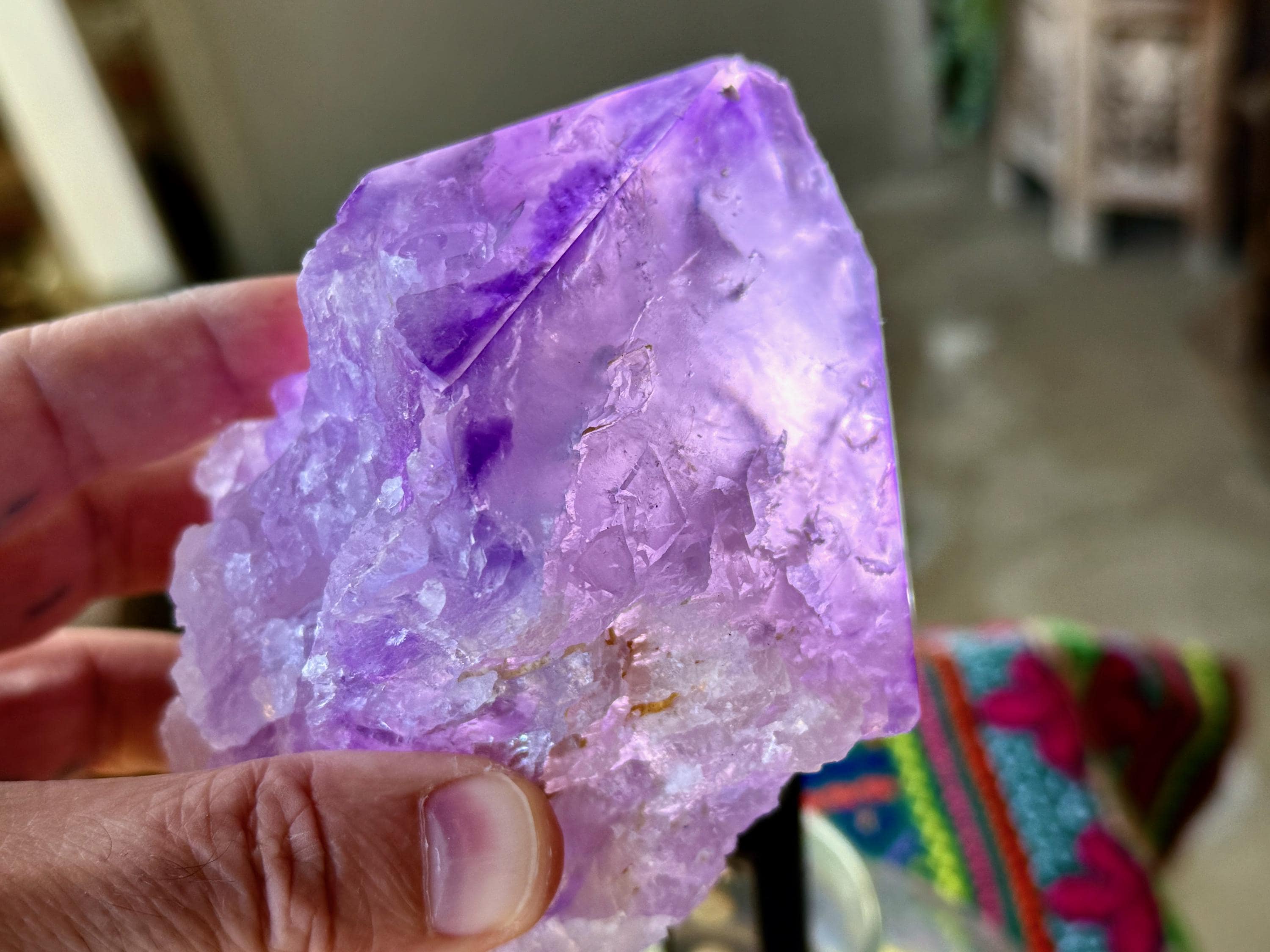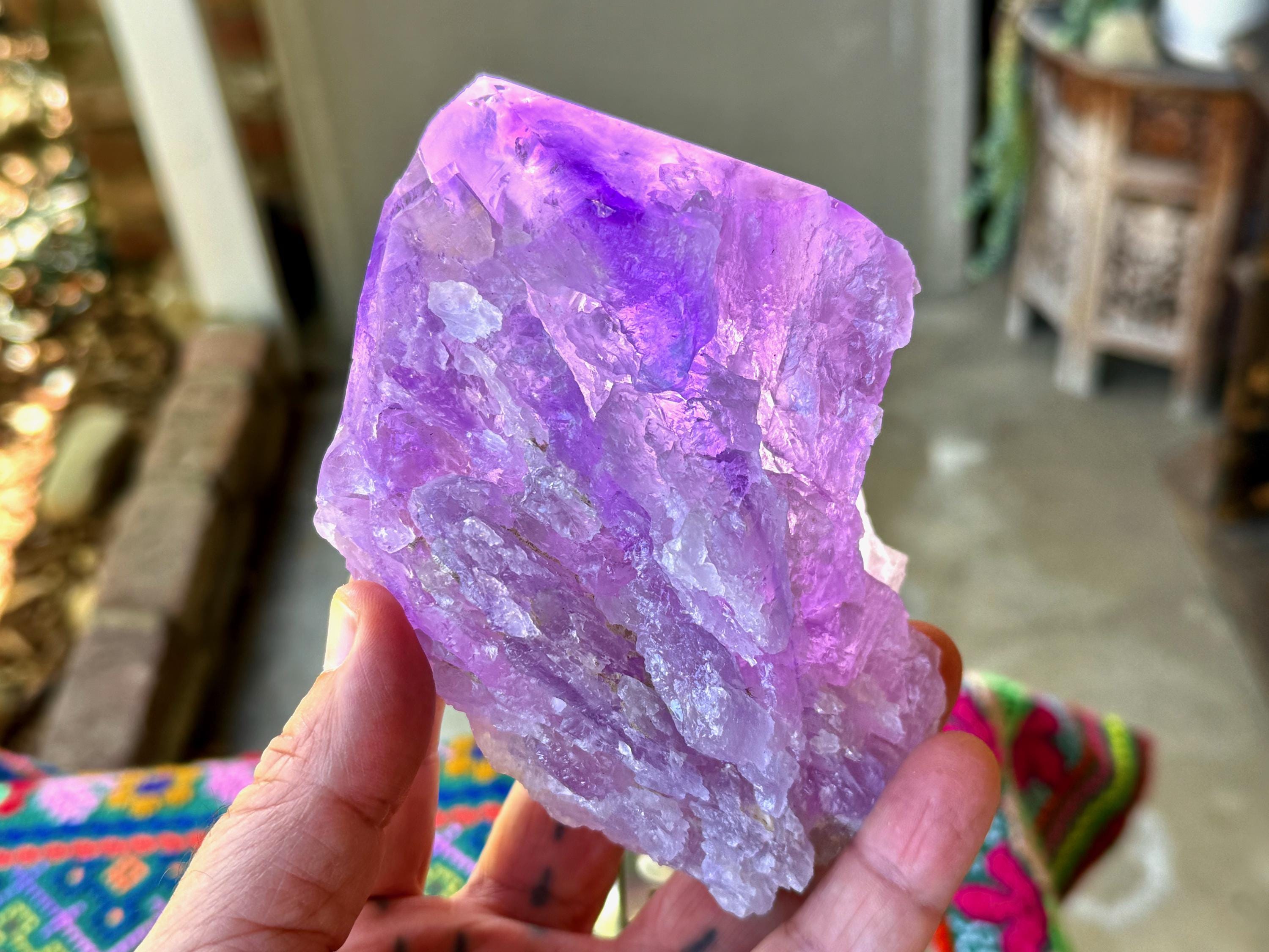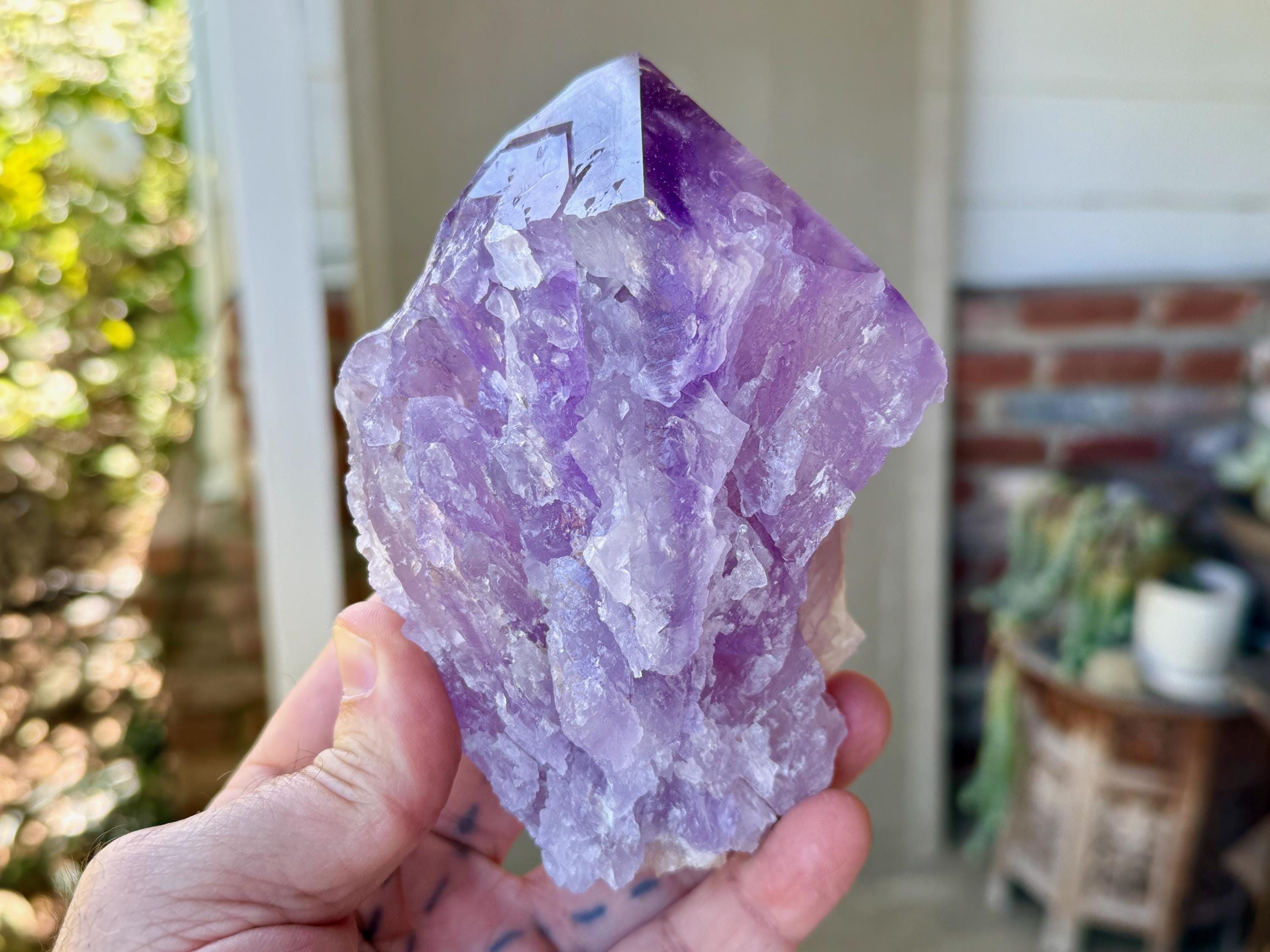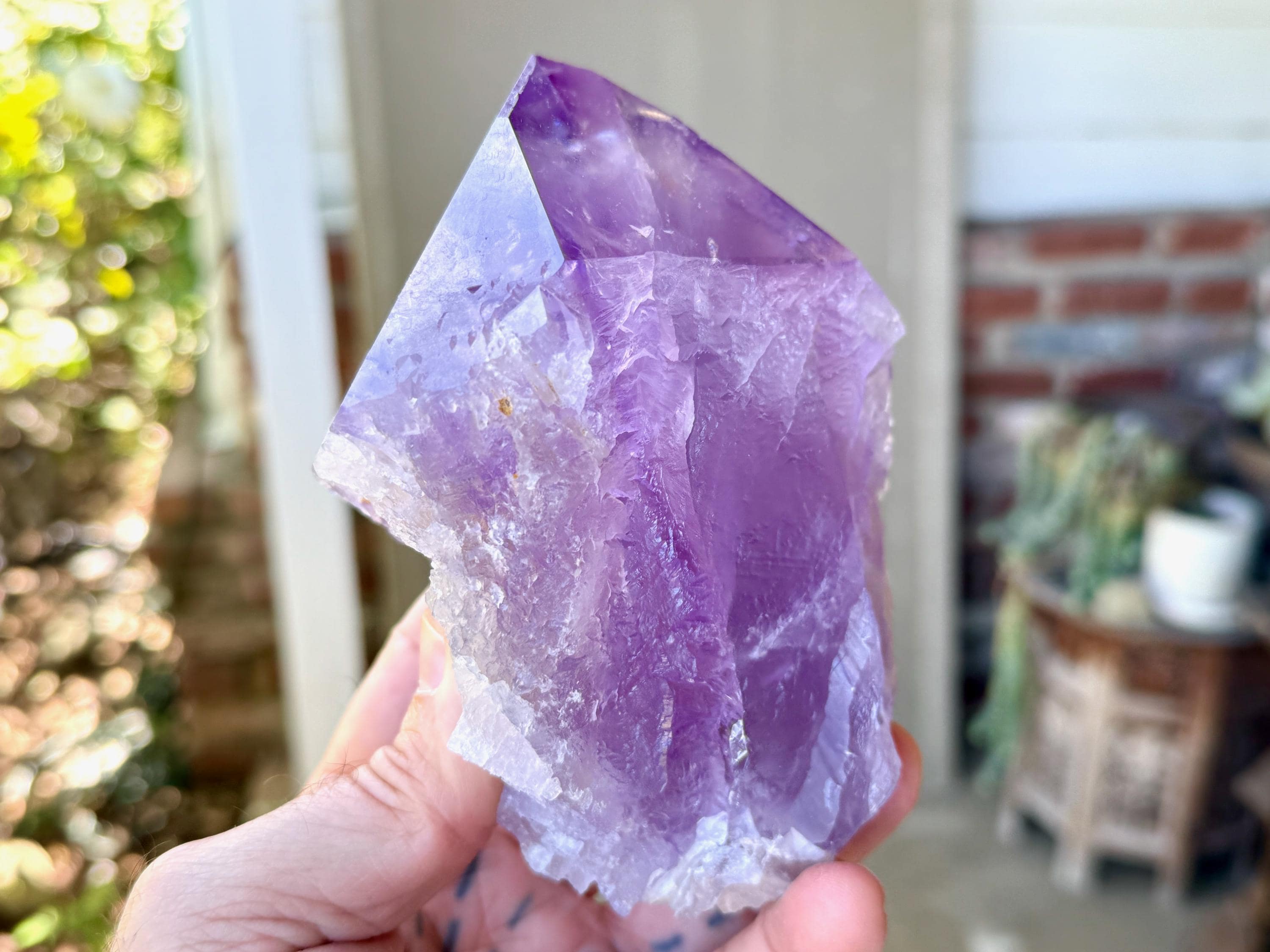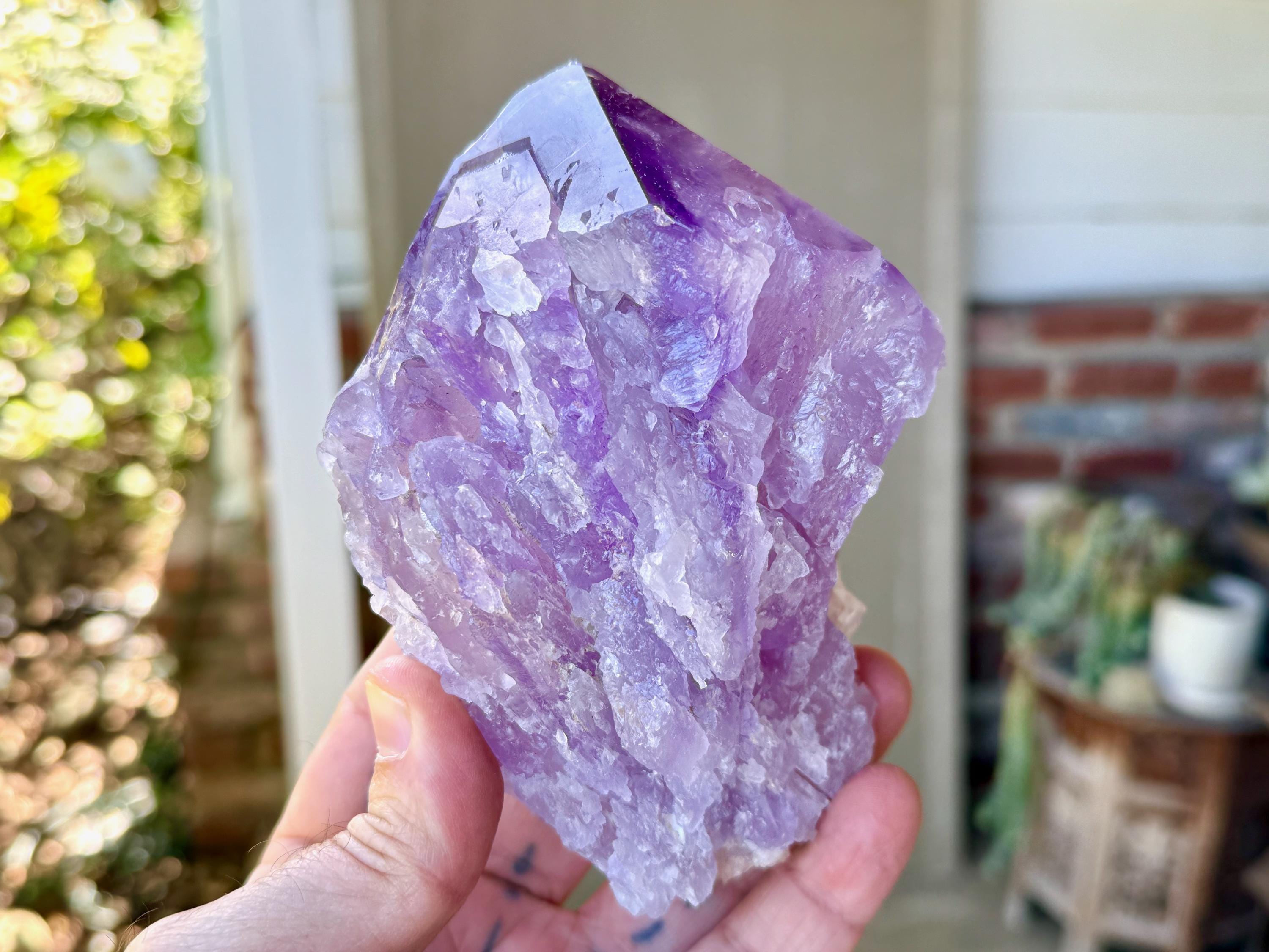 One of the largest pieces from this collection, this Amethyst Dissolution Quartz crystal weighs close to 2 pounds (876g), with a "torch"-like formation that features a broad main facet area on top and a tapered "root" at the base. This root portion shows off a multitude of natural crevices, grooves and textures all from its hydrothermal "birthing" process, it's really stunning!
