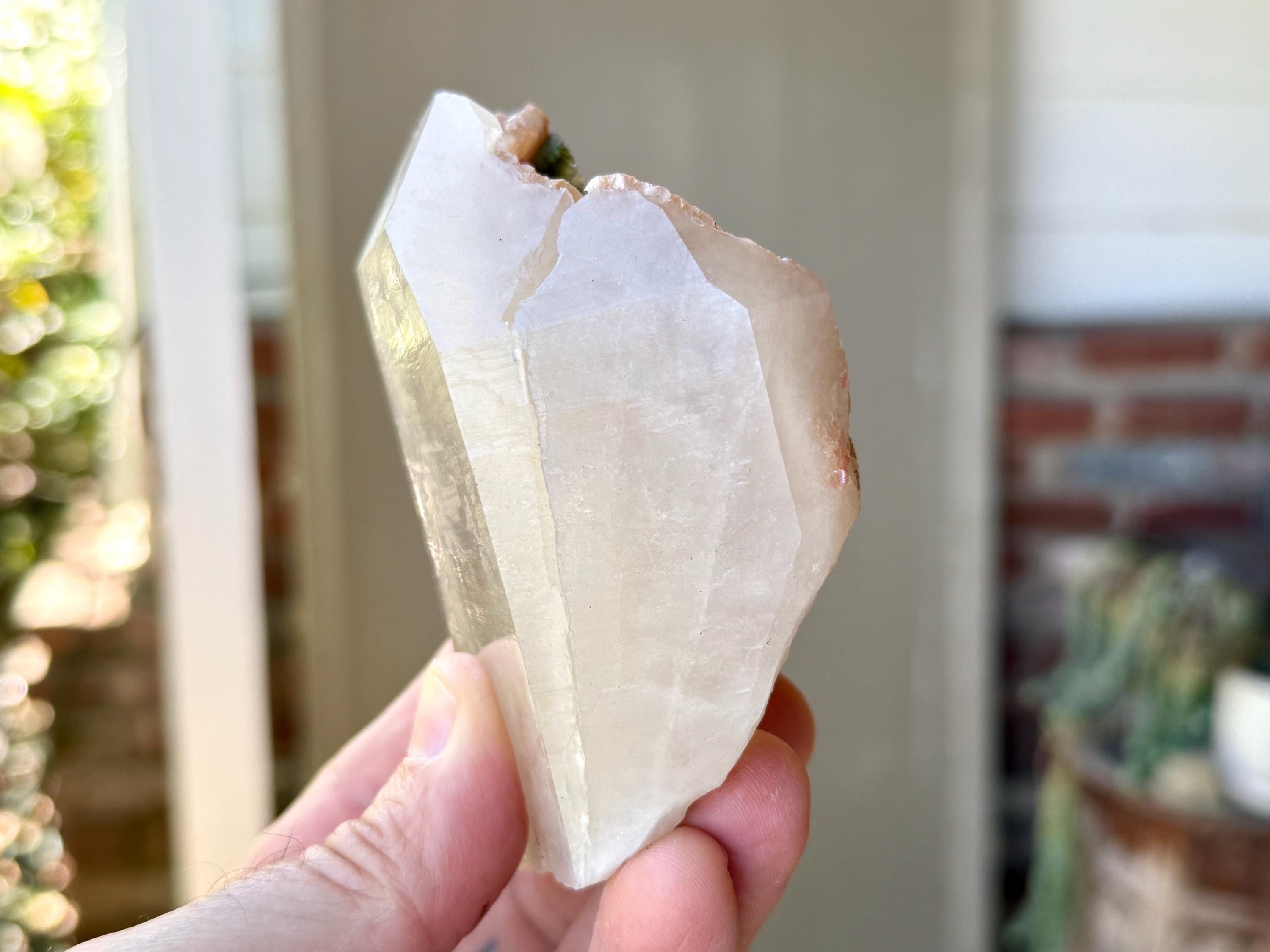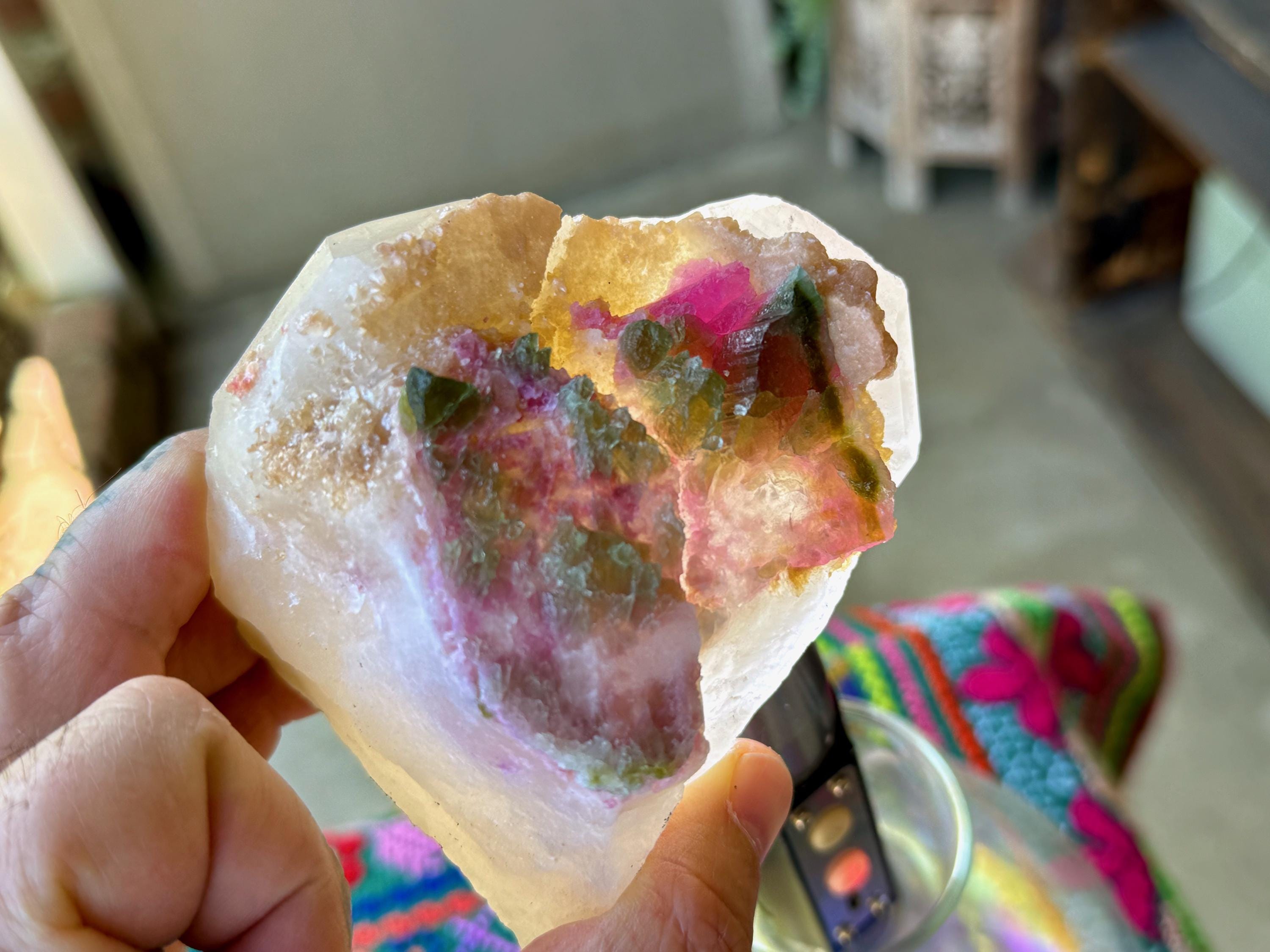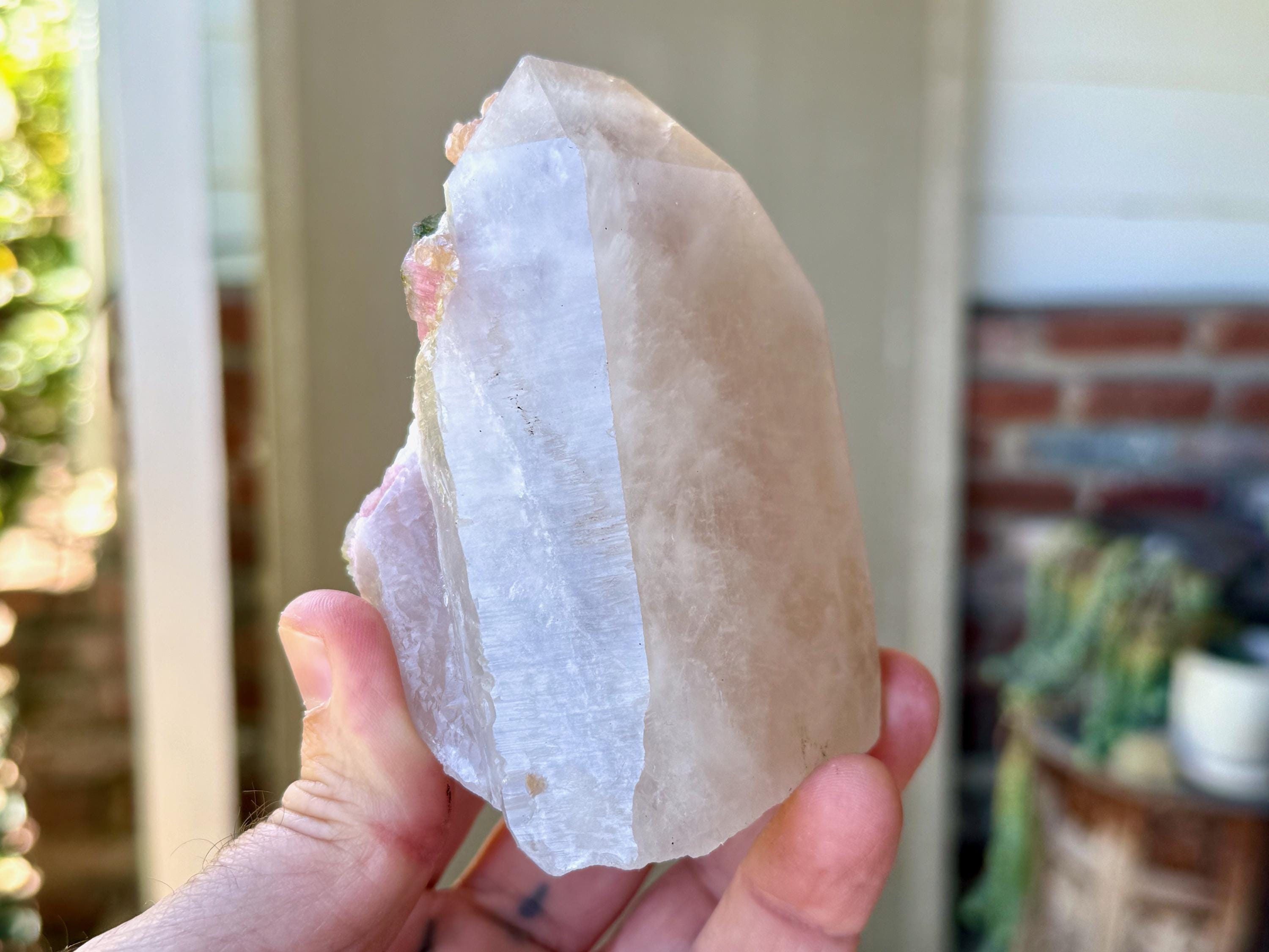 This contrast is apparent as if you view this piece from one side, it simply appears like a regular Quartz point (Photo 9). But turn it around, and the colorful inclusions show themselves. When backlit, as in Photos 4-6, we can see just how brilliant they are.