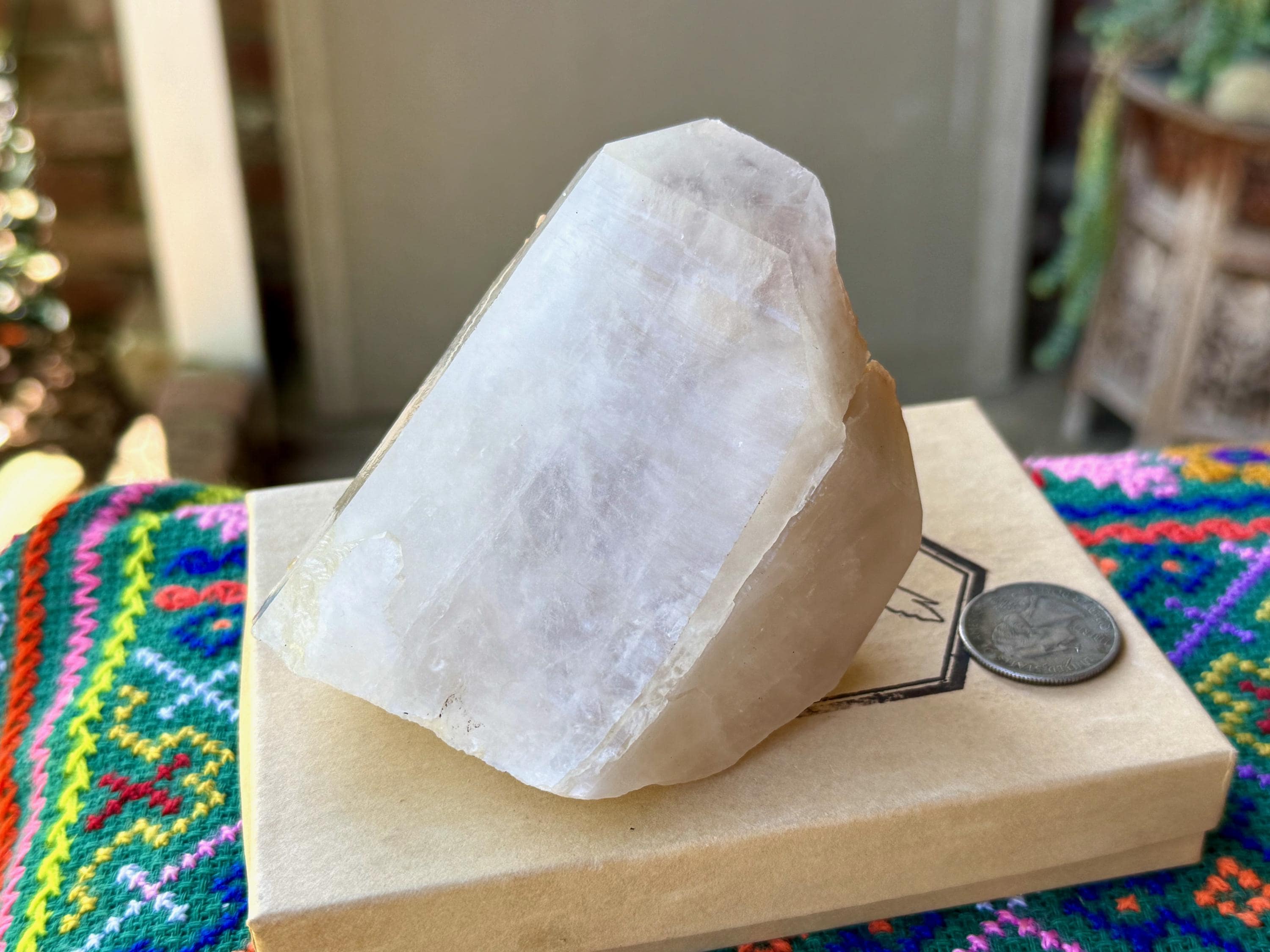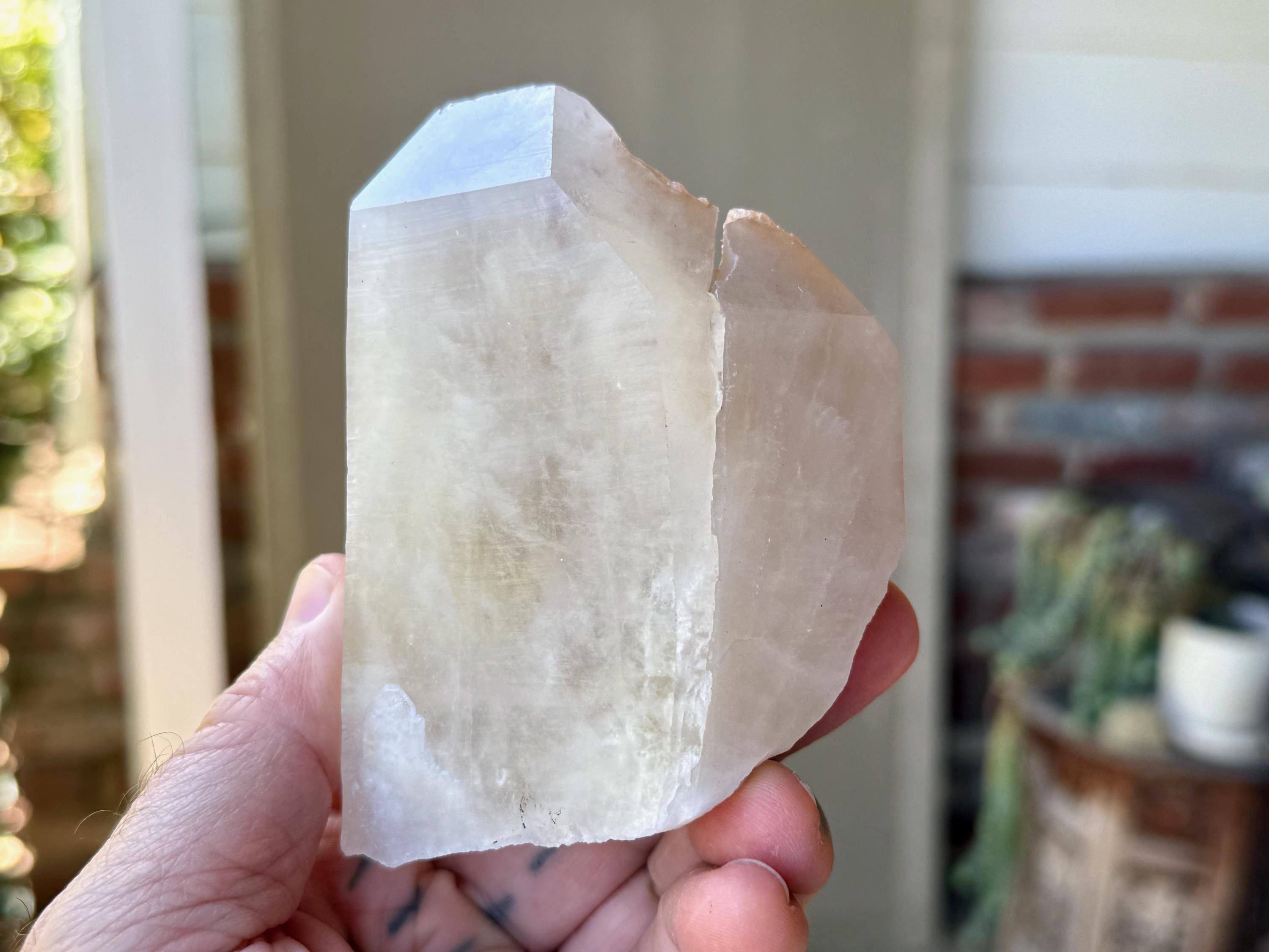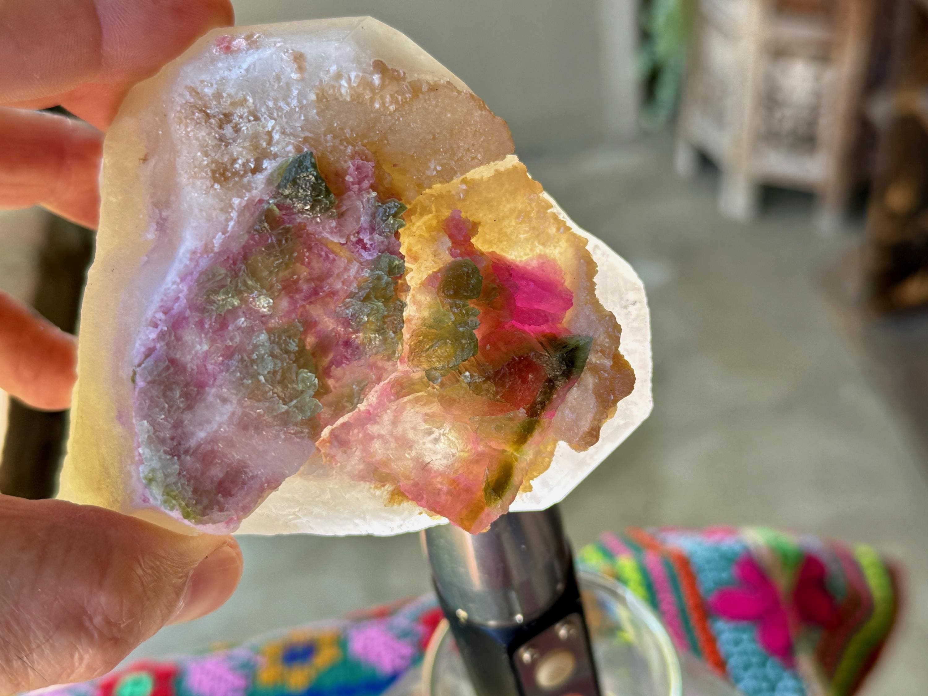 This contrast is apparent as if you view this piece from one side, it simply appears like a regular Quartz point (Photo 9). But turn it around, and the colorful inclusions show themselves. When backlit, as in Photos 4-6, we can see just how brilliant they are.