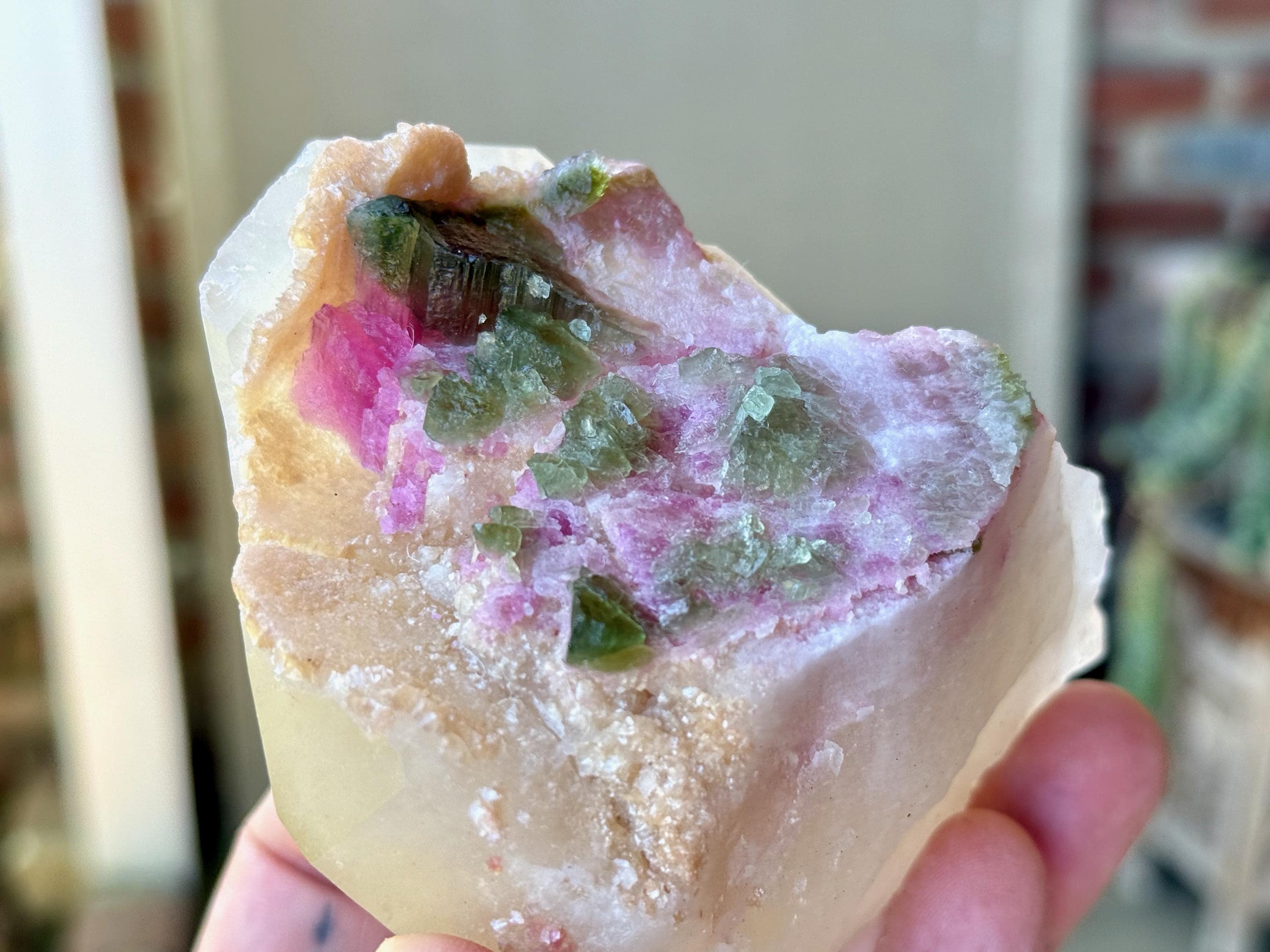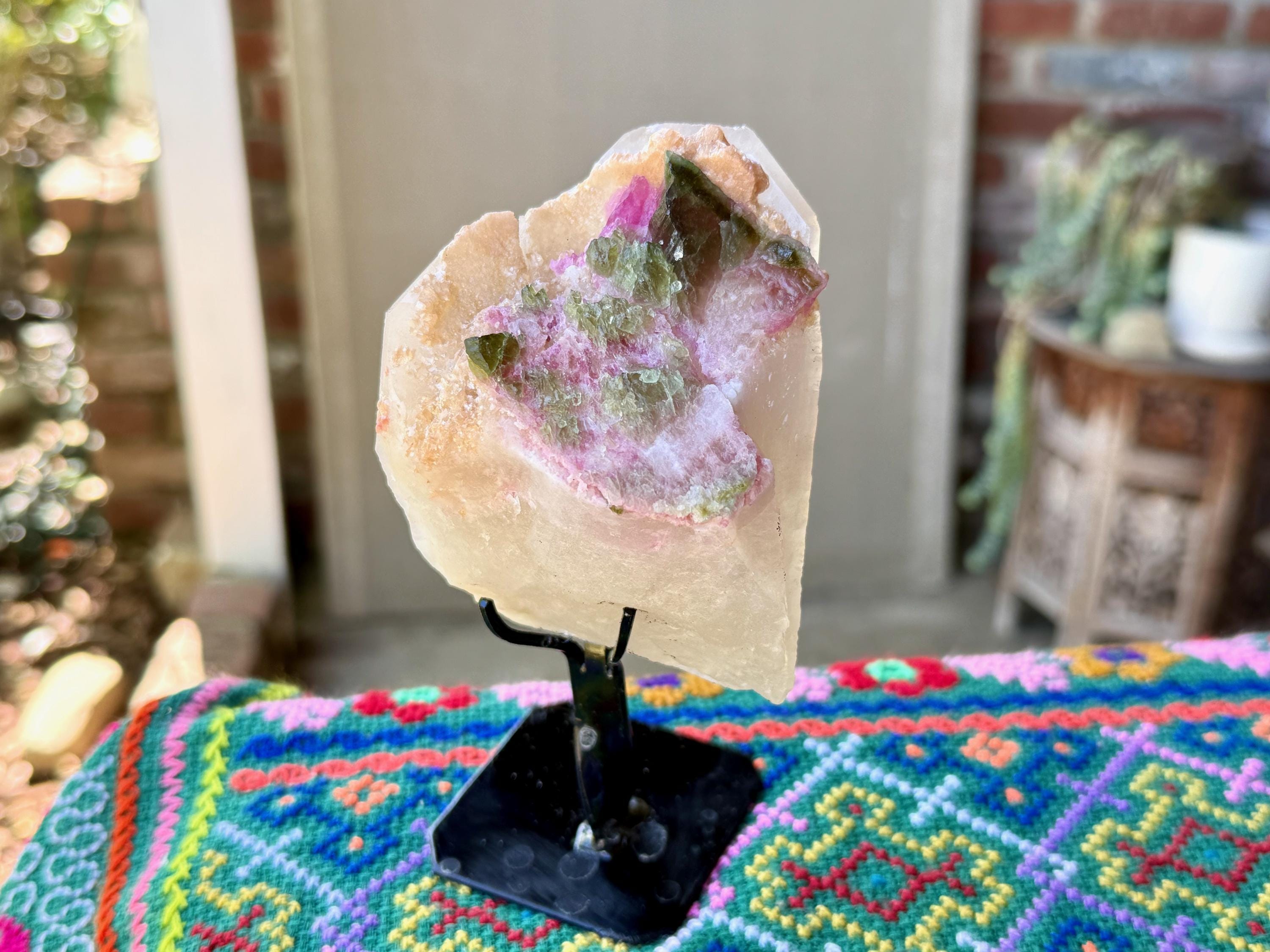 Gorgeous luster and brilliant colors to this stunning Unicorn Stone Quartz with Pink and Green Tourmaline inclusions.