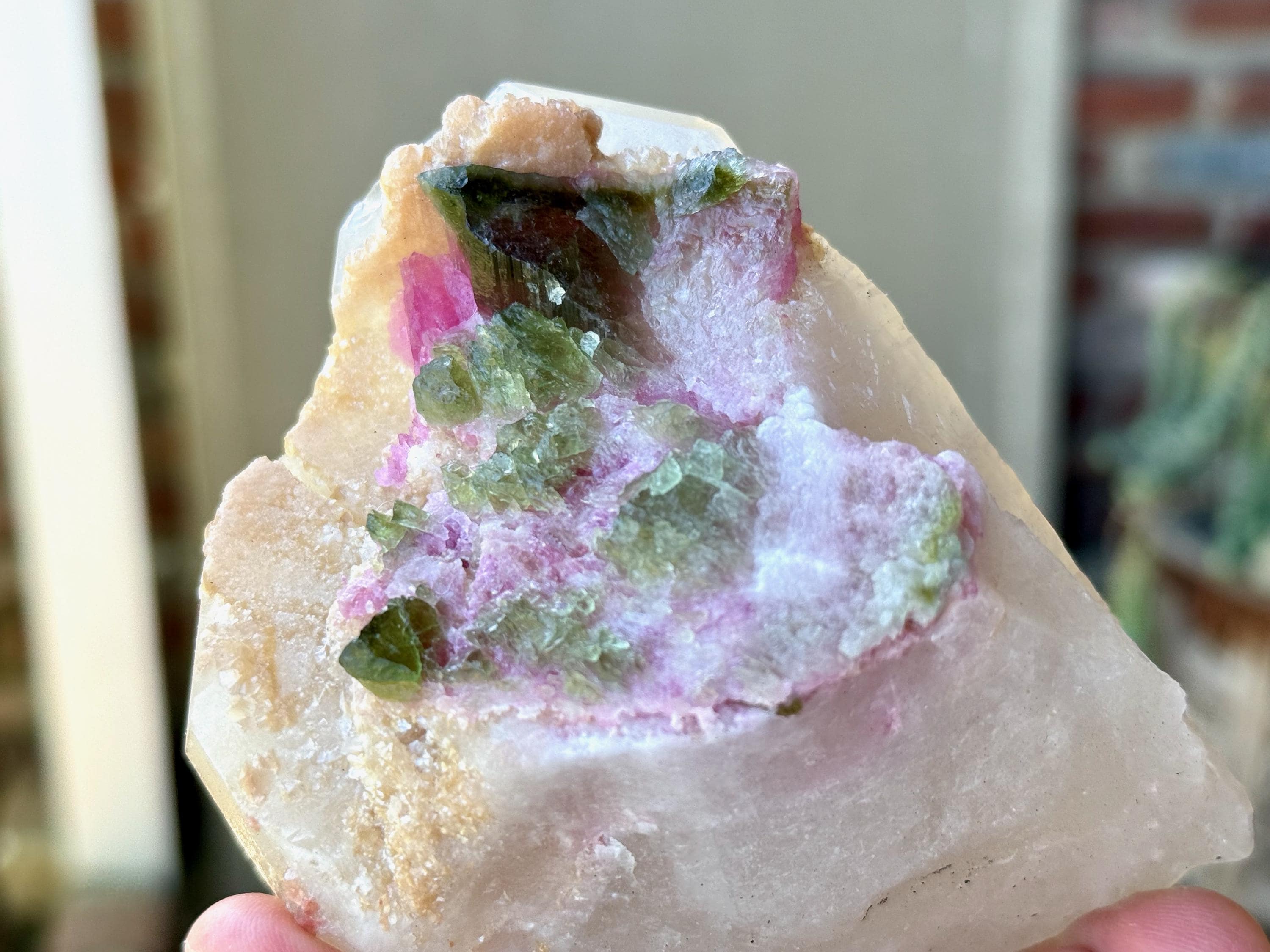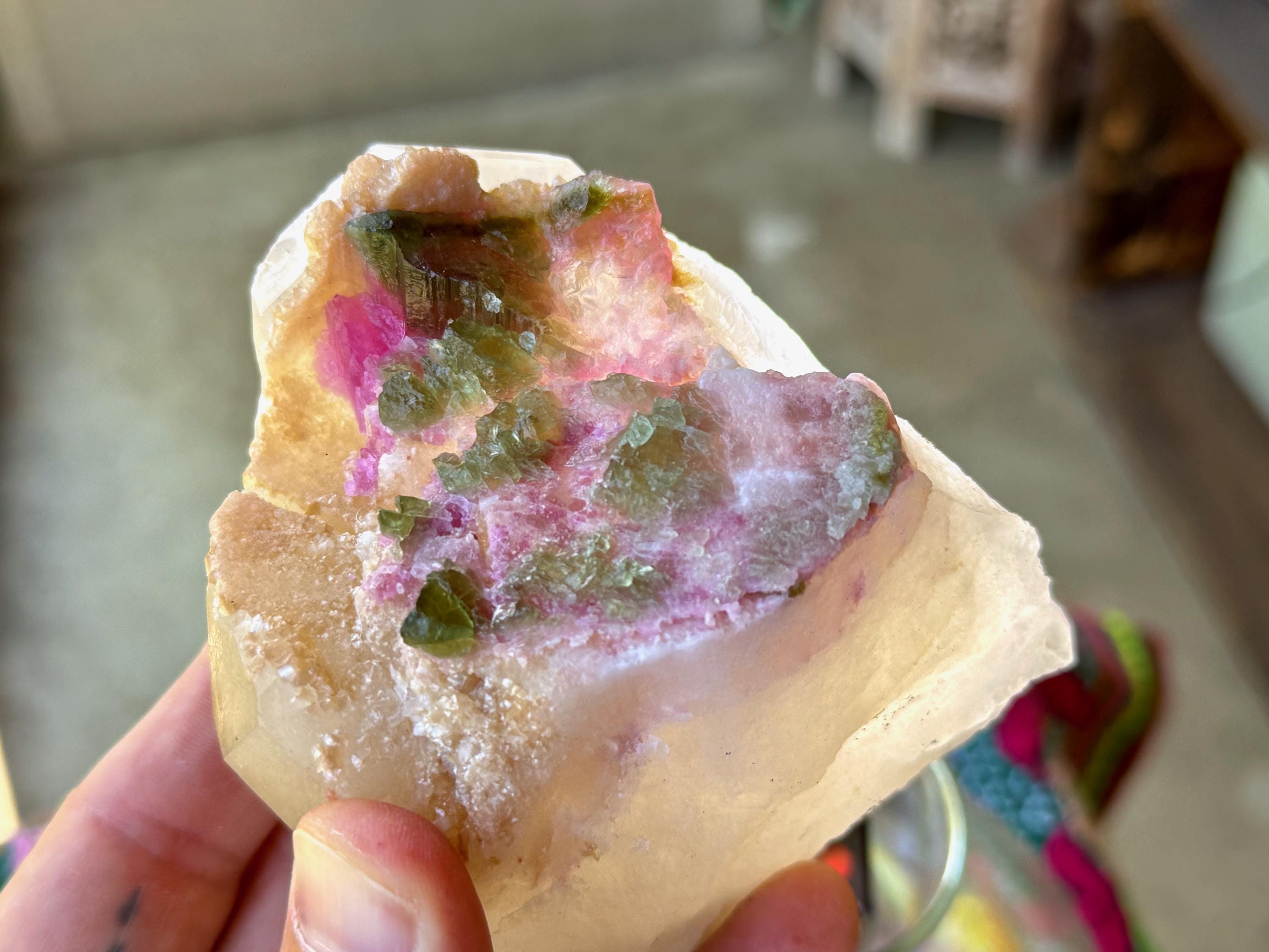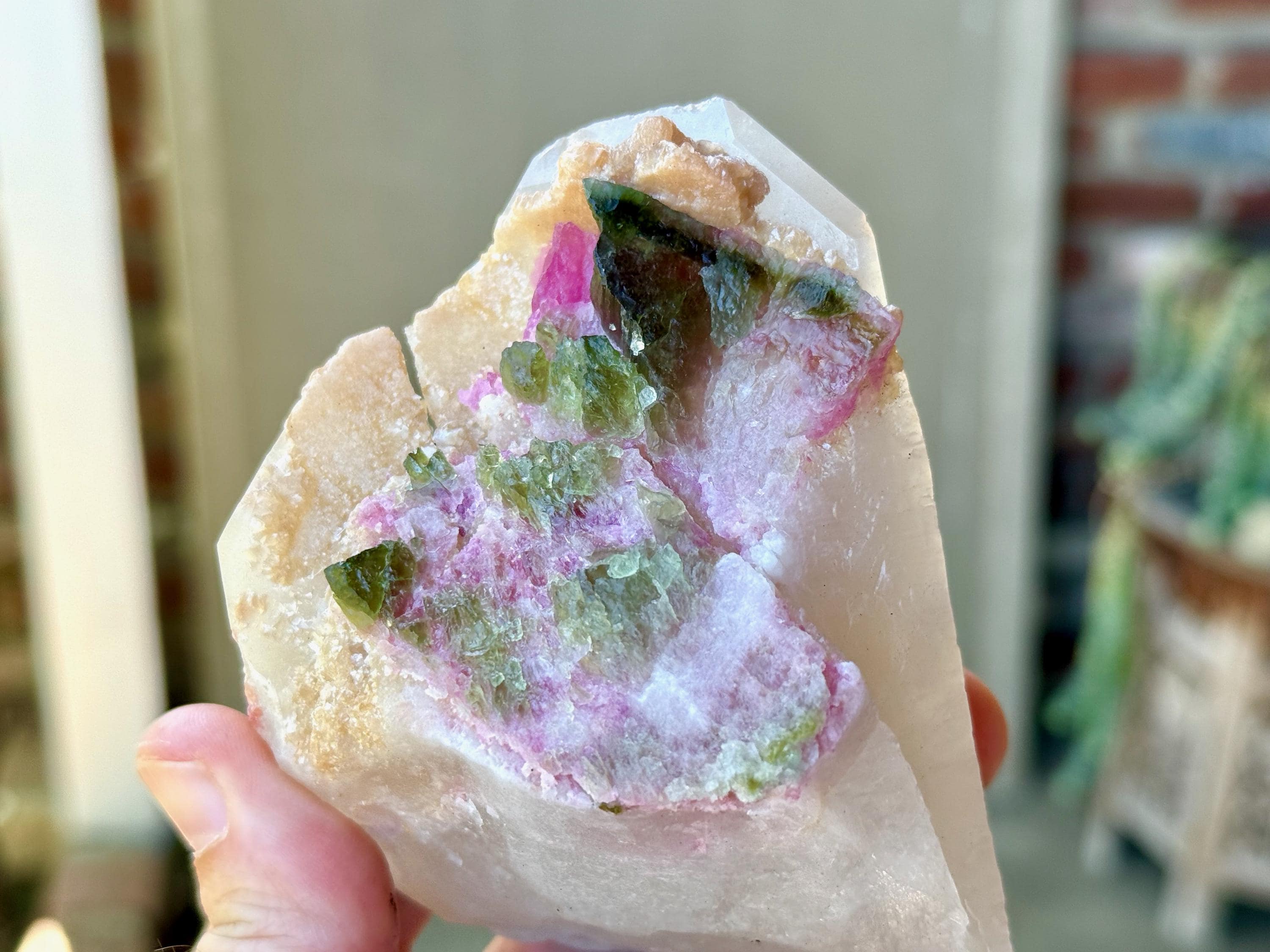 This is a unique formation that features a lustrous, milky Quartz crystal that, at some point while still in the Earth, broke apart from its other half. Over the course of millions of years, this area healed and was populated by a vibrant bouquet of Pink & Green Tourmaline inclusions.