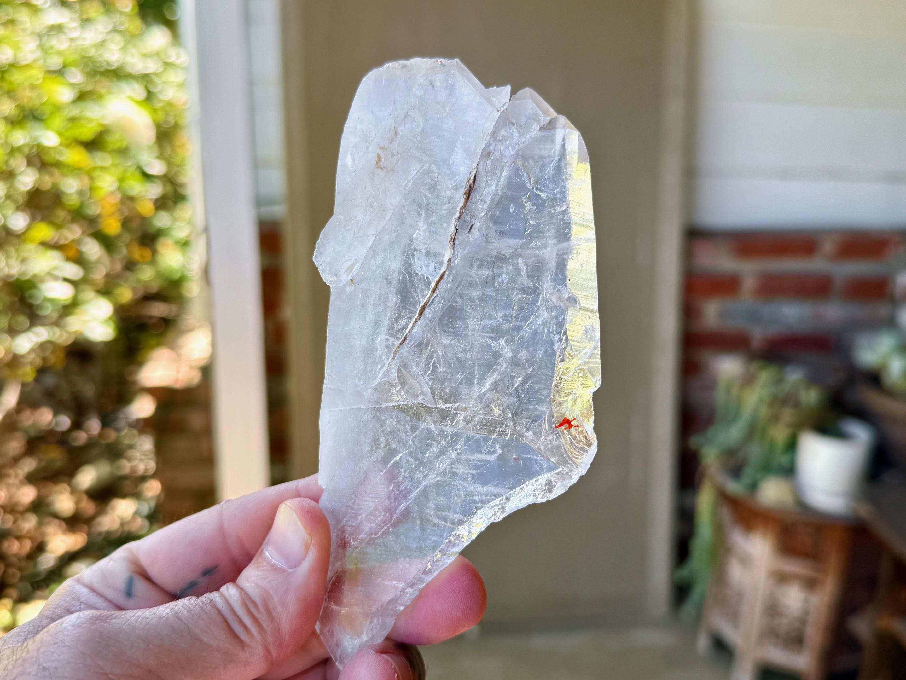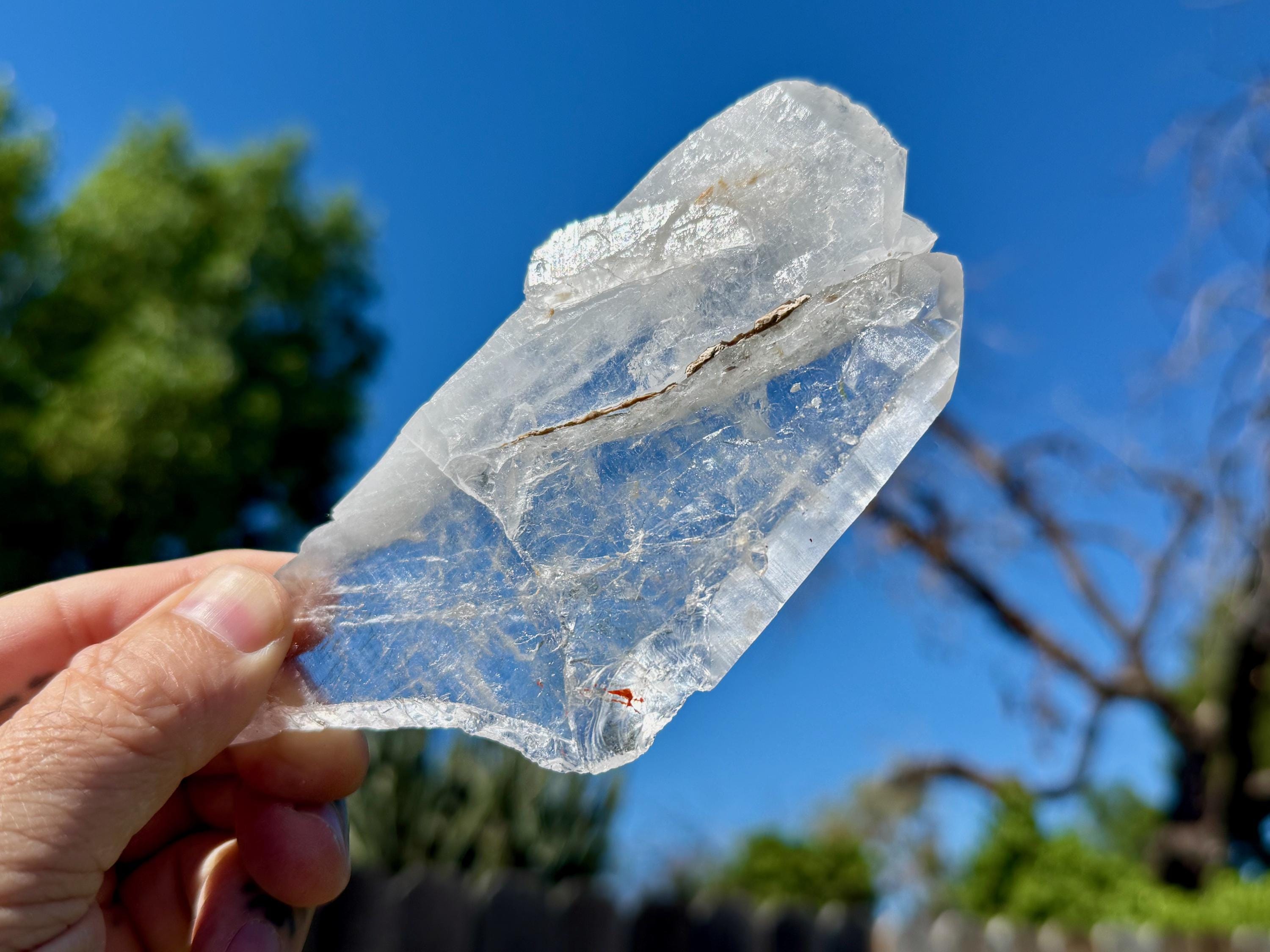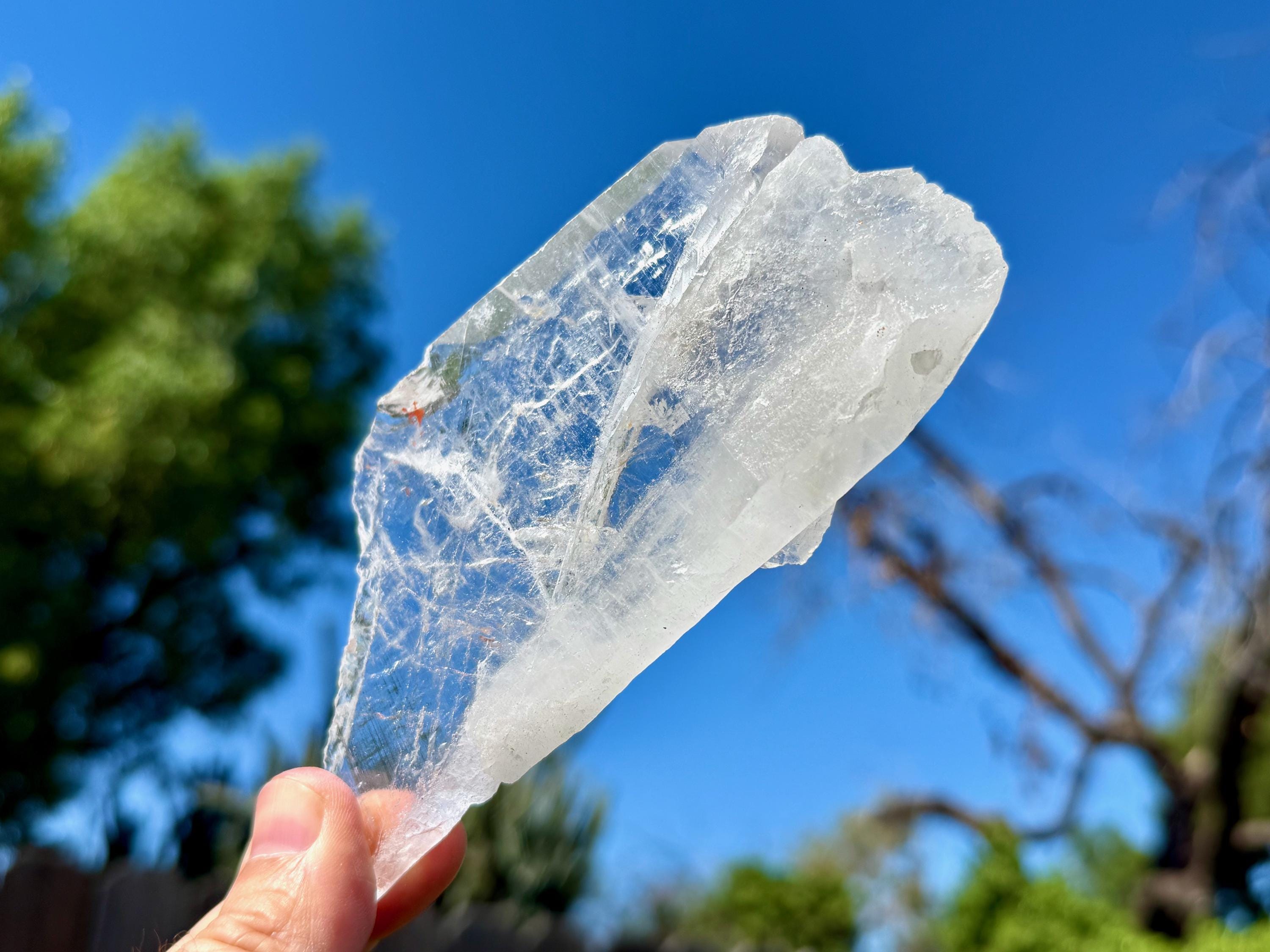 Water-clear clarity and brilliant luster to this Lemurian Quartz crystal in a broad and flat "plate" formation. This is what is referred to as a "Galactic Key" formation, having broken off of a larger crystal and managed to heal itself over millions of years. These formations tend to have remarkable healing energies (see more on this formation below).