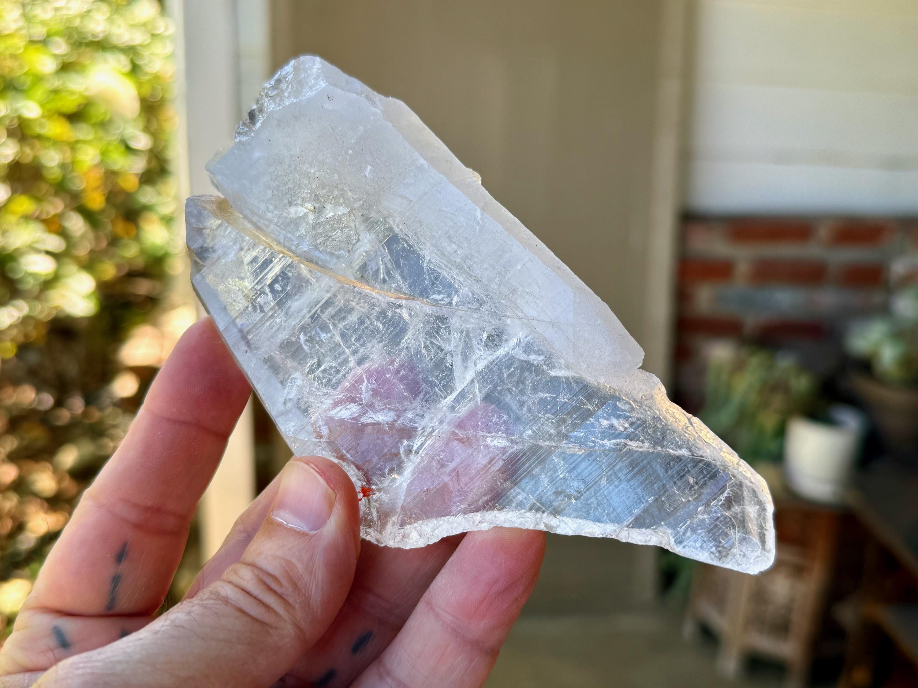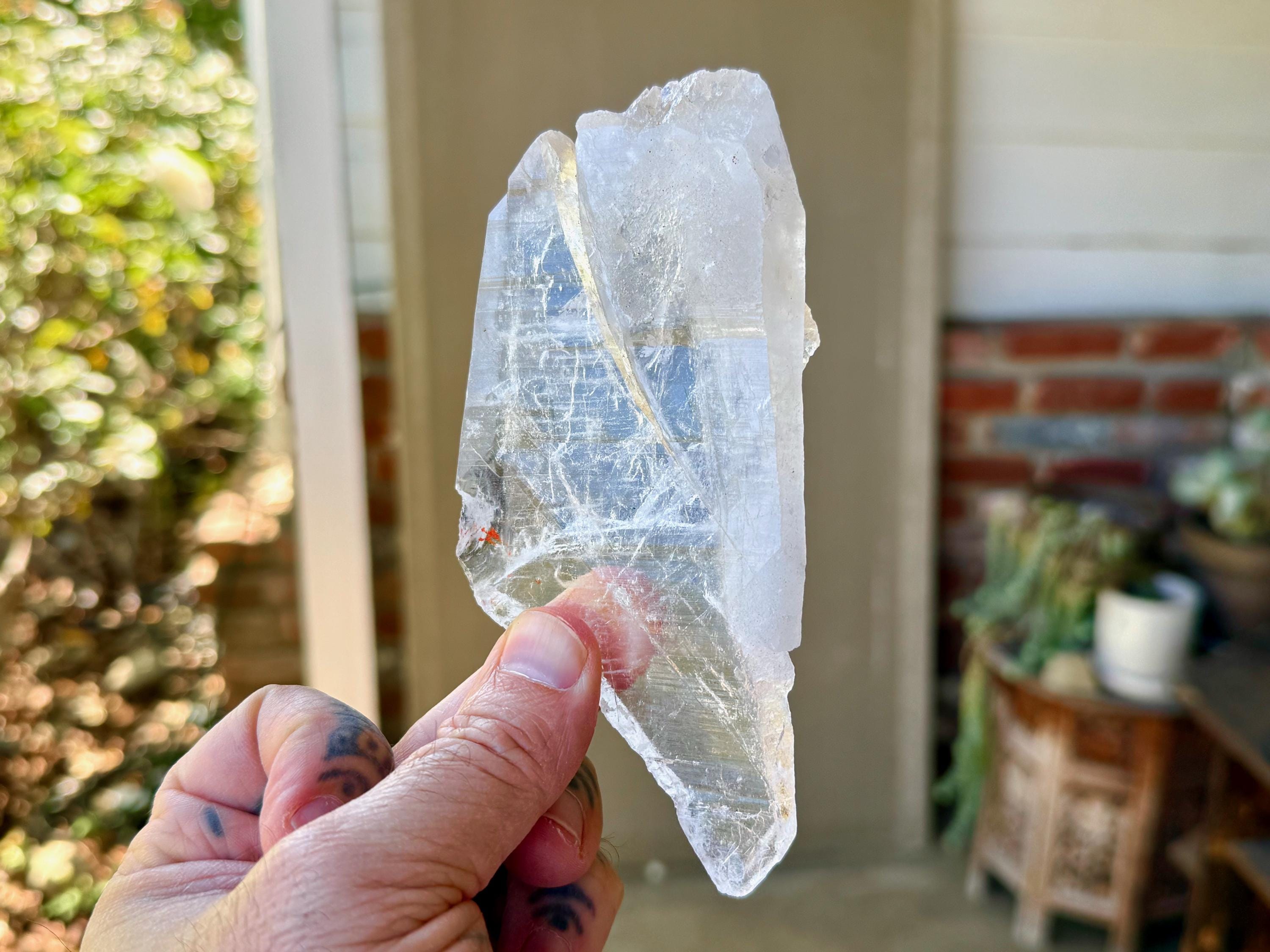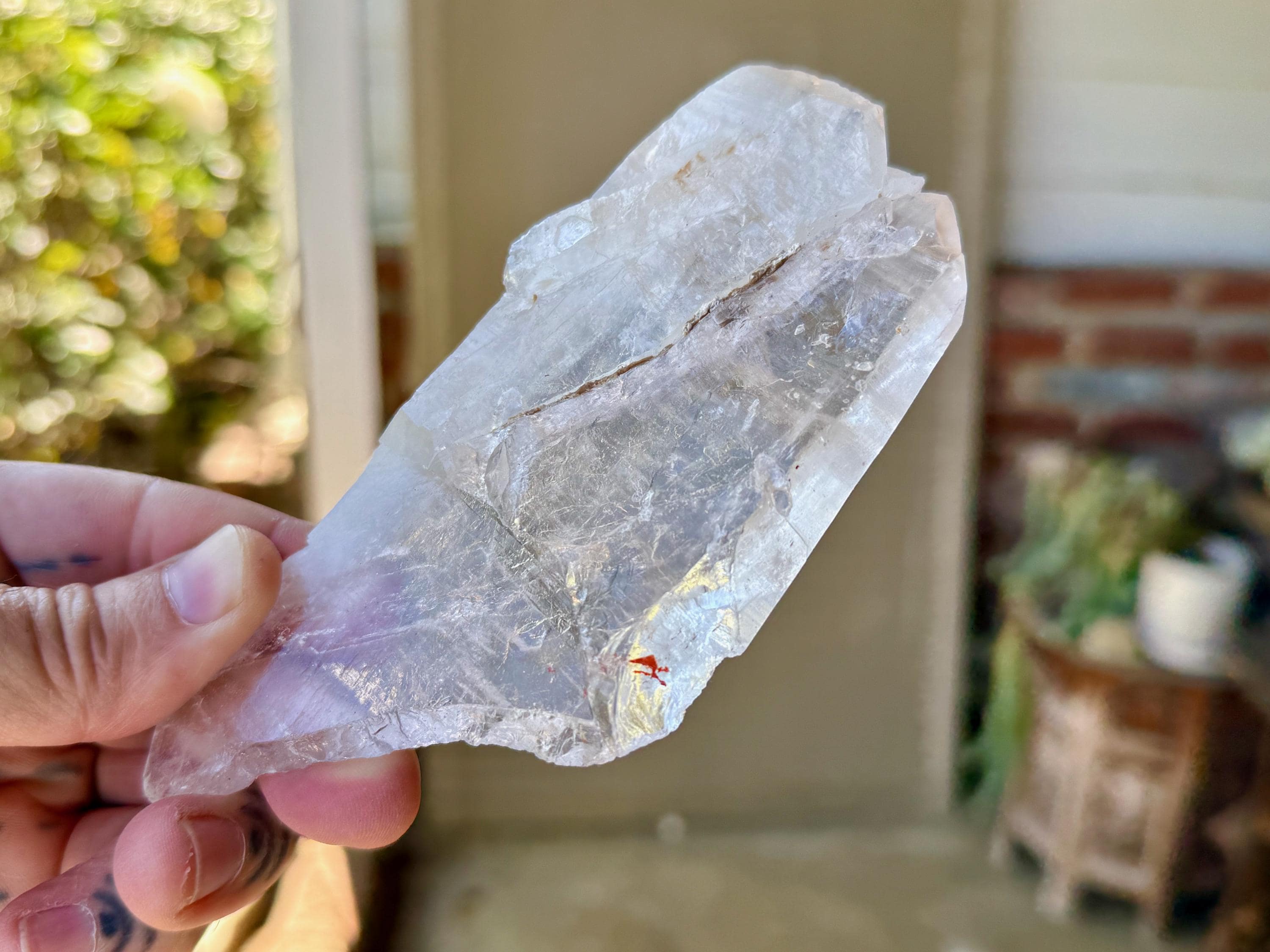 Water-clear clarity and brilliant luster to this Lemurian Quartz crystal in a broad and flat "plate" formation. This is what is referred to as a "Galactic Key" formation, having broken off of a larger crystal and managed to heal itself over millions of years. These formations tend to have remarkable healing energies (see more on this formation below).