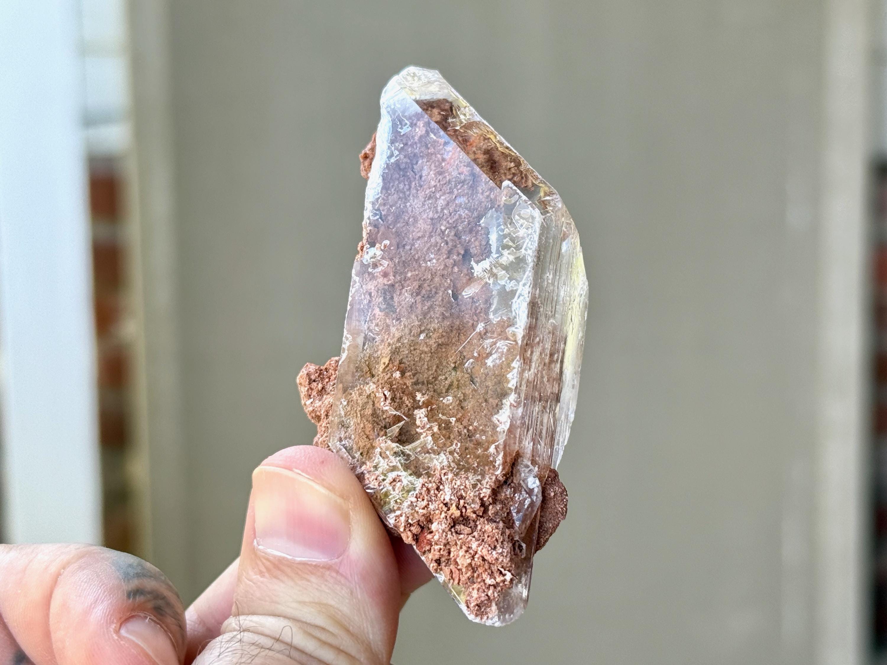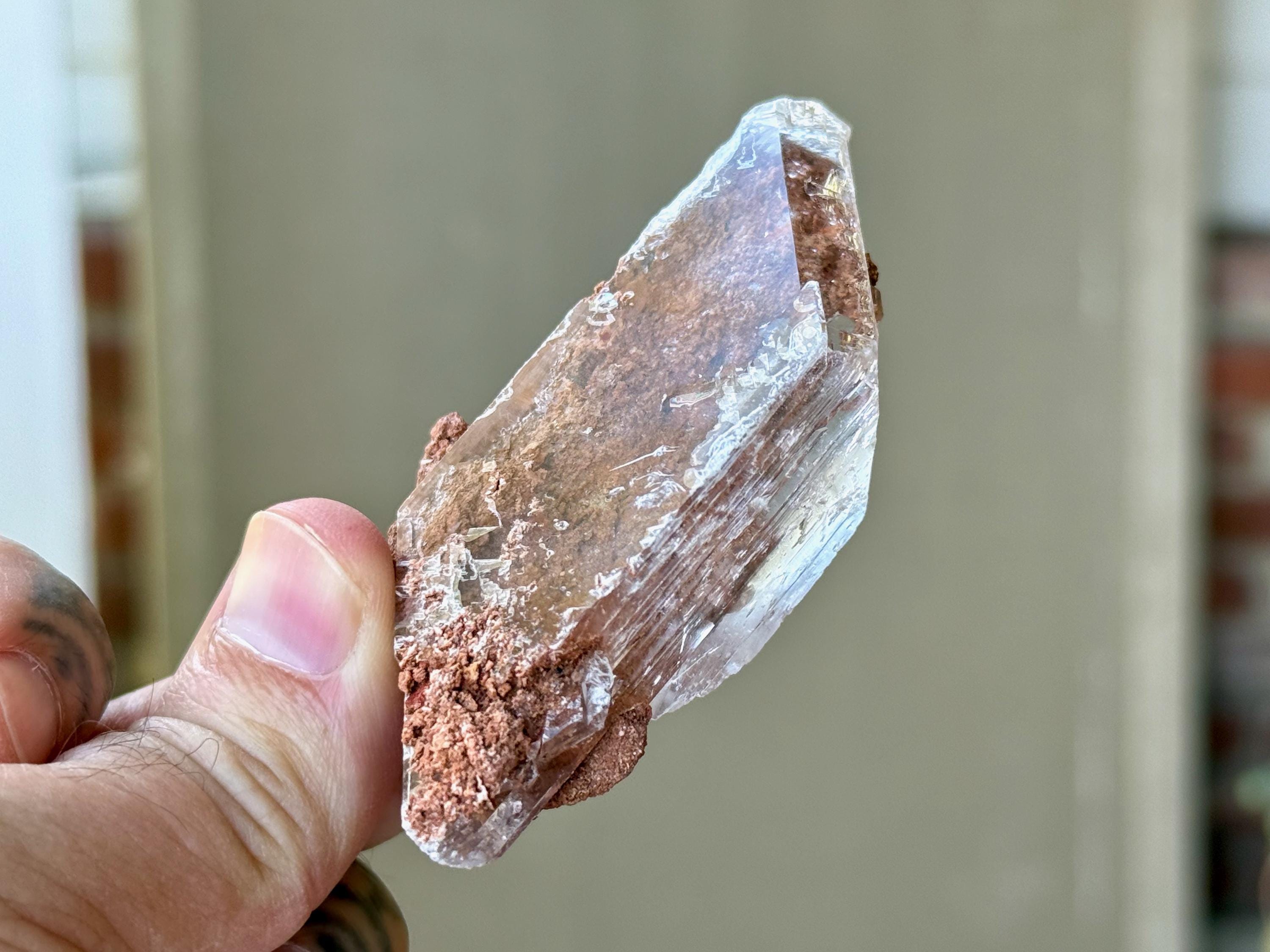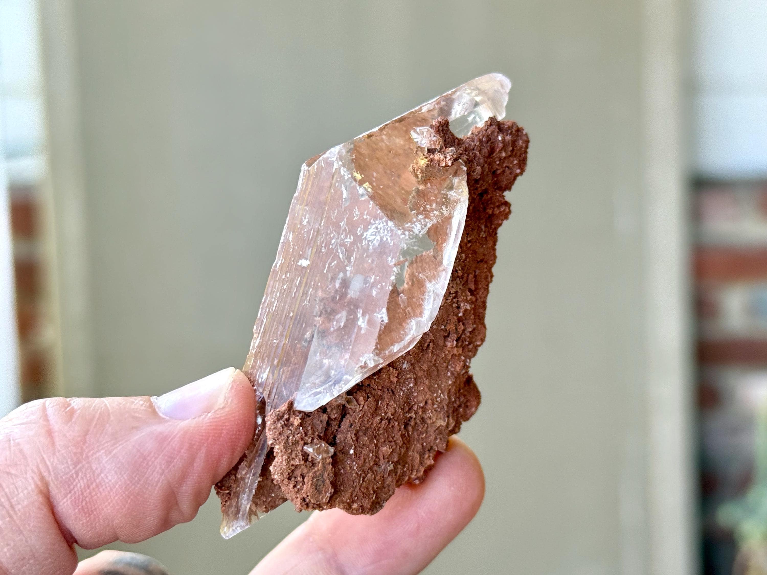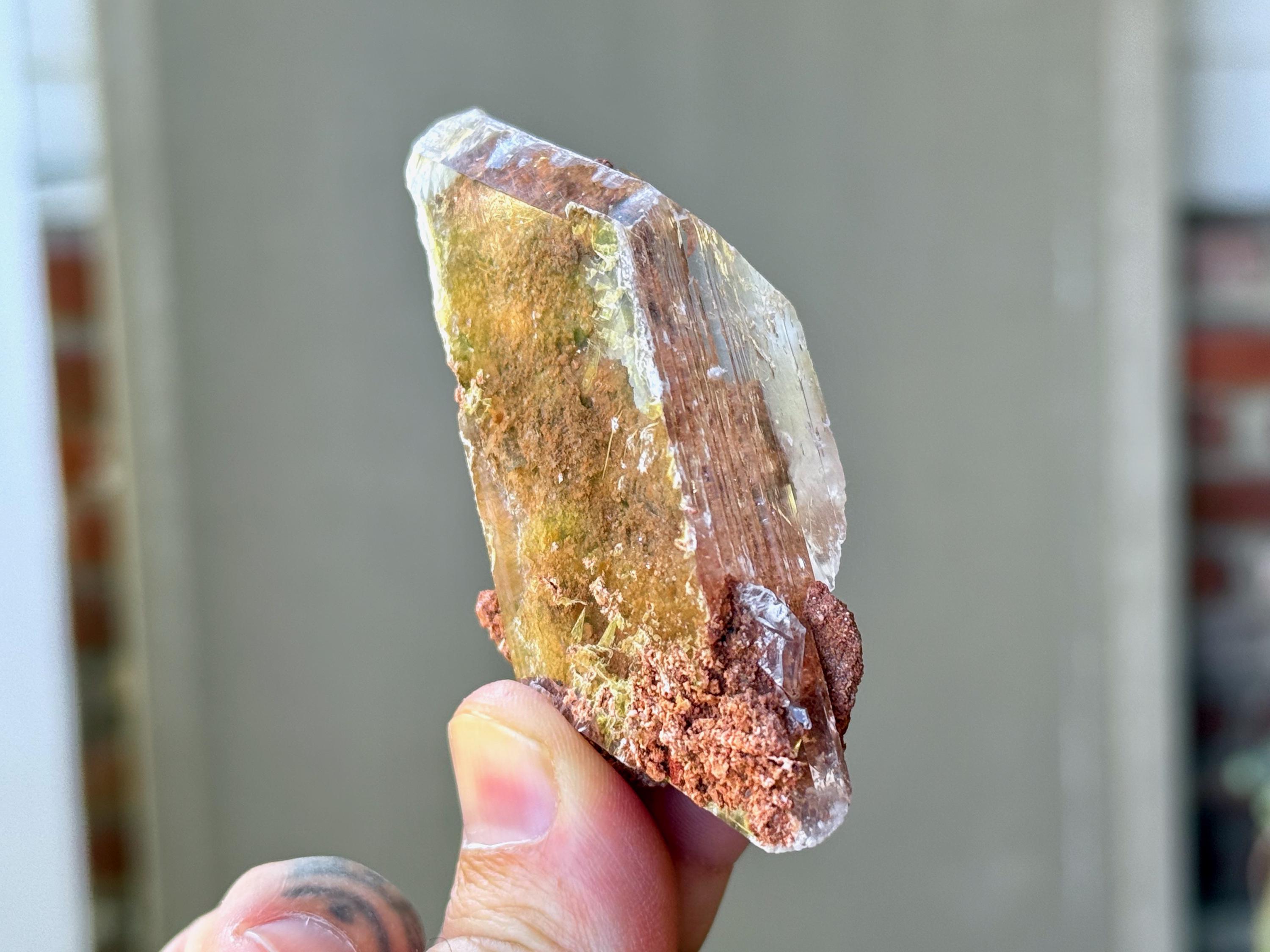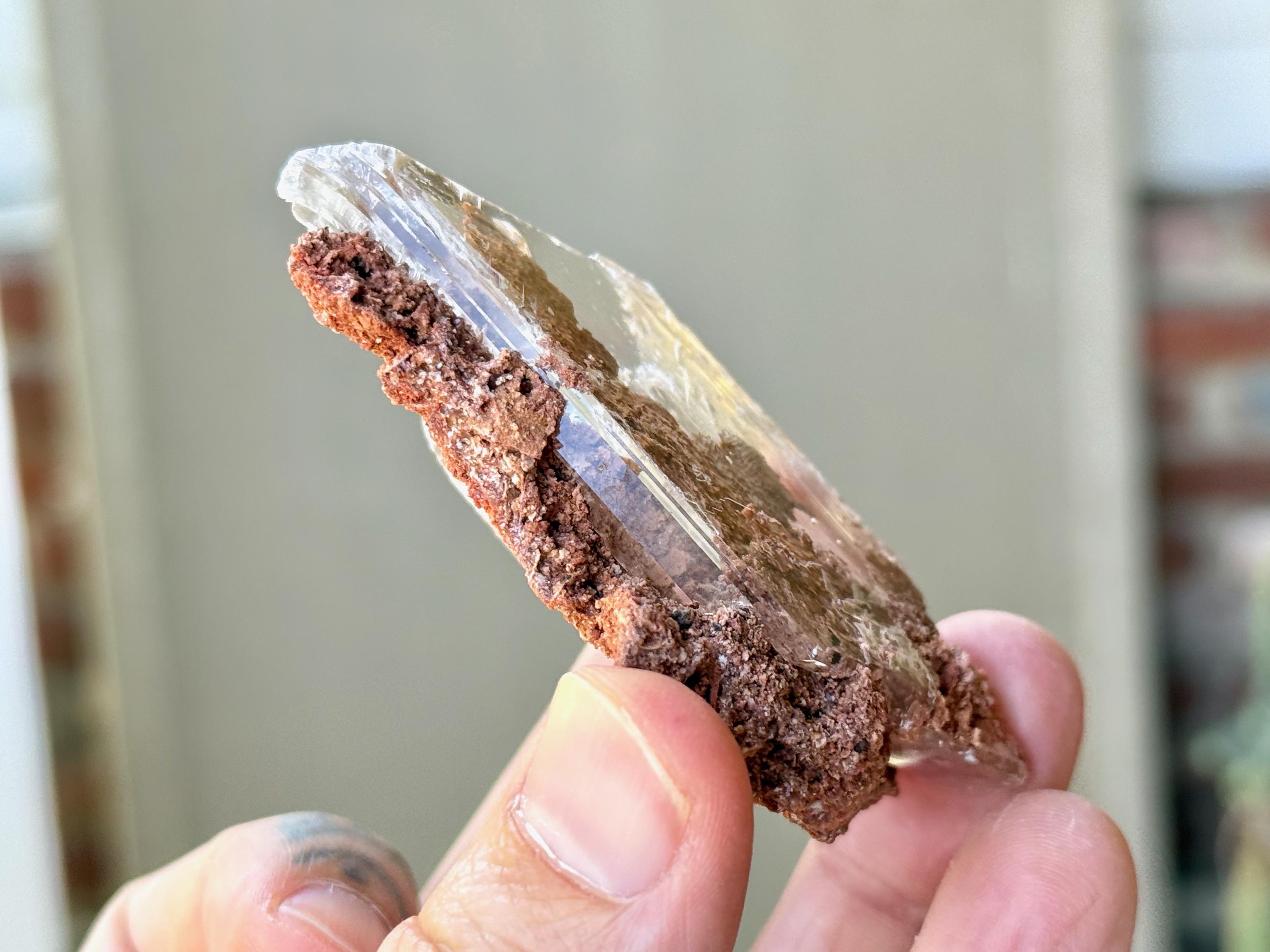 Superb luster and water-clear clarity to this superb Bermejillo Selenite crystal in a natural rhomboid formation. This crystal is filled with an array of orange matrix that we see both inside and on the exterior in some places.