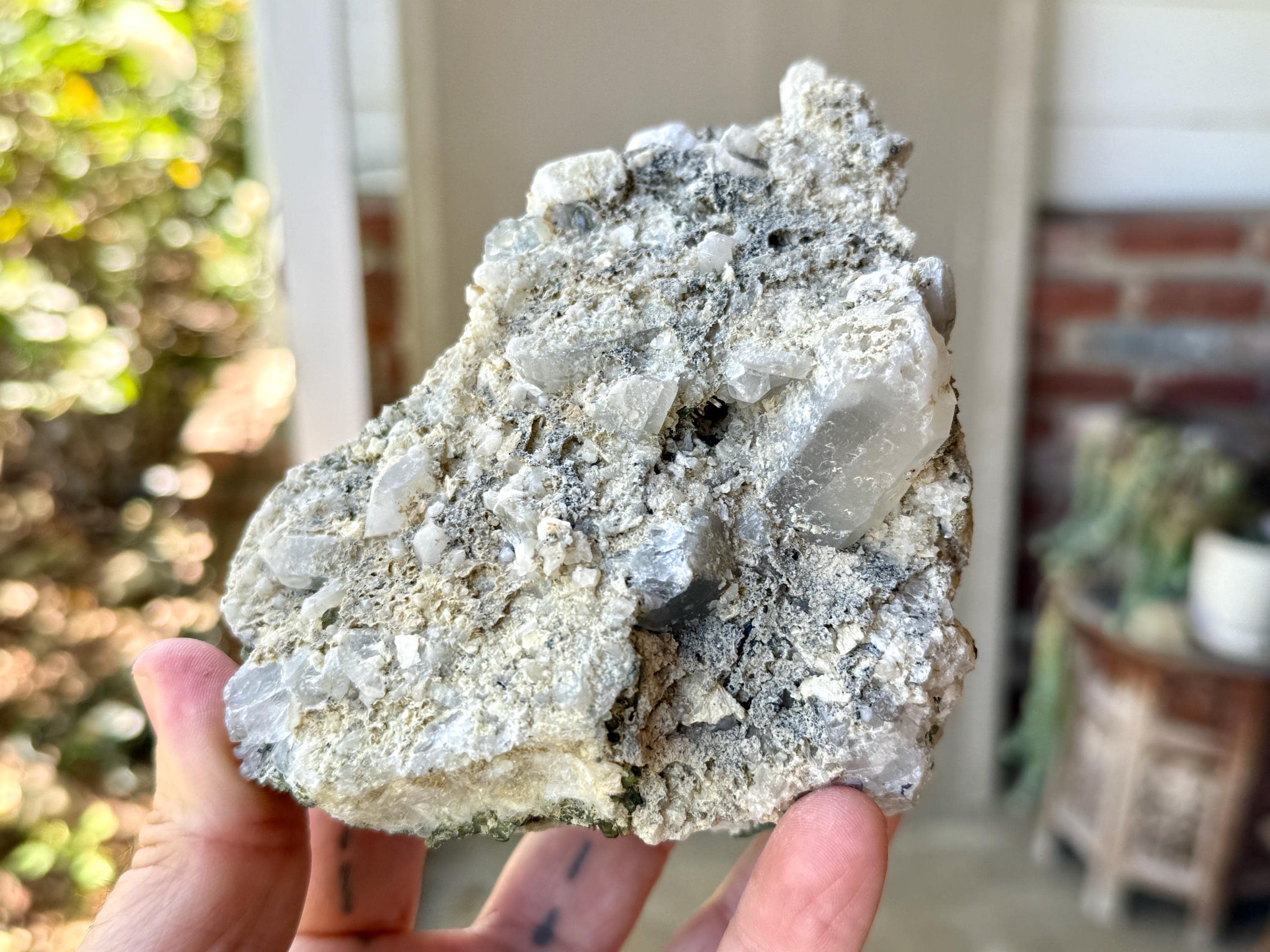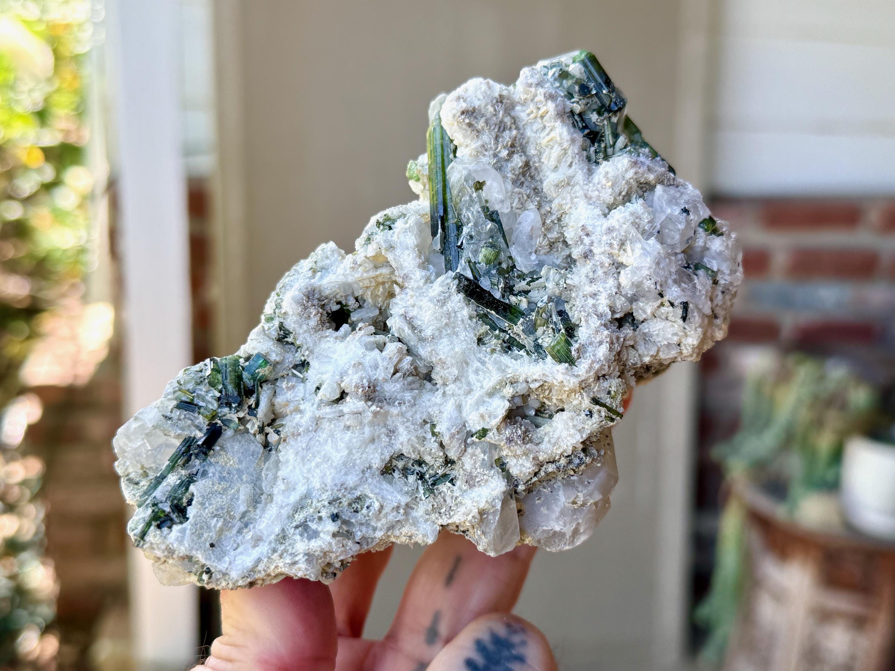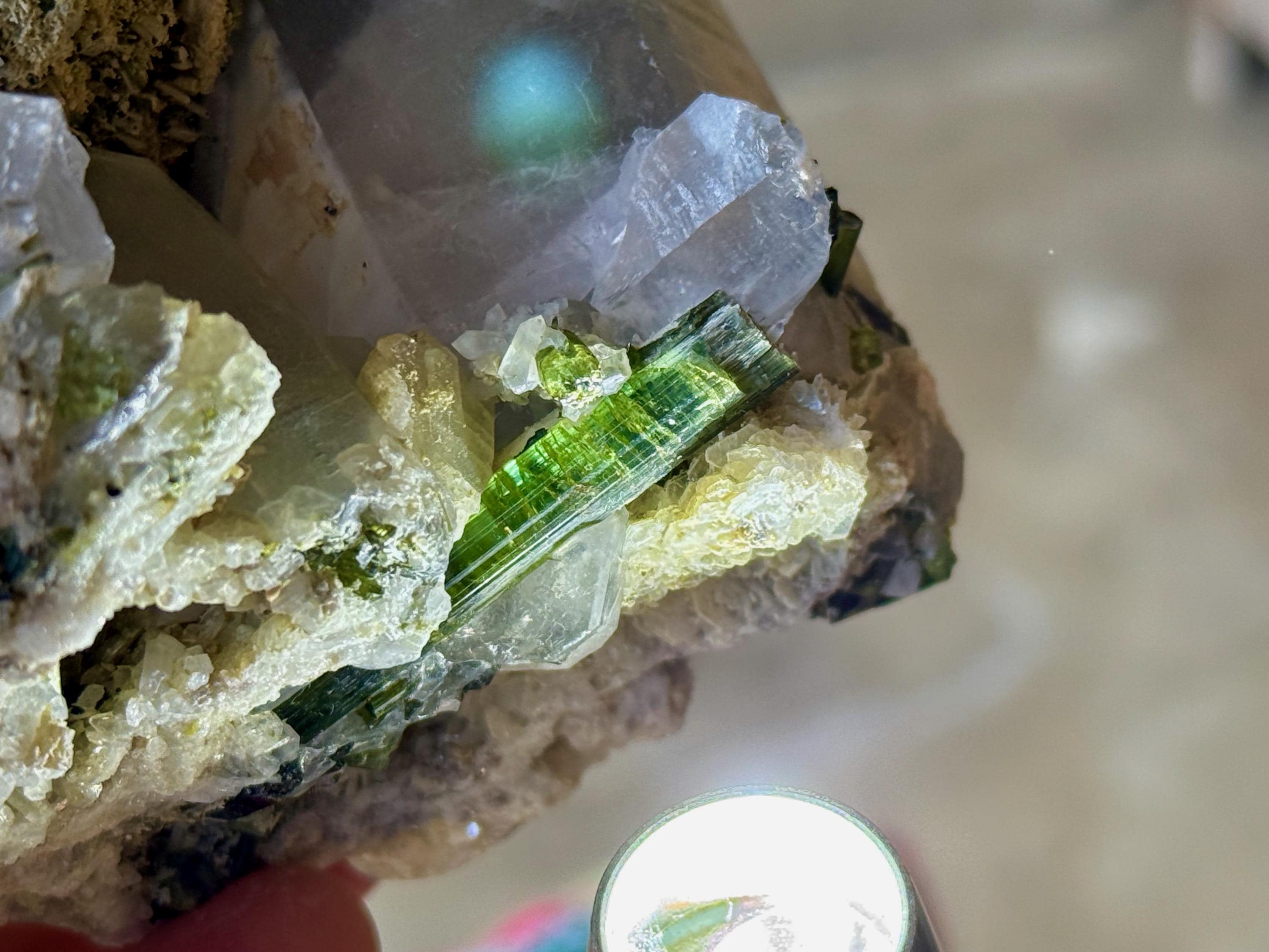What is really striking is the large Green Tourmaline that lies across the top, as well as the fact that the base is completed terminated (Photo 9), making this a Double Terminated crystal! The contrasts of white and green are stunning and the entire piece is just a joy to look at. A really special piece from this rare locale.