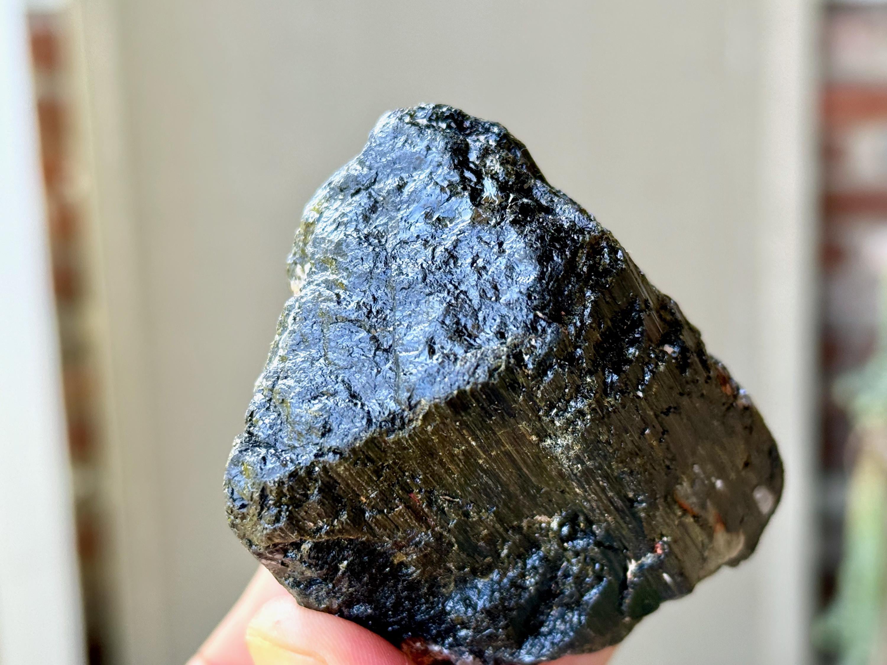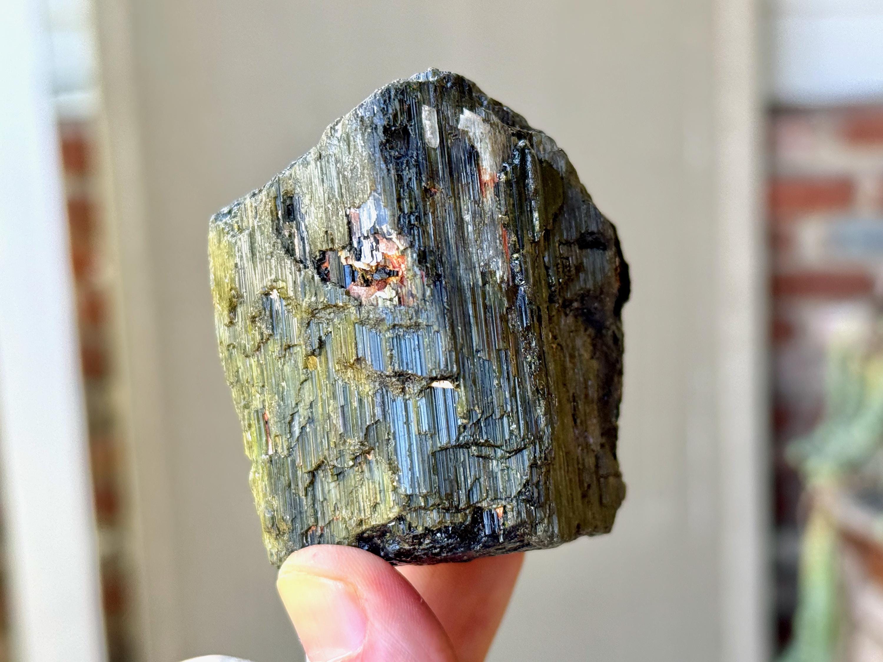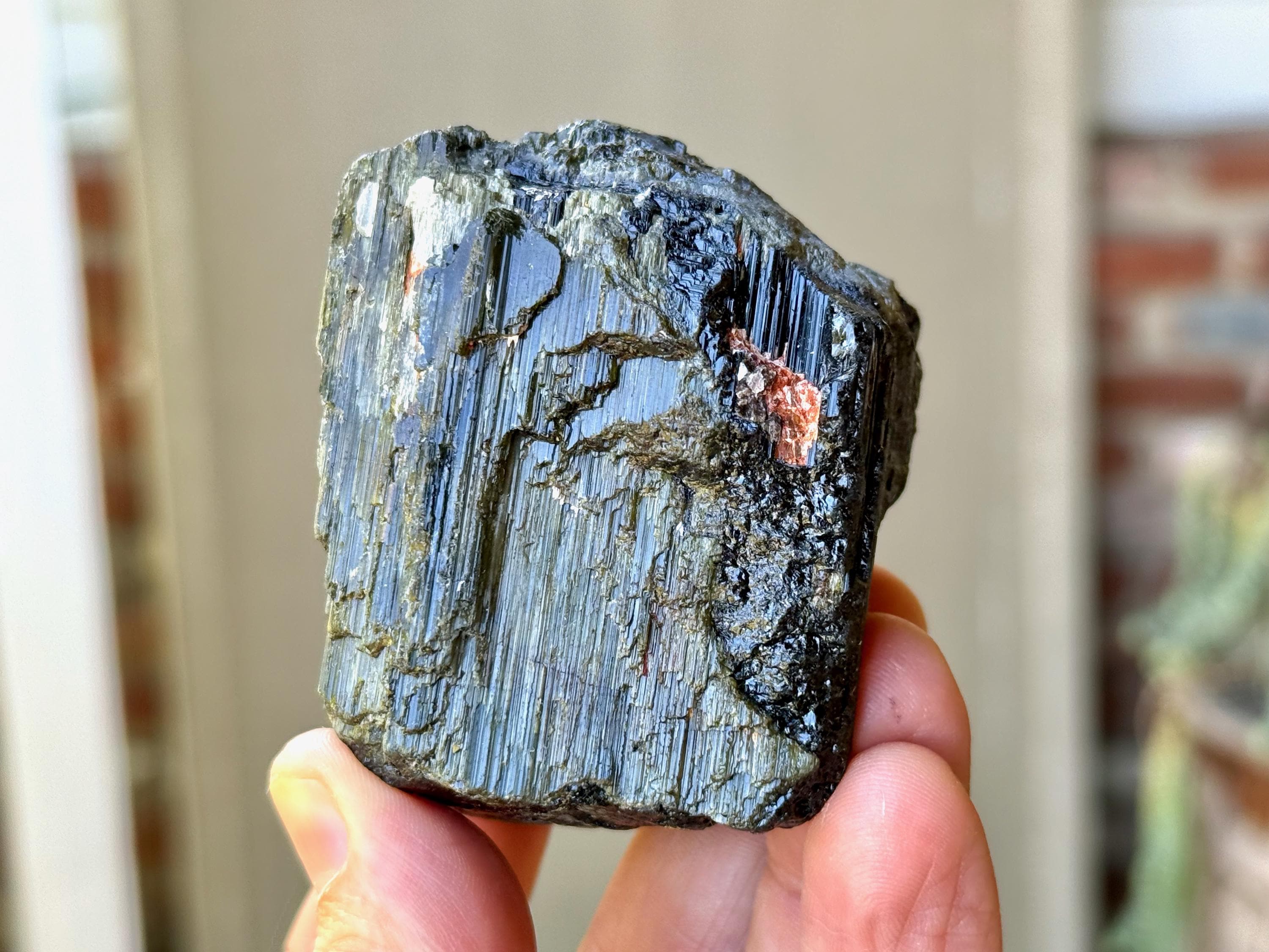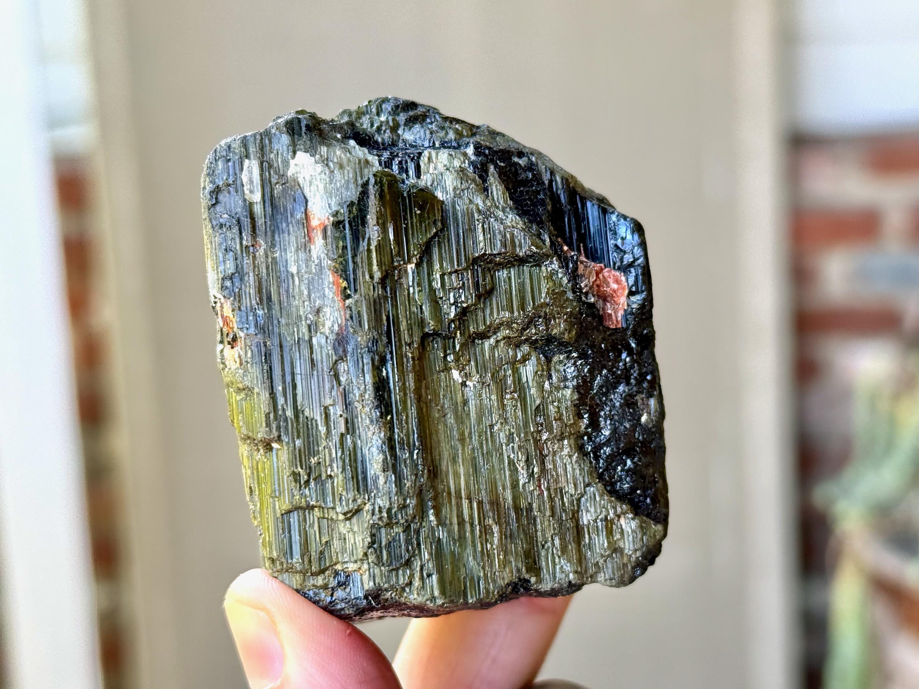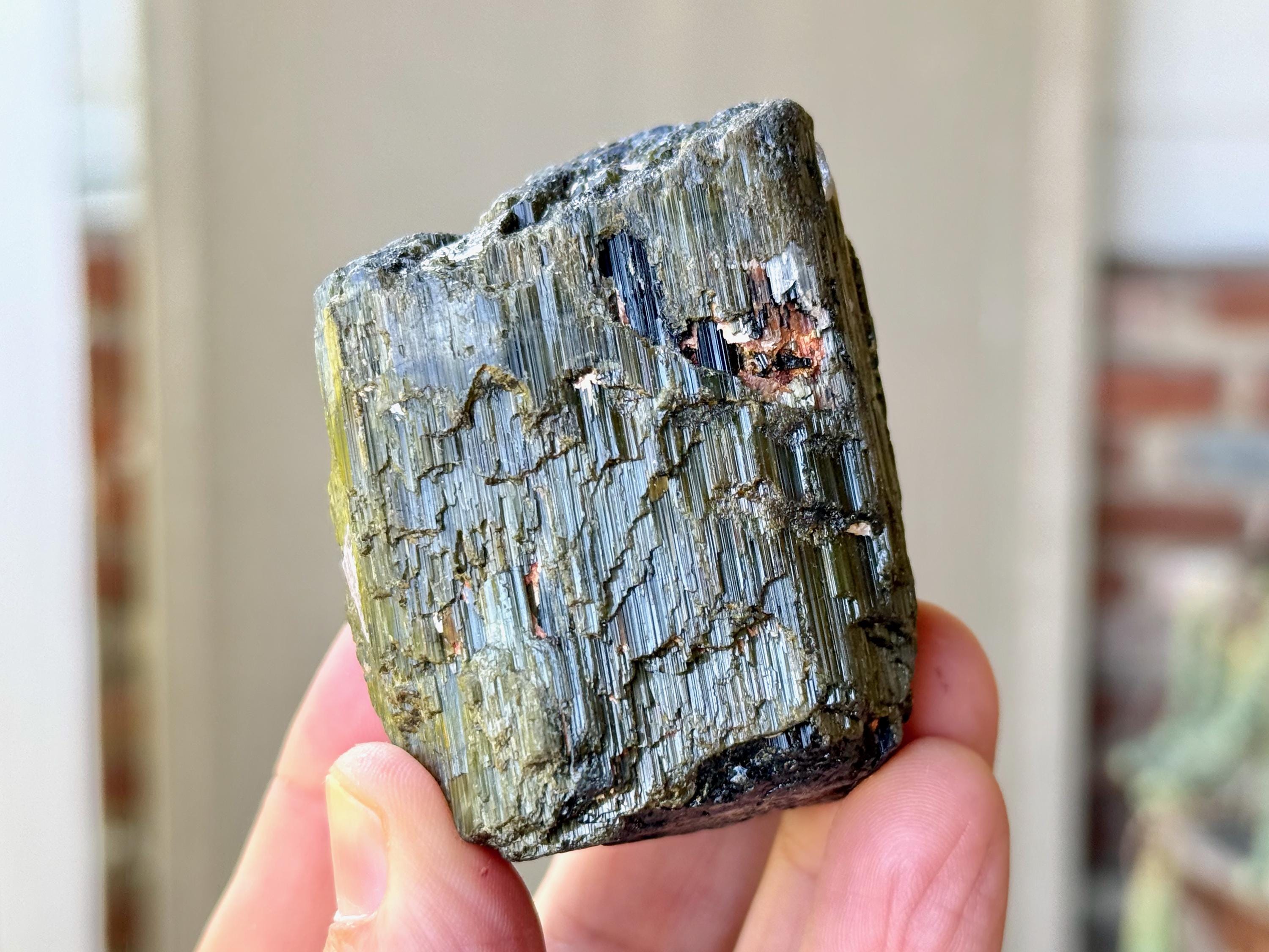 This crystal is characteristic of the crystals from this particular locale, where the core is Black Tourmaline and the overgrowth is a lovely iridescent Green Tourmaline. The luster is wonderful and the formation is super nice as well, with very well-formed ridges and unique etched textures.