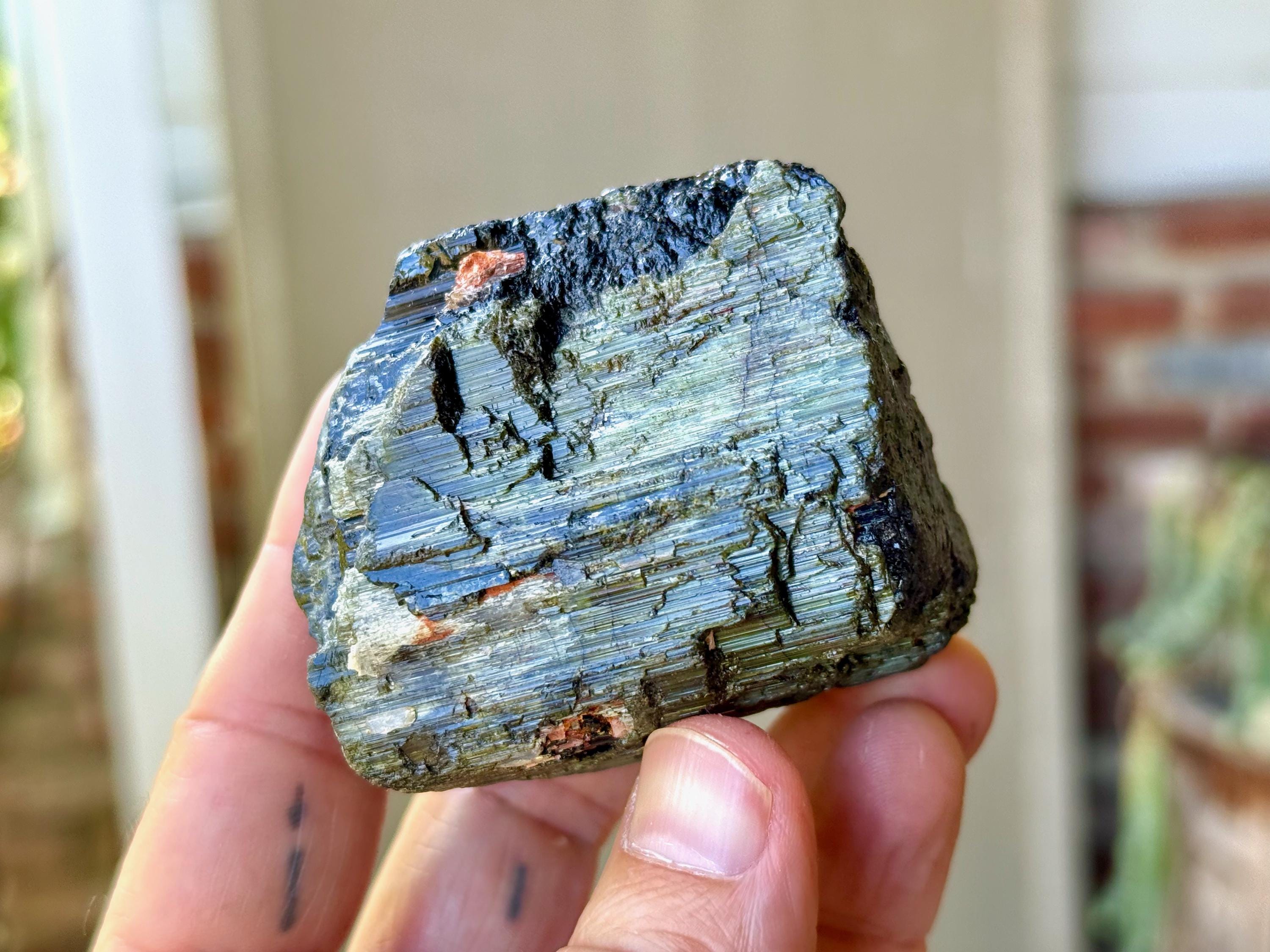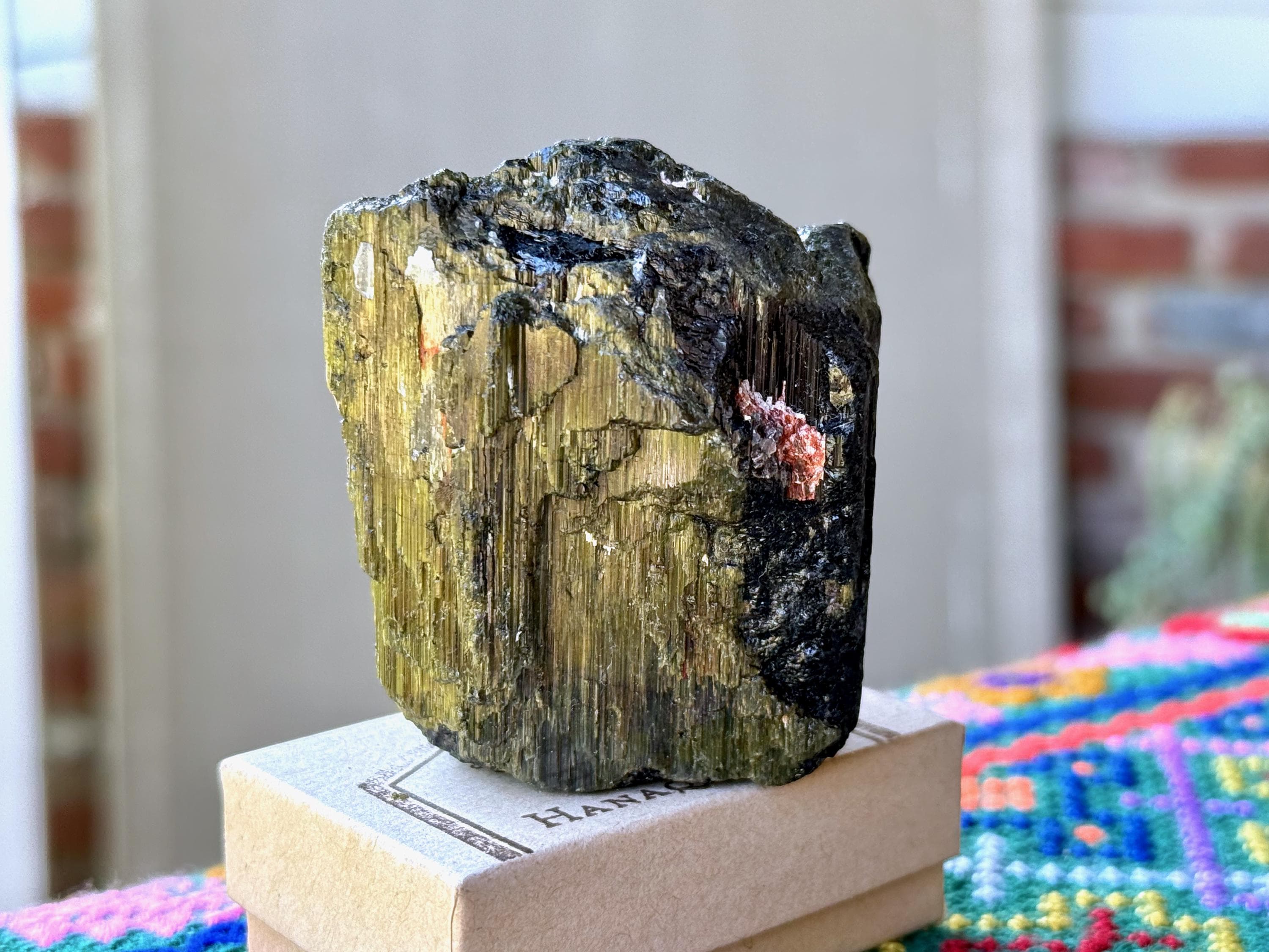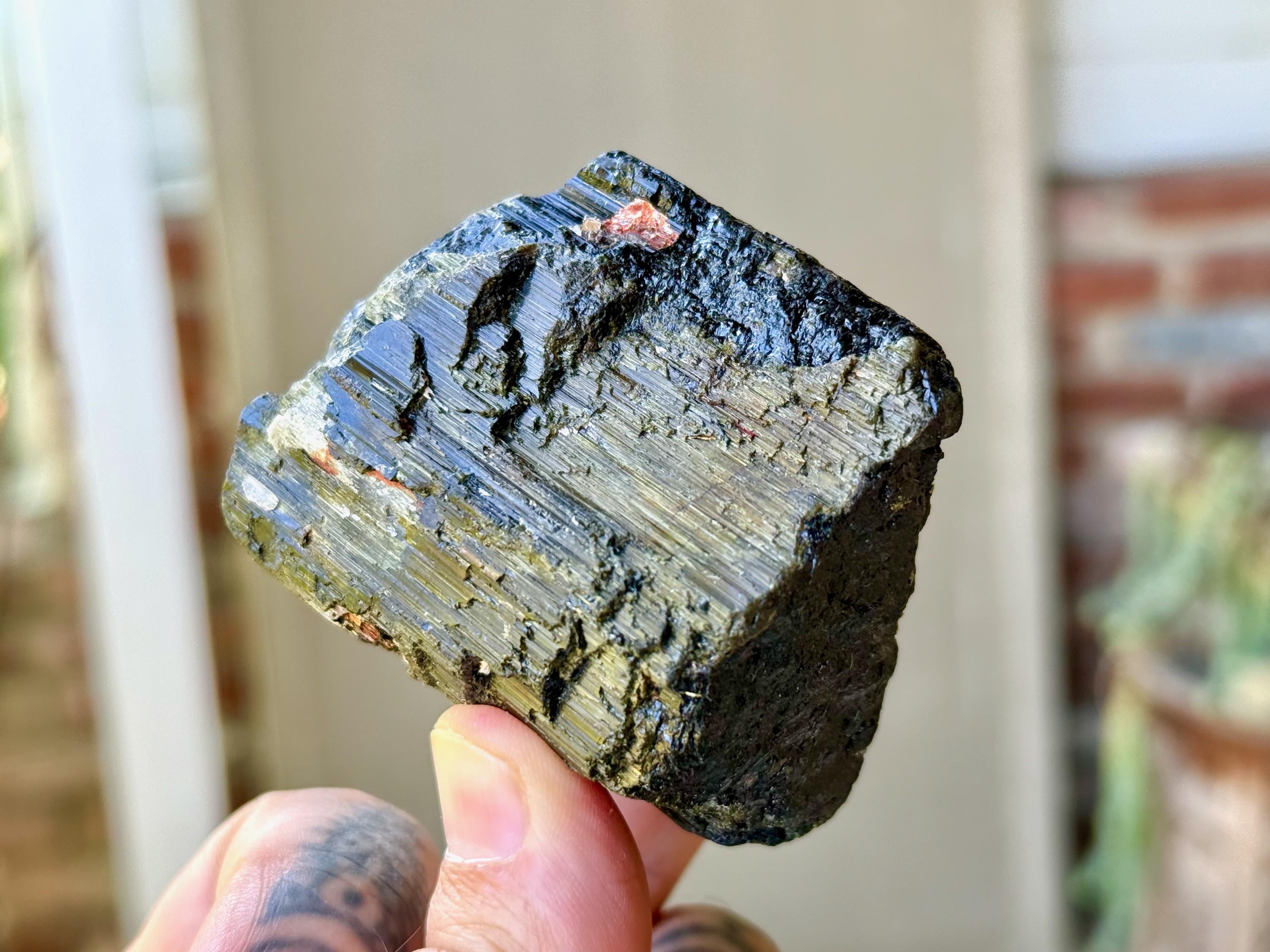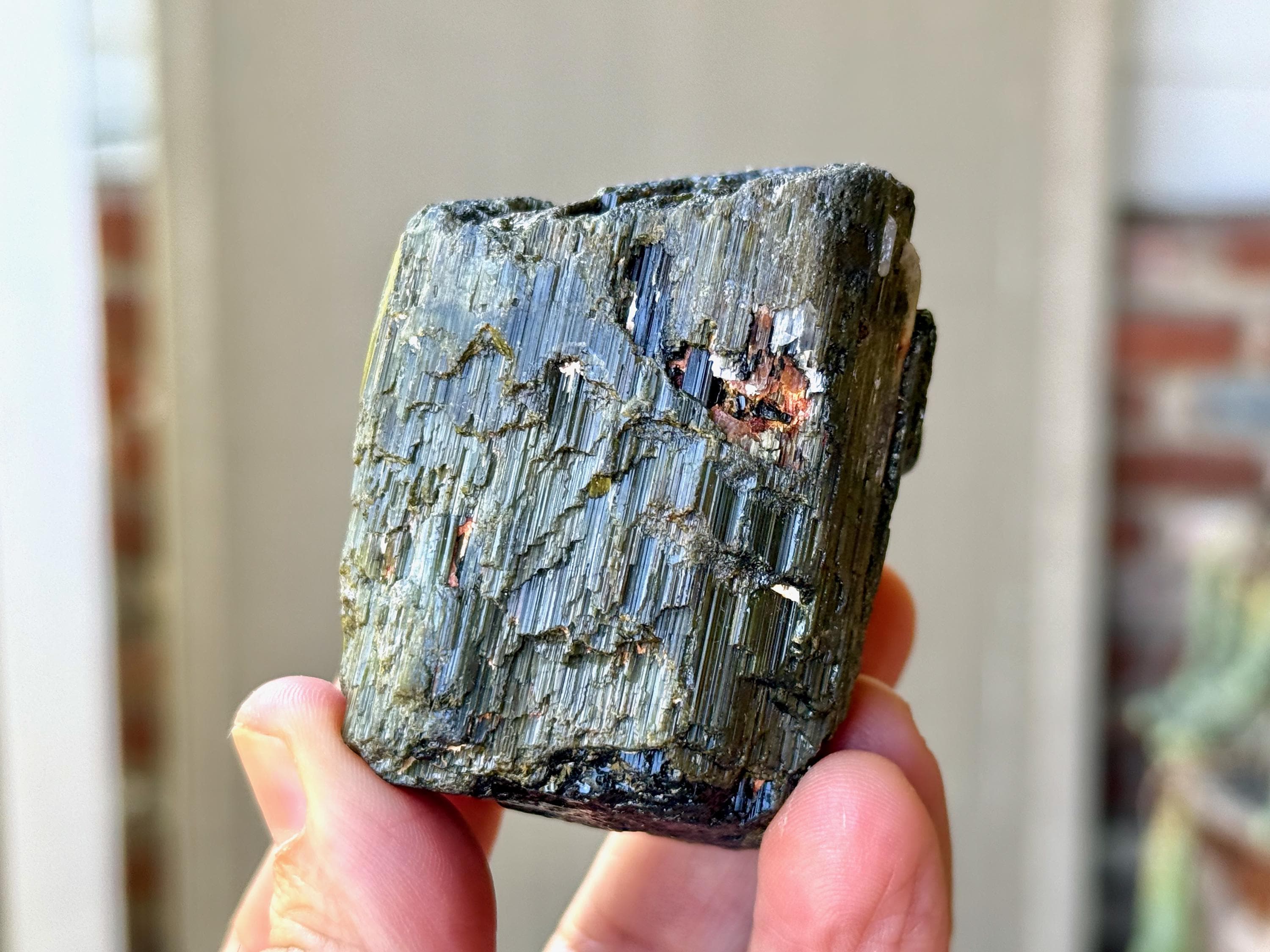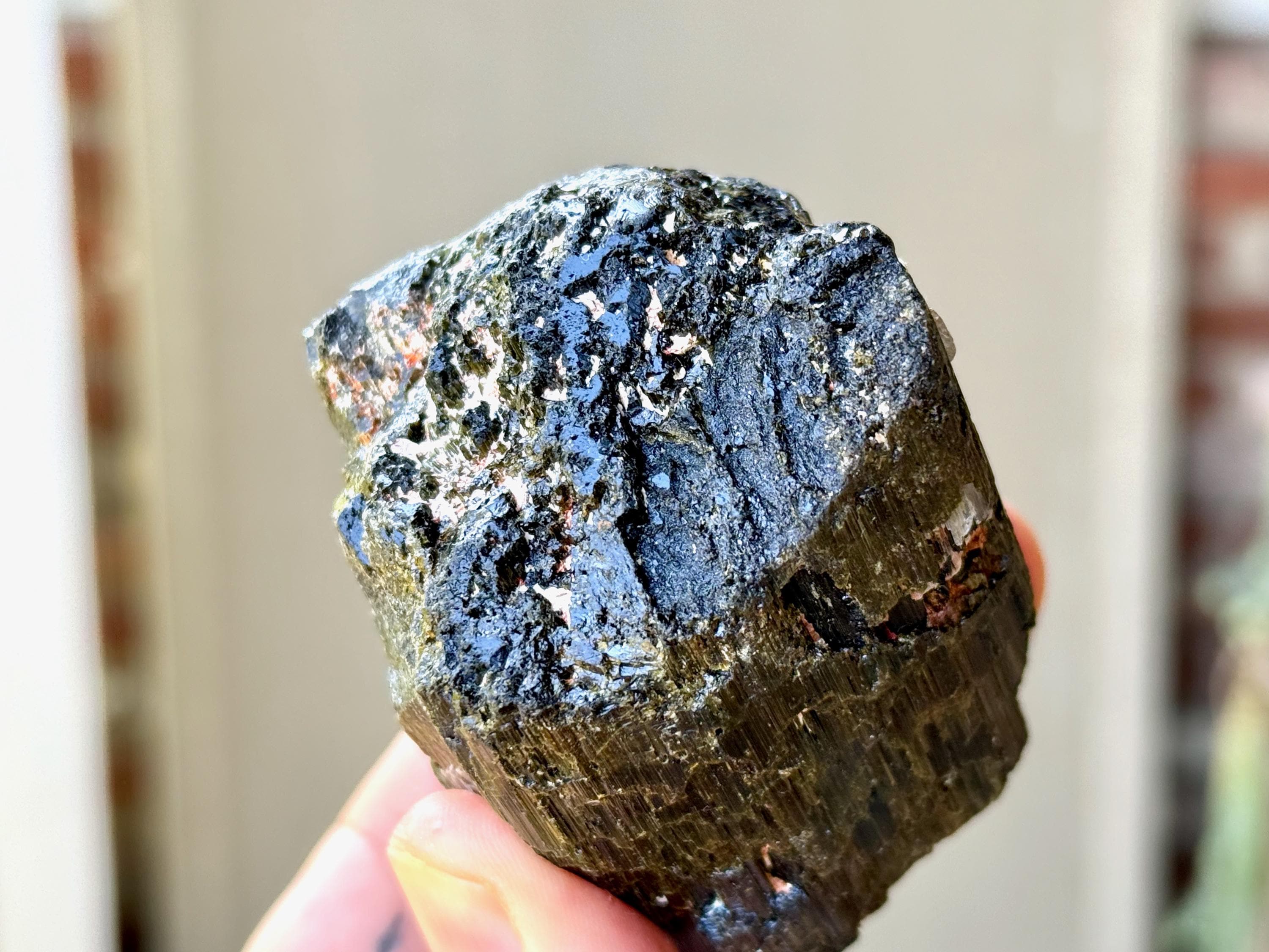 This crystal is characteristic of the crystals from this particular locale, where the core is Black Tourmaline and the overgrowth is a lovely iridescent Green Tourmaline. The luster is wonderful and the formation is super nice as well, with very well-formed ridges and unique etched textures.