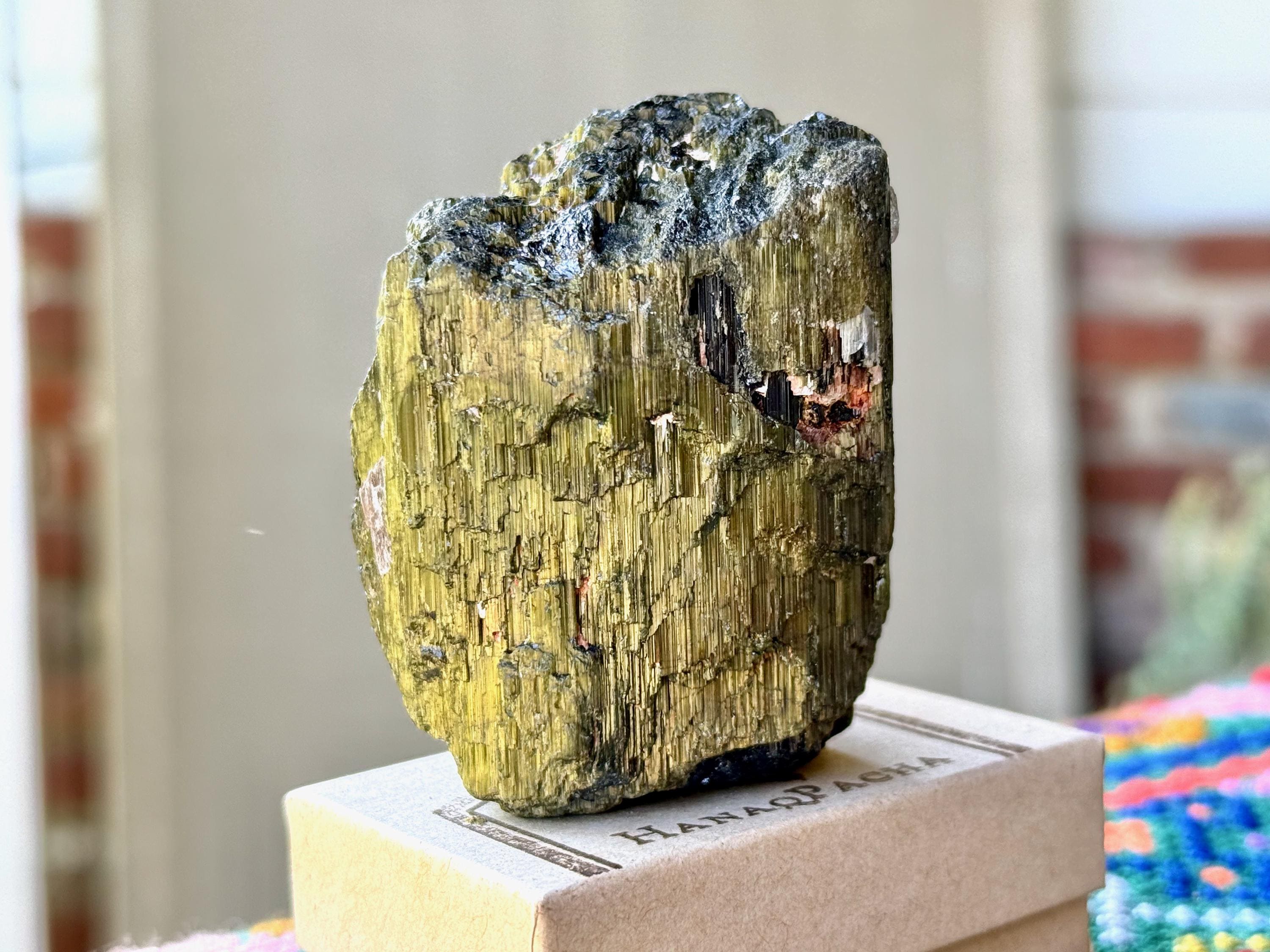 Such a gentle giant of a Green Tourmaline! Weighing well over half a pound, this is a substantial crystal with some beautiful "cat's eye" iridescence.