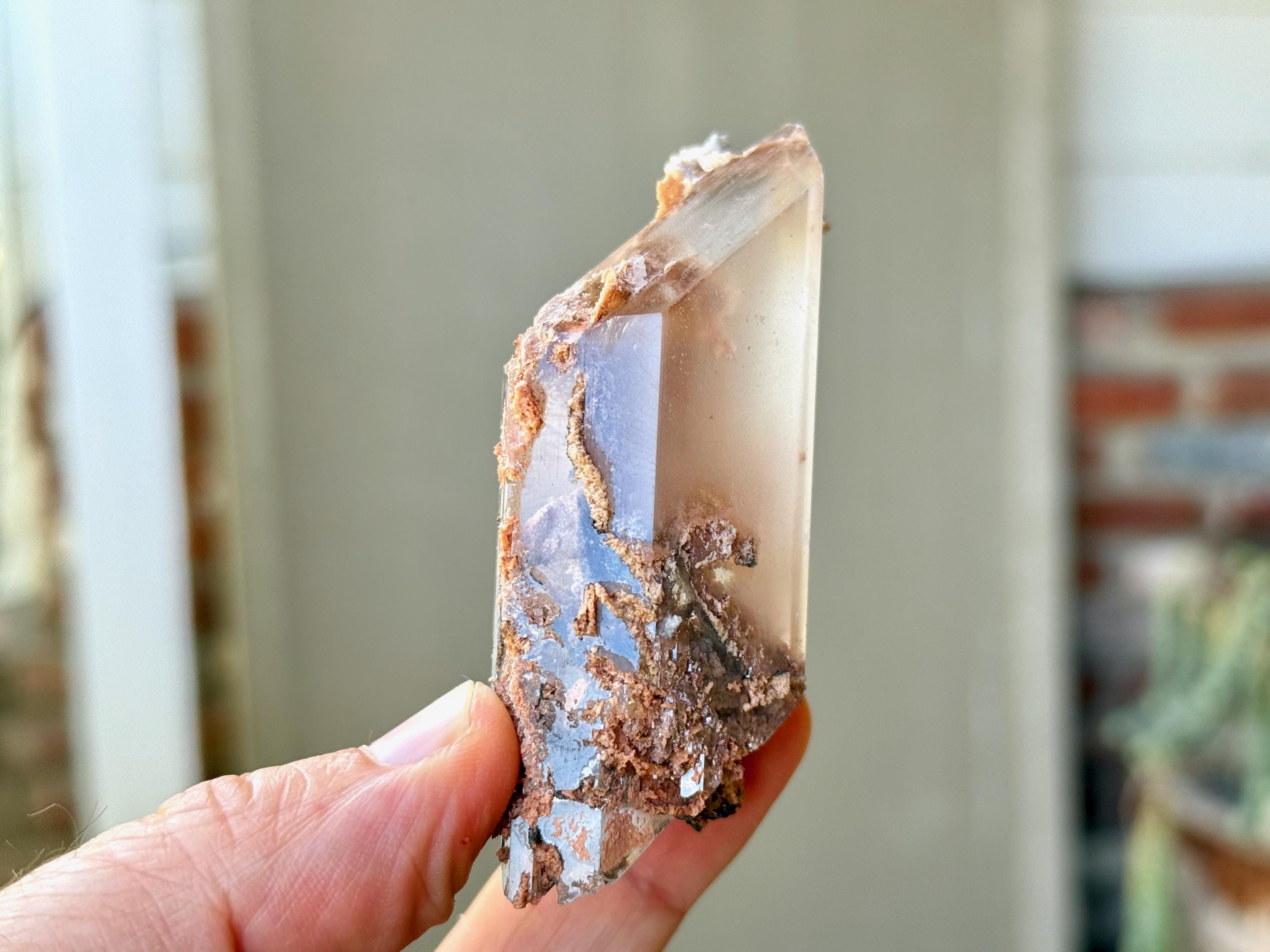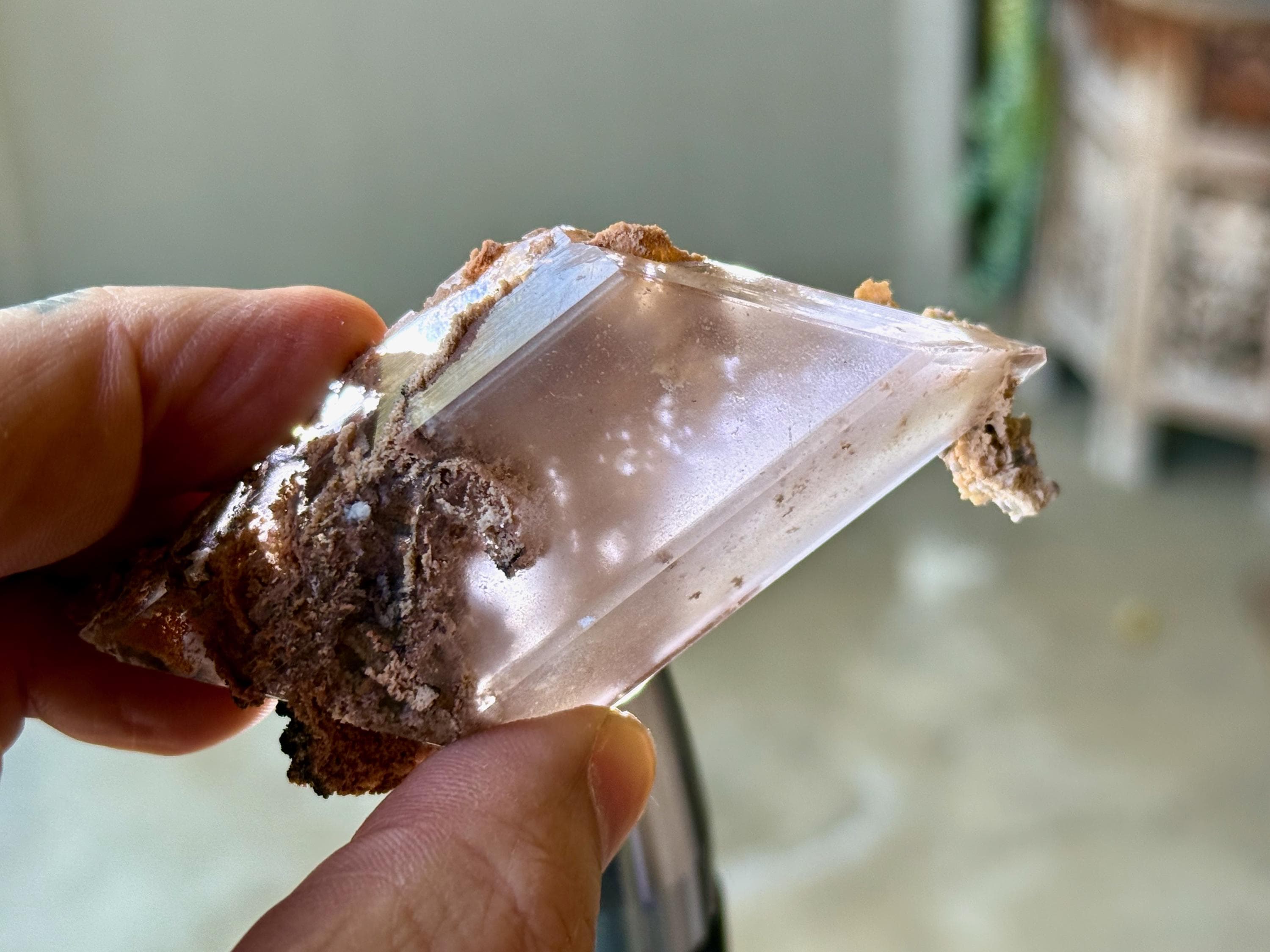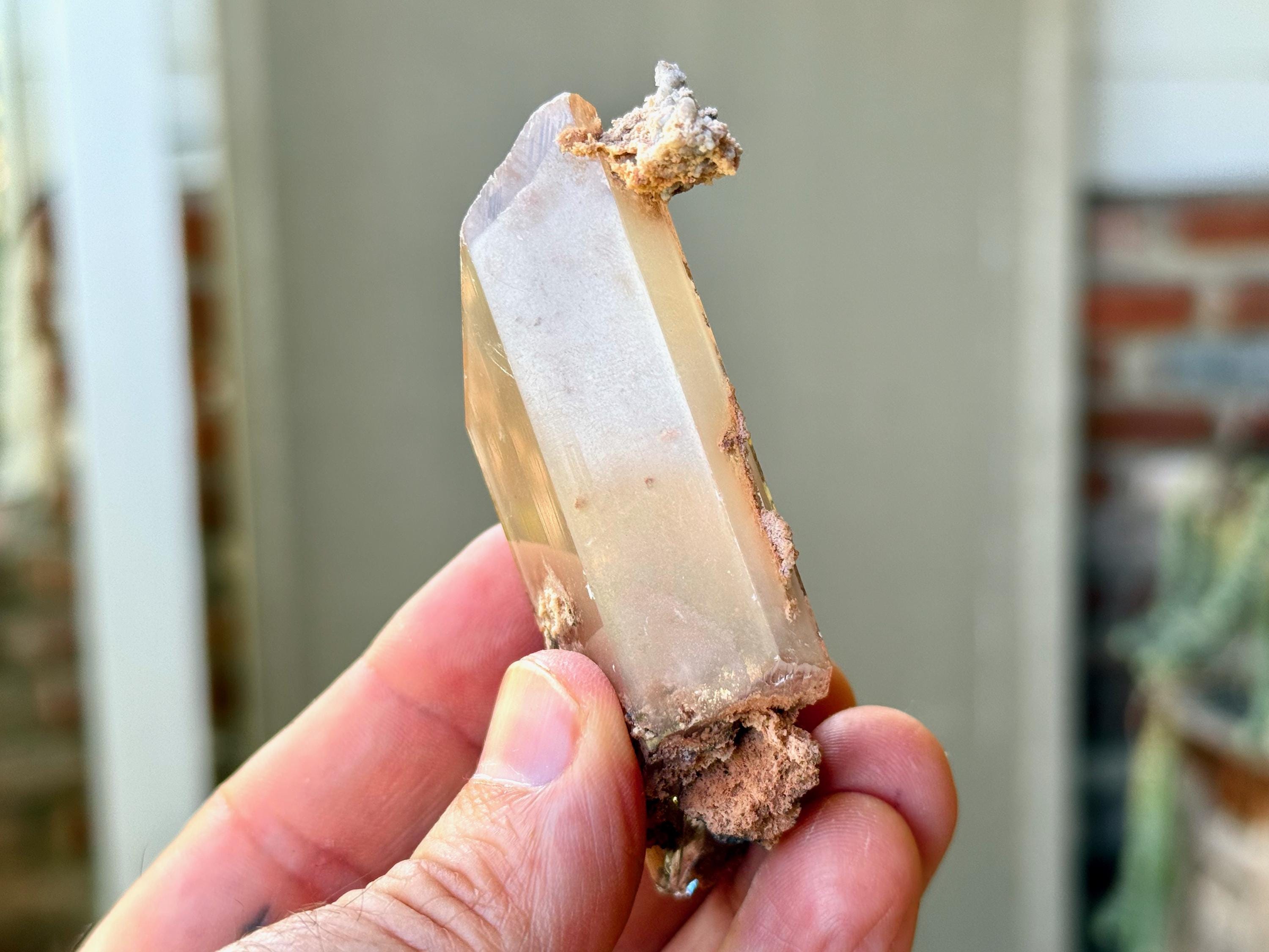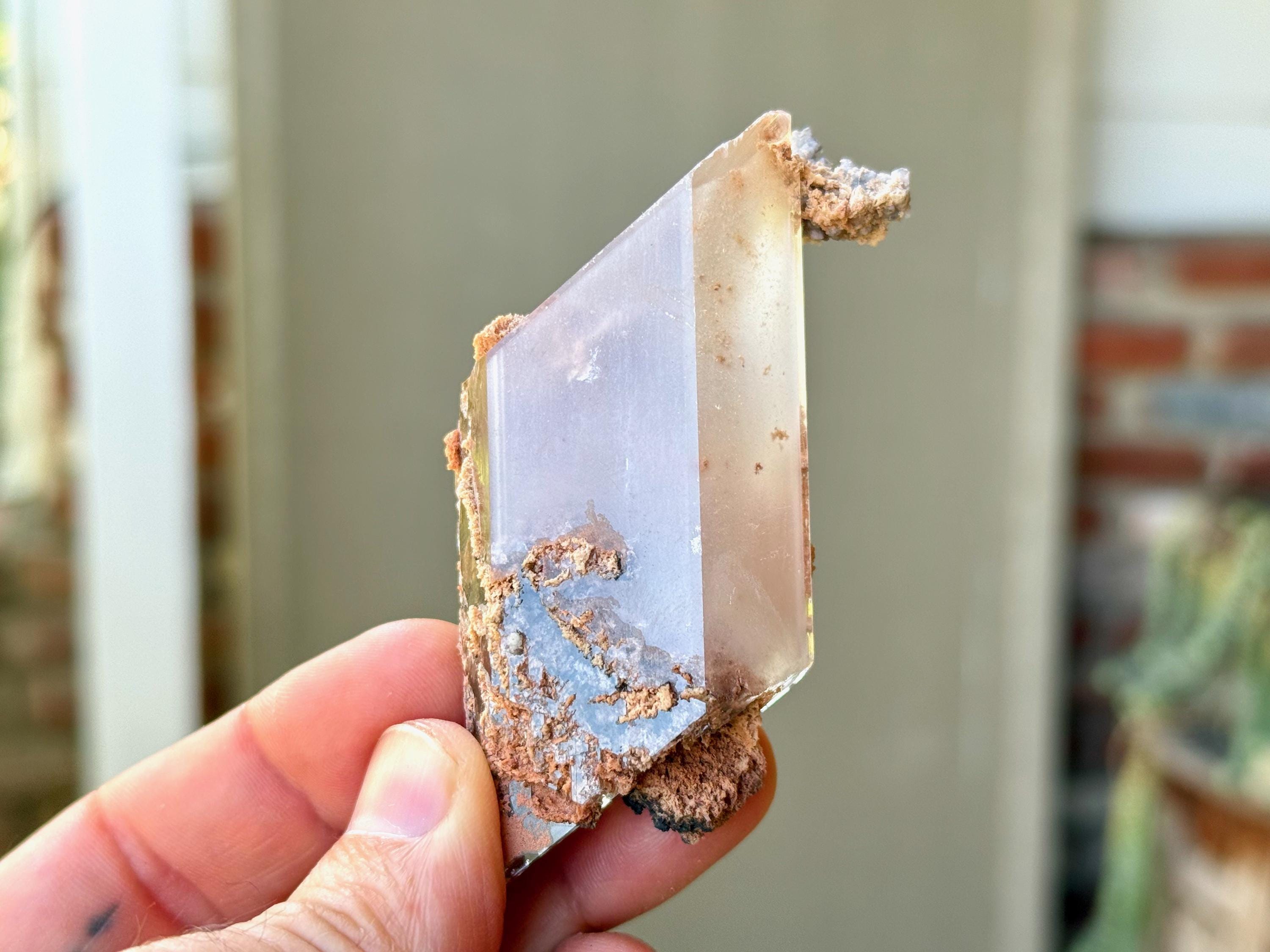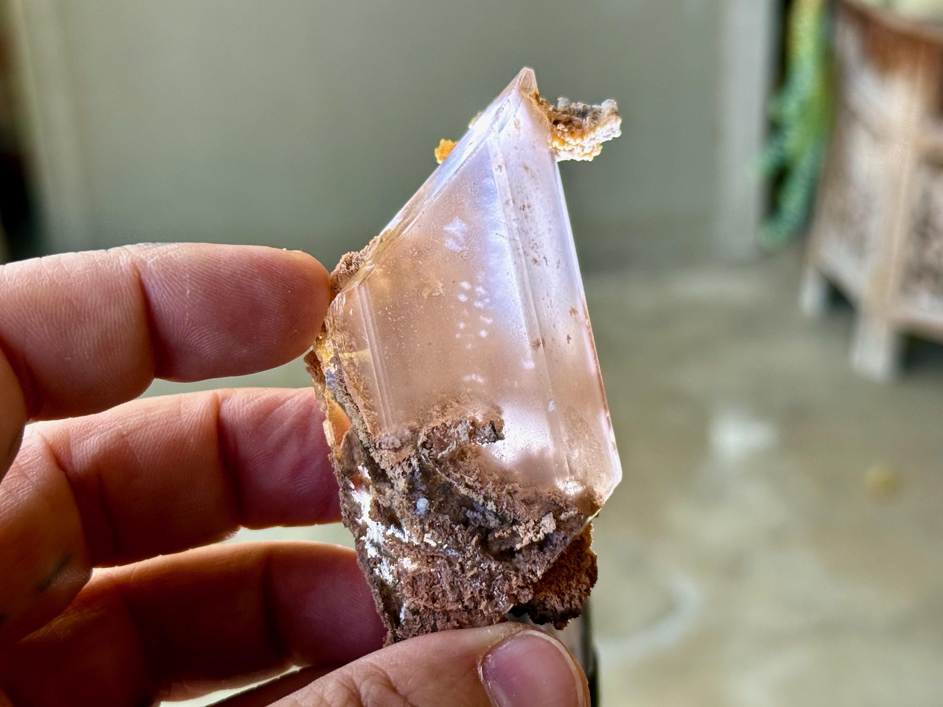 Perfect rhomboid formation to this exquisite Bermejillo Selenites with a glassy complexion and unique combination of clarity and ghostly "haze." It features a unique milky "mist" that we have not seen in other pieces from this collection. Yet, it passes light beautifully when backlit (Photos 4-6).