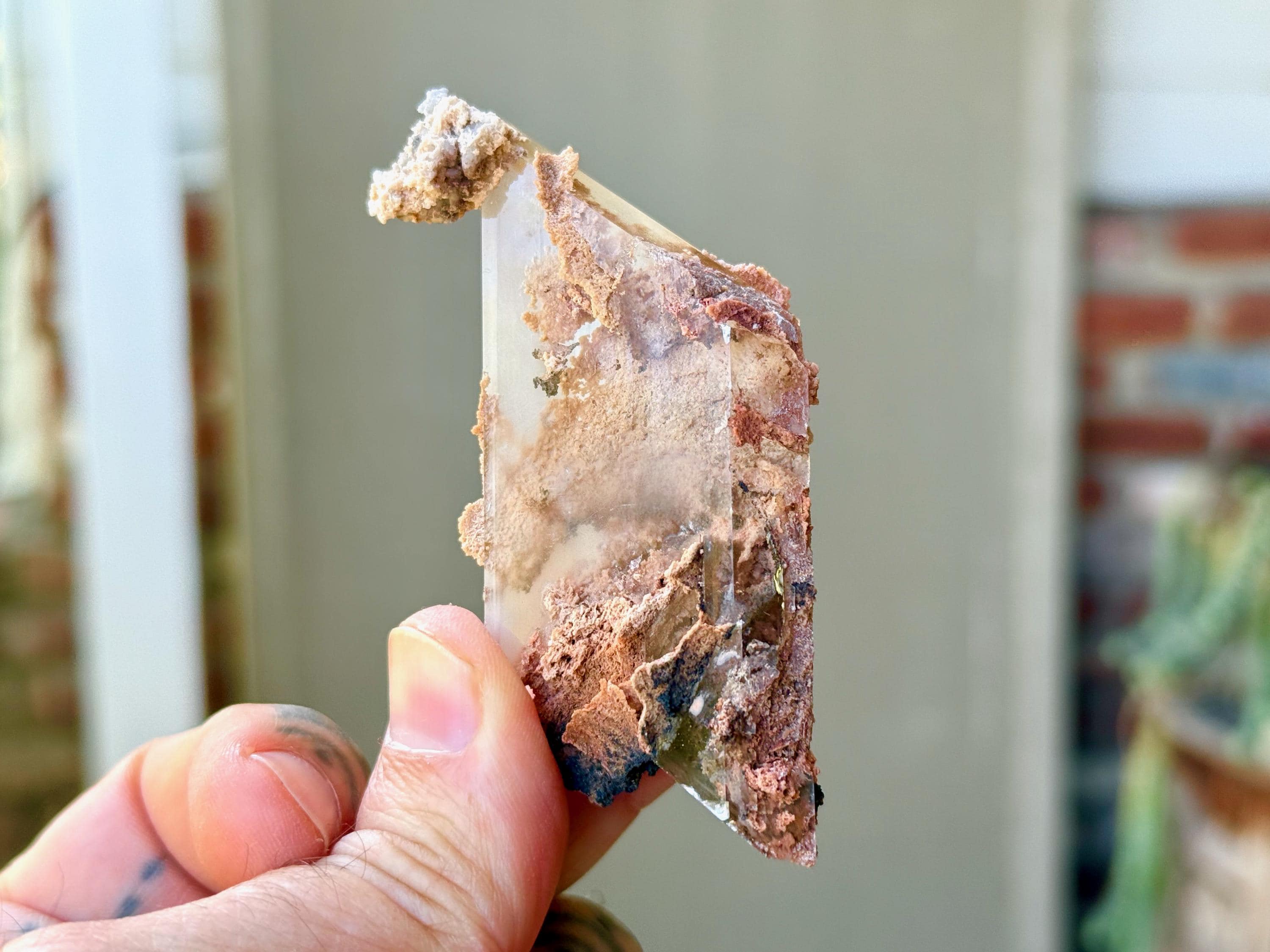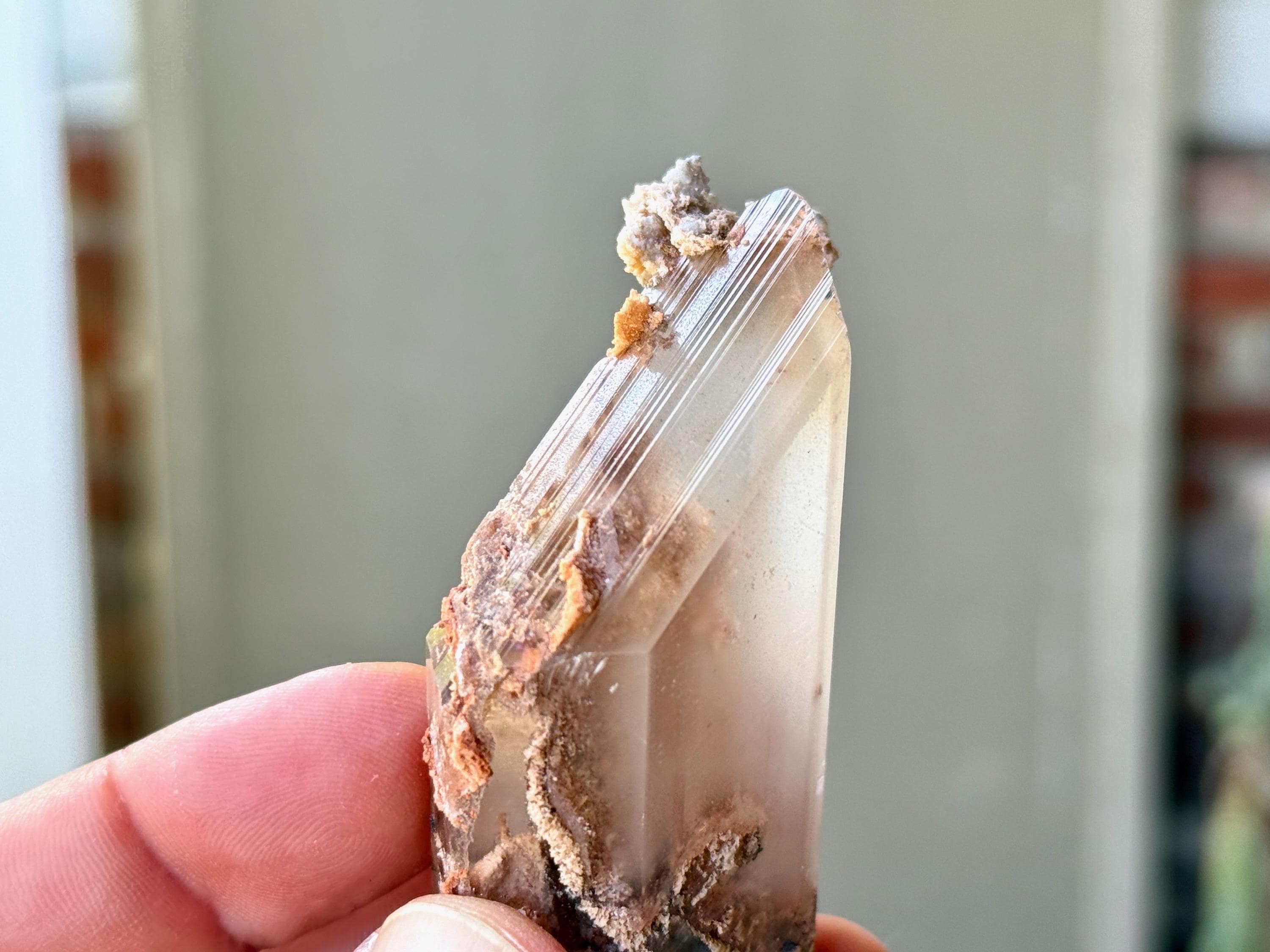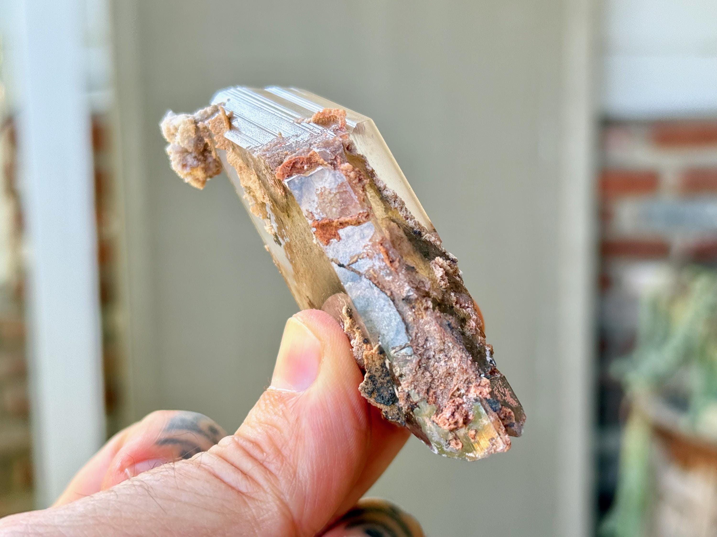 This piece features some pink and white matrix both inside and on the exterior of the crystal. It's beautifully terminated on both top and bottom, with vertical striations on both edges. Exceptional quality!