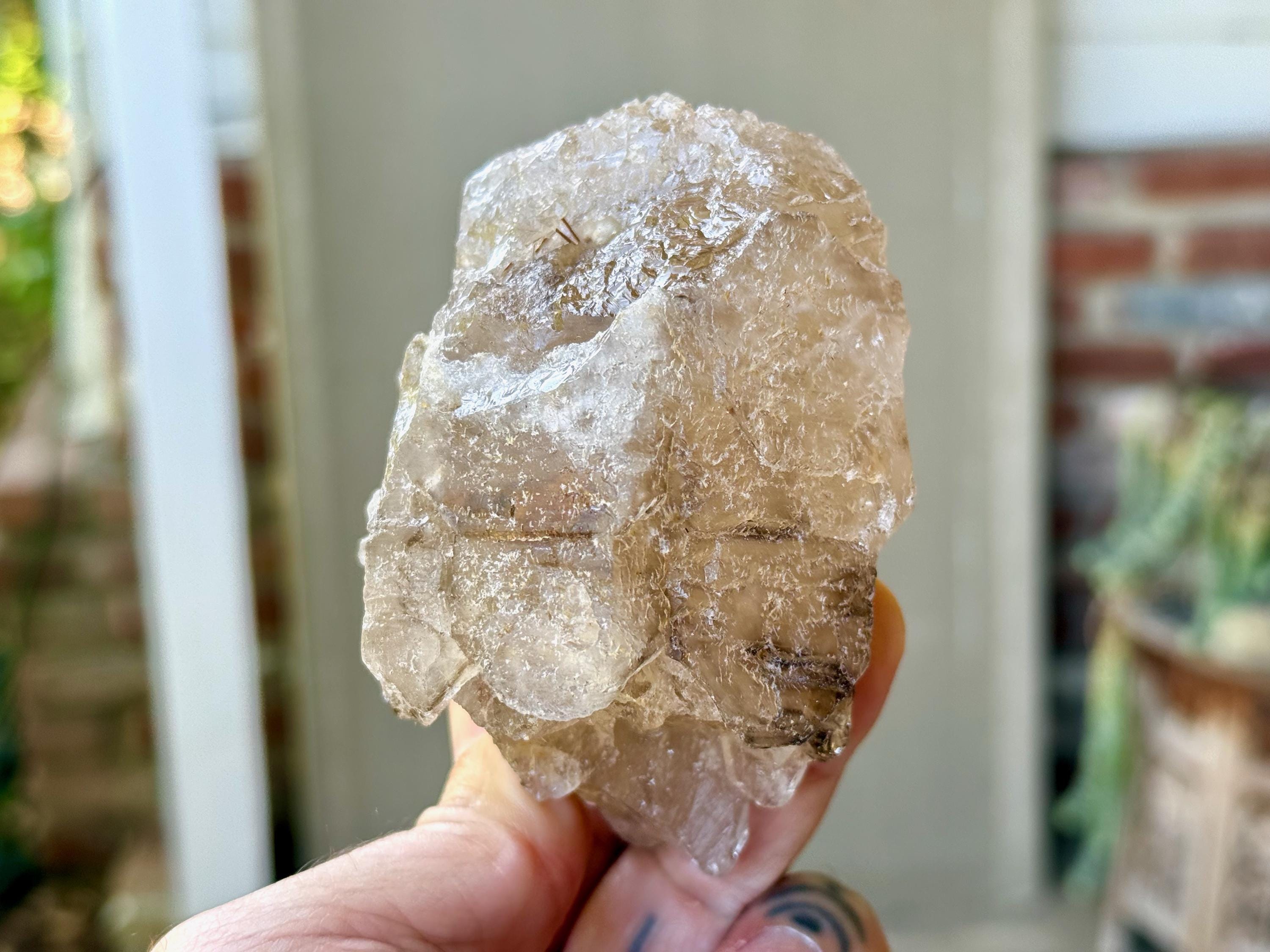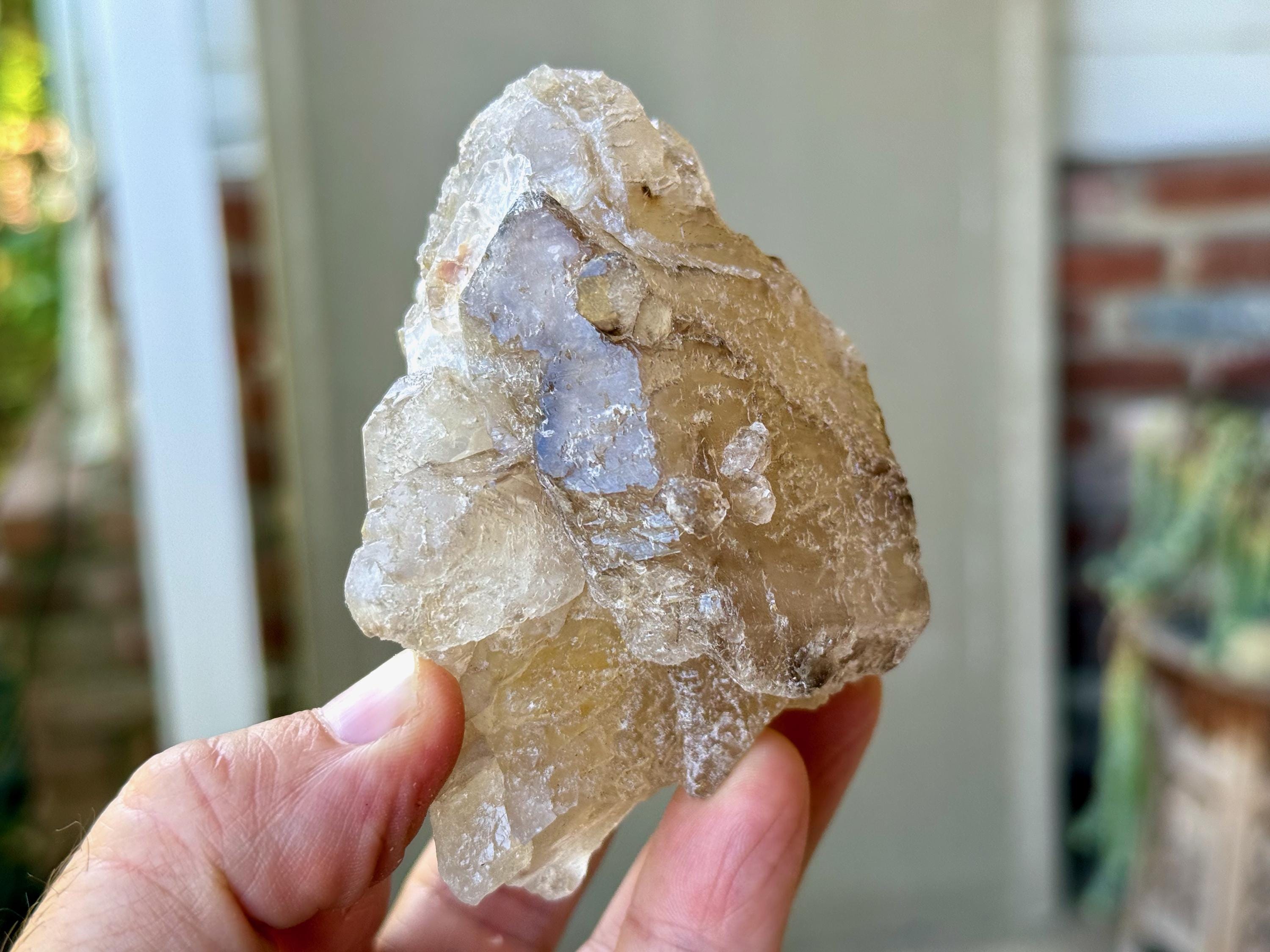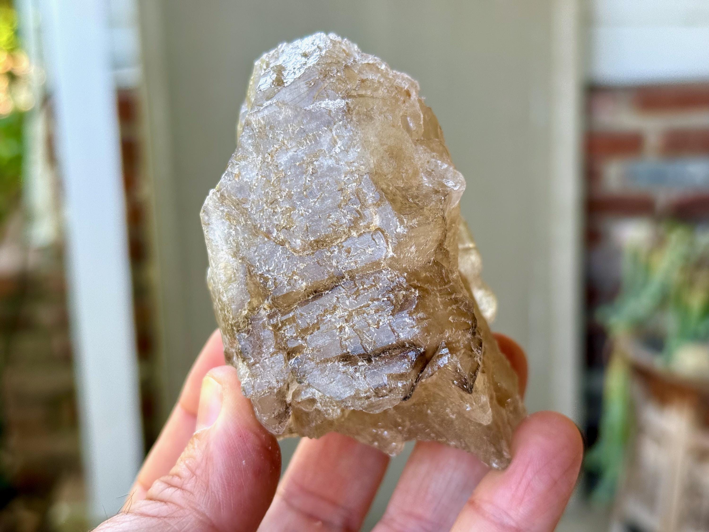 This crystal exhibits a muted golden hue that's gradient with areas that are clear and smoky marbled throughout. When backlit, as in Photos 3-6, we can see just how brilliantly it lights up.