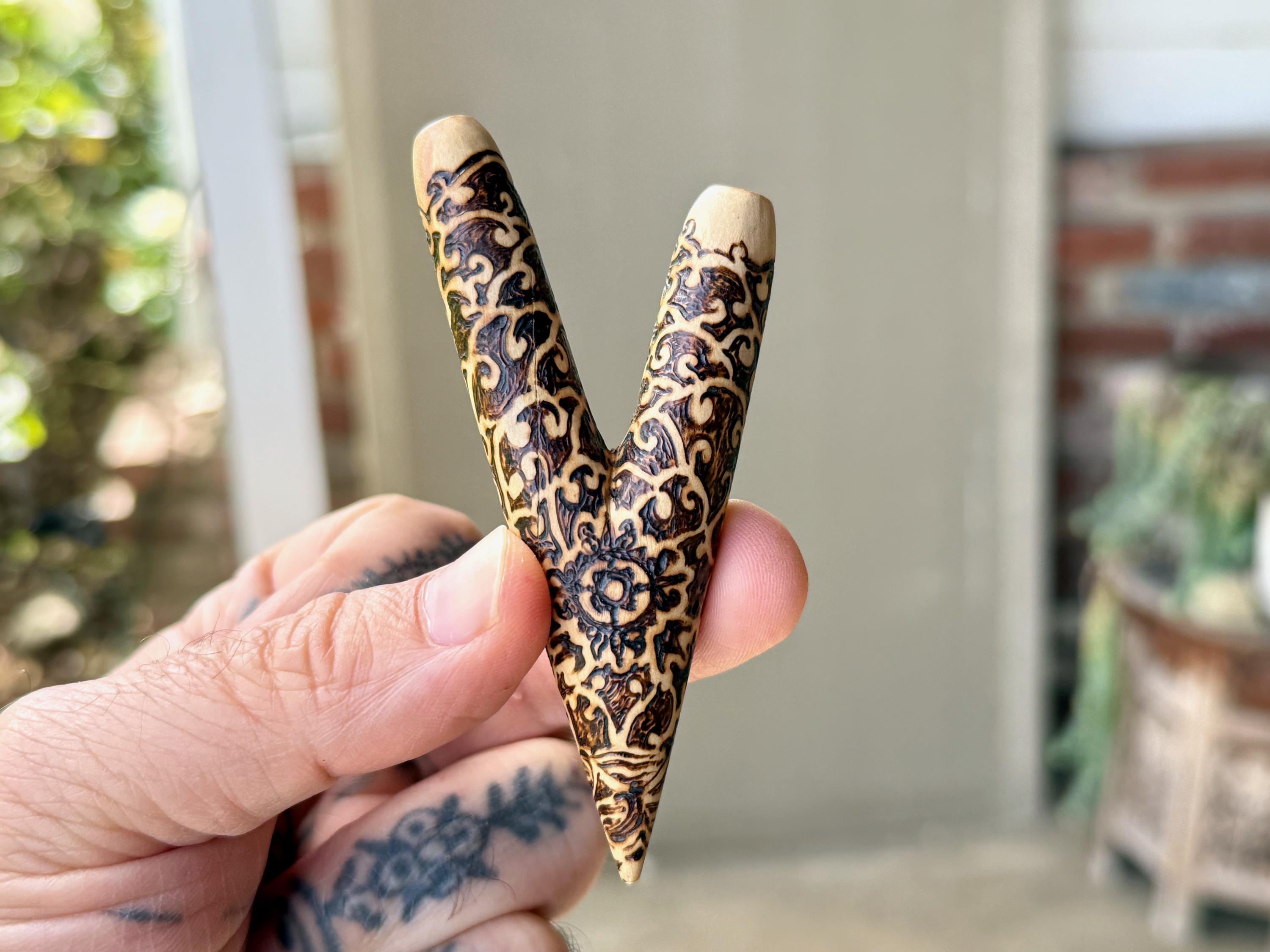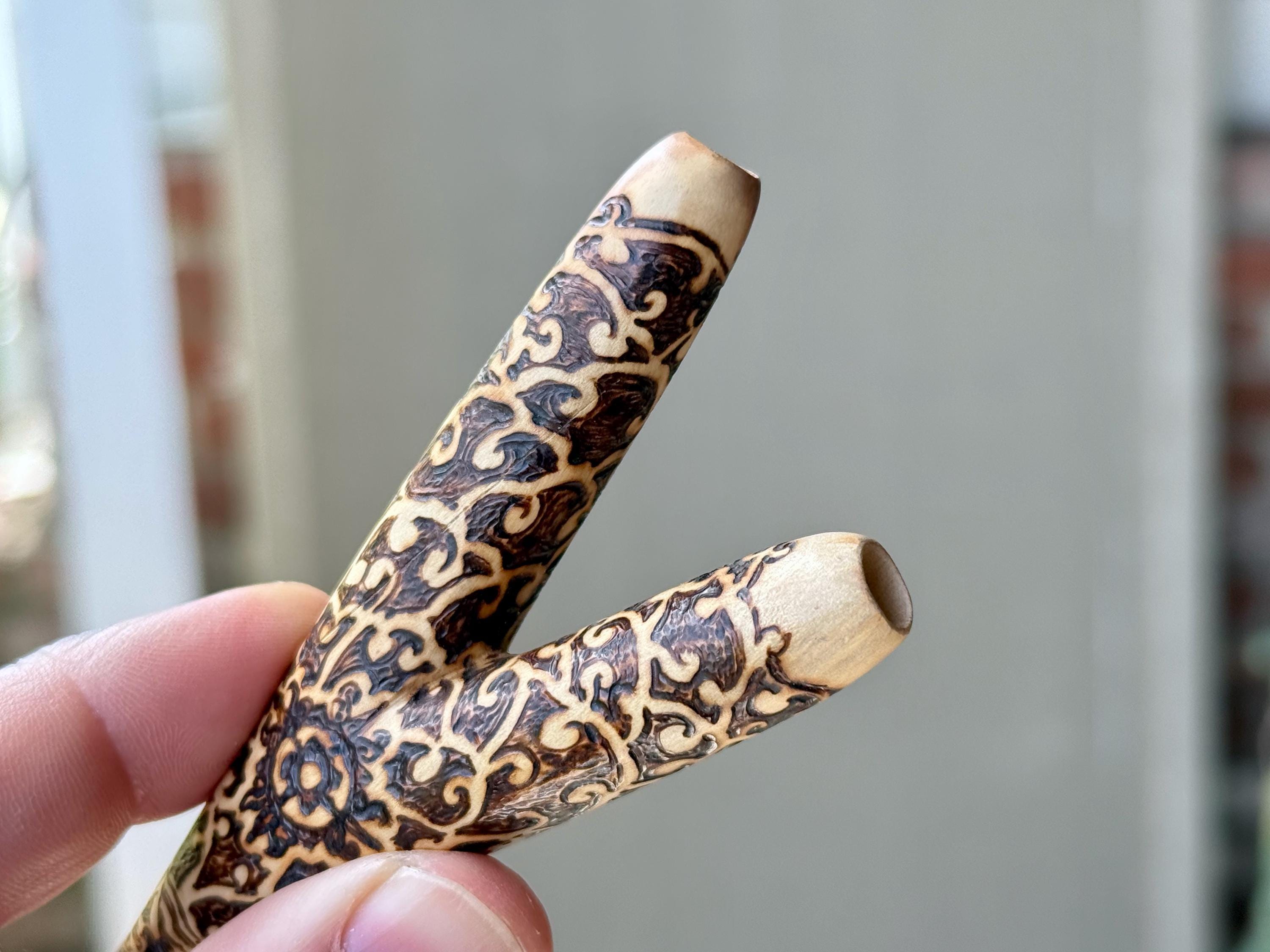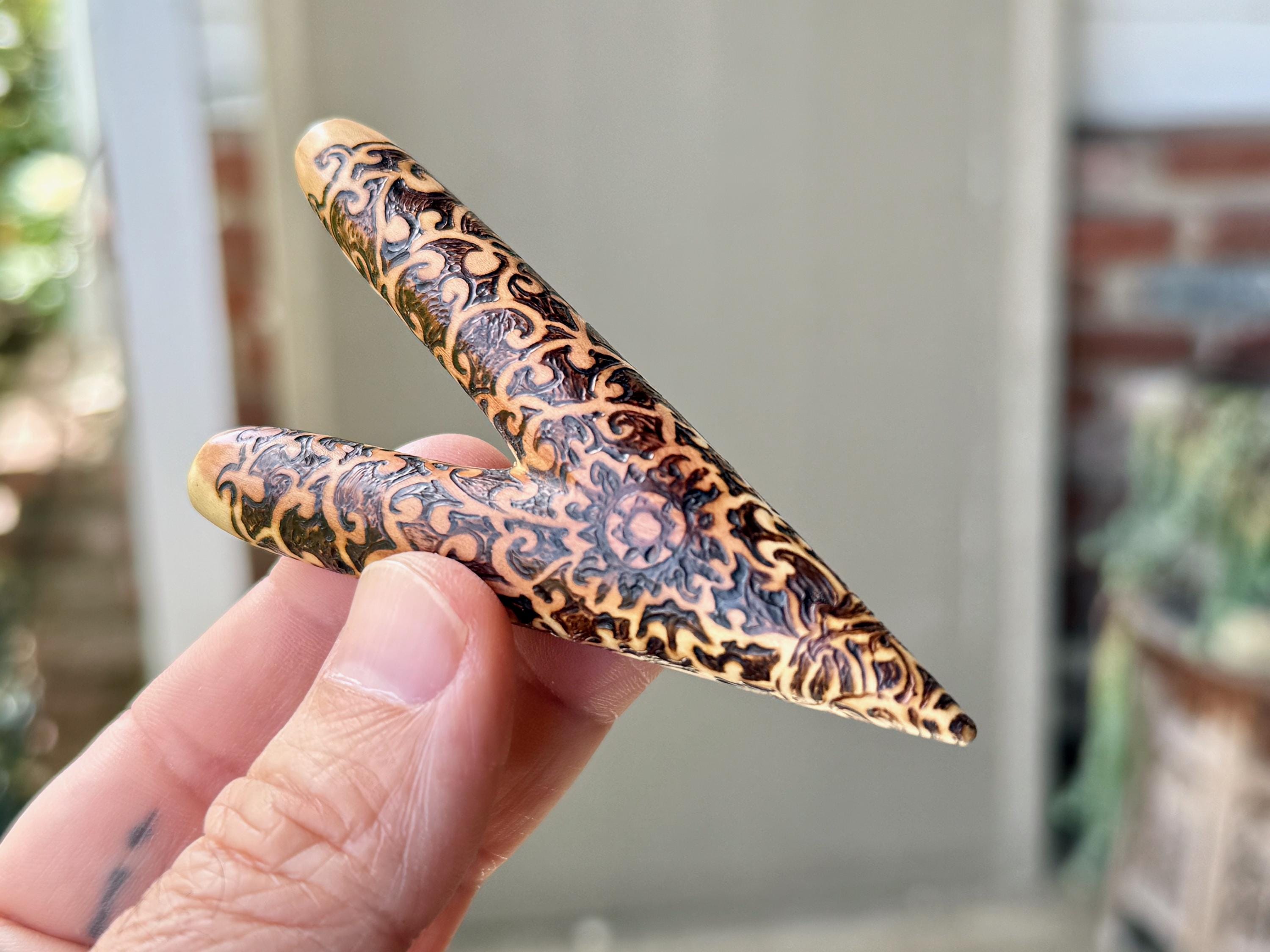 A prototype design of our basic single block kuripe, with a wood-burned vine motif. Lovely design and great airflow.