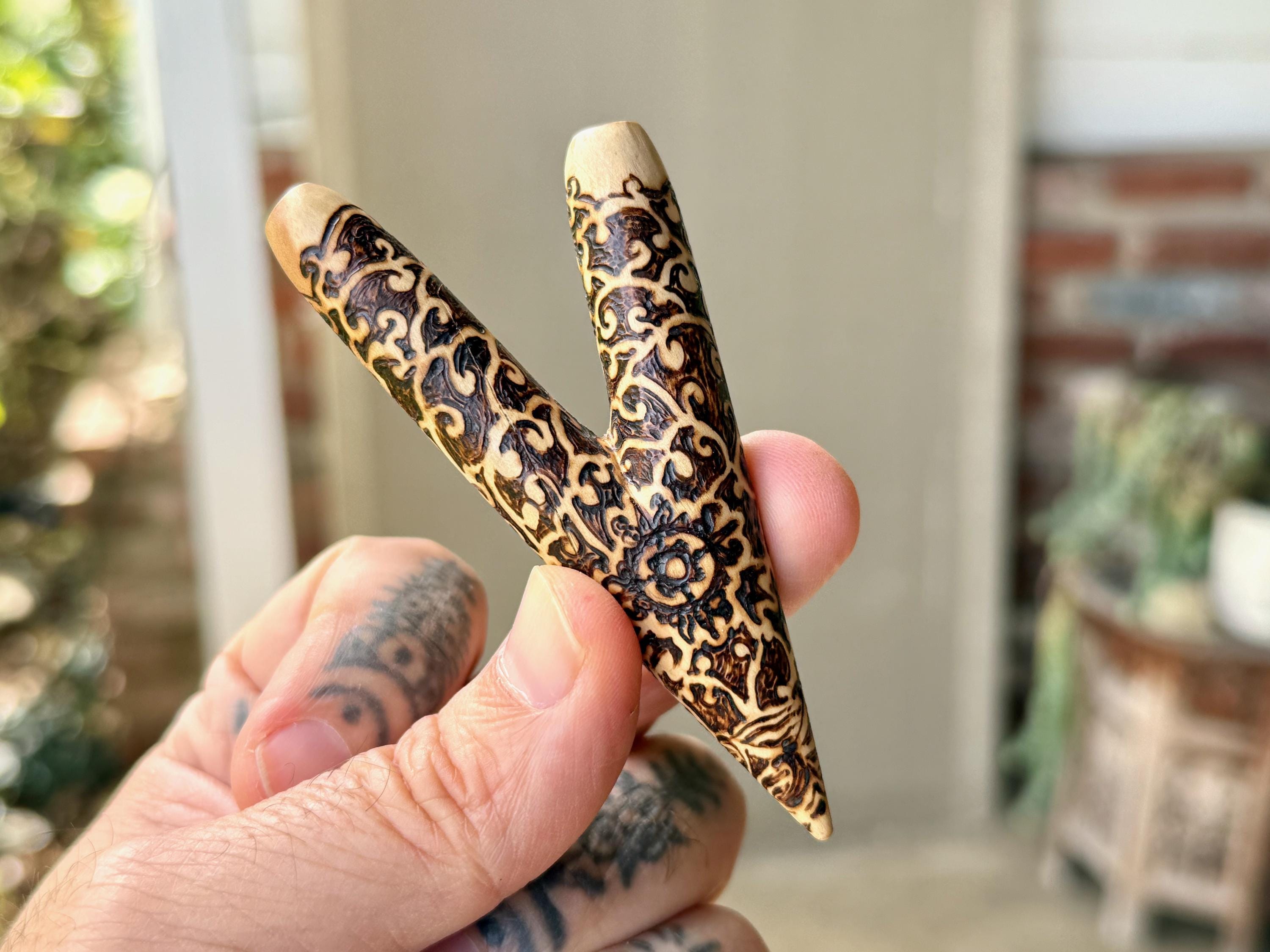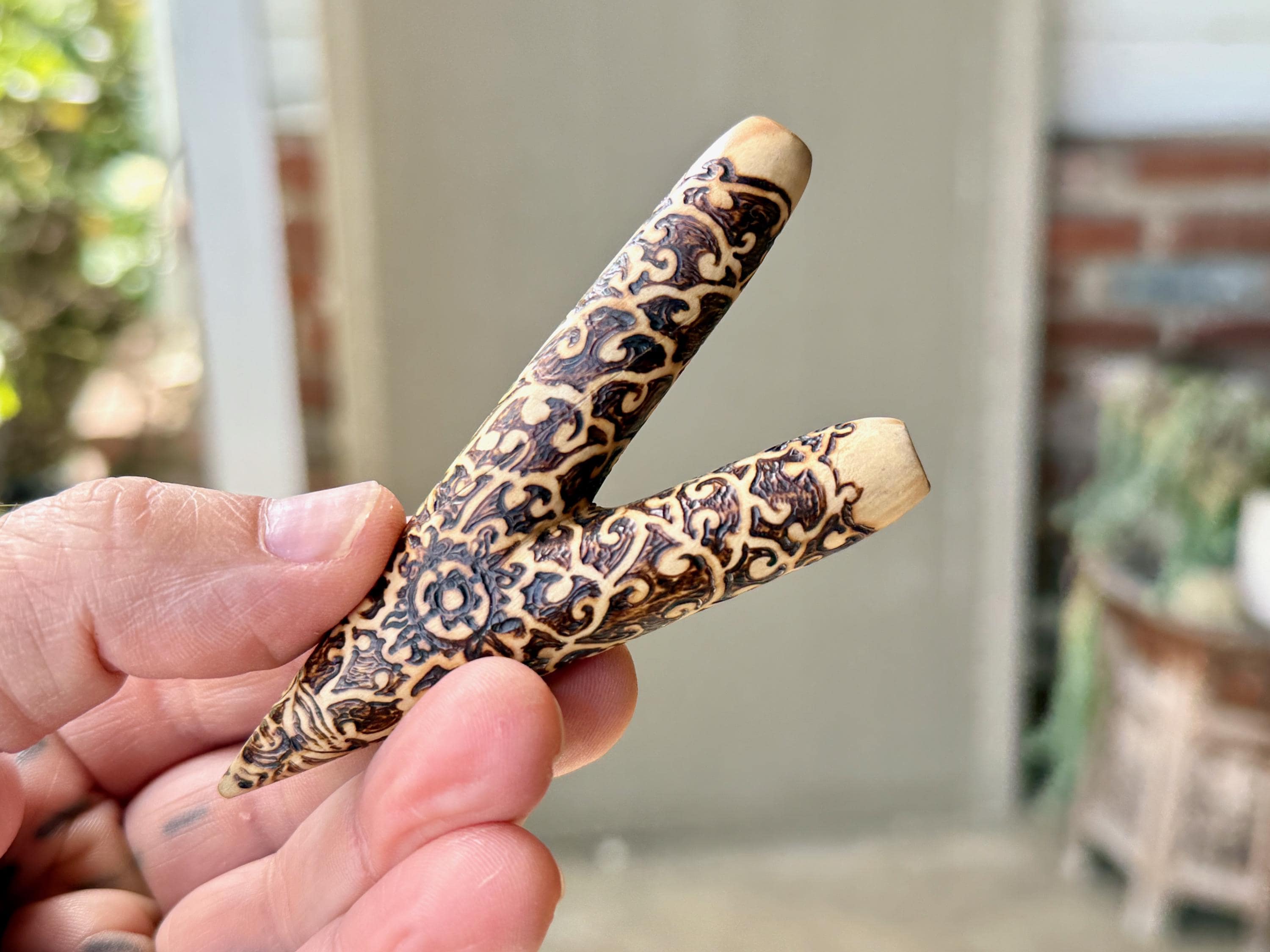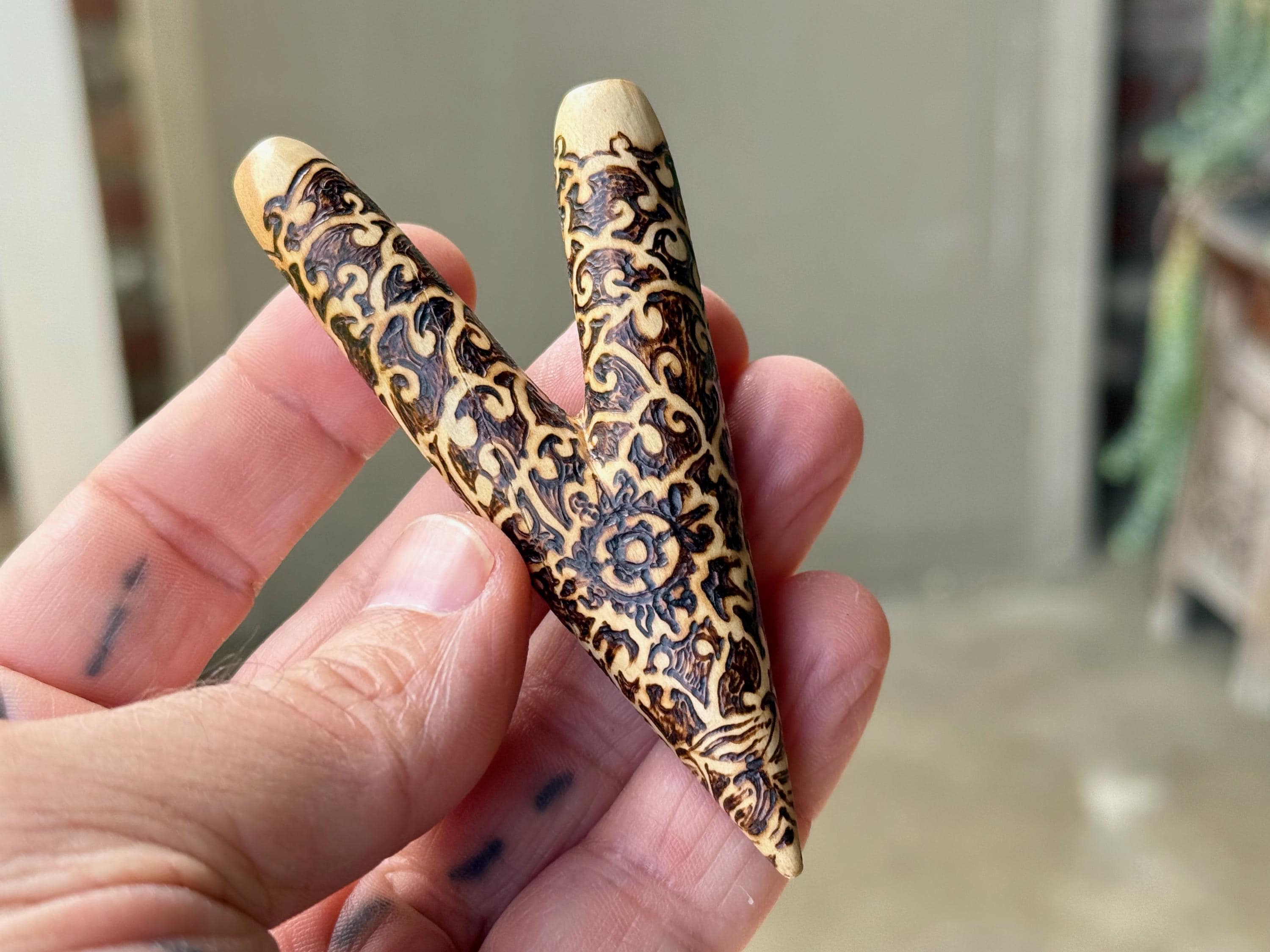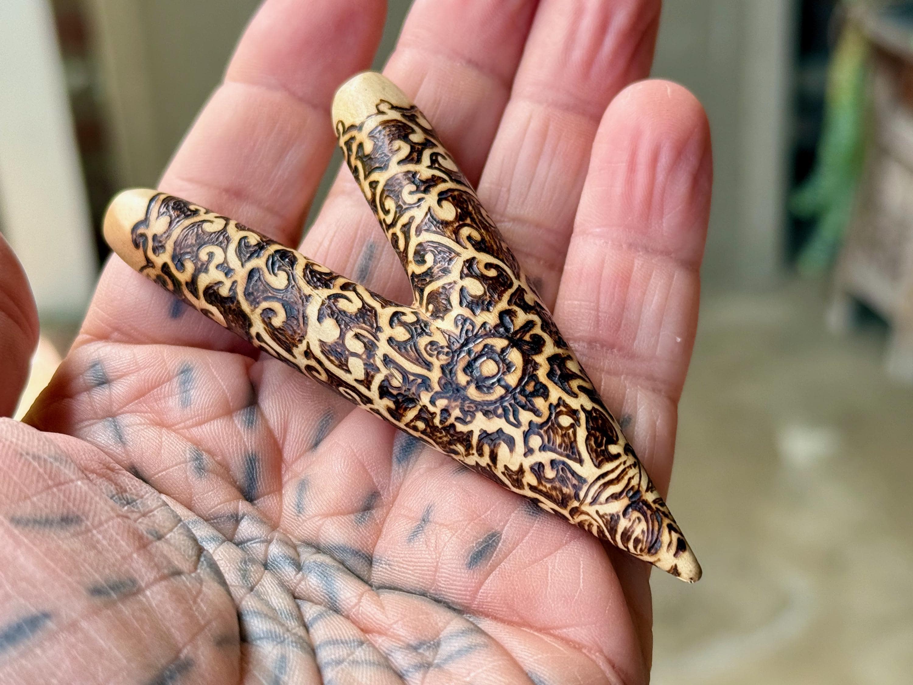 A prototype design of our basic single block kuripe, with a wood-burned vine motif. Lovely design and great airflow.