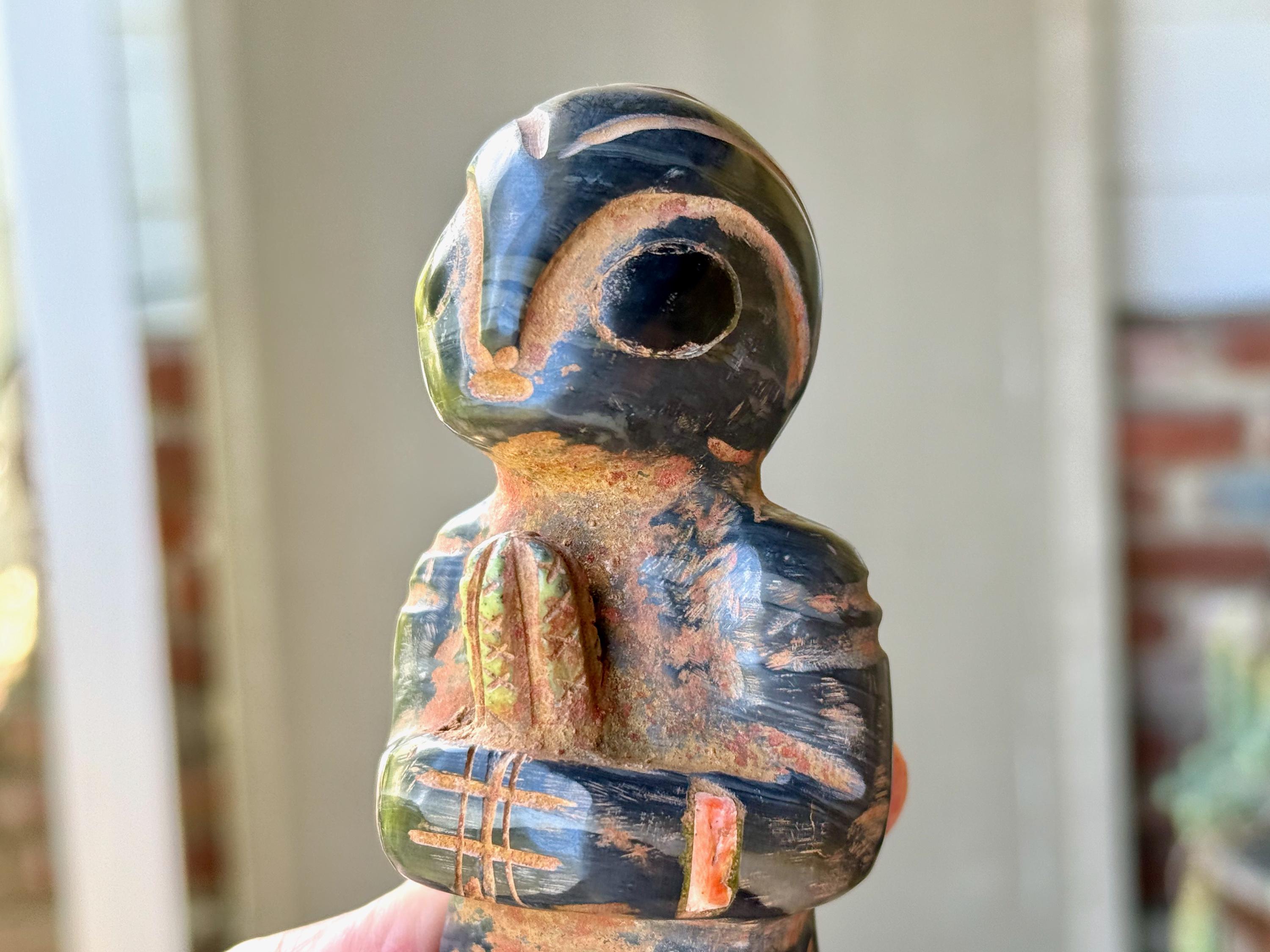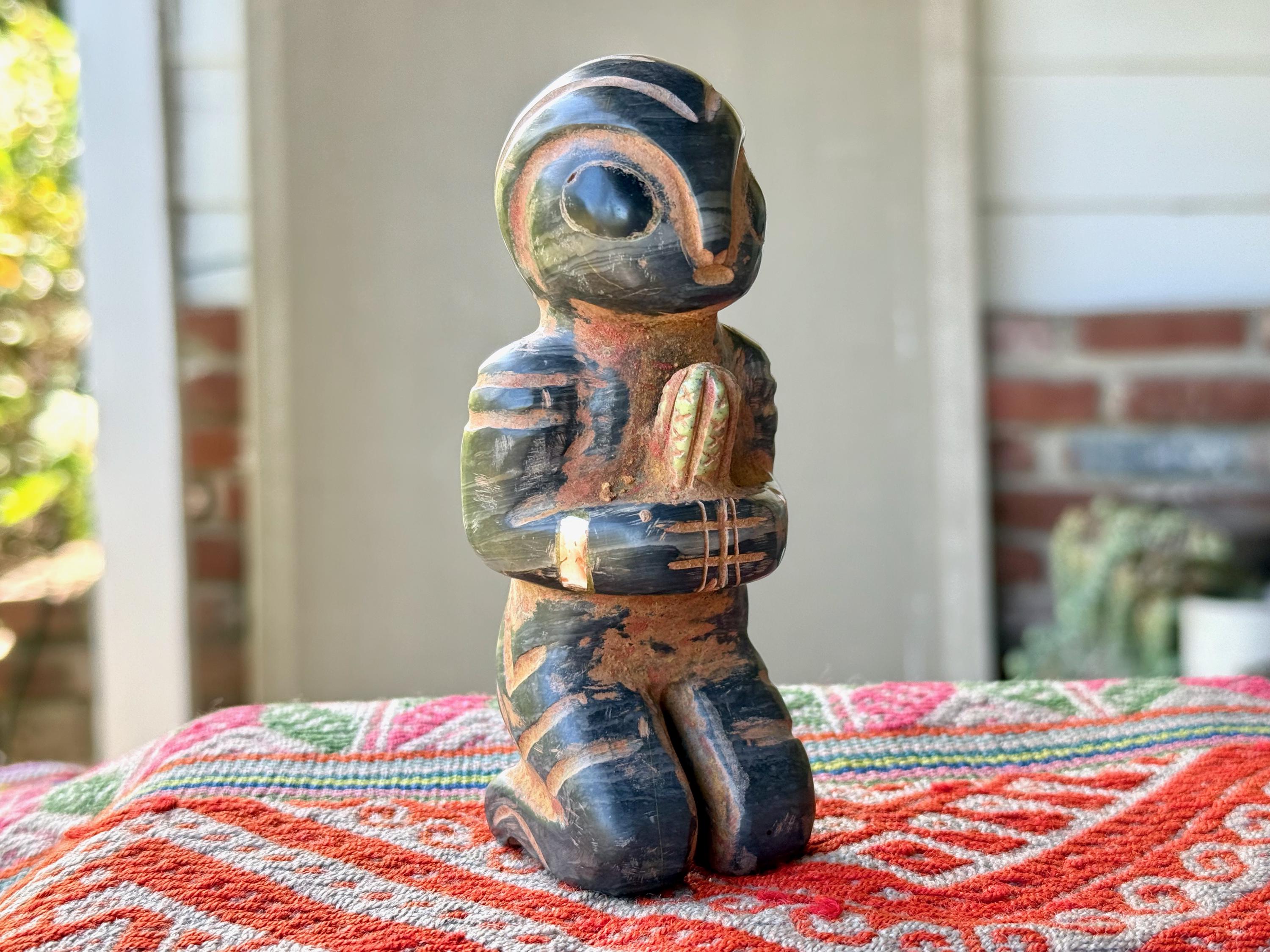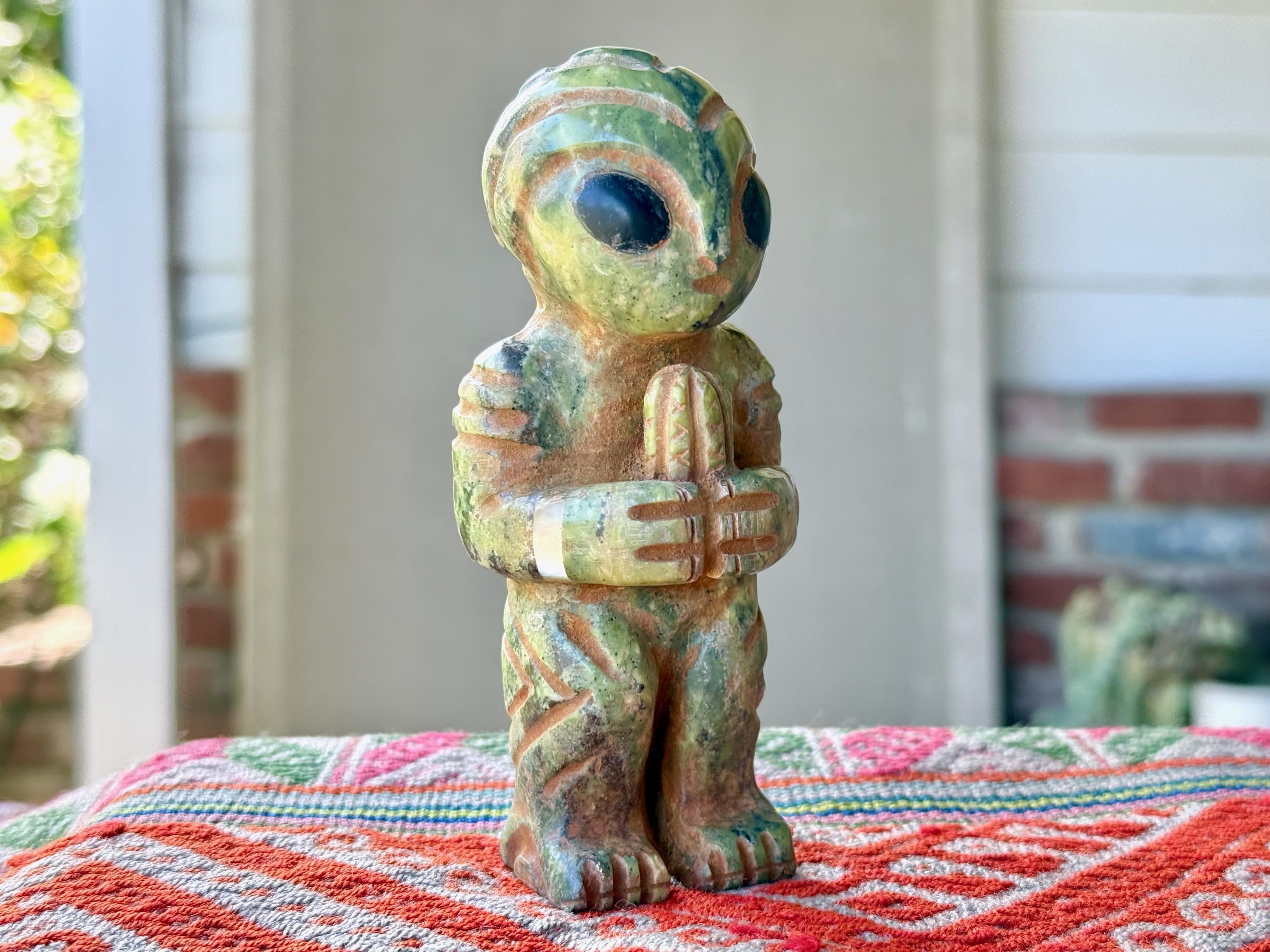 These otherworldly Extraterrestrial Alien statues come from Peru's Sacred Valley. They were hand carved from native Serpentine Stone, Quartz and Black Onyx by artist Ruben Layme. The stone from this mountainous region of Peru possesses strong energetic qualities, especially as the land has a rich history of extraterrestrial activity.