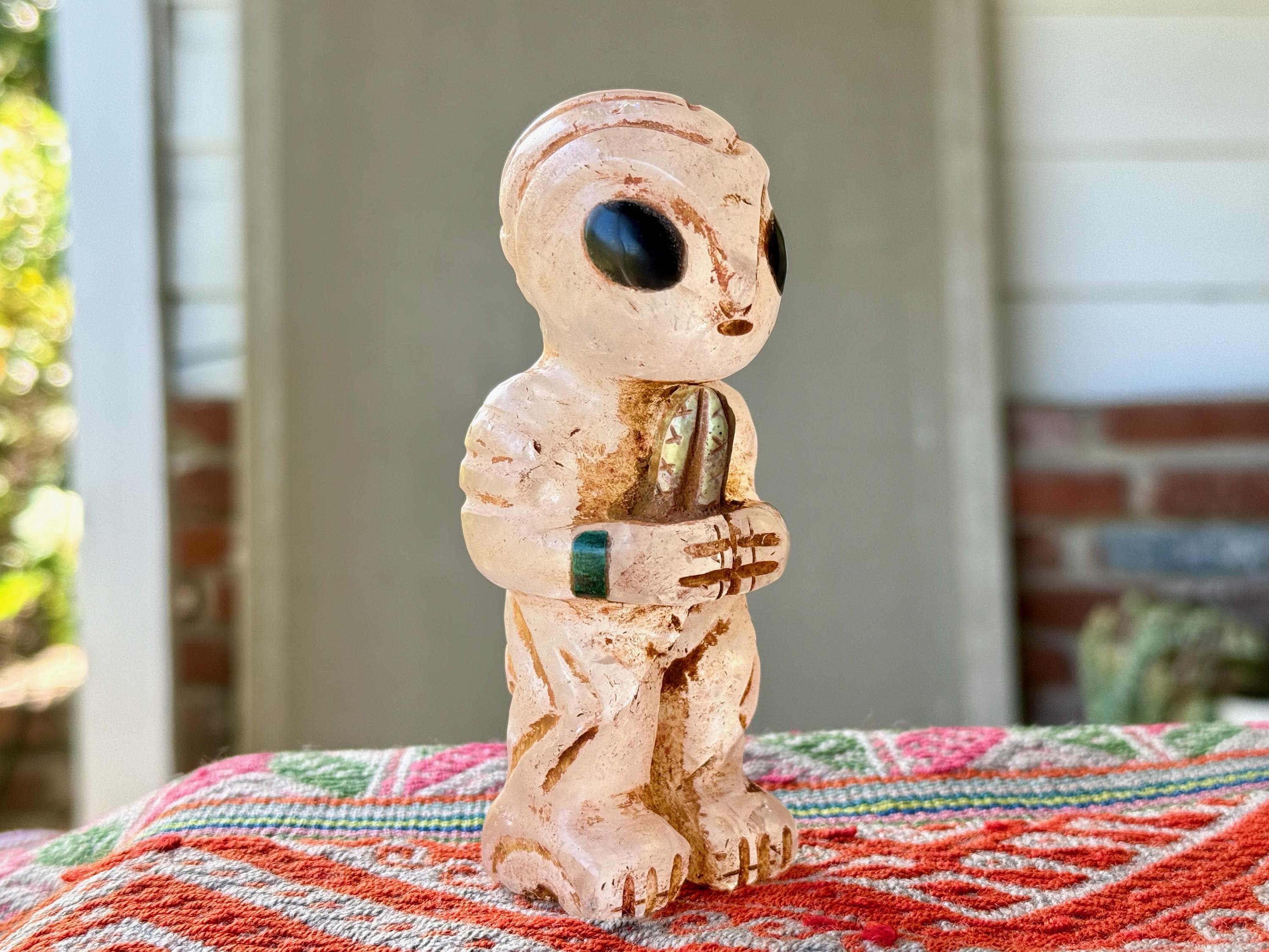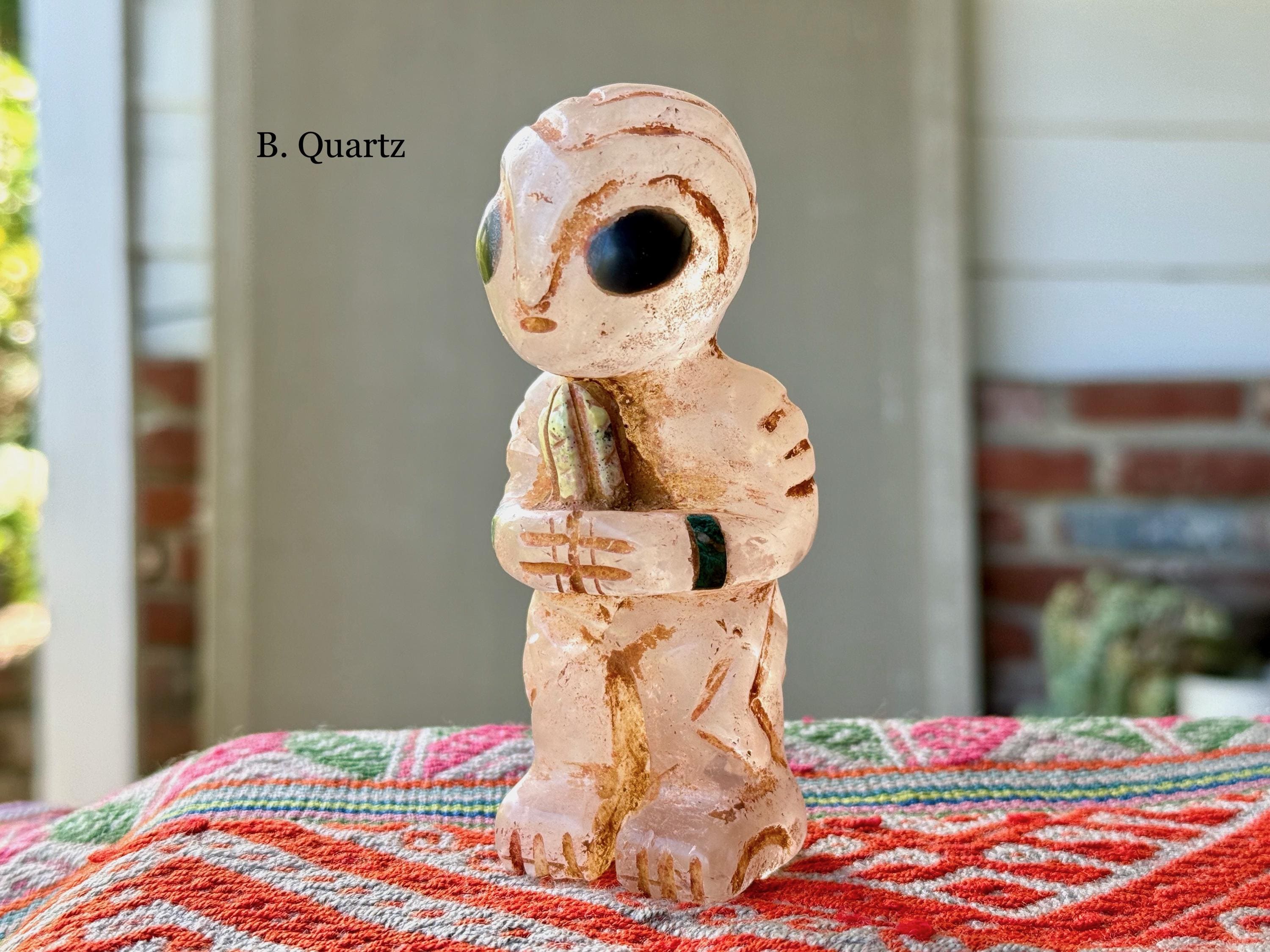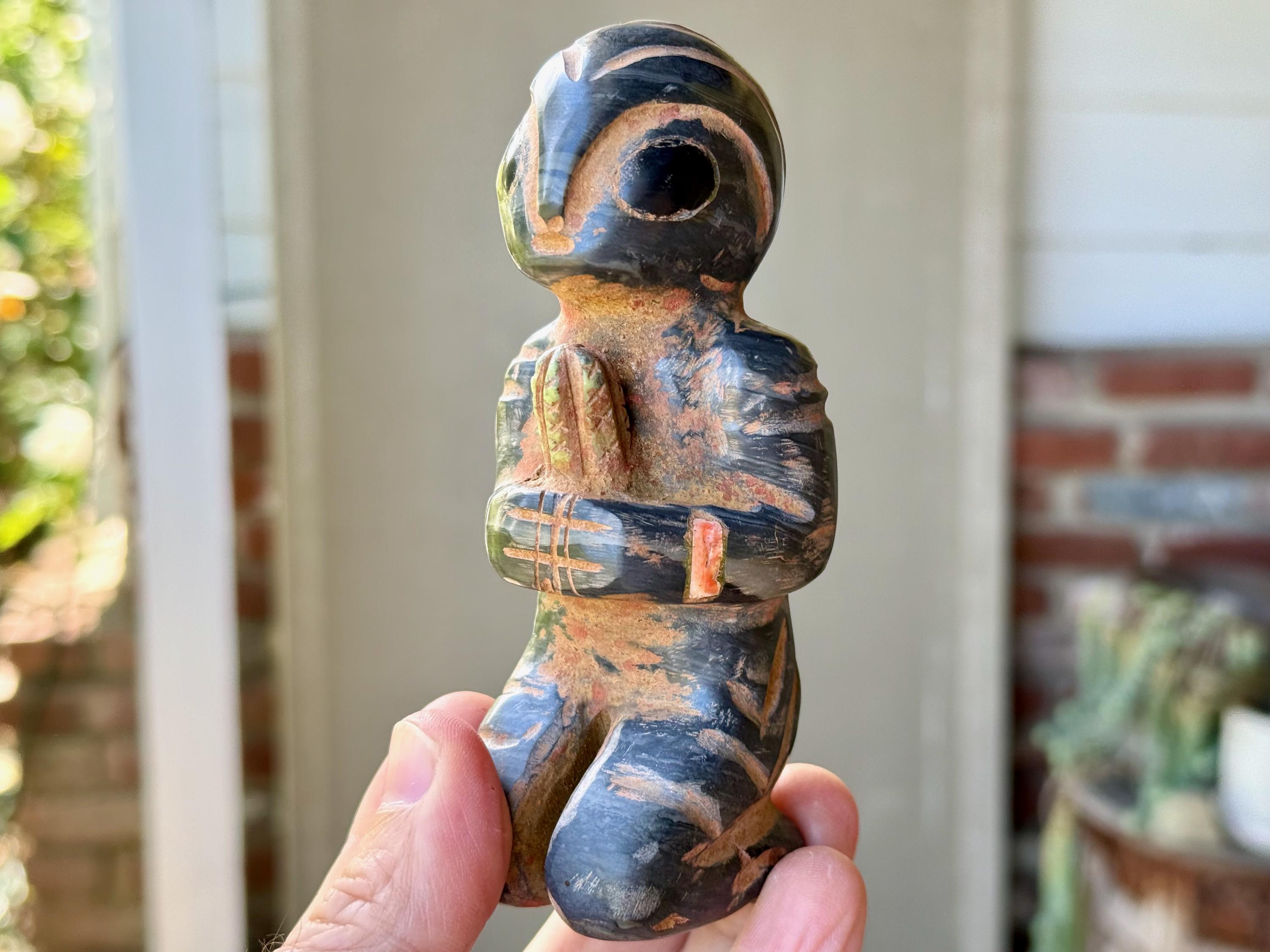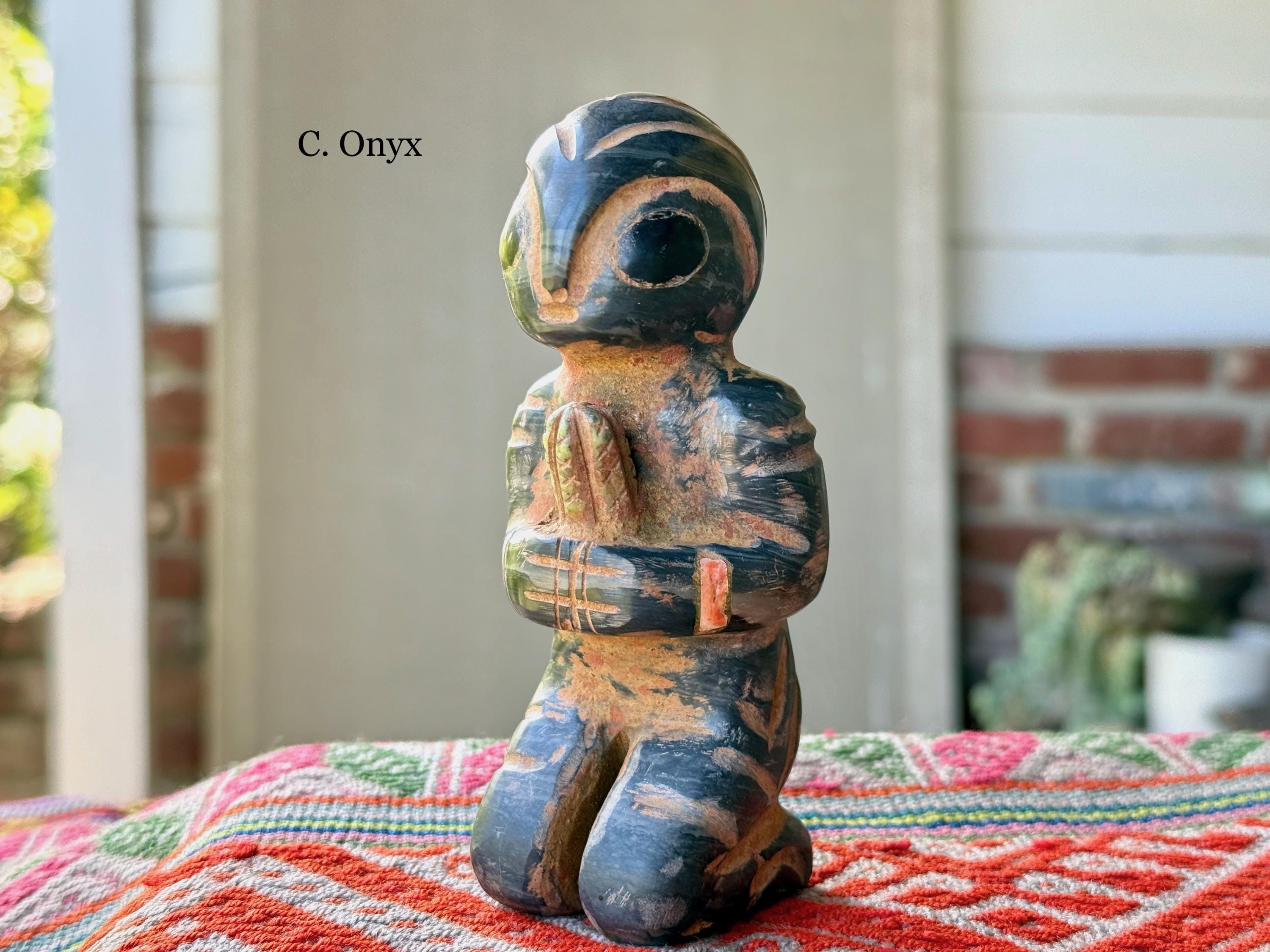 The bodies are made of either Serpentine Stone, Quartz or Black Onyx, and they hold "Grandfather" cacti, which are carved from native Serpentine. The eyes are Obsidian inlays. On the wrists are bands made of natural seashell and/or Chrysocolla. The artist uses a special weathering process to give each an ancient patina. Each comes with its own high-quality woven bag for safe storage (Photo 17).