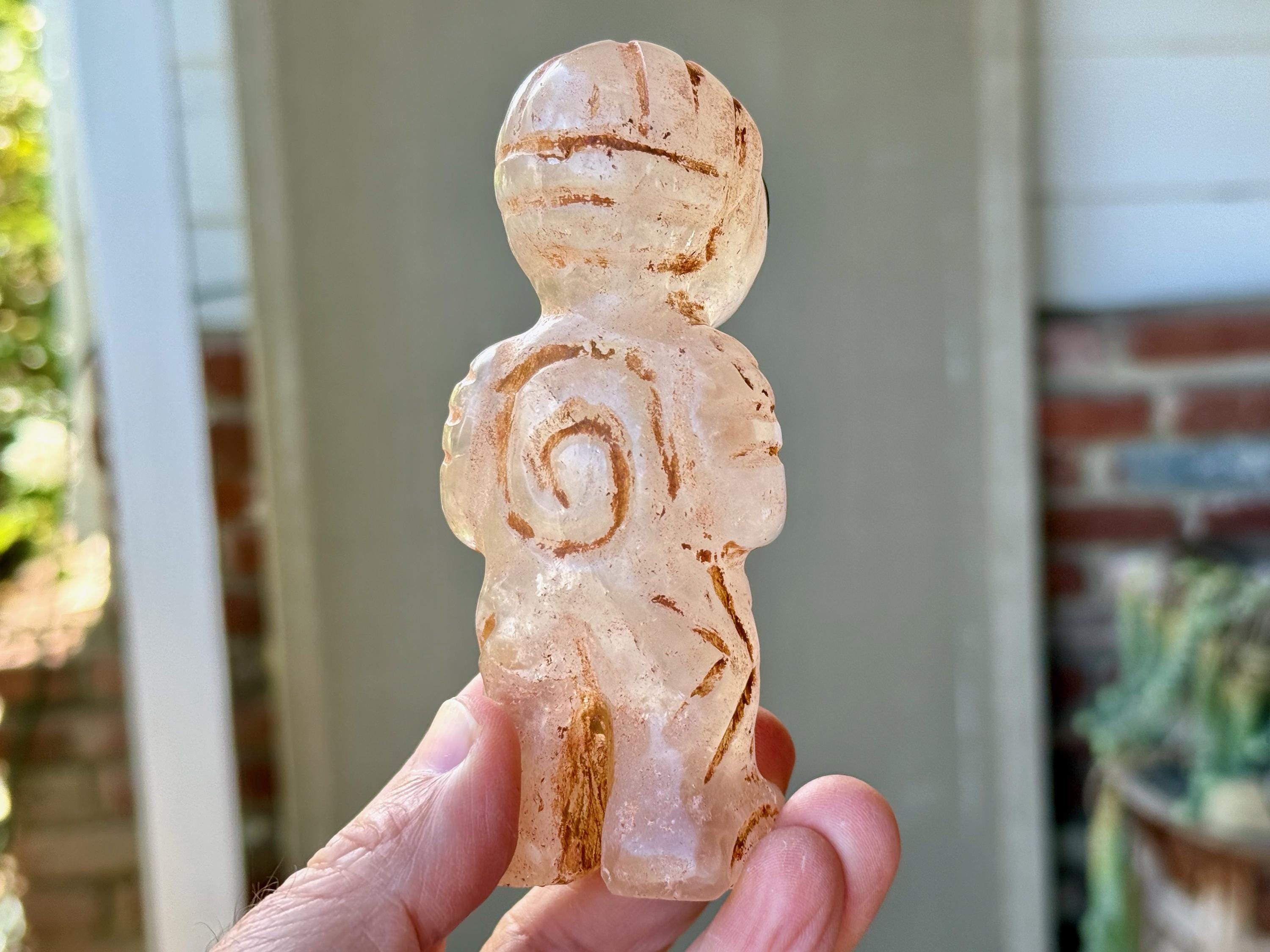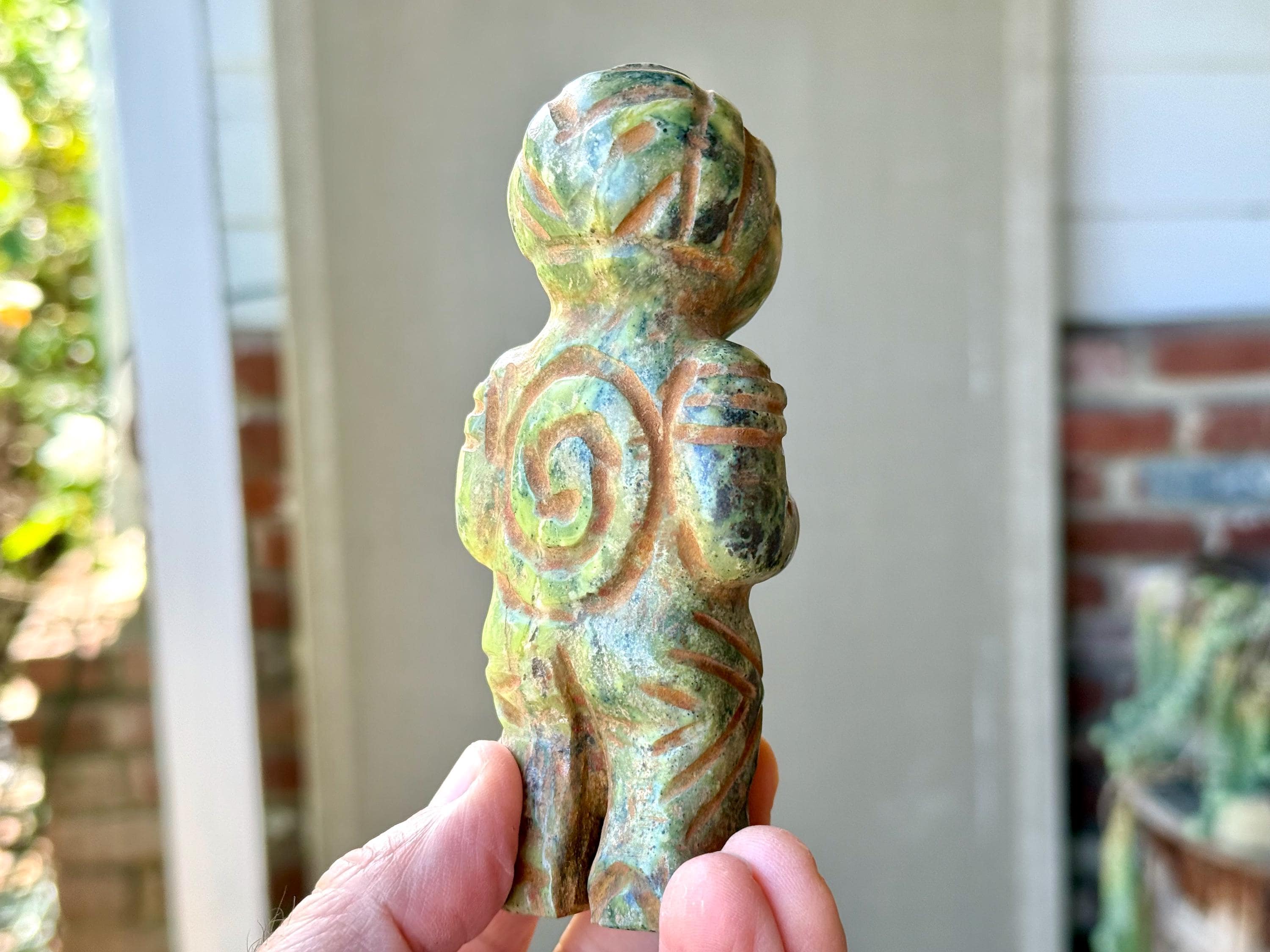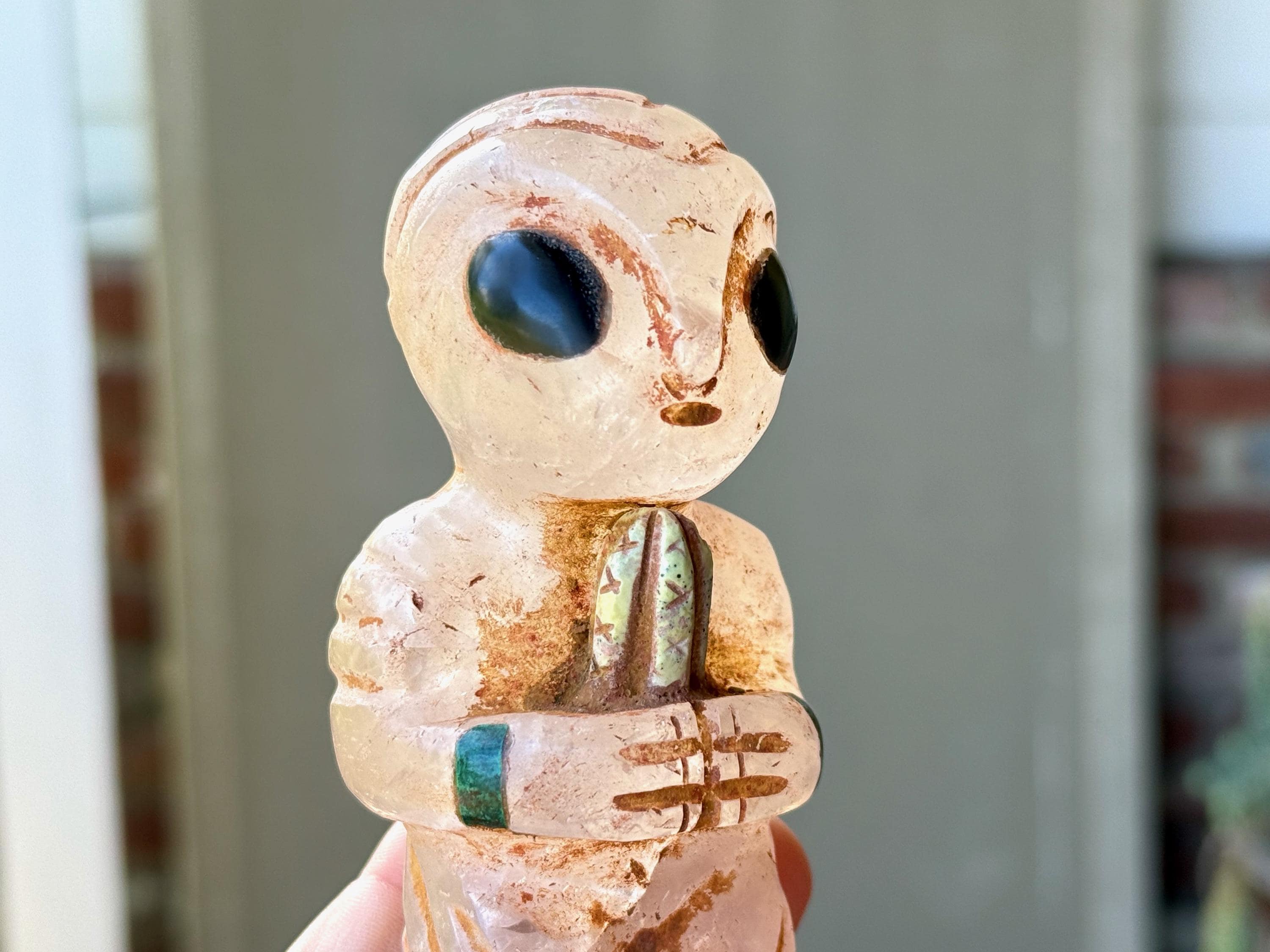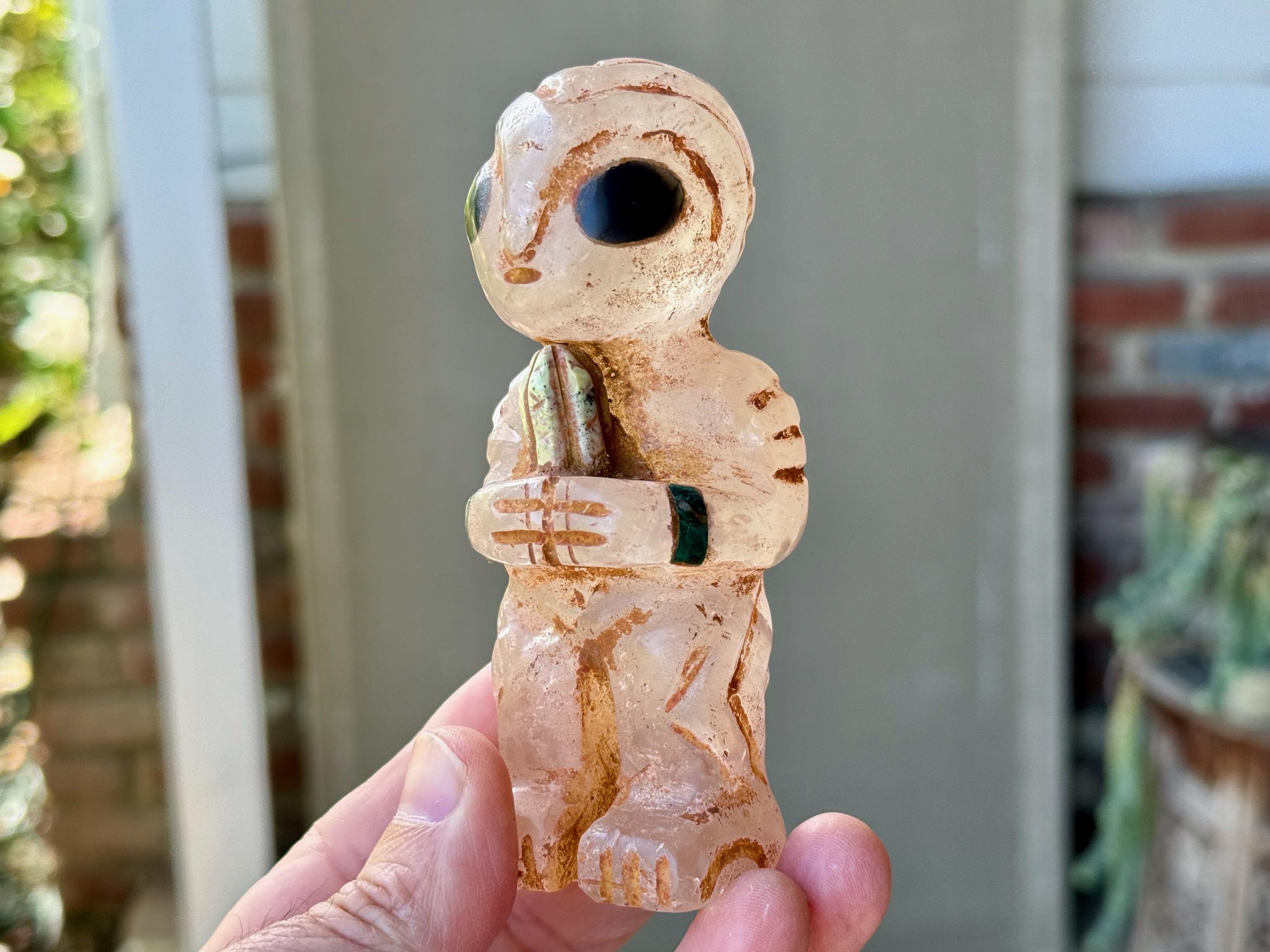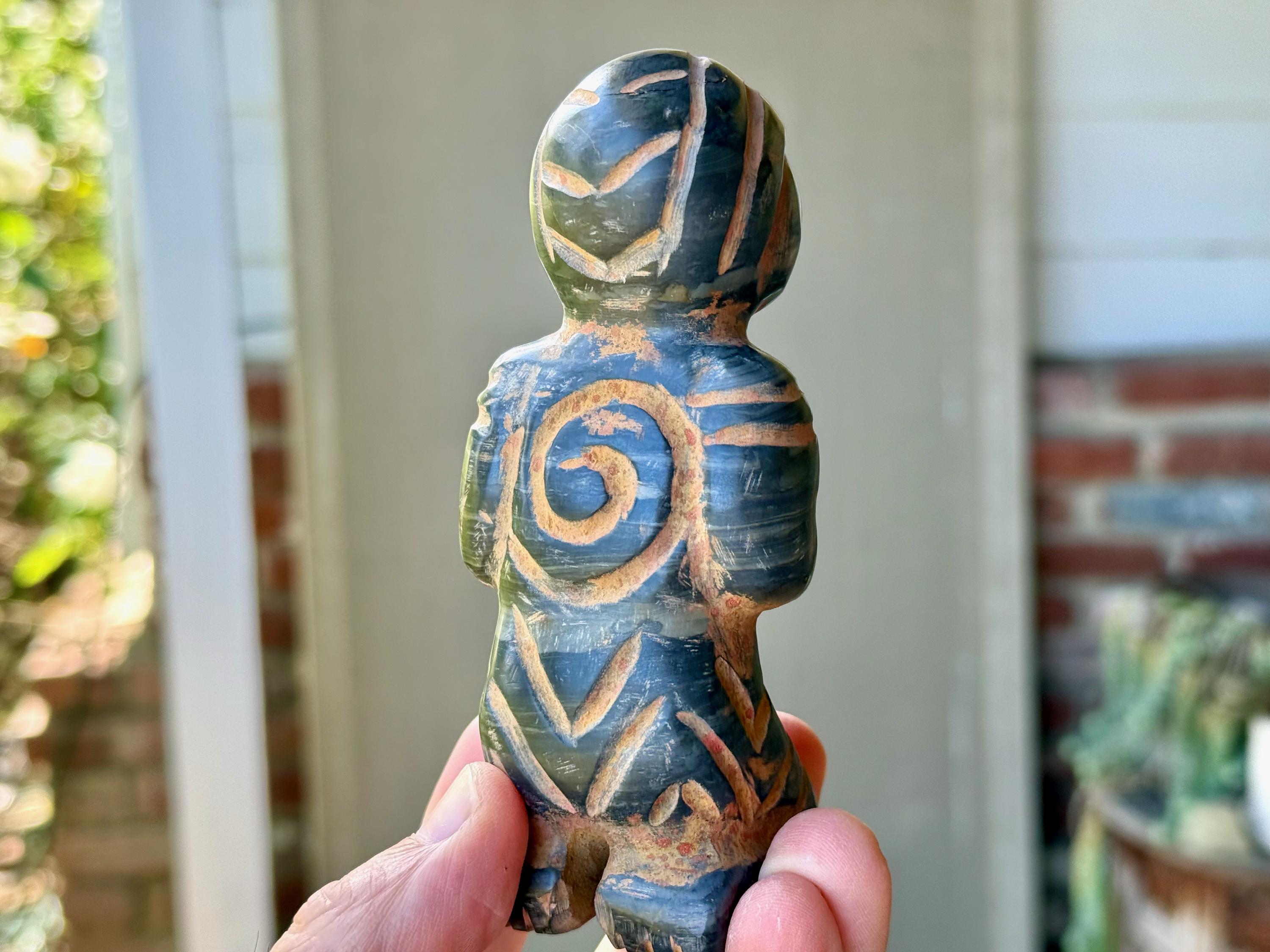 The bodies are made of either Serpentine Stone, Quartz or Black Onyx, and they hold "Grandfather" cacti, which are carved from native Serpentine. The eyes are Obsidian inlays. On the wrists are bands made of natural seashell and/or Chrysocolla. The artist uses a special weathering process to give each an ancient patina. Each comes with its own high-quality woven bag for safe storage (Photo 17).