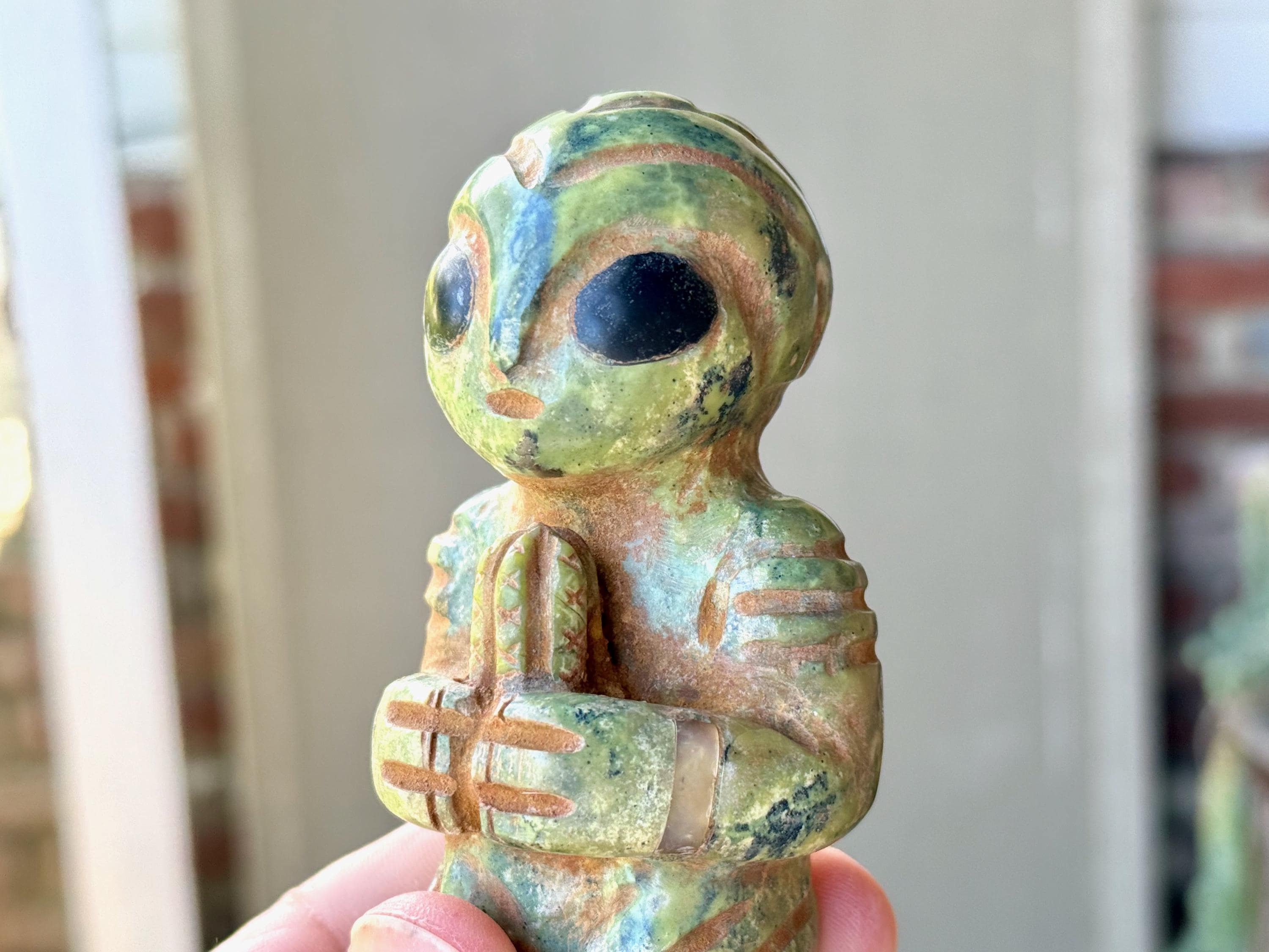 These alien statues stand upright on their own, making them a perfect addition to any shamanic altar, meditation space, or cosmic collection. Their seamless combination of materials and detailed artistry ensures it’s a standout piece for any spiritual or ceremonial space.