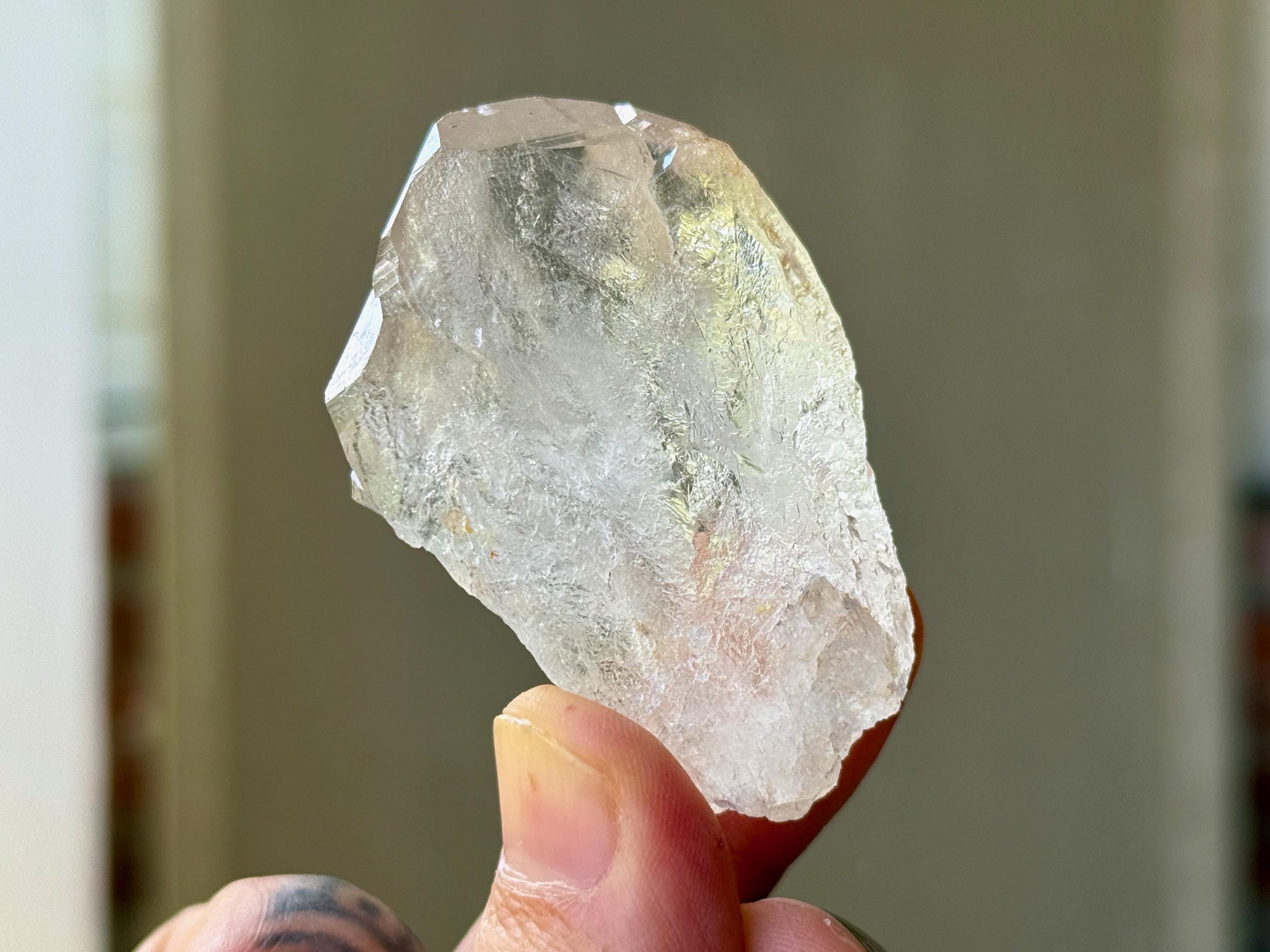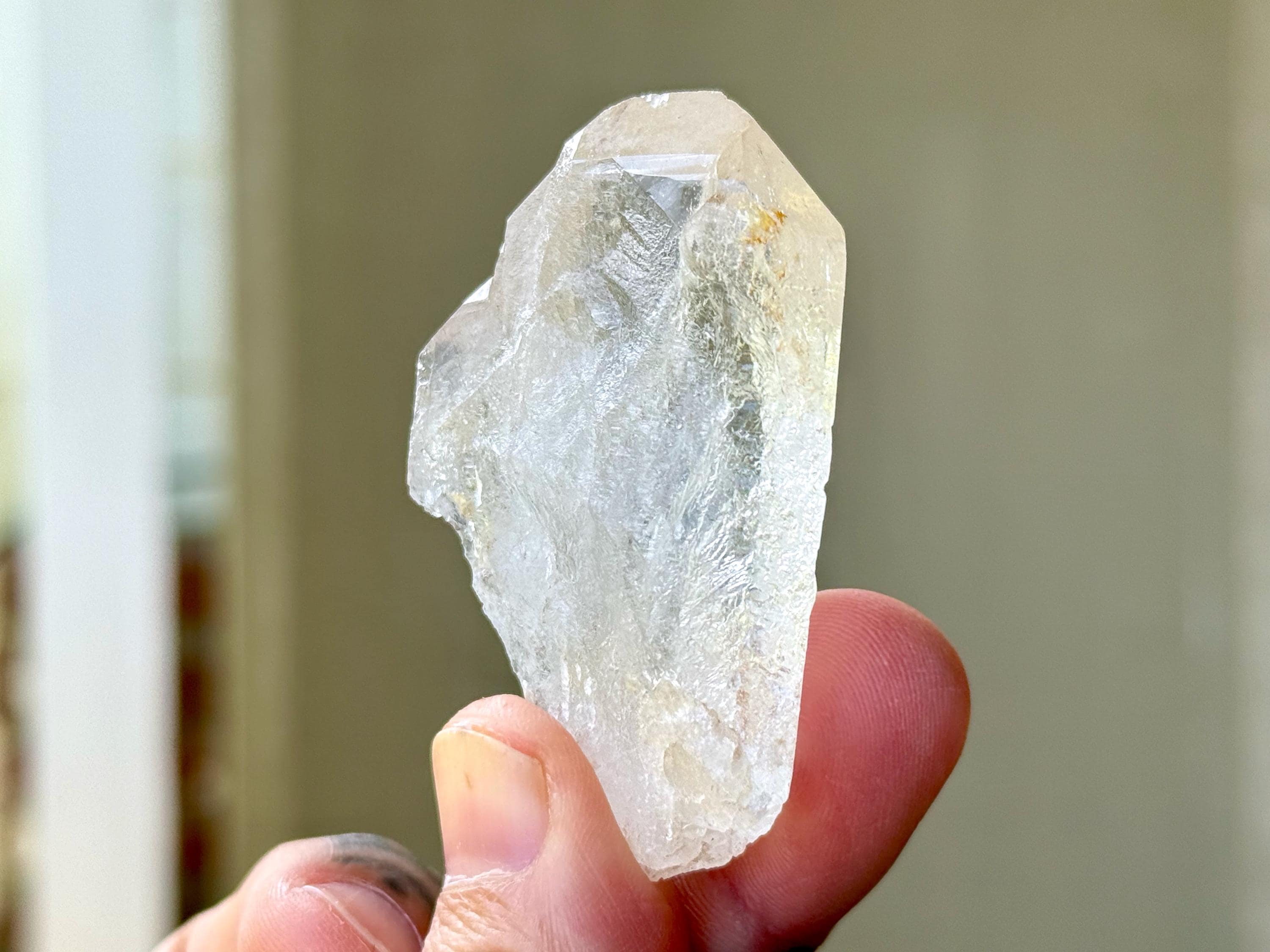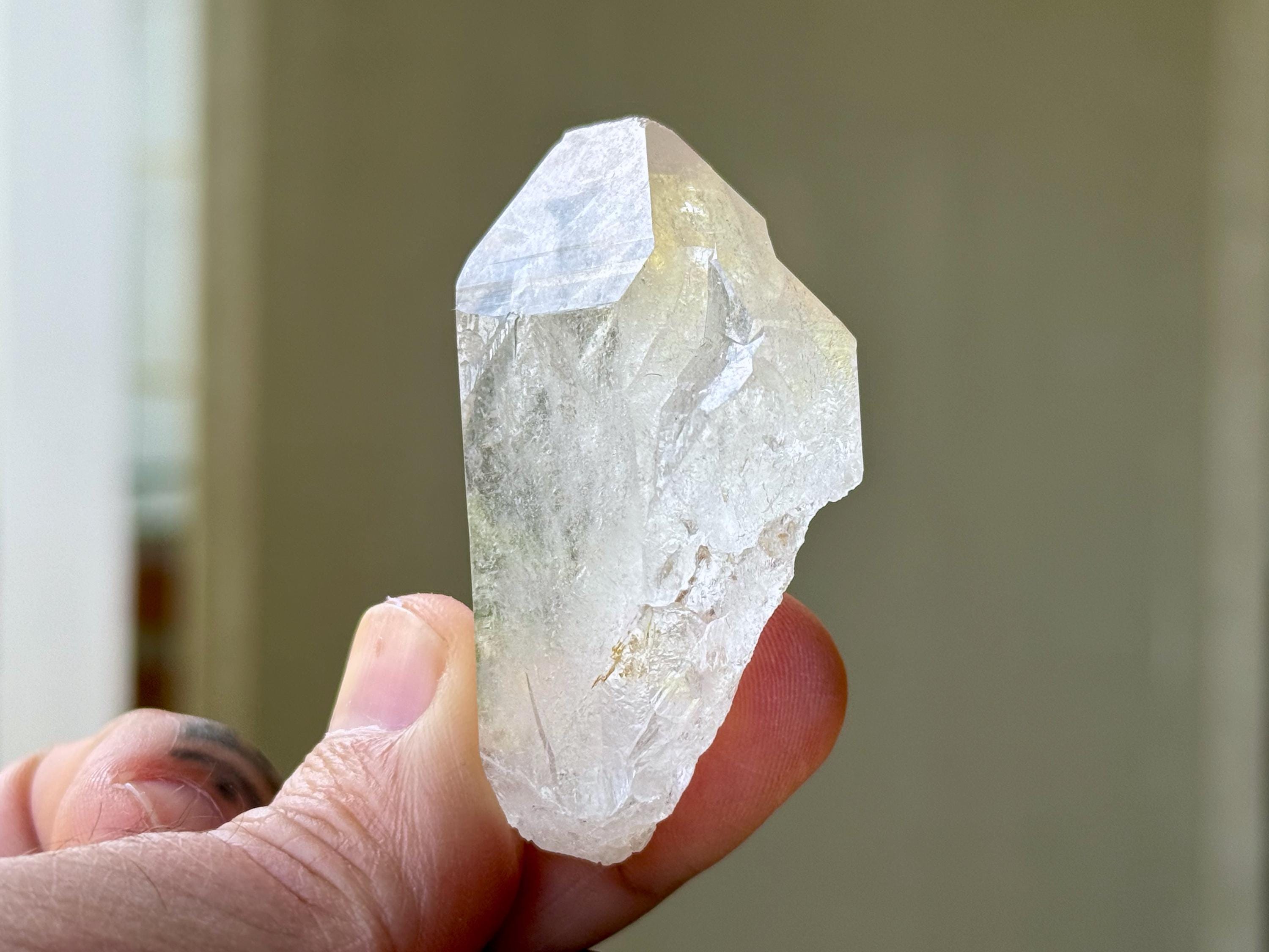 This is a gorgeous and highly lustrous Cathedral Quartz crystal with an elegant formation. There is some "wispiness" within that is quite ethereal and ghostly. The back has a mild "key" imprint and is a beautifully textural contact area. Excellent termination as well to this pretty piece.