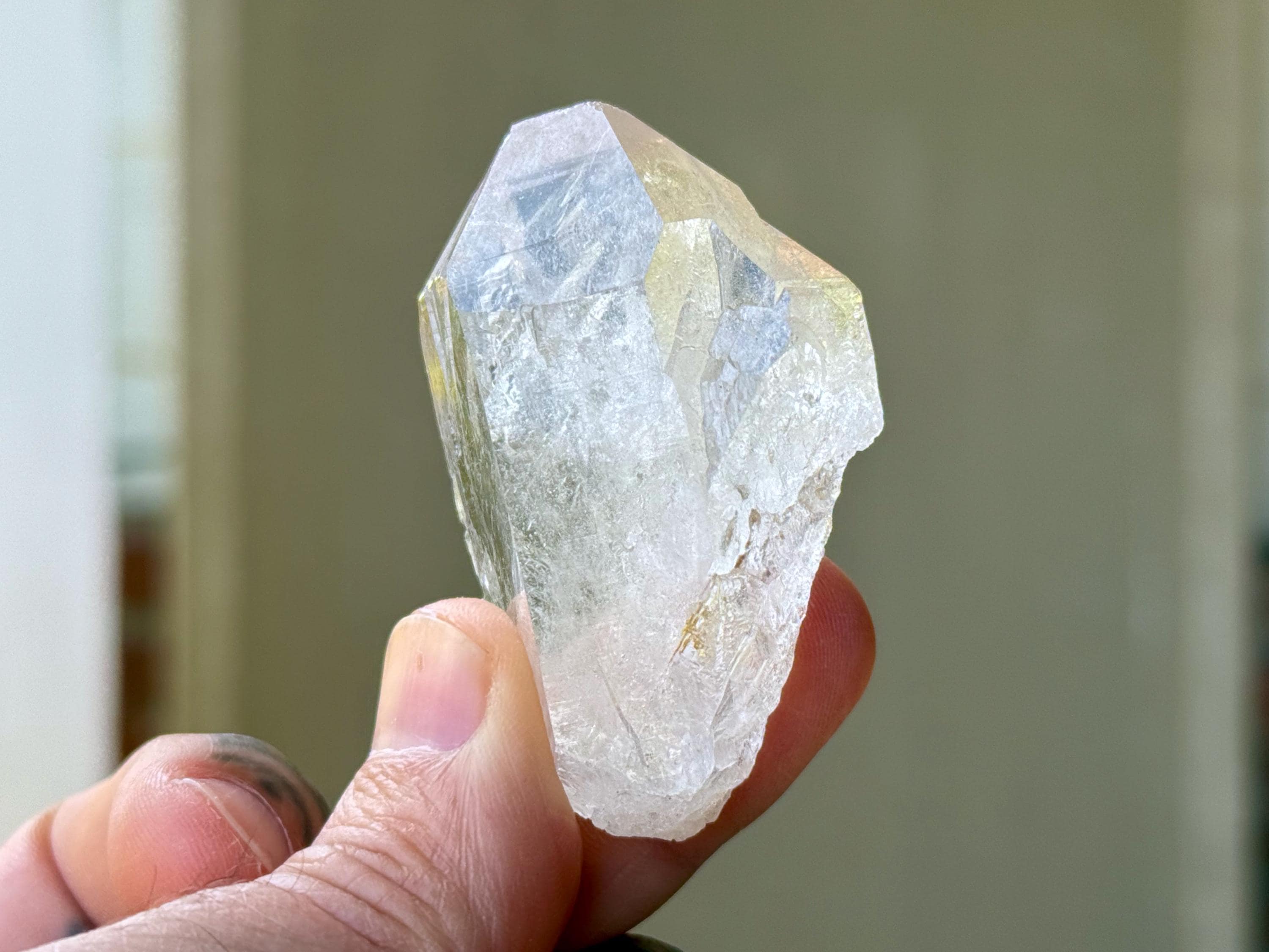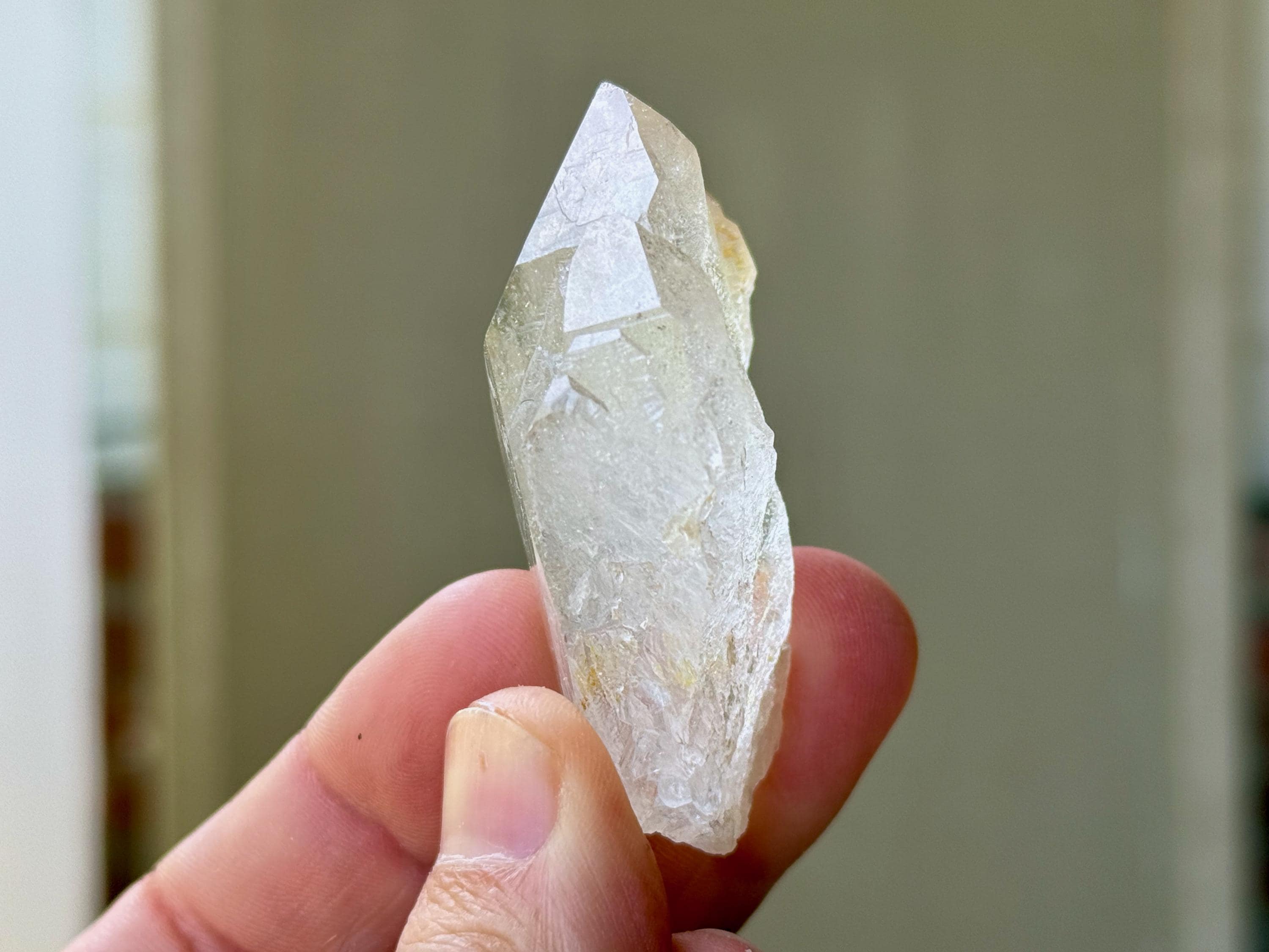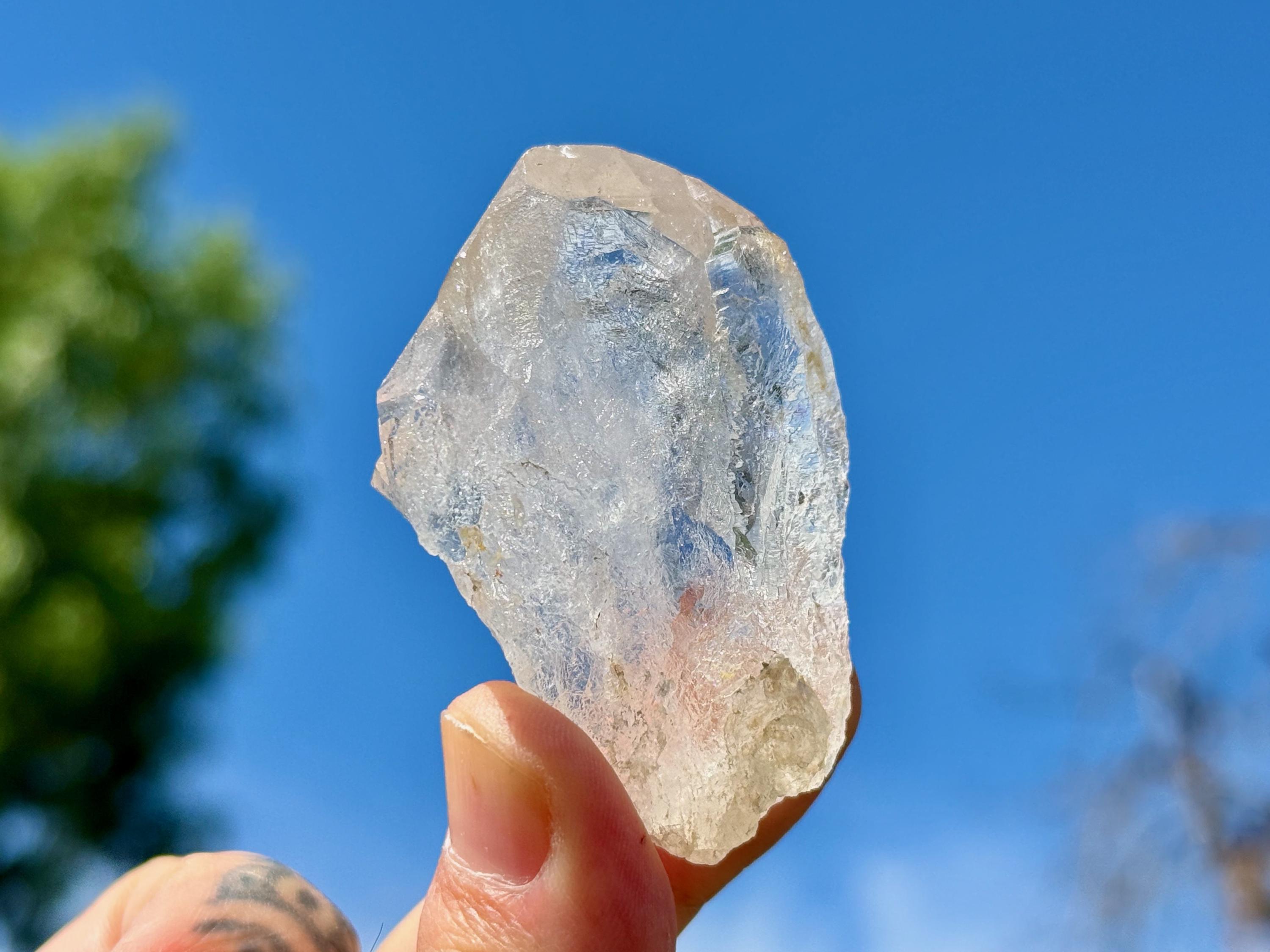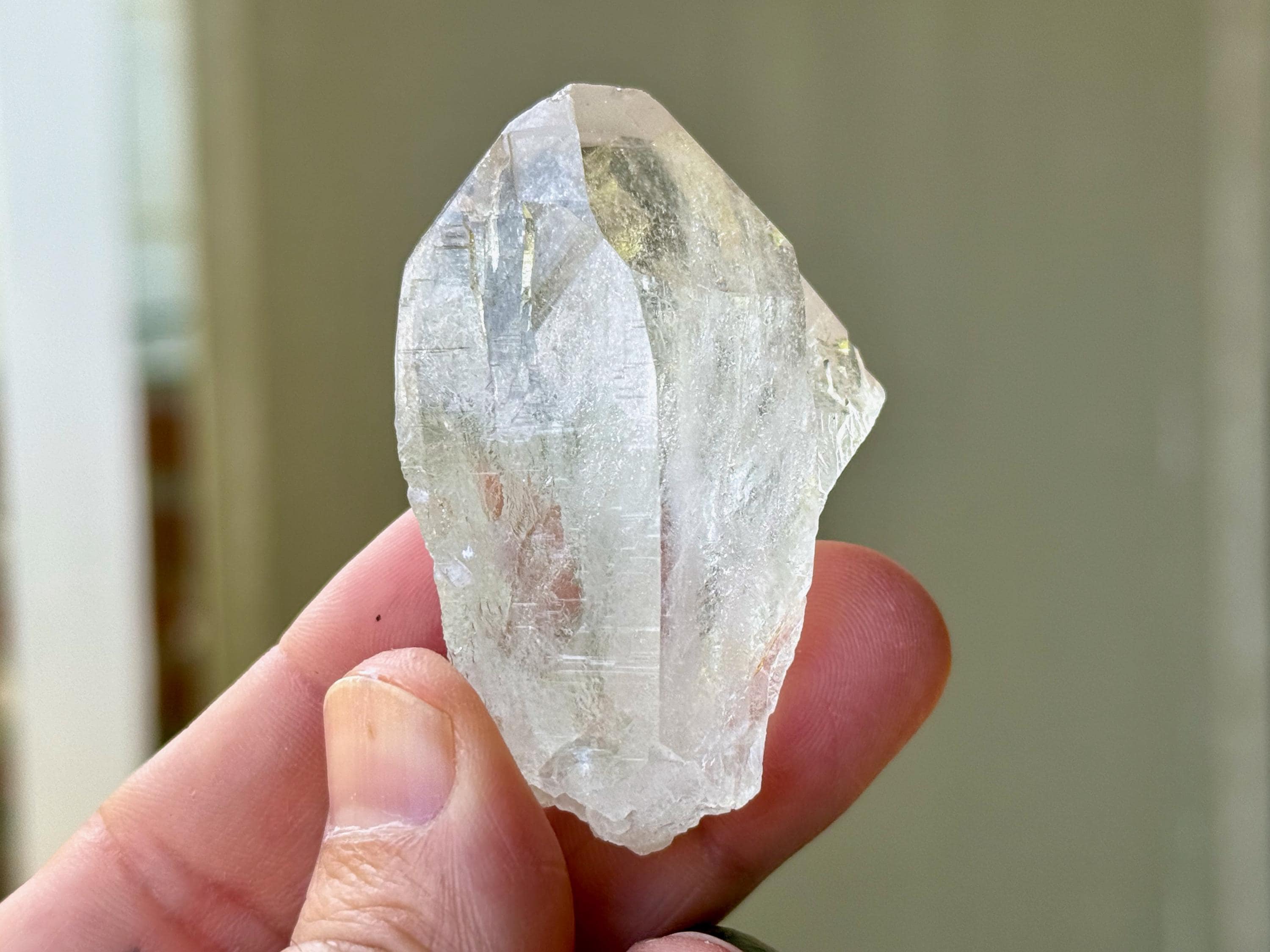 This is a gorgeous and highly lustrous Cathedral Quartz crystal with an elegant formation. There is some "wispiness" within that is quite ethereal and ghostly. The back has a mild "key" imprint and is a beautifully textural contact area. Excellent termination as well to this pretty piece.